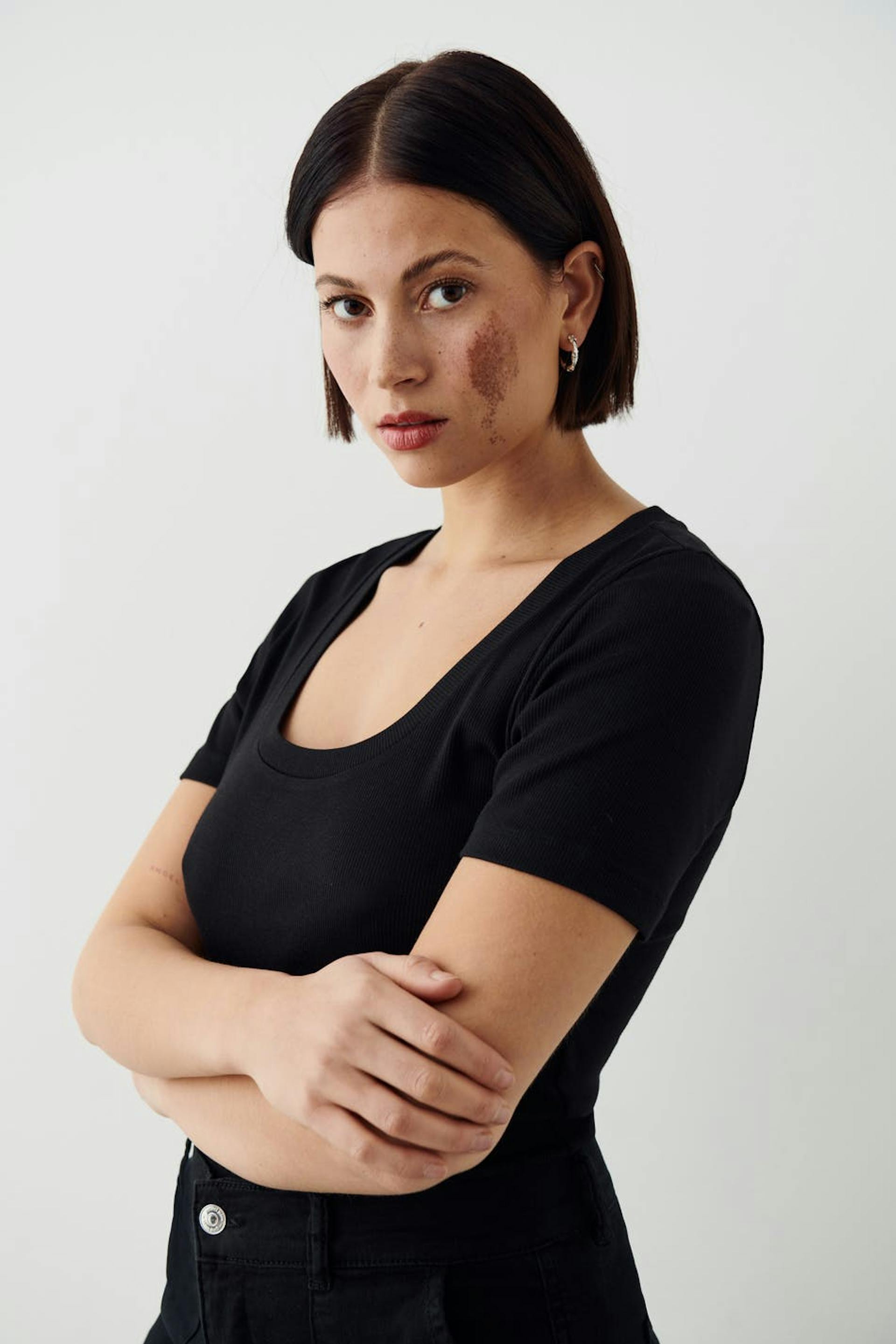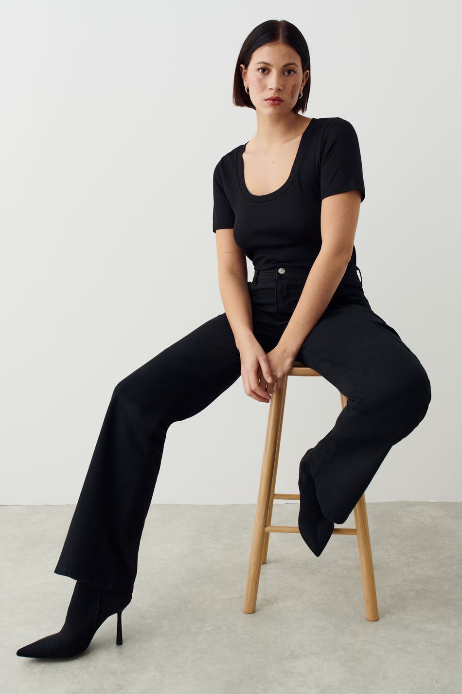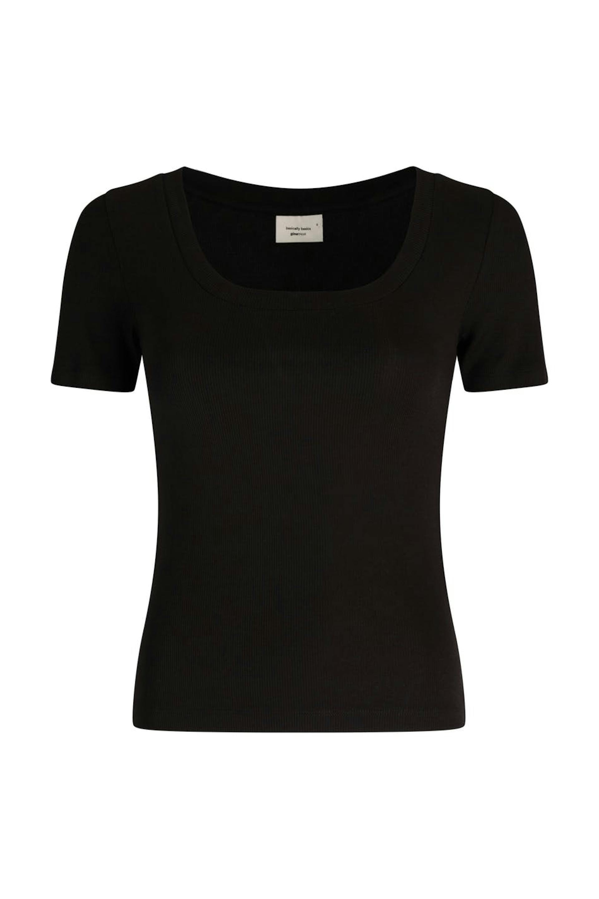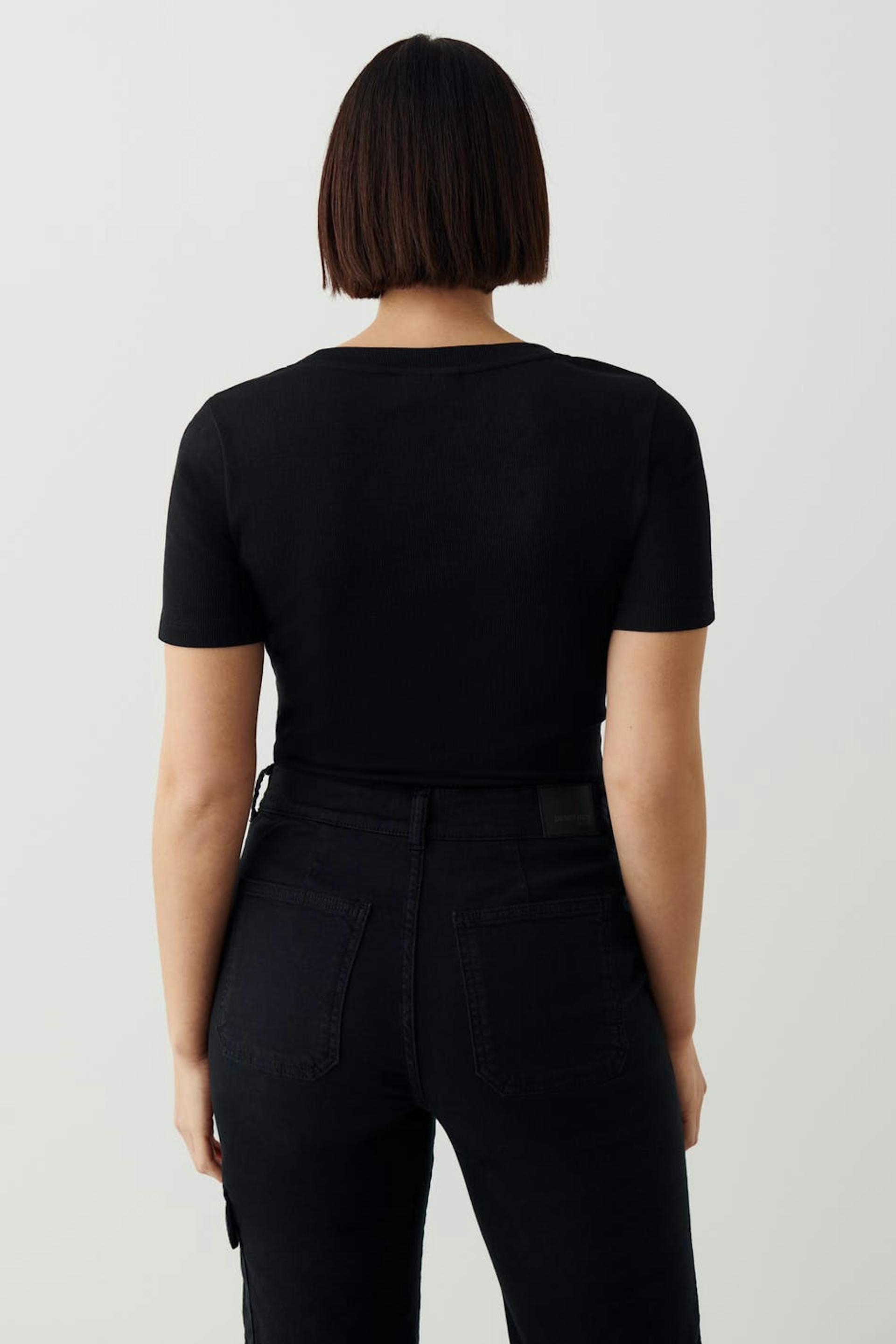 Lyhythihainen T-paita tyköistuvalla istuvuudella. T-paita on musta ja siinä on ribattu laatu trikoosta.