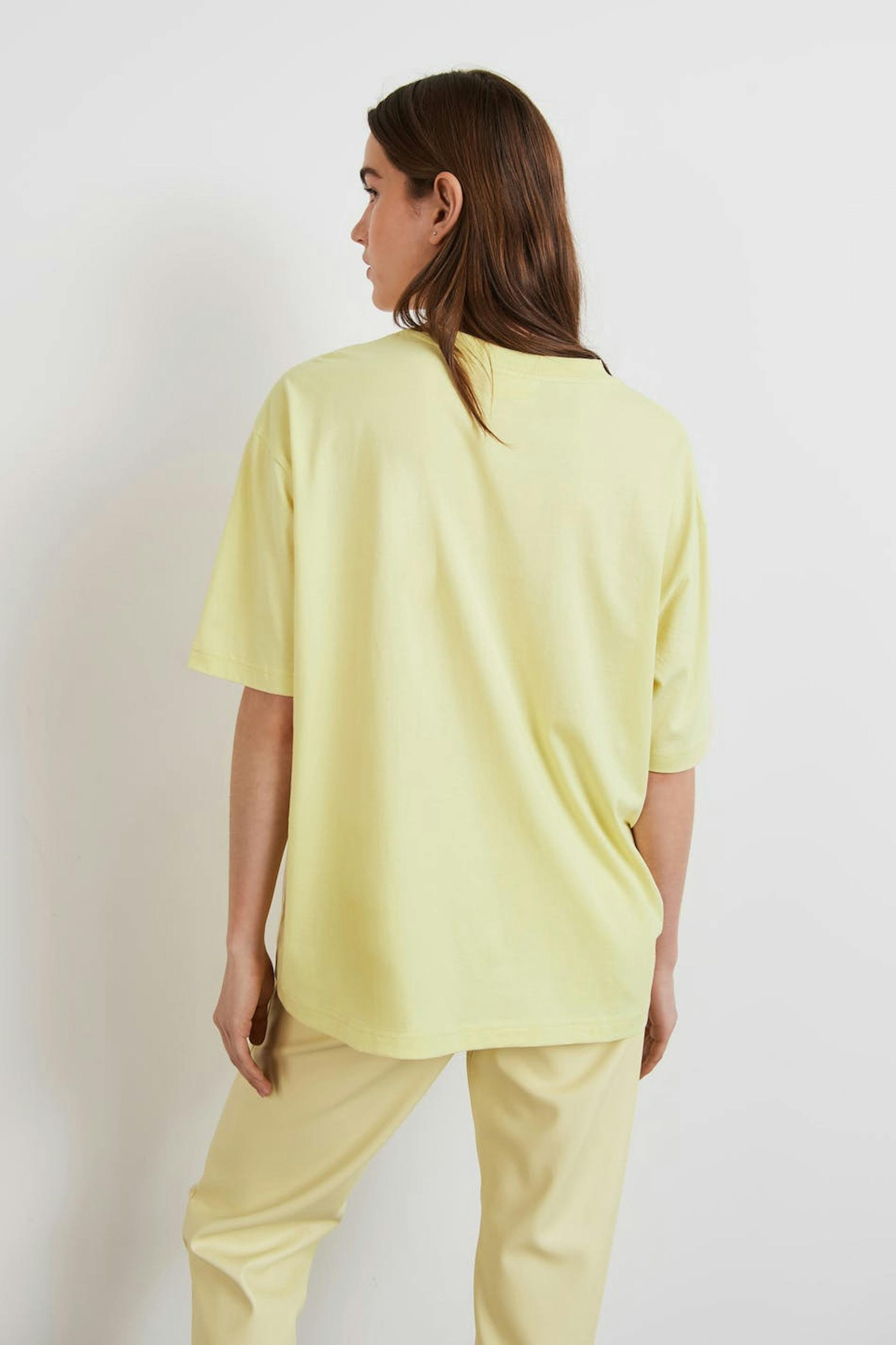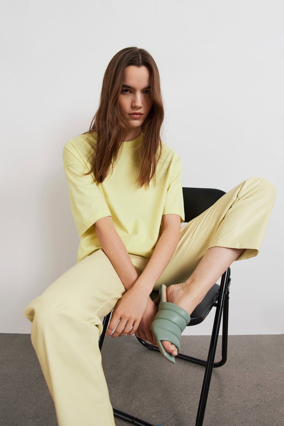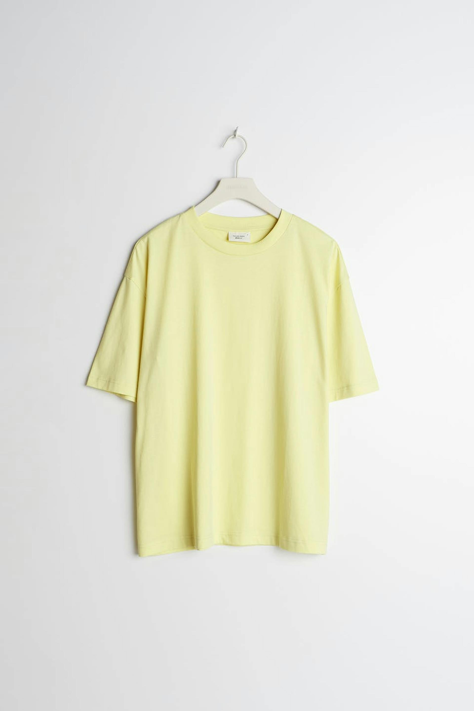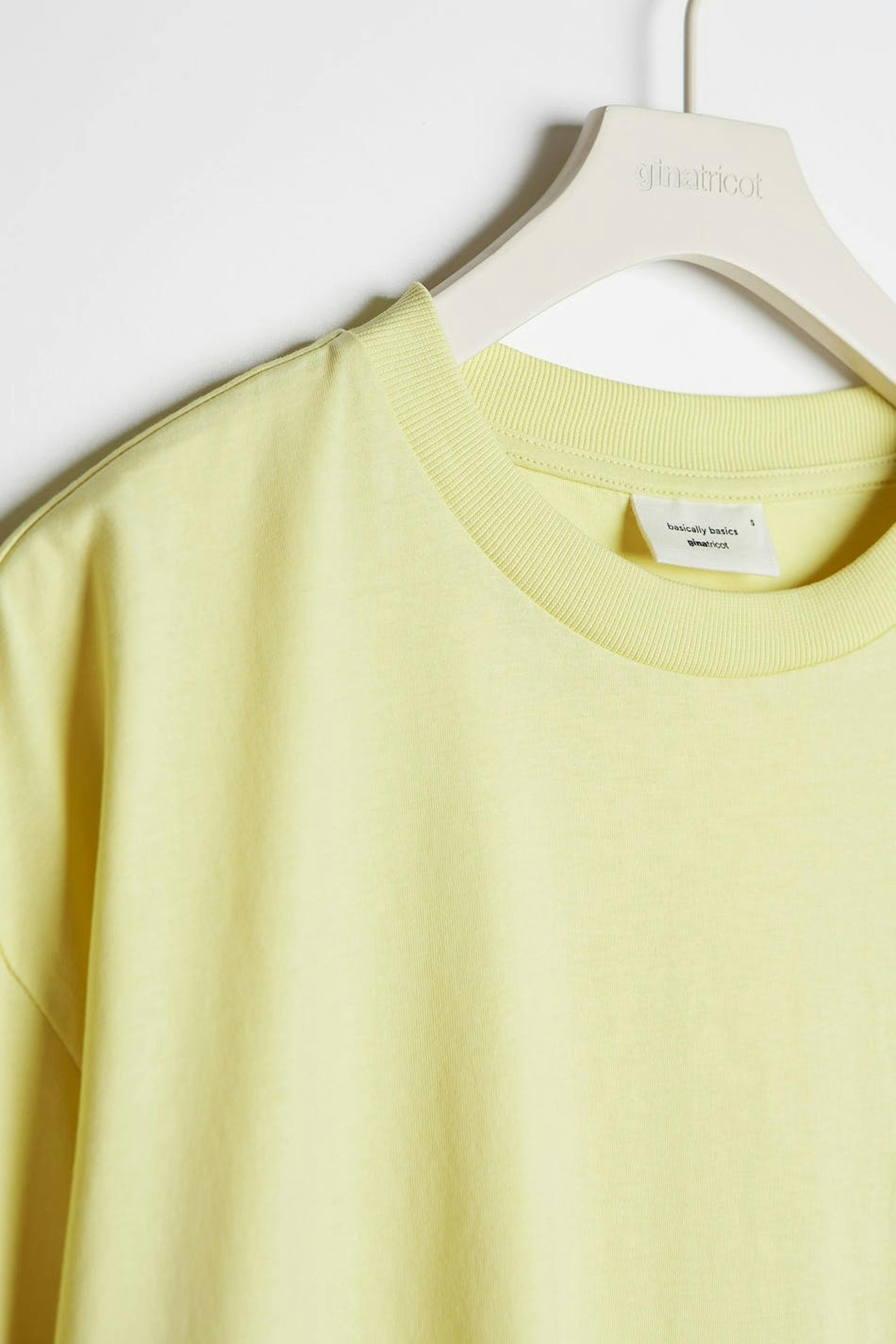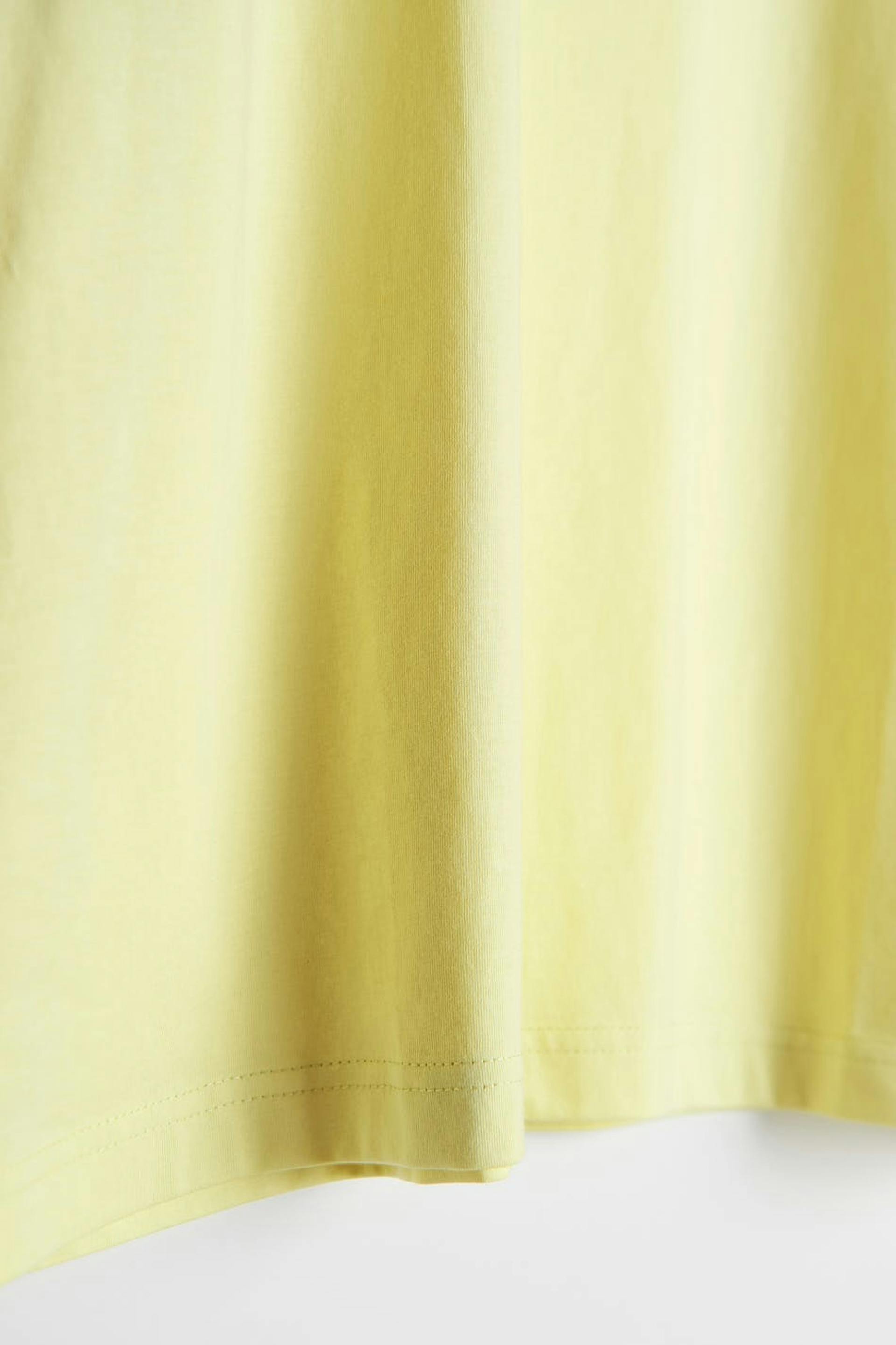T-paita oversized-mallilla. T-paita on keltainen ja siinä on pehmeä materiaali puuvillasta. Siinä on ribbiresori kaula-aukossa.