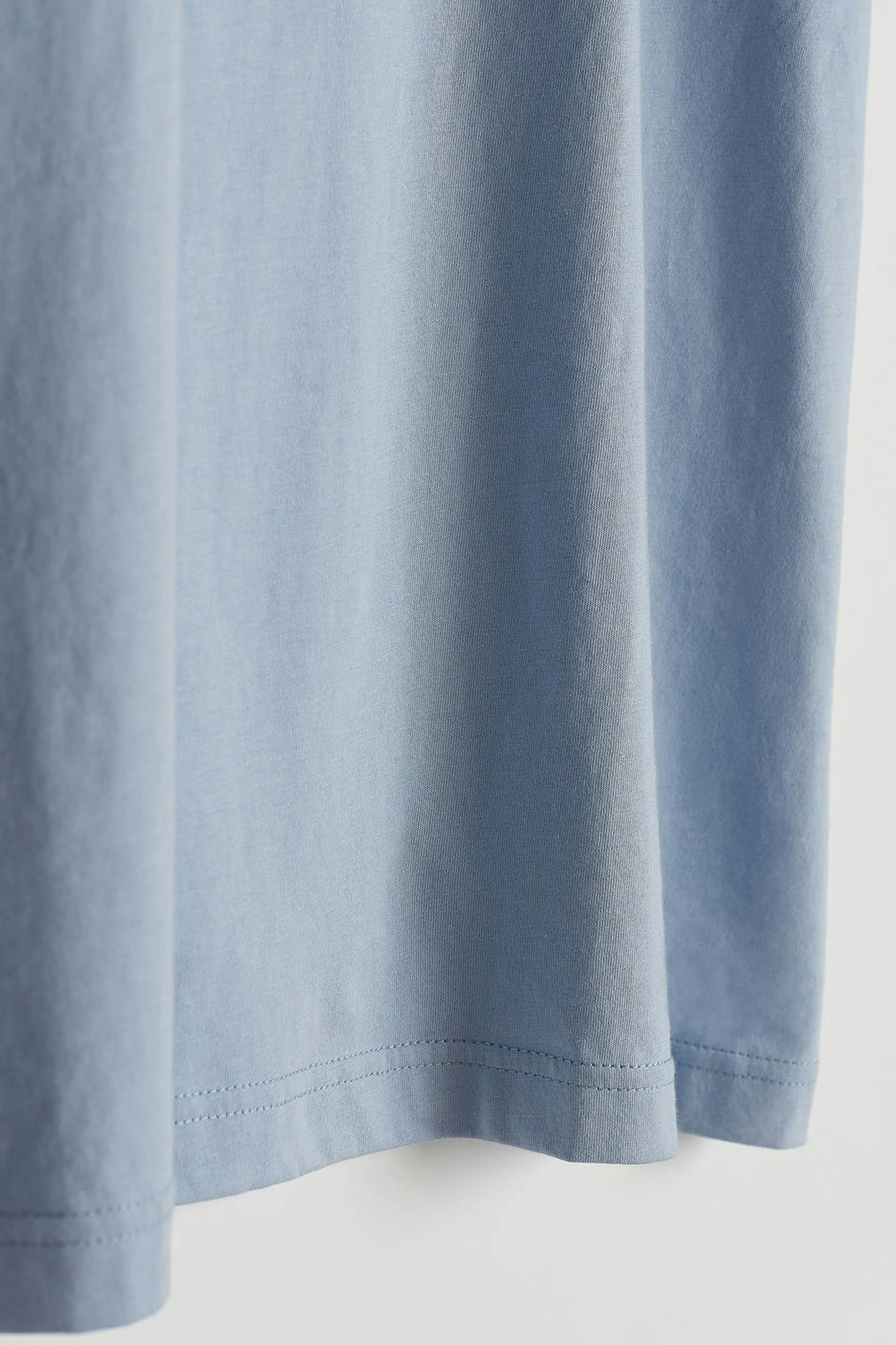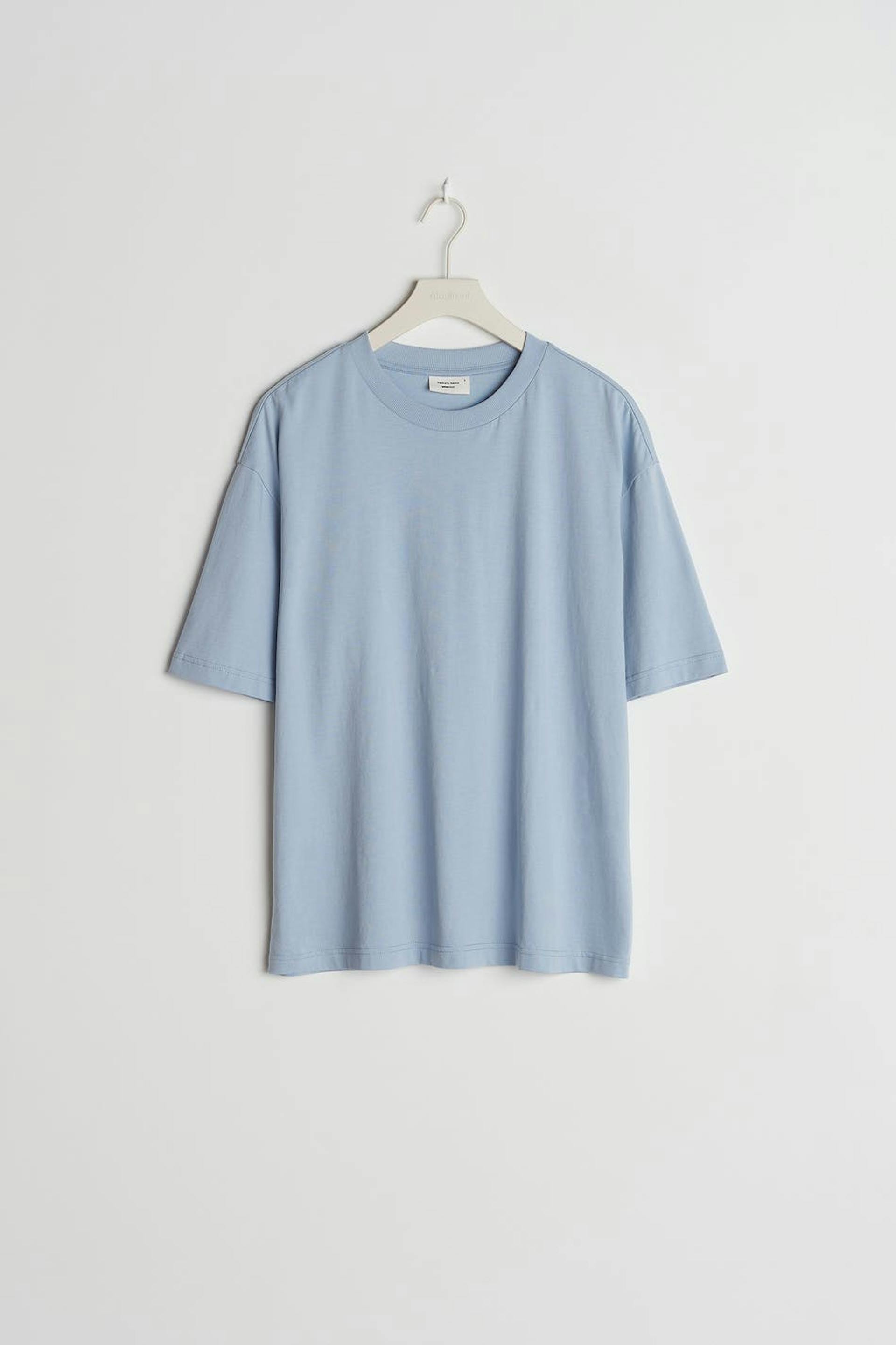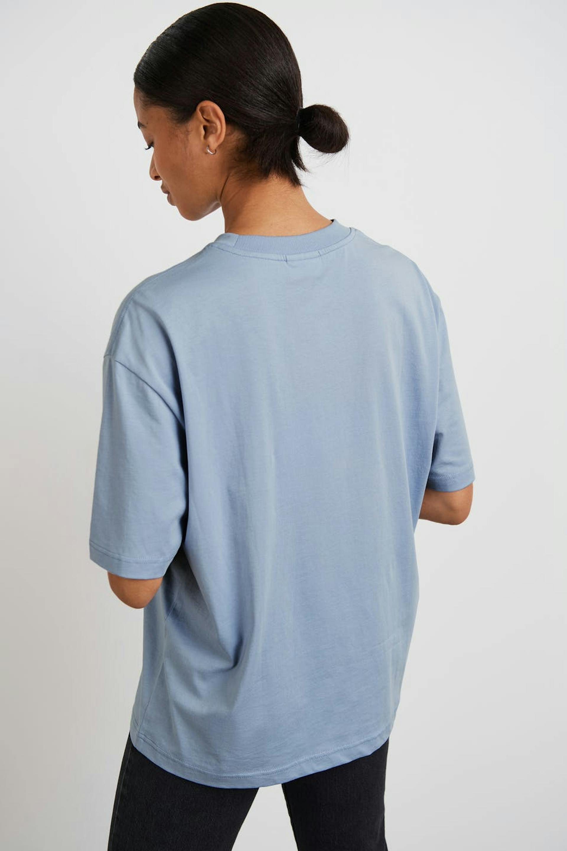 T-paita oversized-mallilla. T-paita on sininen ja siinä on pehmeä materiaali puuvillasta. Siinä on ribbiresori kaula-aukossa.