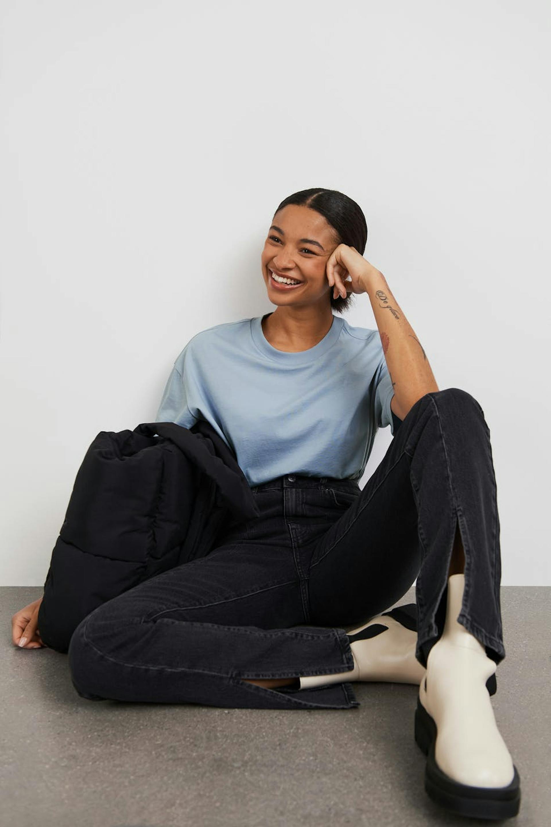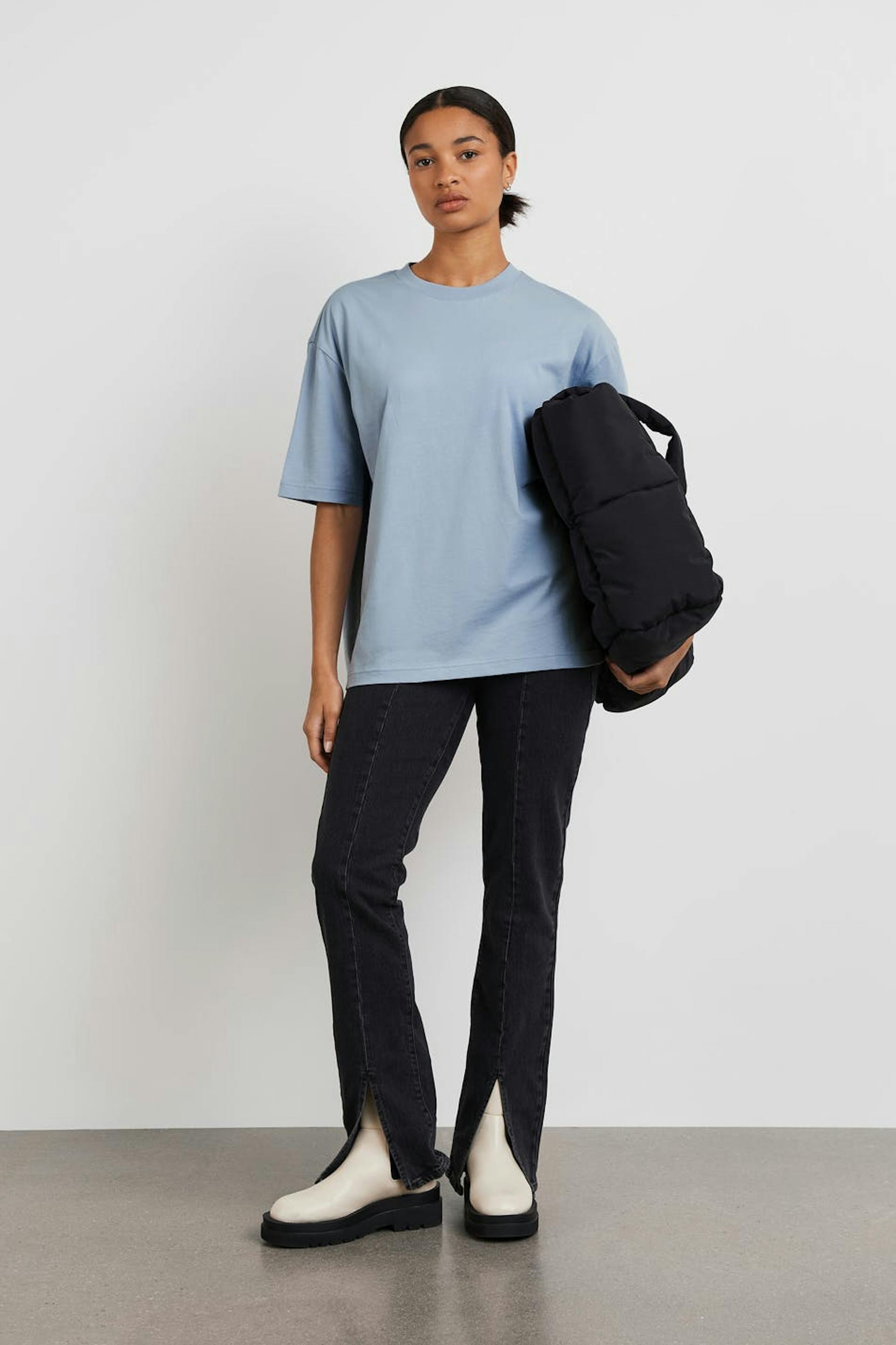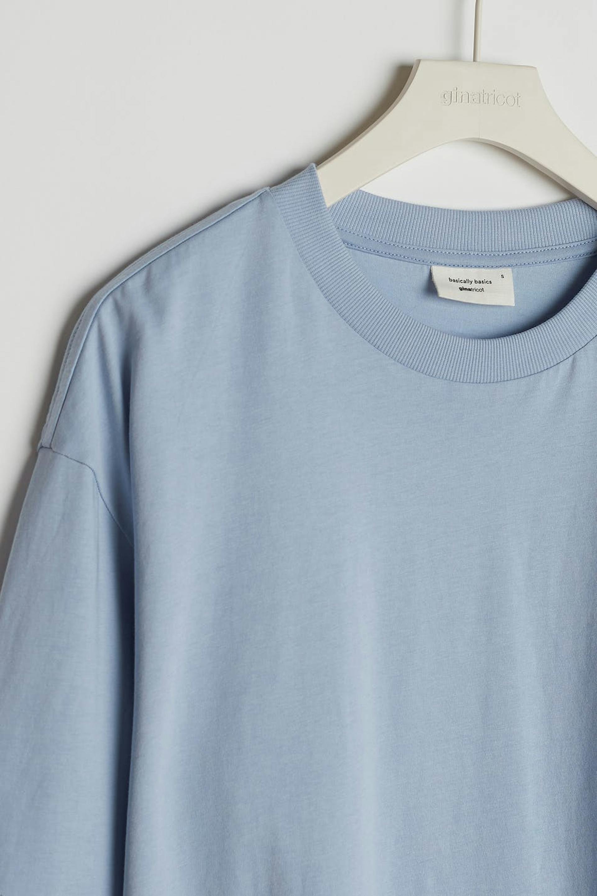 T-paita oversized-mallilla. T-paita on sininen ja siinä on pehmeä materiaali puuvillasta. Siinä on ribbiresori kaula-aukossa.