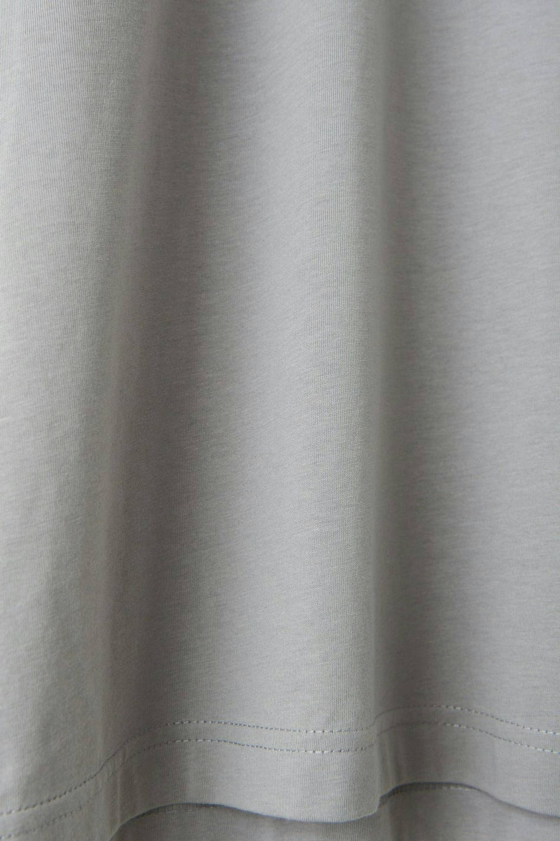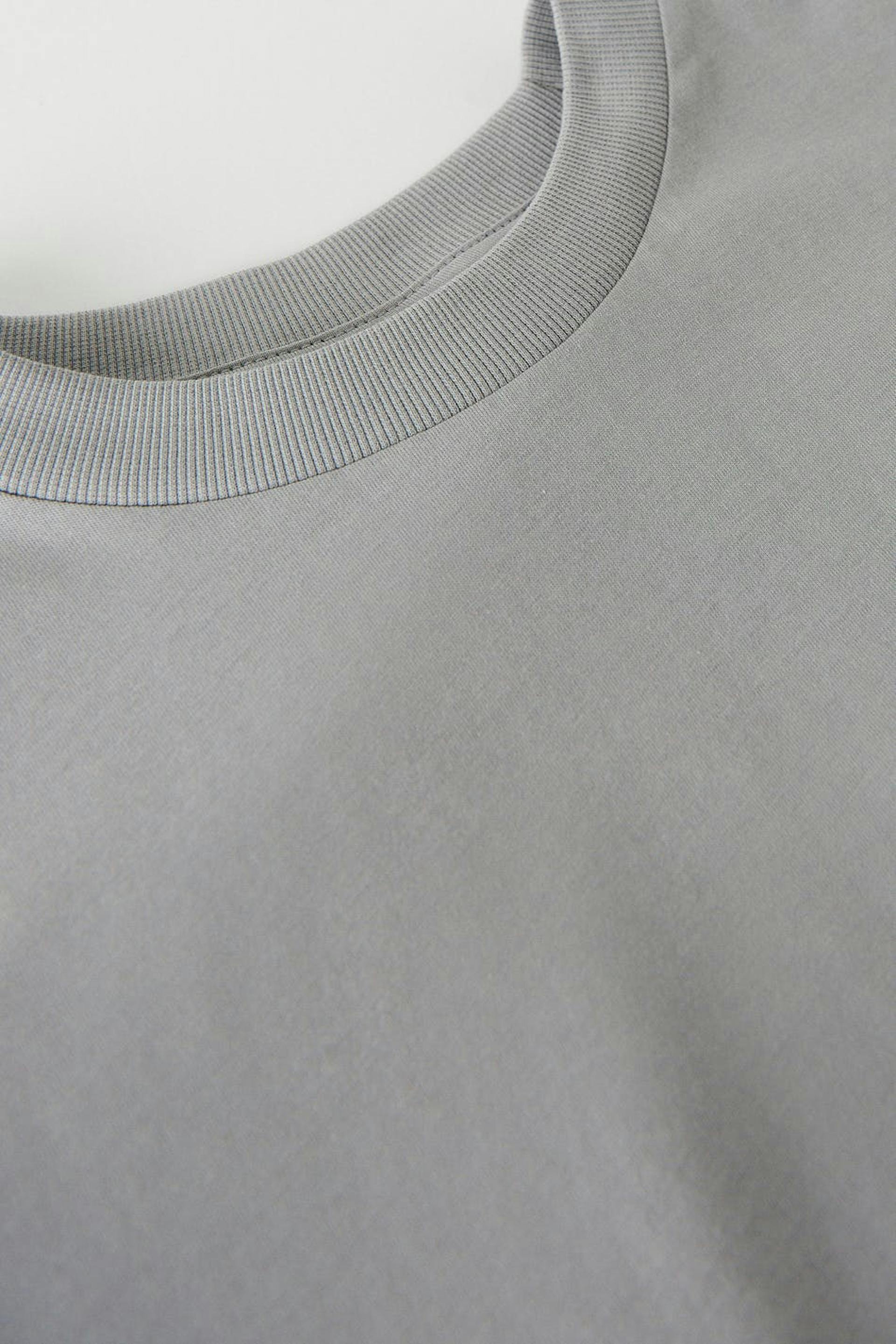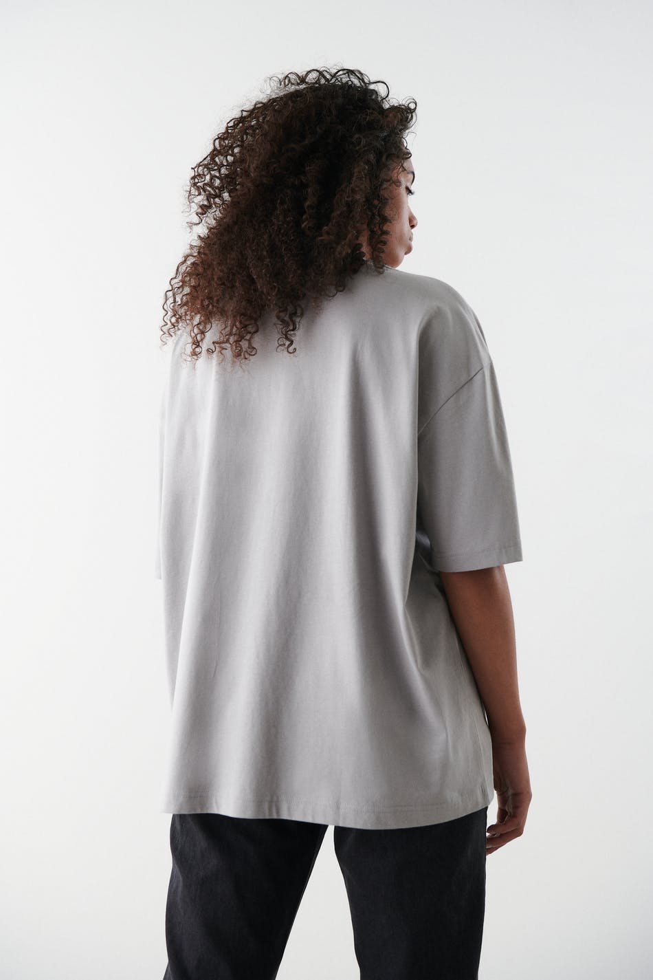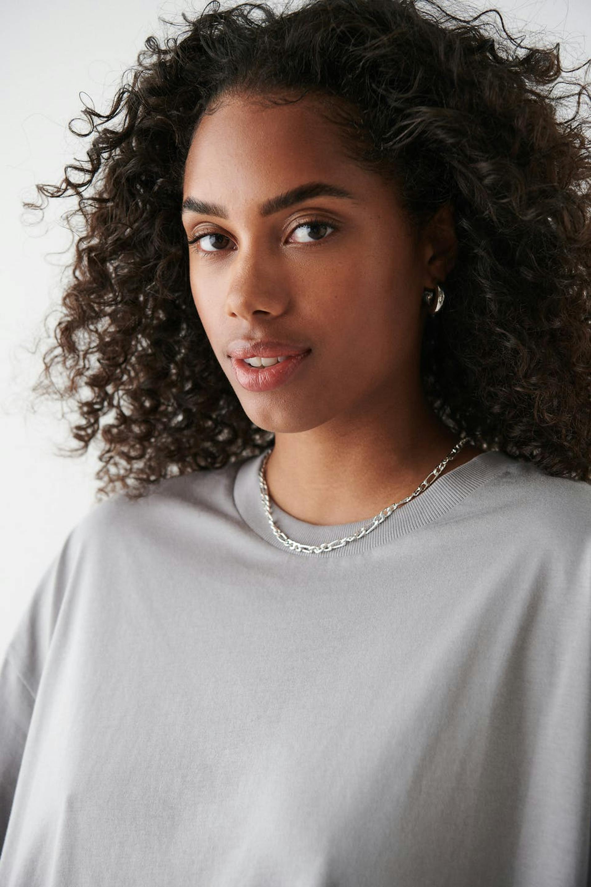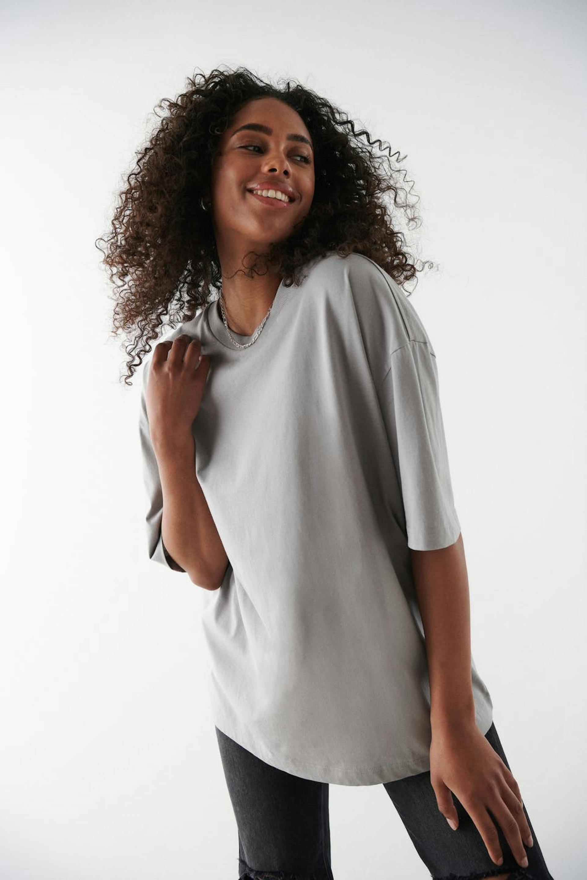 Pehmeä T-paita oversized-mallilla. T-paita on harmaa ja siinä on pehmeä materiaali puuvillasta. Siinä on ribbiresori kaula-aukossa.