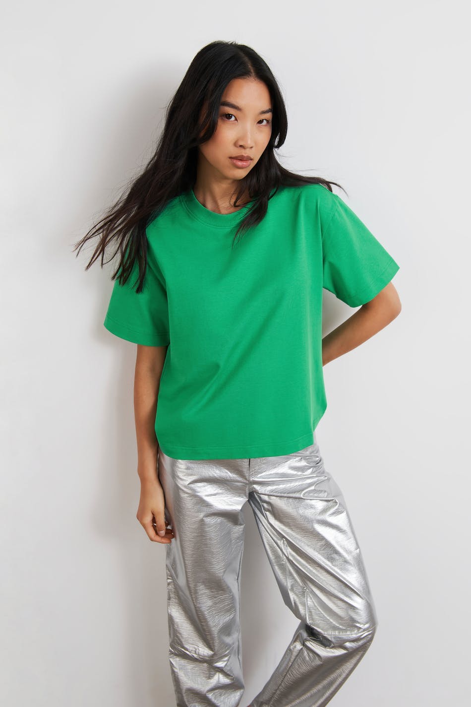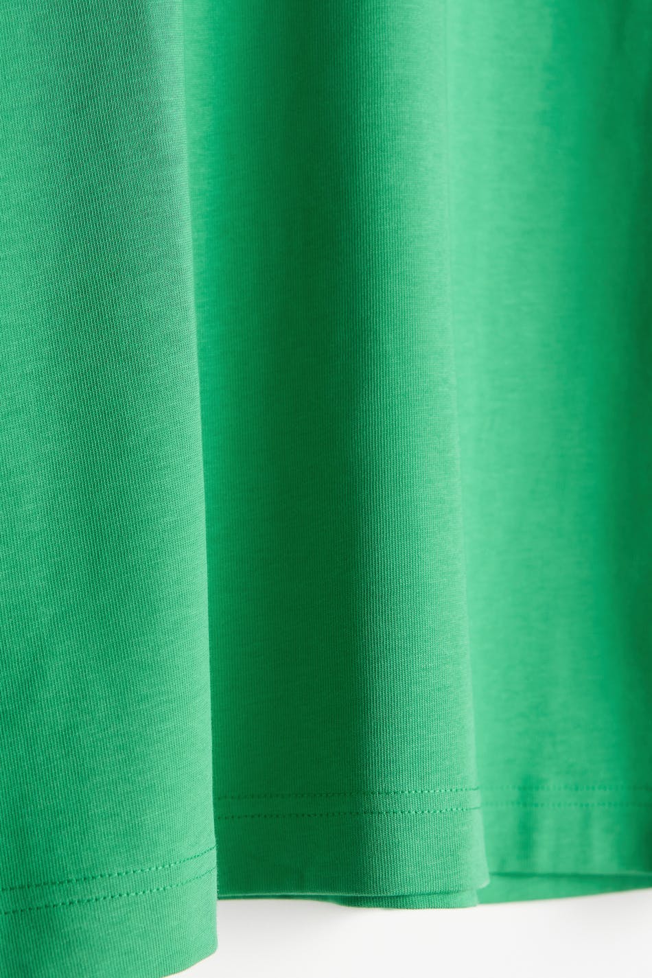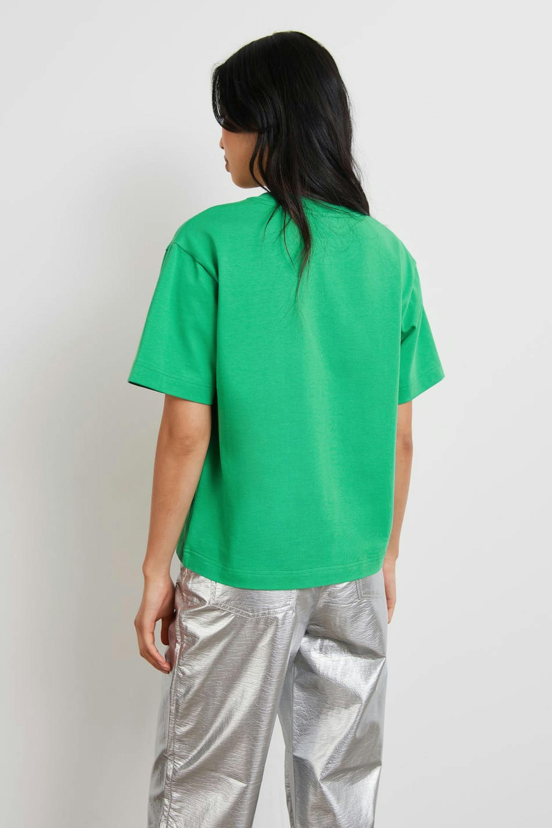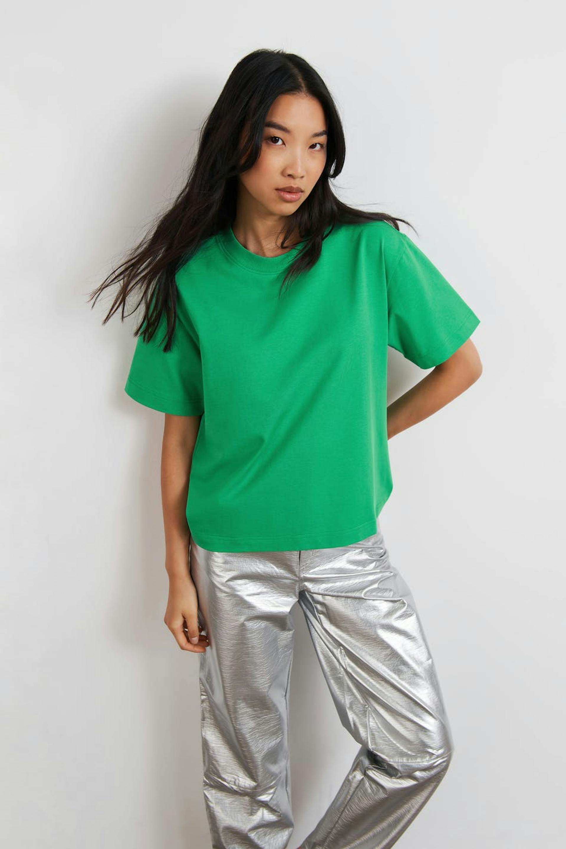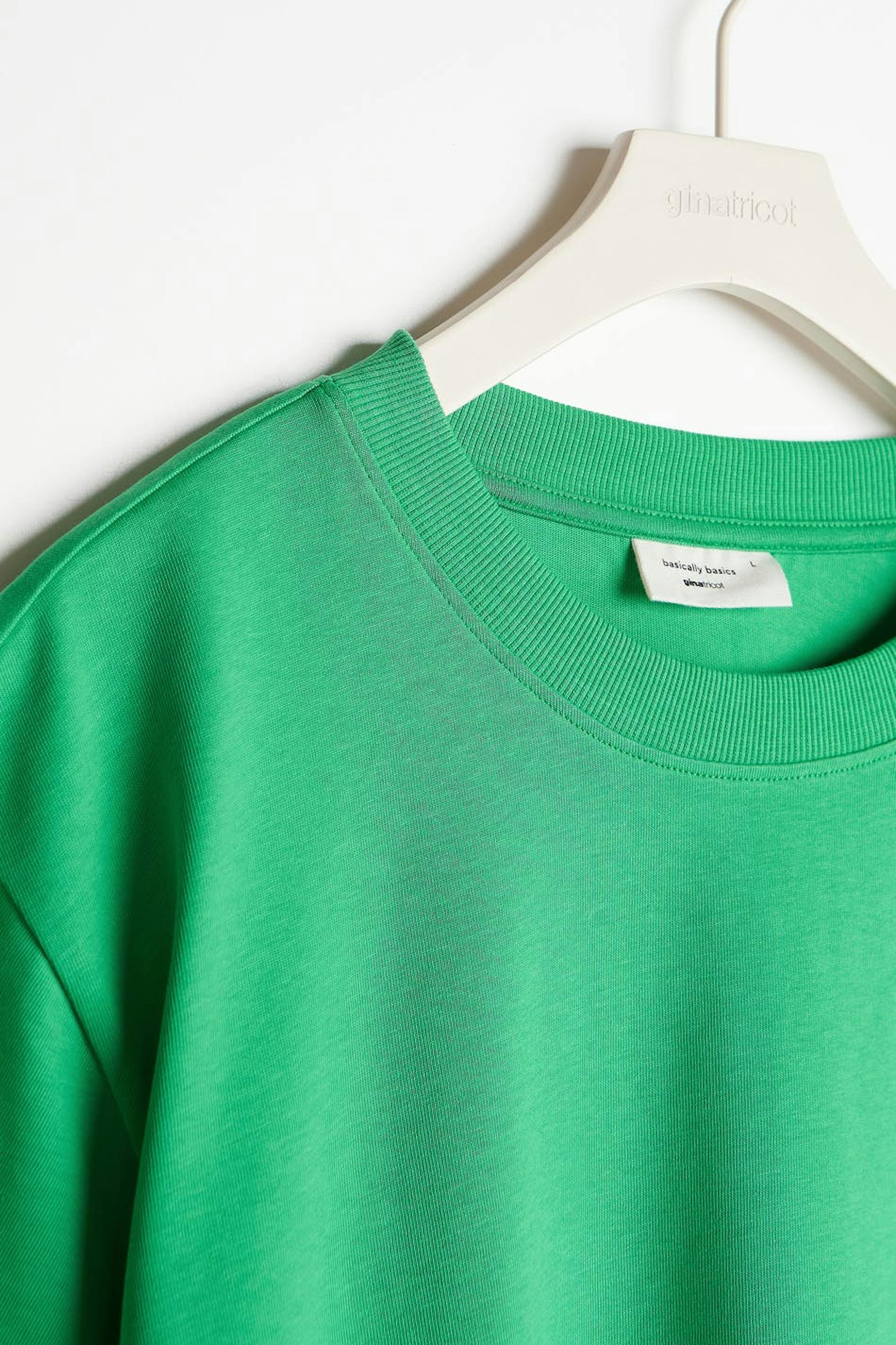 T-paita oversized-mallilla. T-paita on vihreä ja siinä on pehmeä materiaali puuvillasta. Siinä on ribbiresori kaula-aukossa.