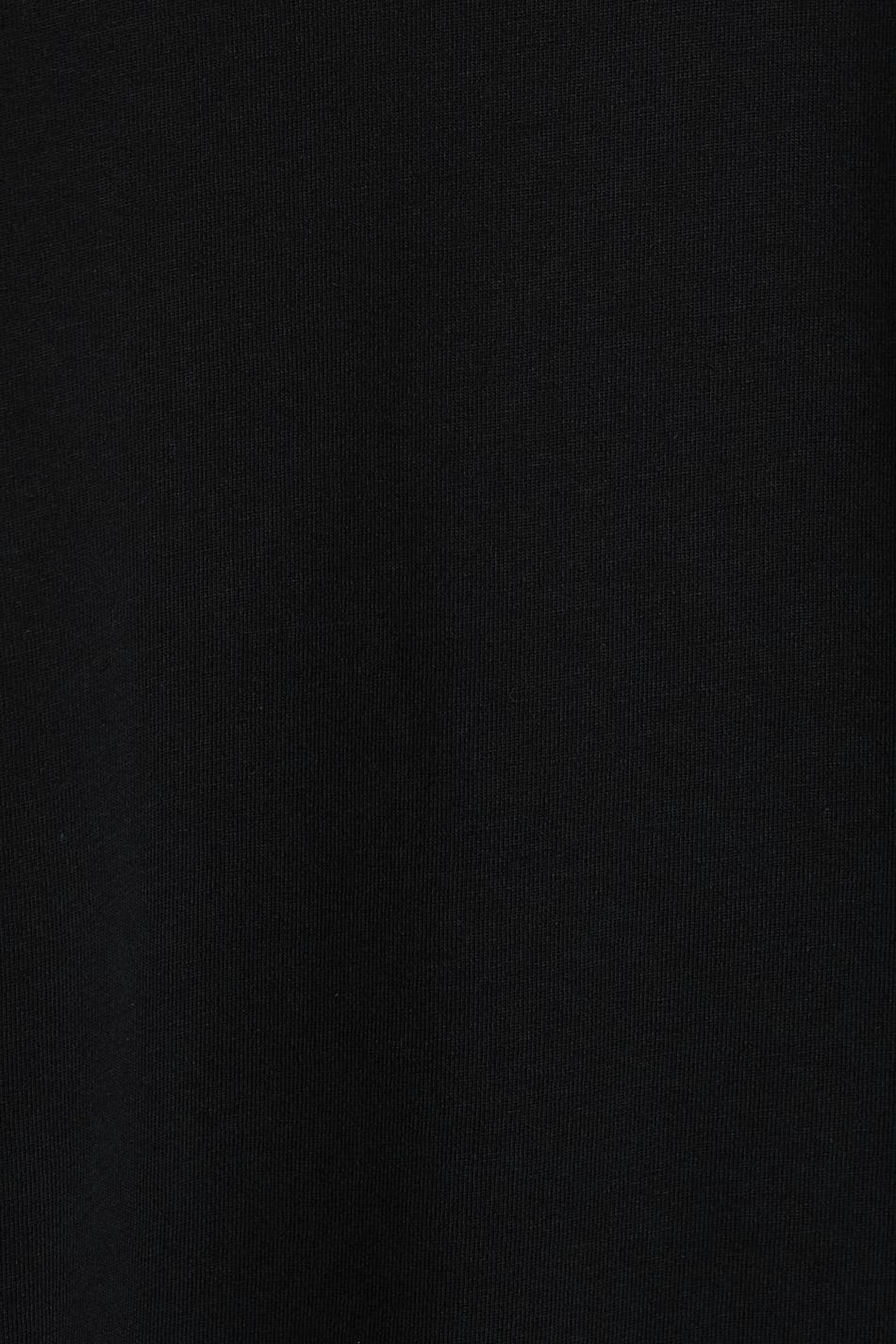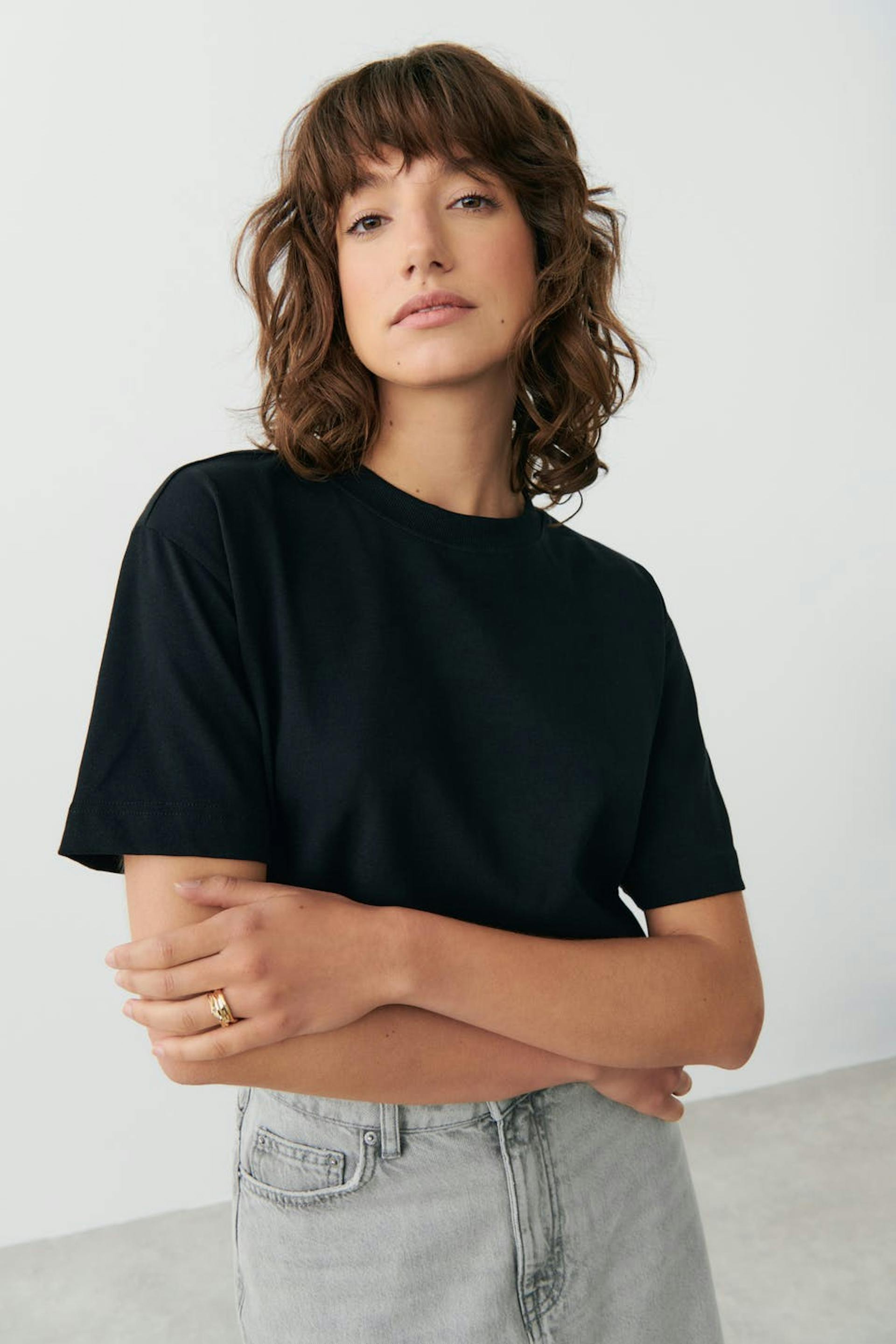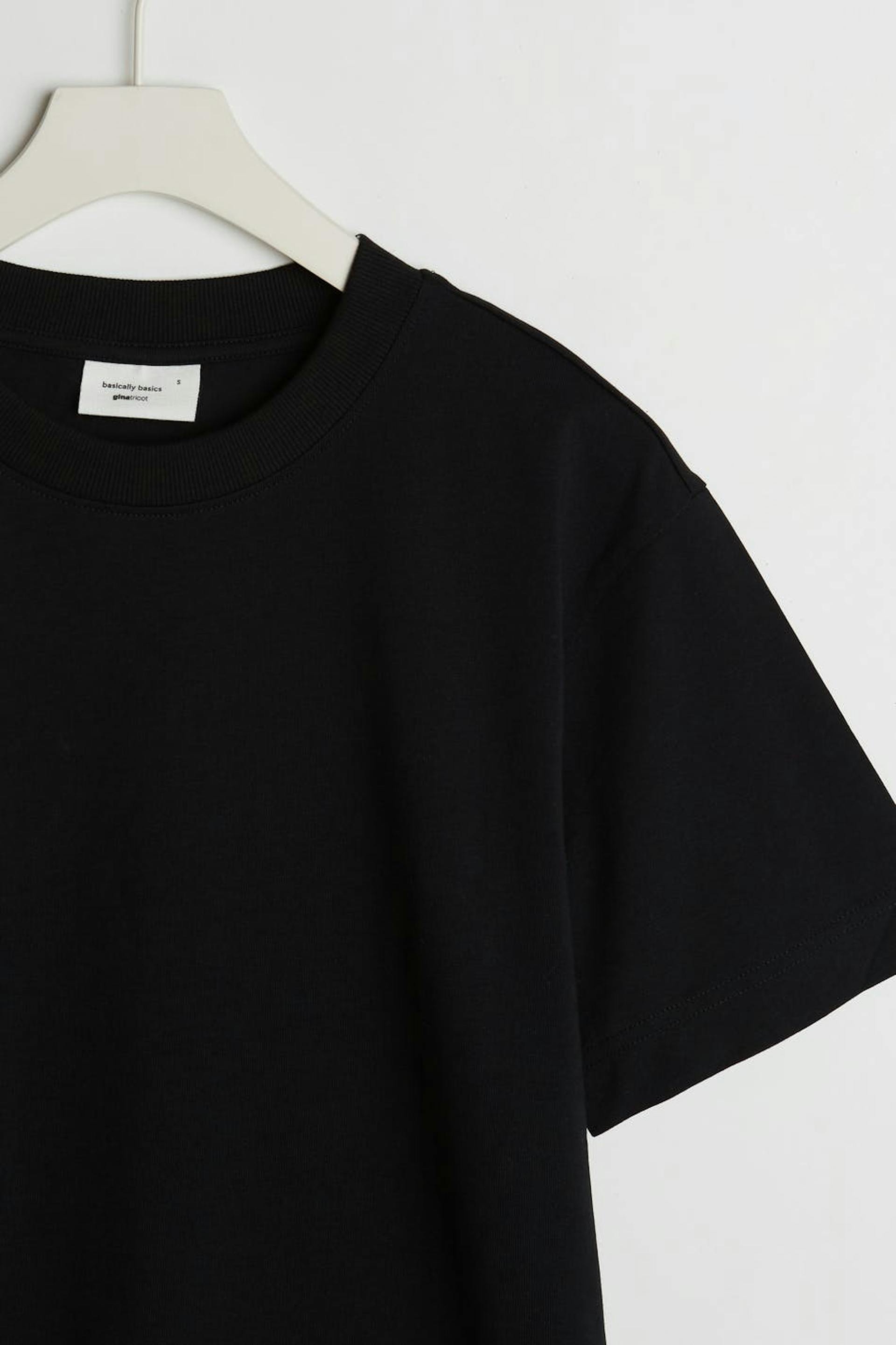 T-paita ylisuuri istuvuudella. T-paita on musta ja siinä on paksu materiaali. Siinä on ribbed mansetti kaula-aukossa.