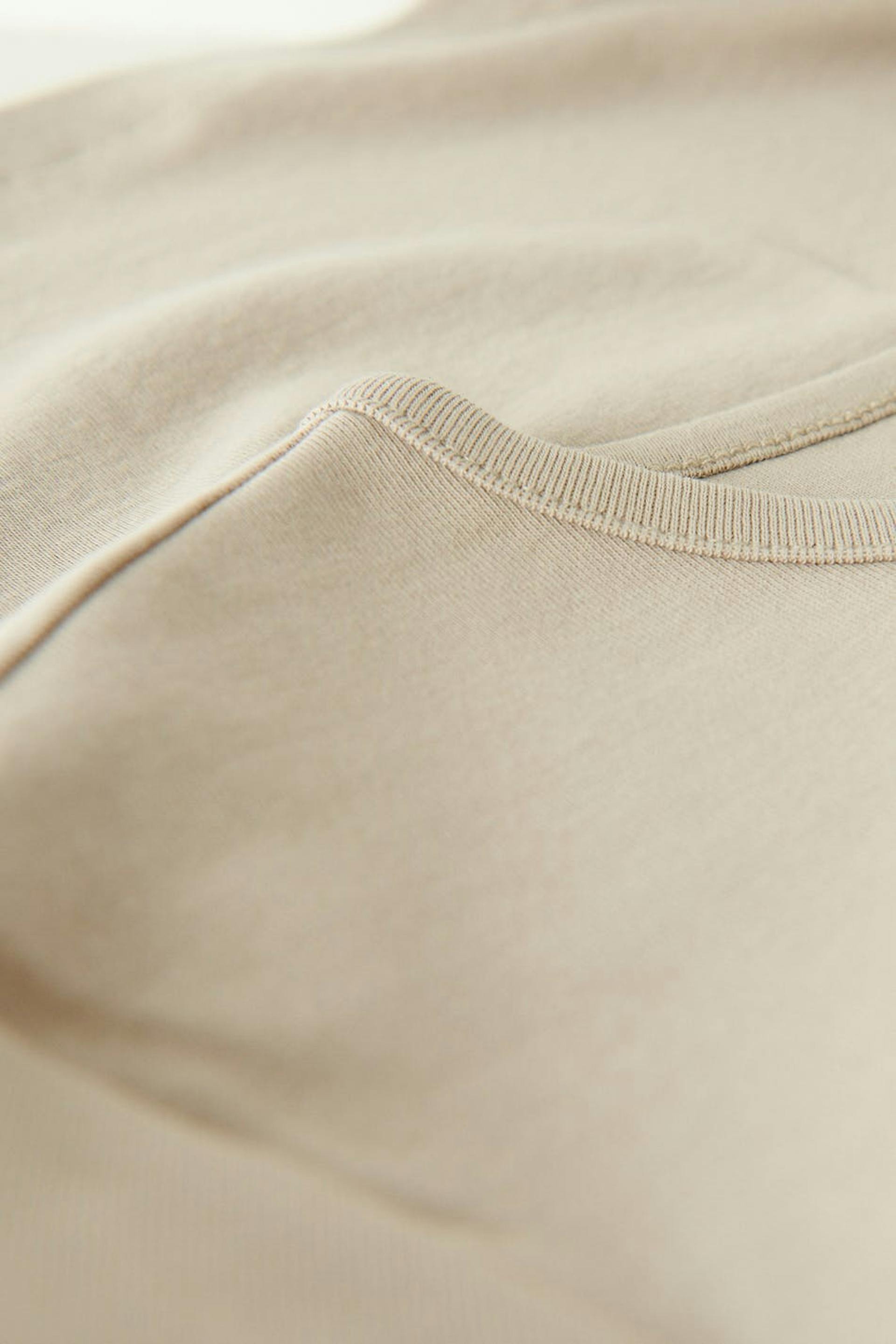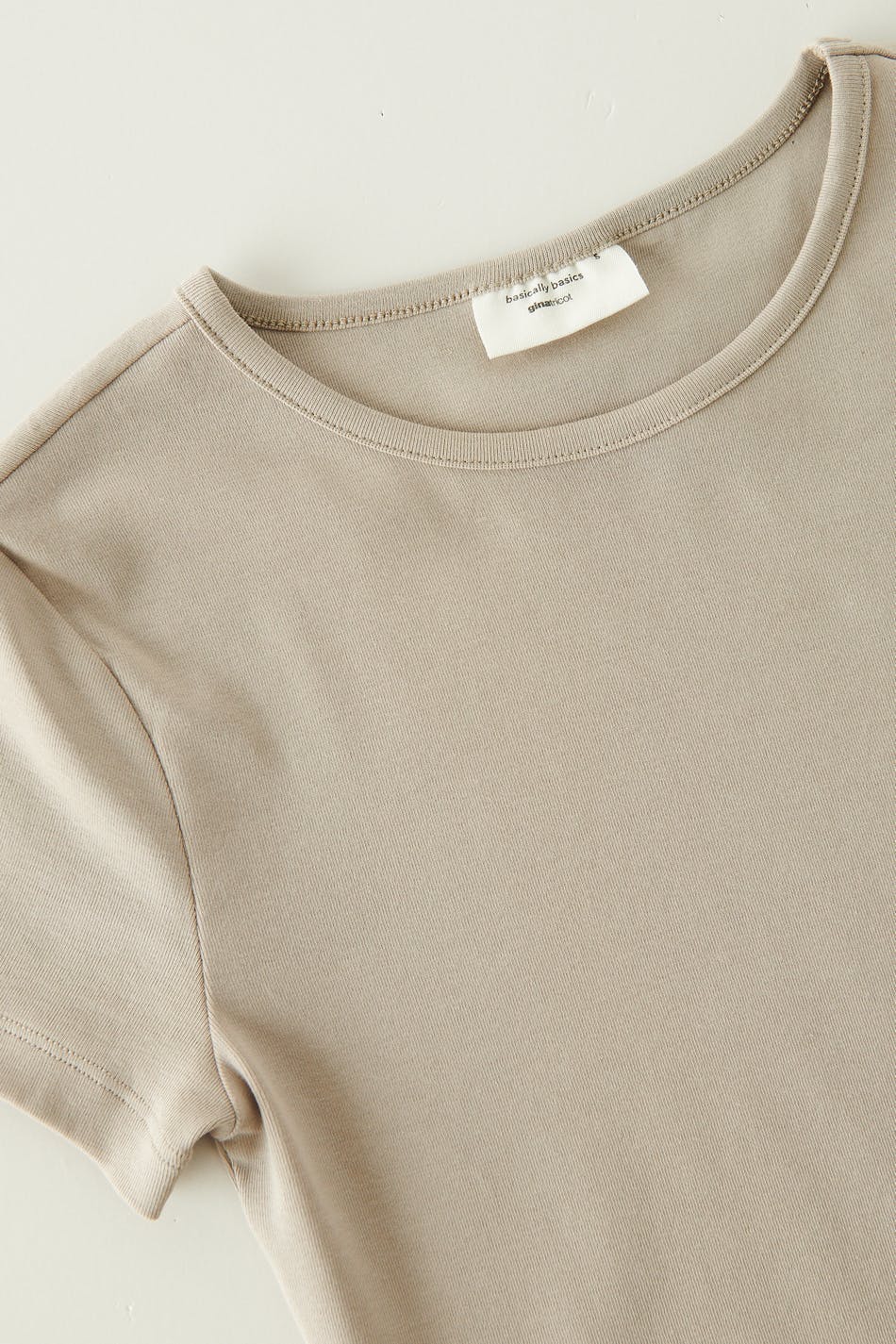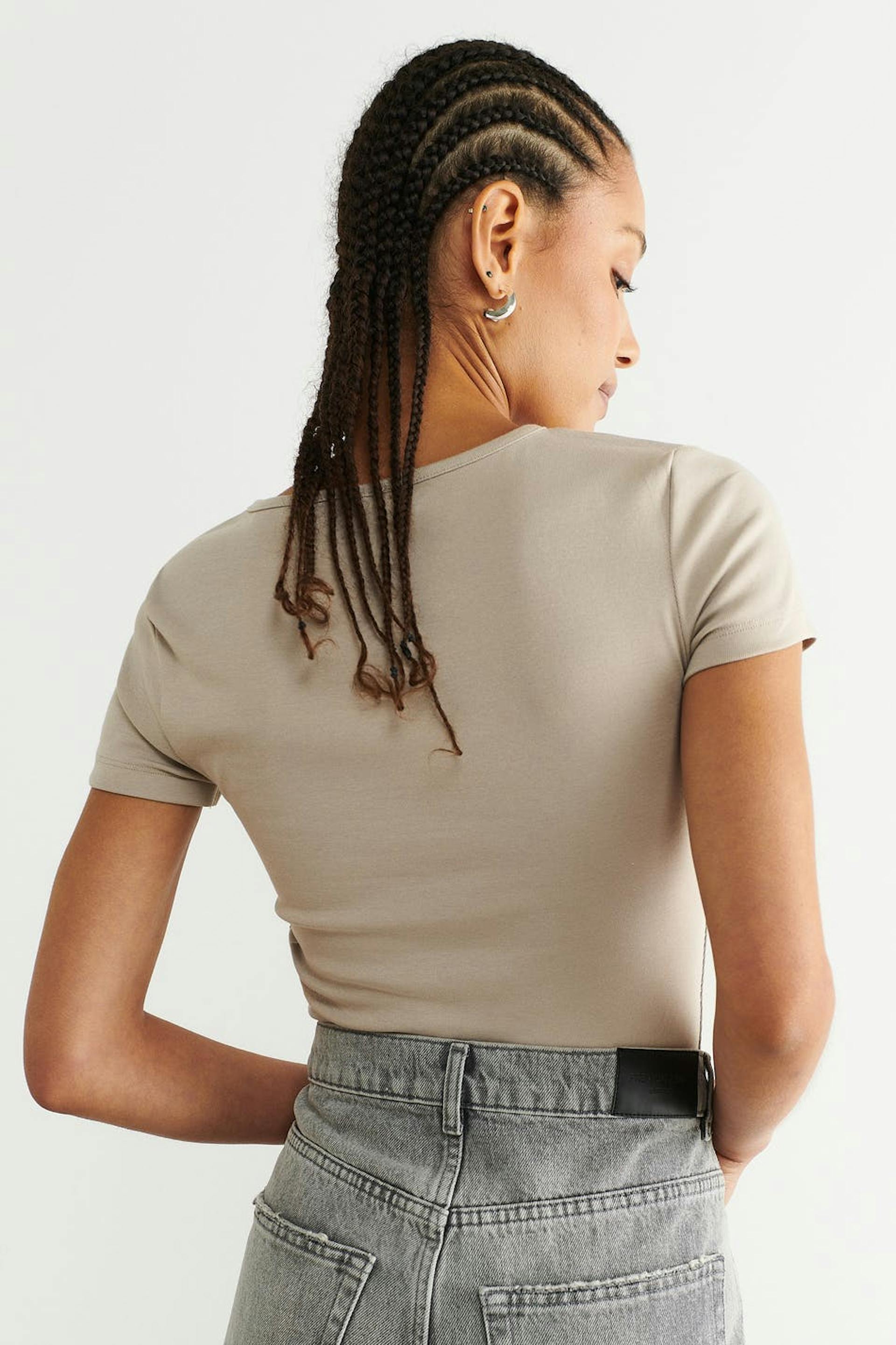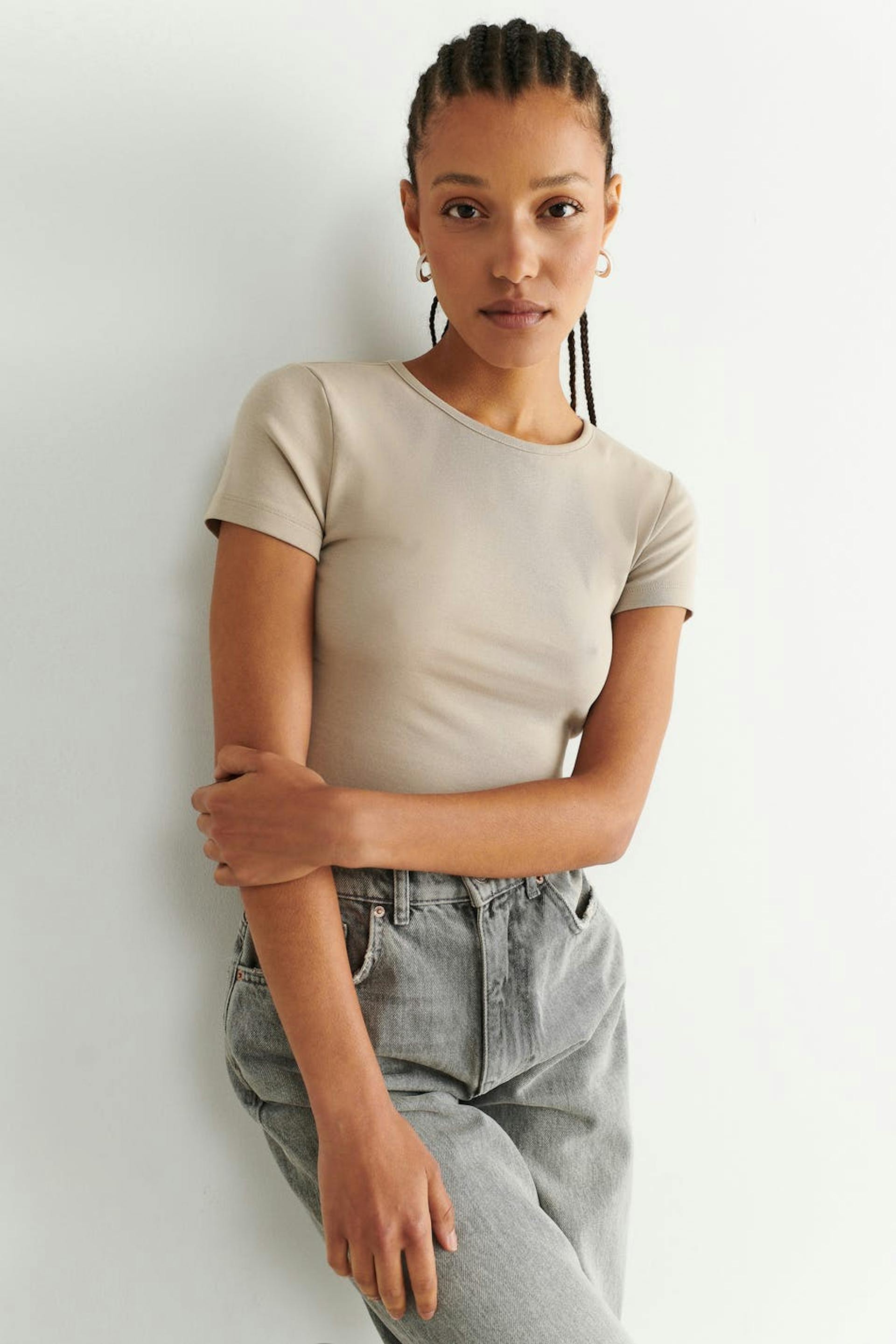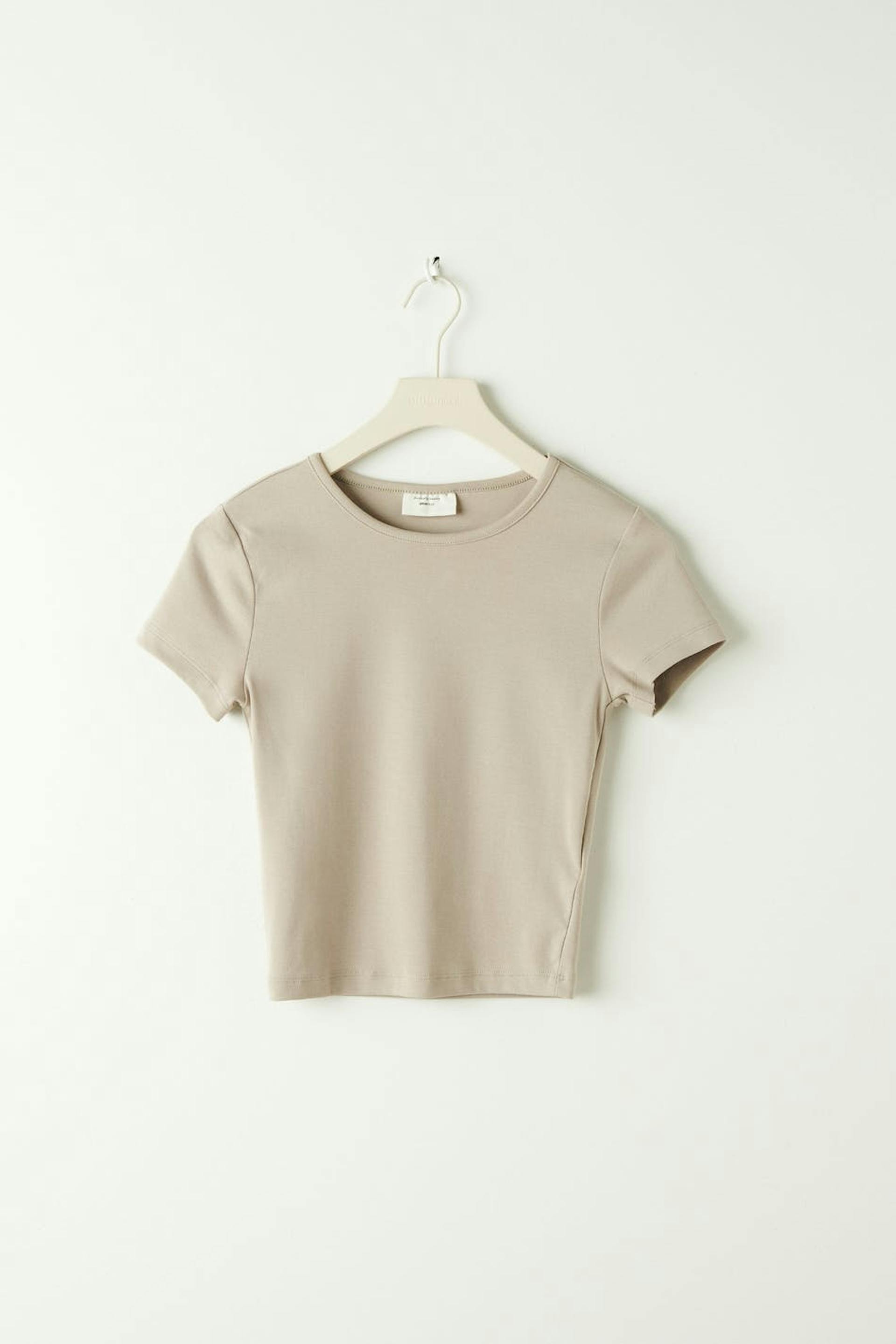 Lyhythihainen trikootoppi vartalonmyötäisellä istuvuudella. Trikootoppi on beige ja siinä on cropattu pituus.
