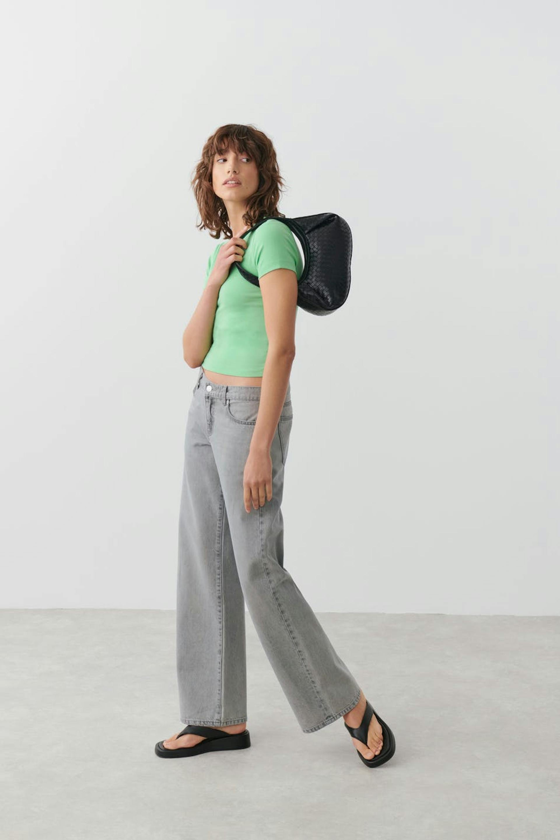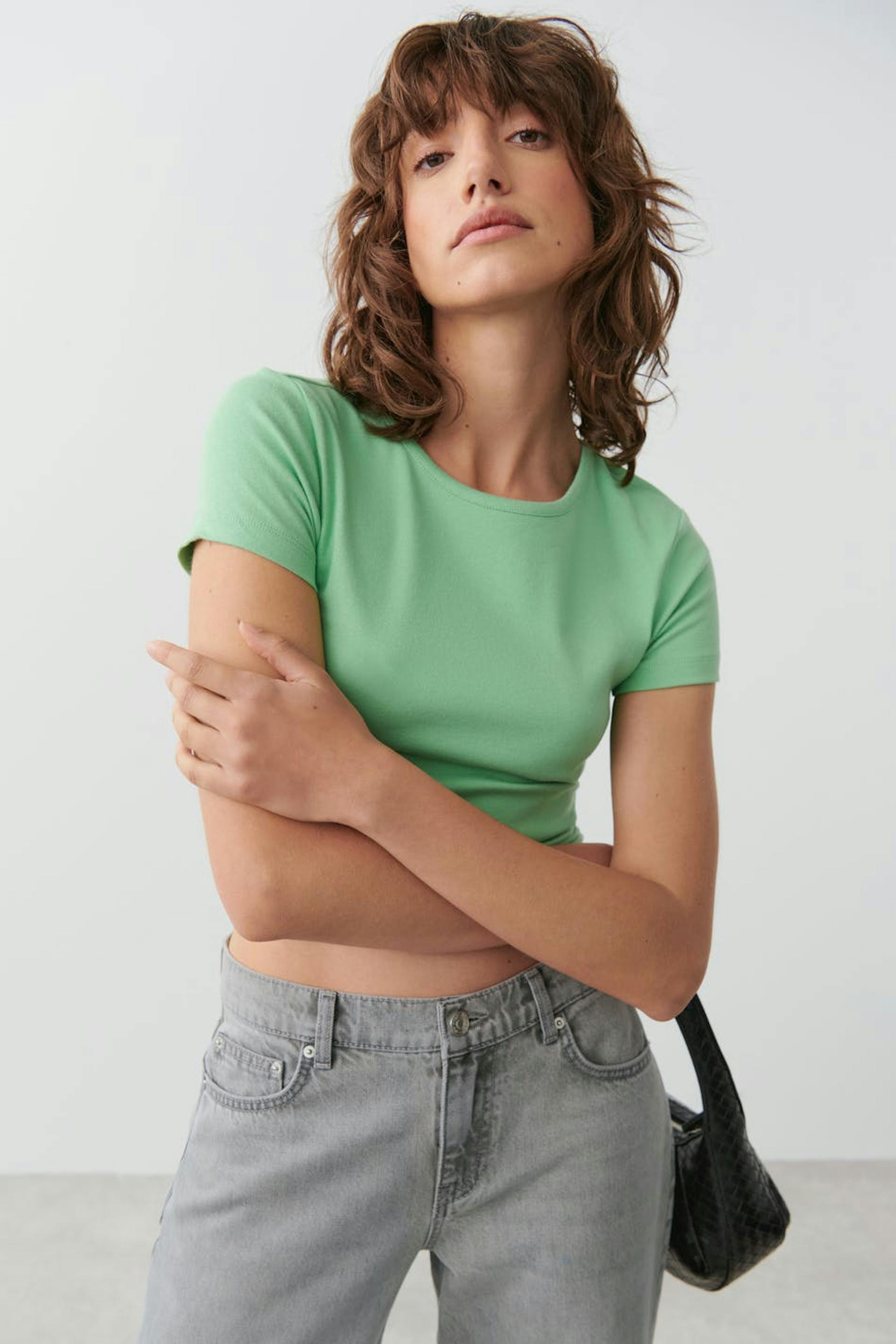 Lyhythihainen toppi vartalonmyötäisellä istuvuudella. Toppi on vihreä ja siinä on cropattu pituus.