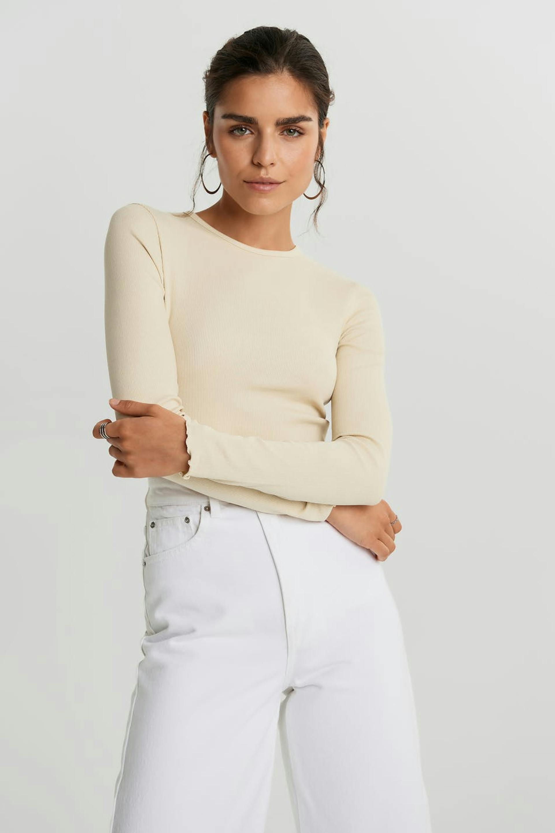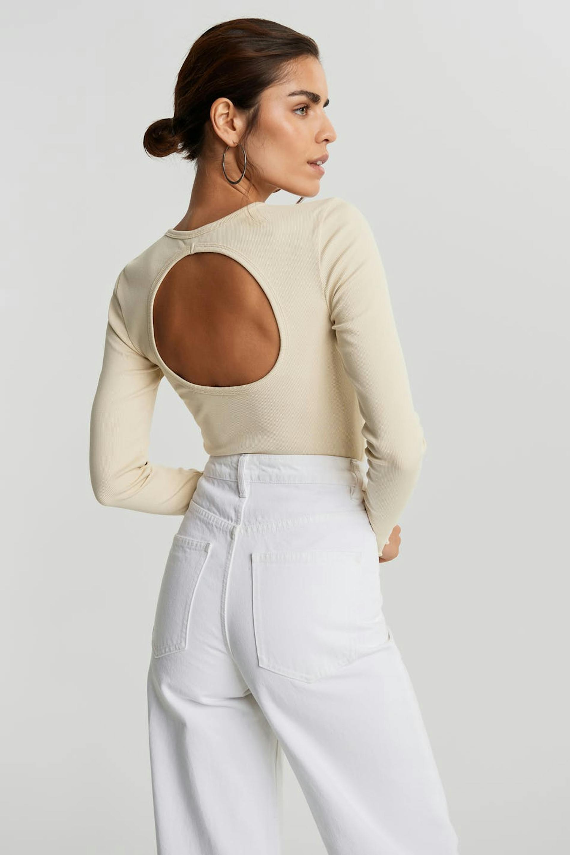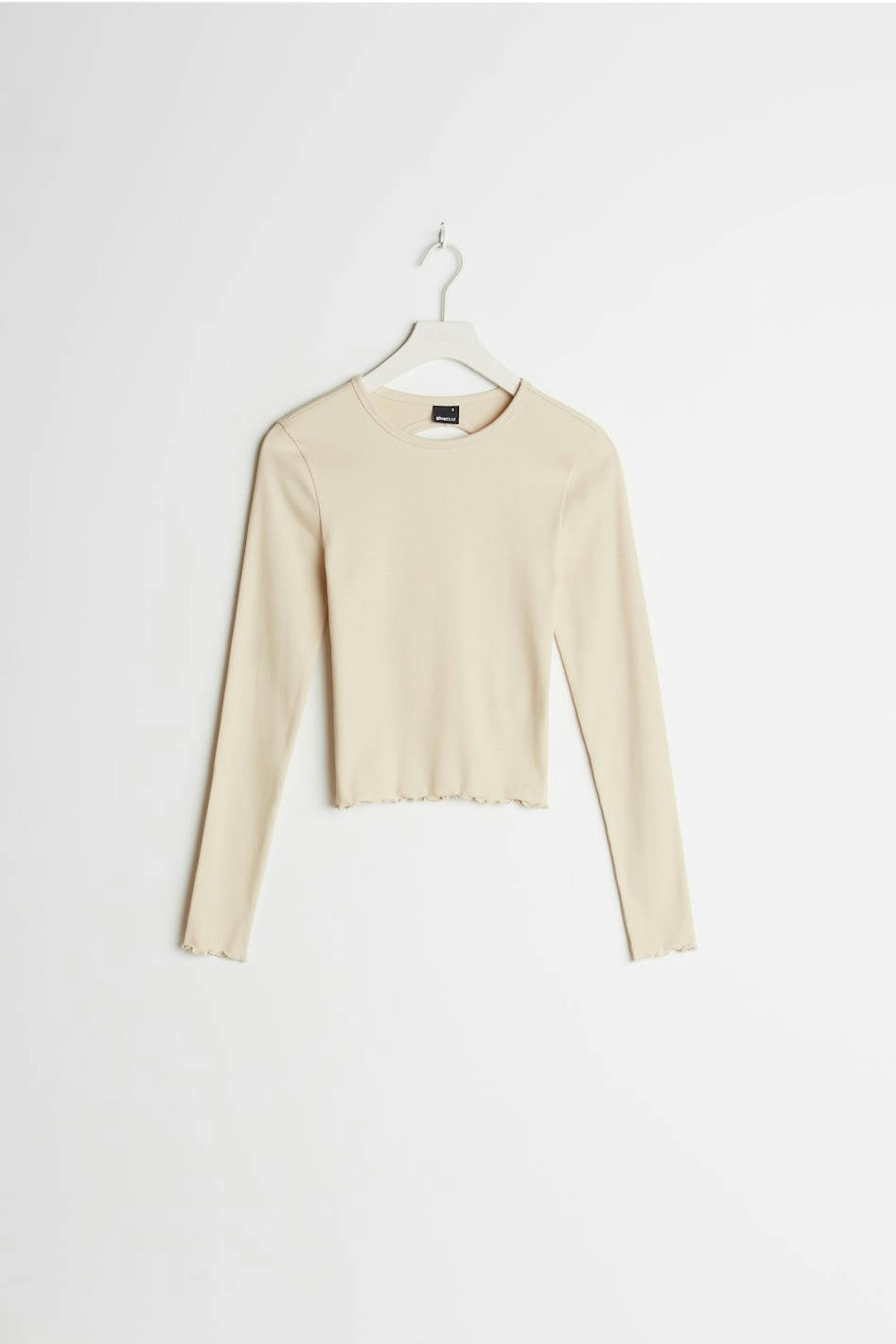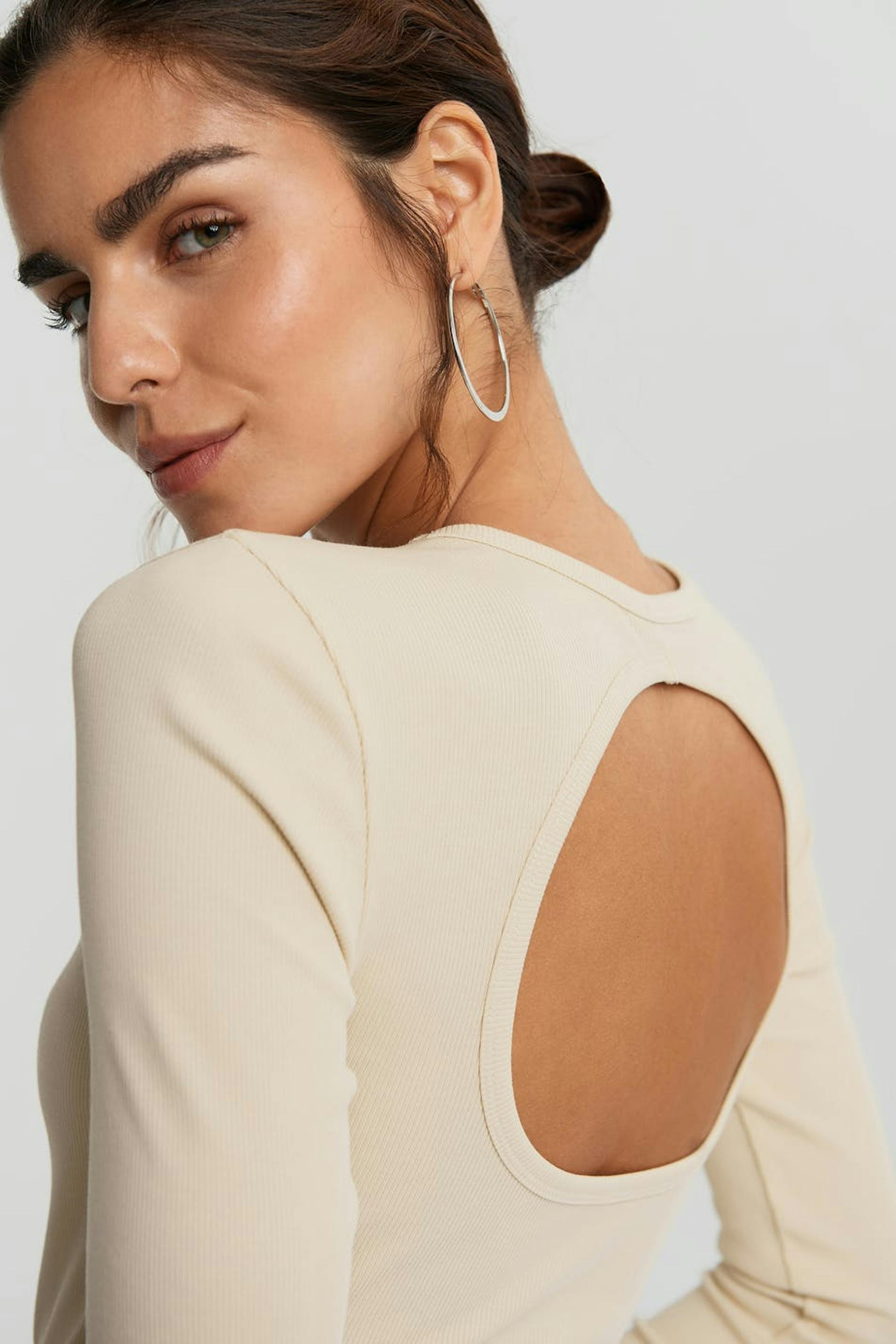 Pitkähihainen toppi vartalonmyötäisellä istuvuudella. Toppi on beige ja siinä on avoin yksityiskohta selässä. Se valmistetaan trikoosta.