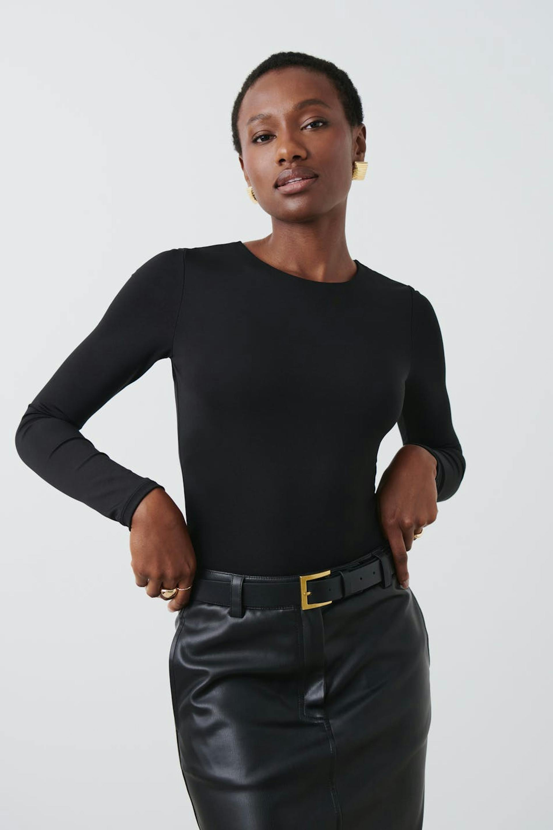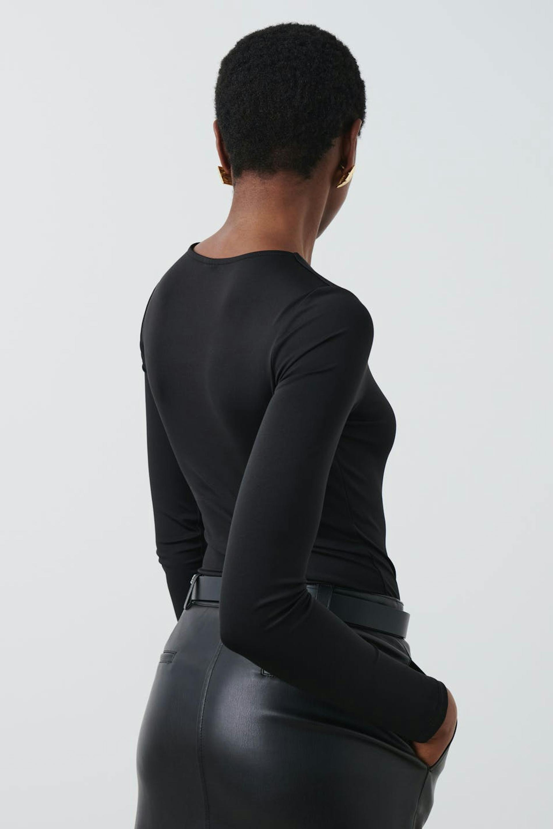 Pitkähihainen bodyasu mikrokuidusta nyörillä takana. Bodyasu on musta ja siinä on tyköistuva istuvuus. Siinä on pyöreä pääntie, vuori edessä ja napitus jalkovälissä.