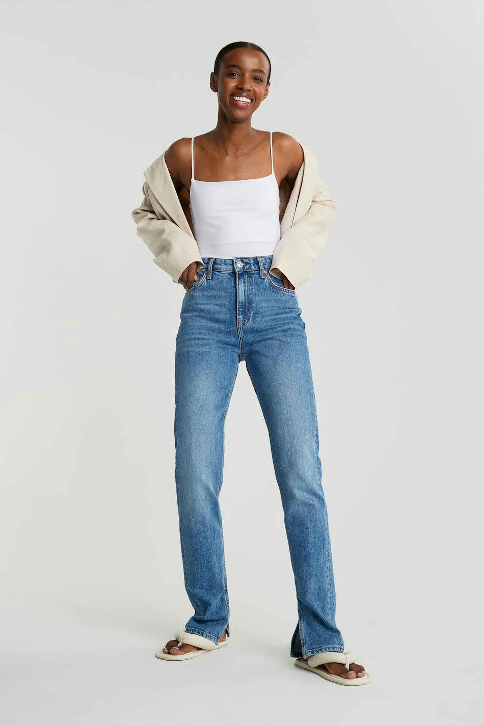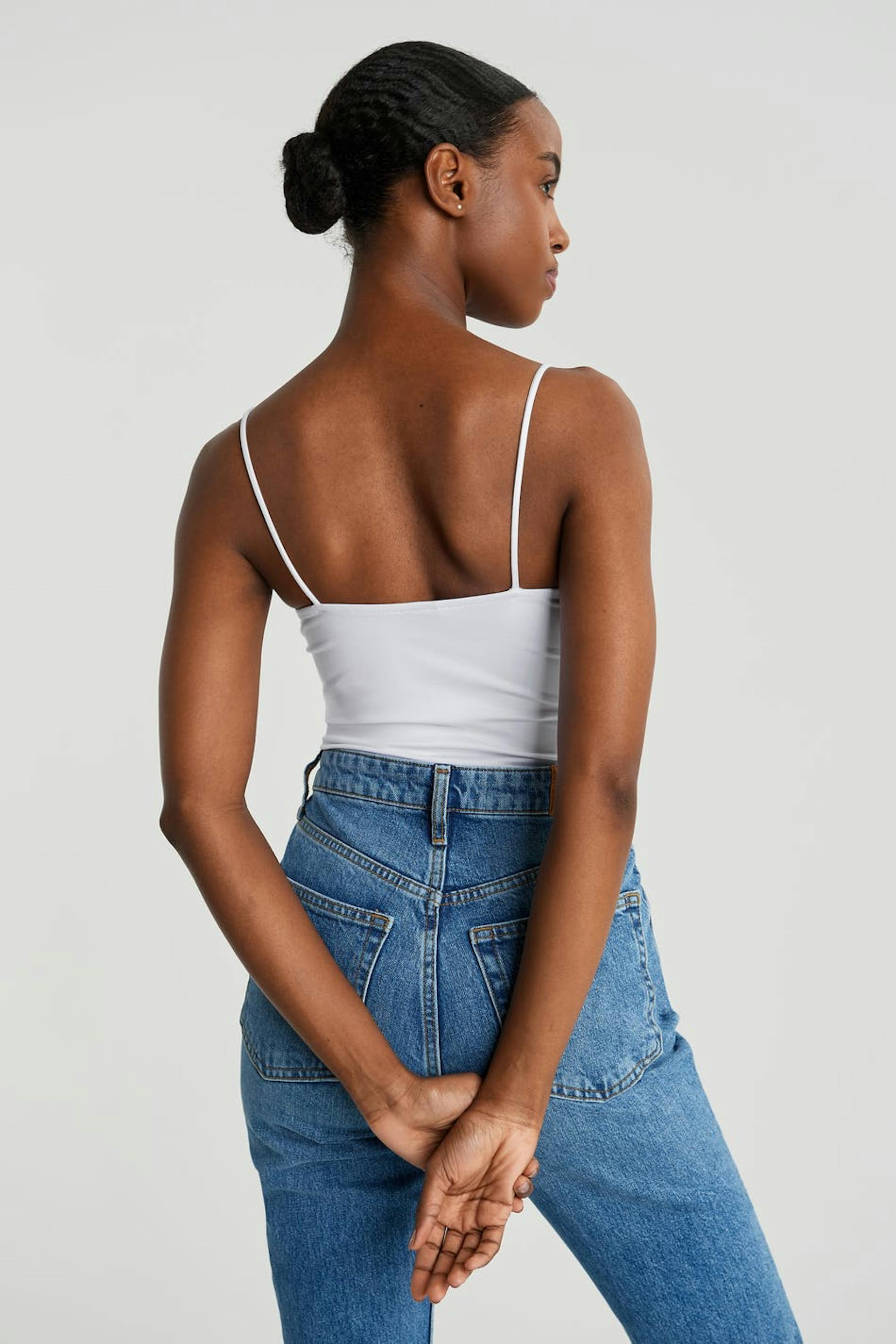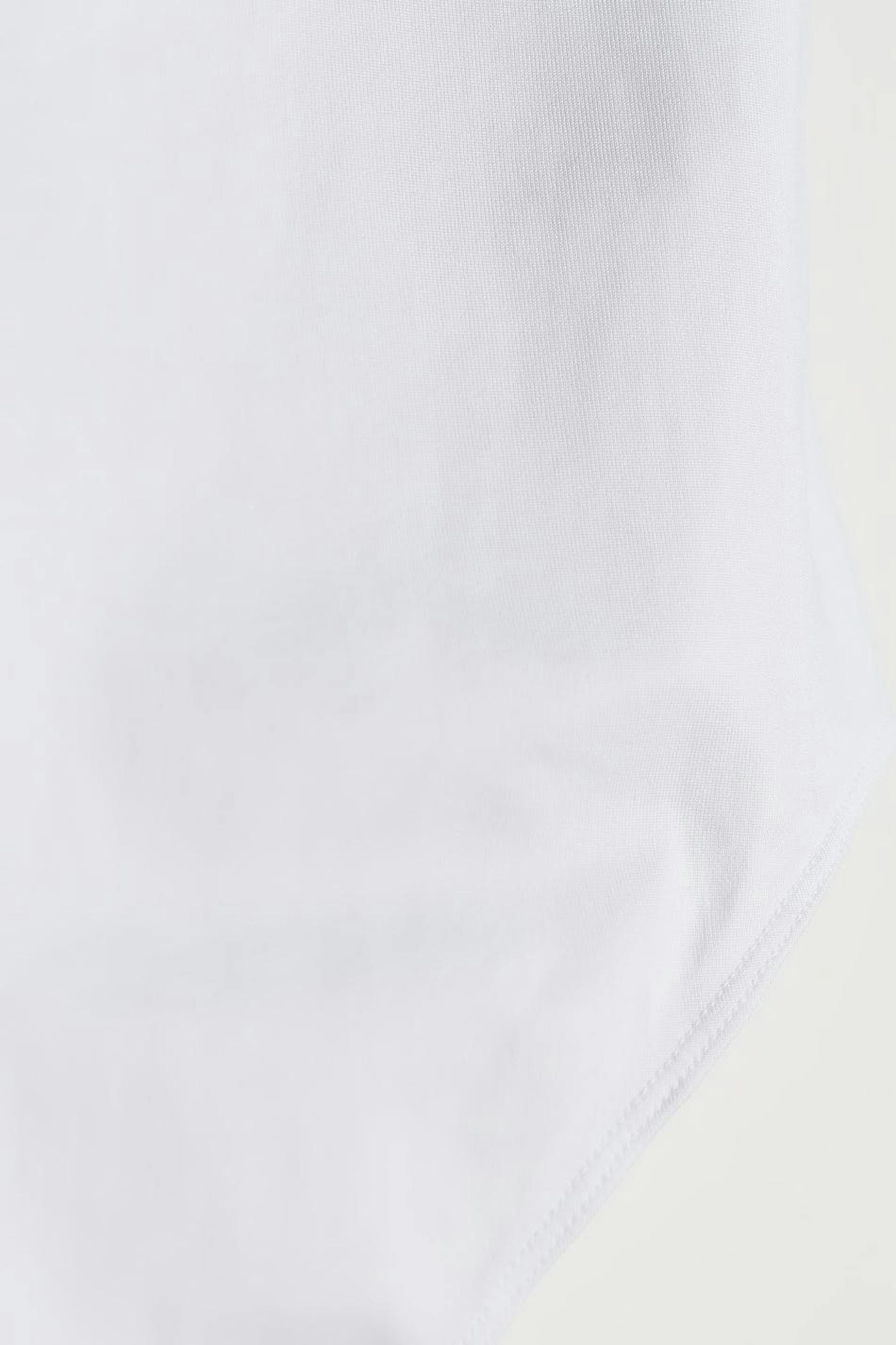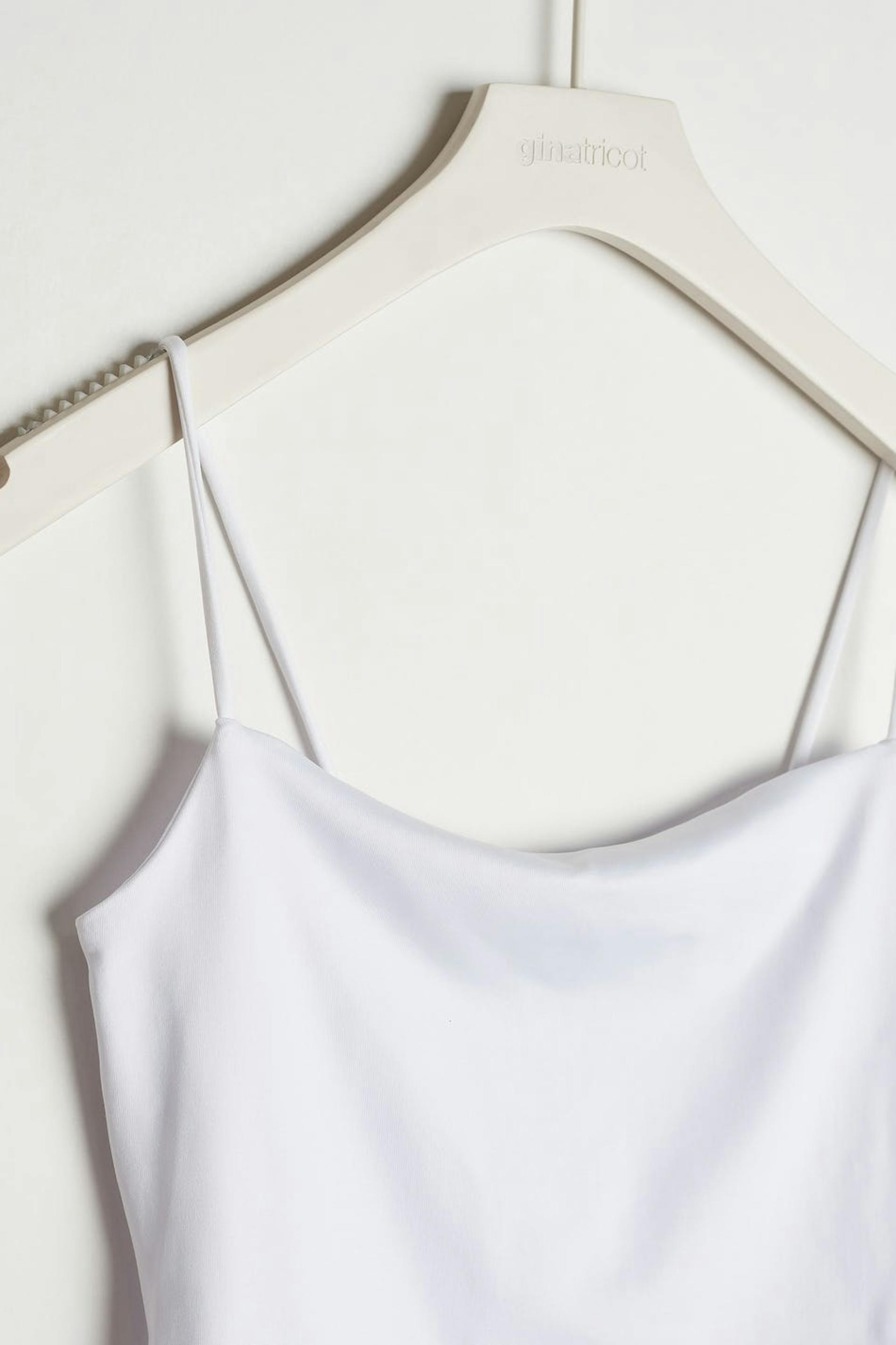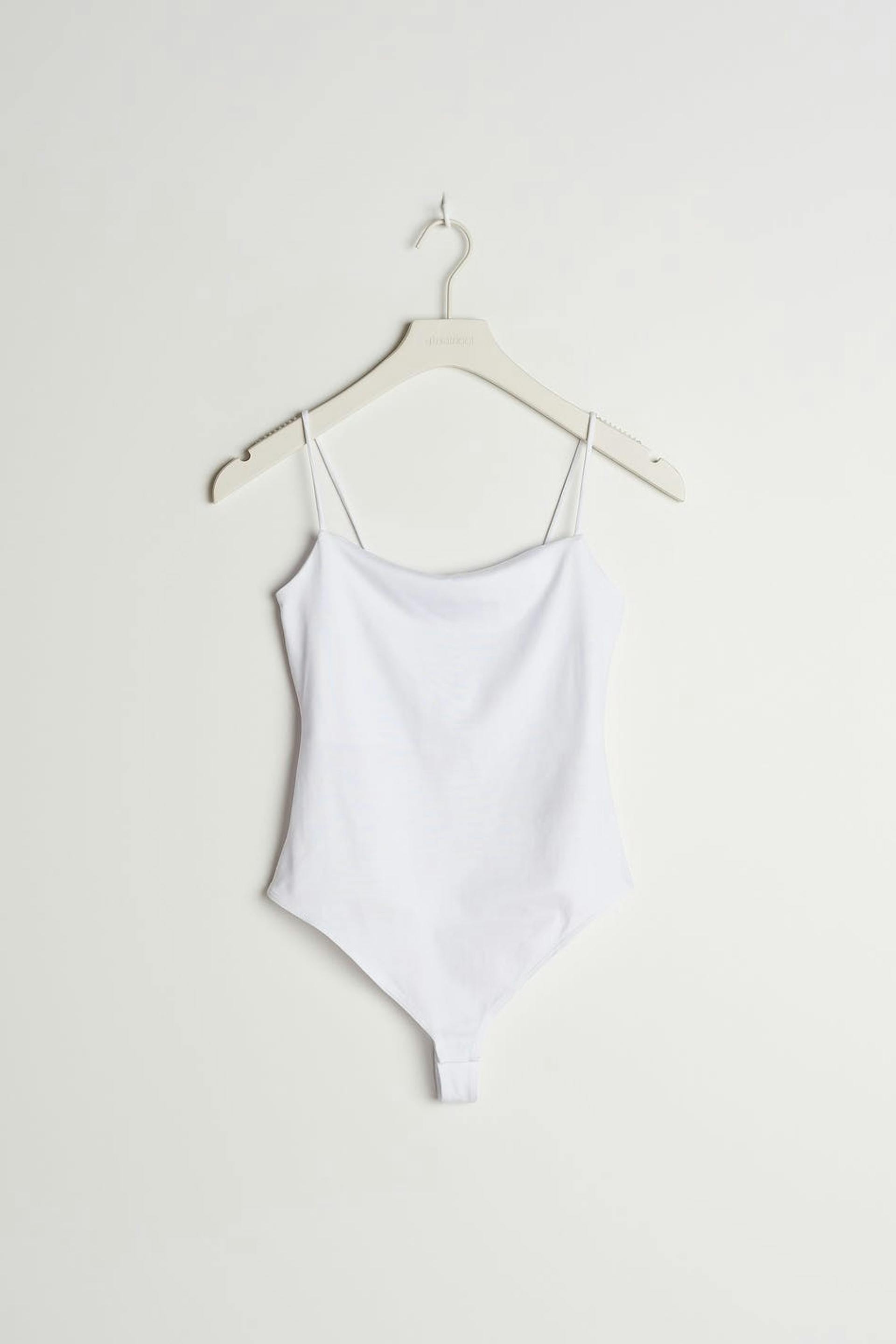 Bodyasu vartalonmyötäisellä istuvuudella. Bodyasu on valkoinen ja siinä on ohuet olkaimet. Siinä on napituslista jalkovälissä ja stringimalli takana.