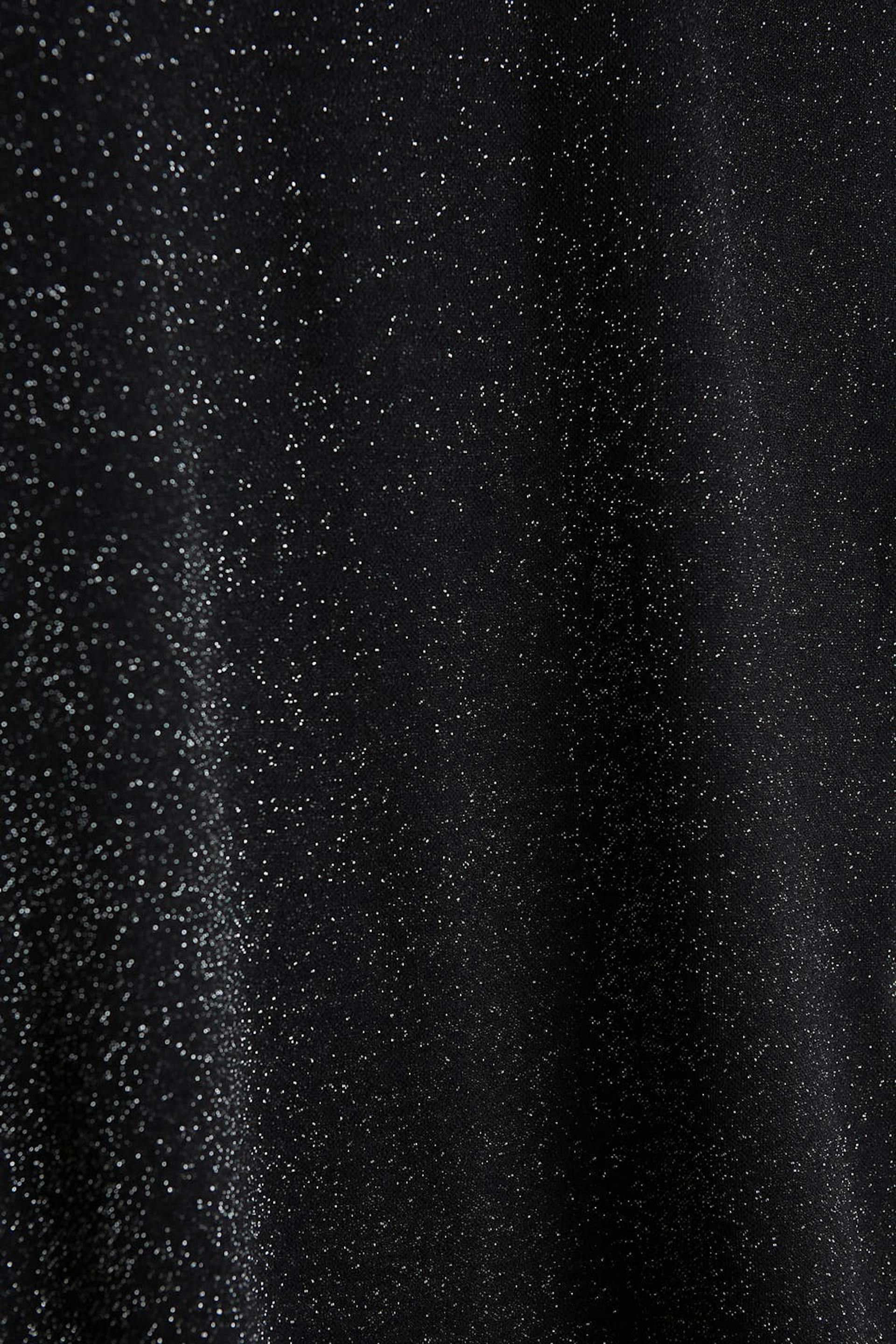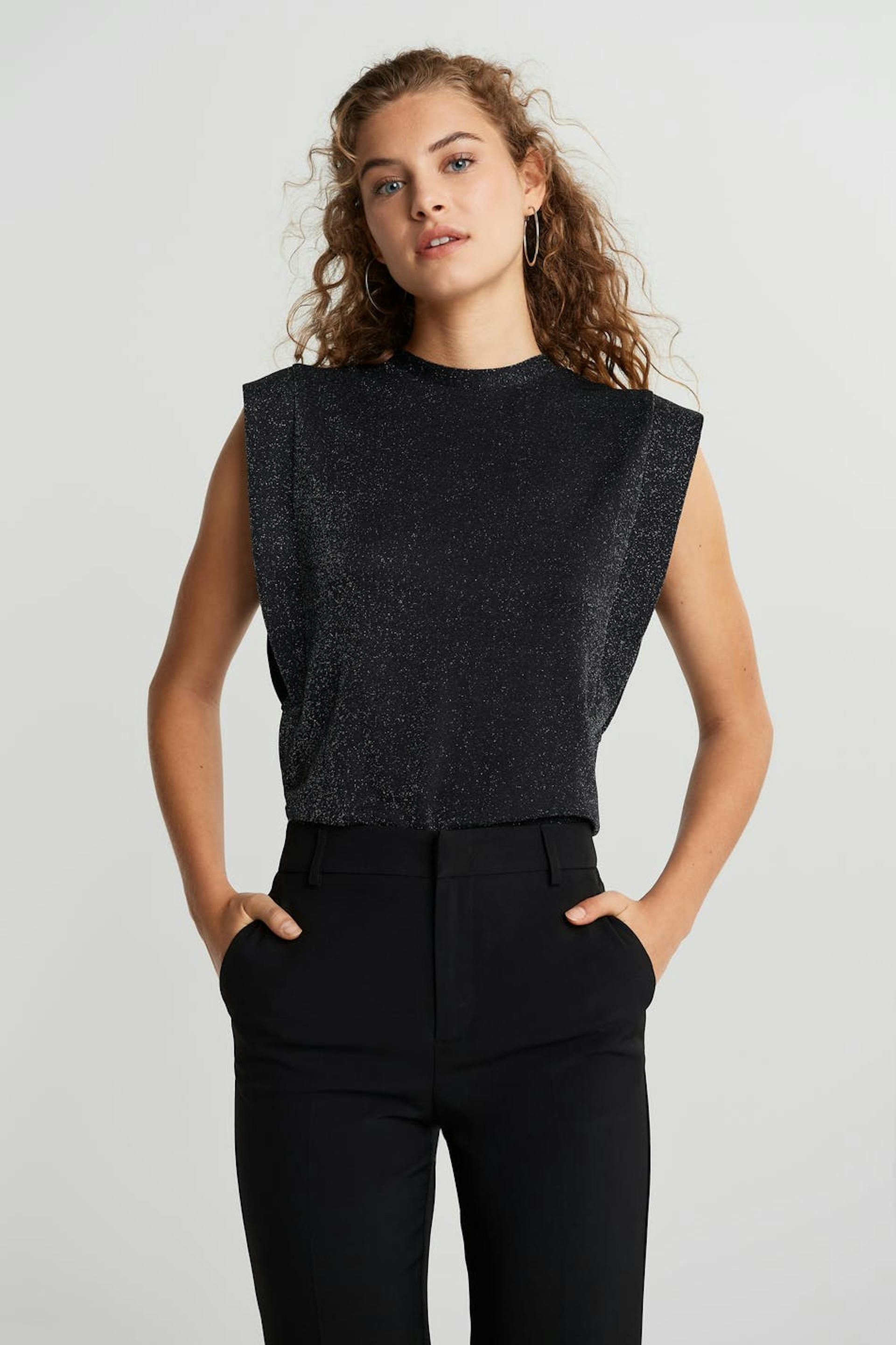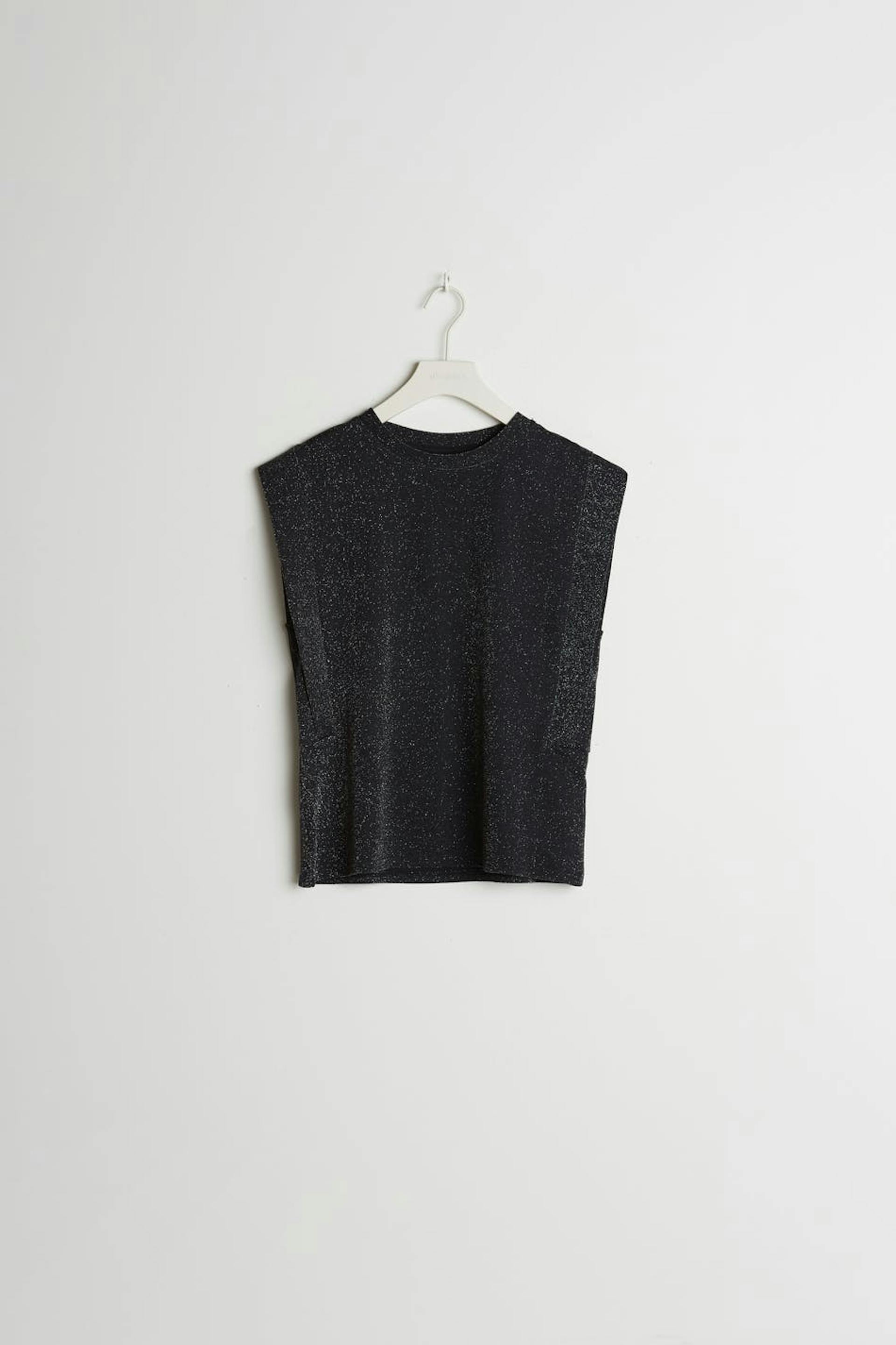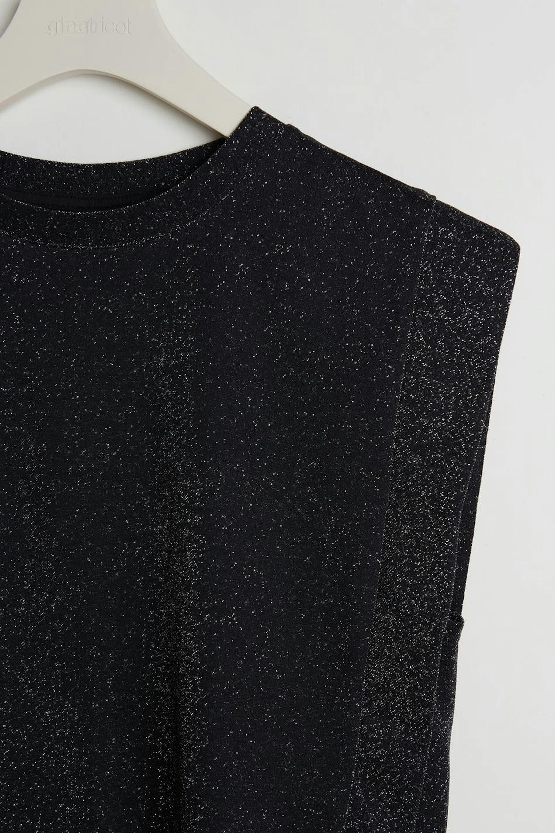Kimalteleva toppi normaalilla leikkauksella. Toppi on puolueelle täydellisesti sopiva ja musta.