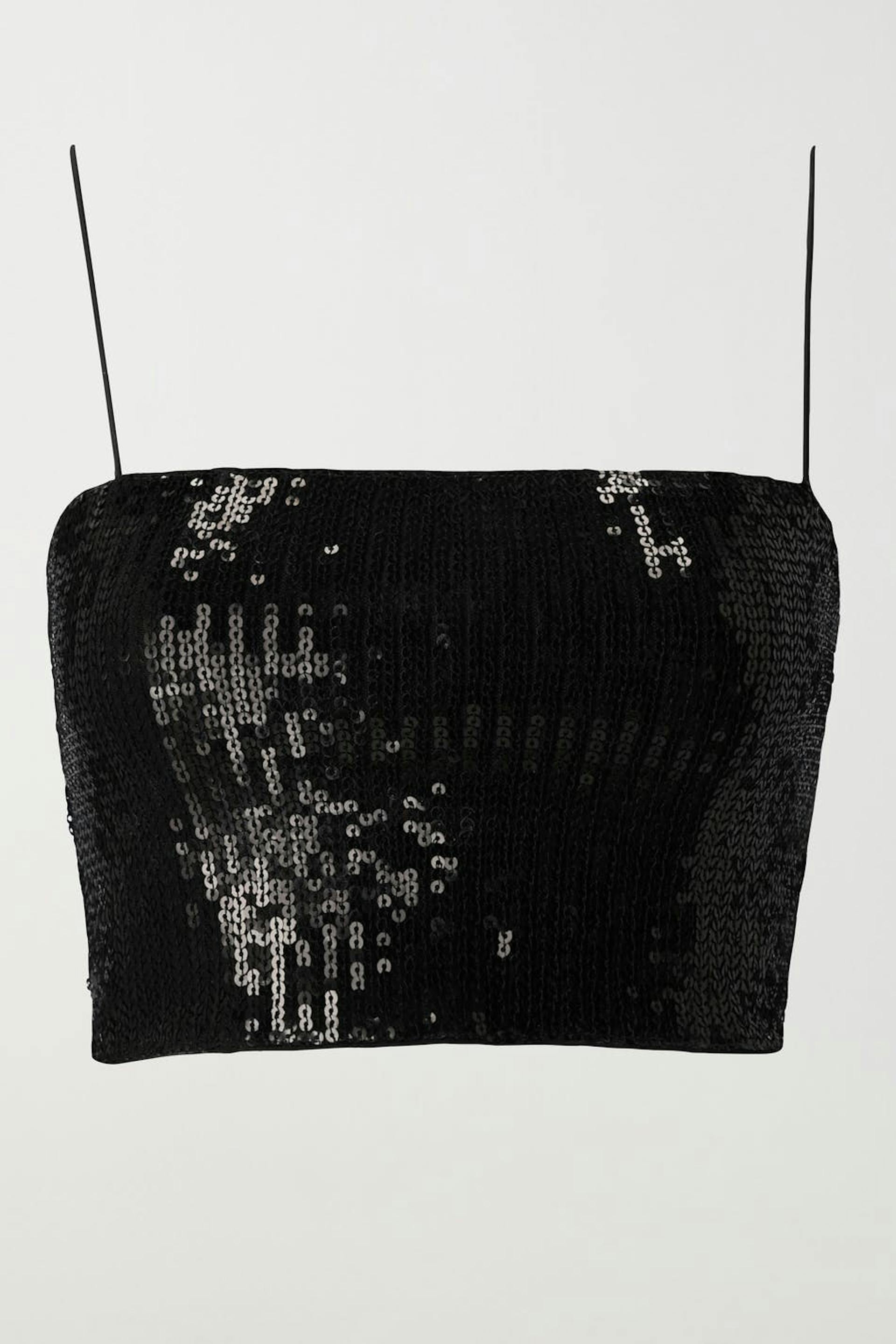 Cropattu kimalletoppi ohuilla olkaimilla. Toppi on musta ja siinä on vartalonmyötäinen istuvuus.
