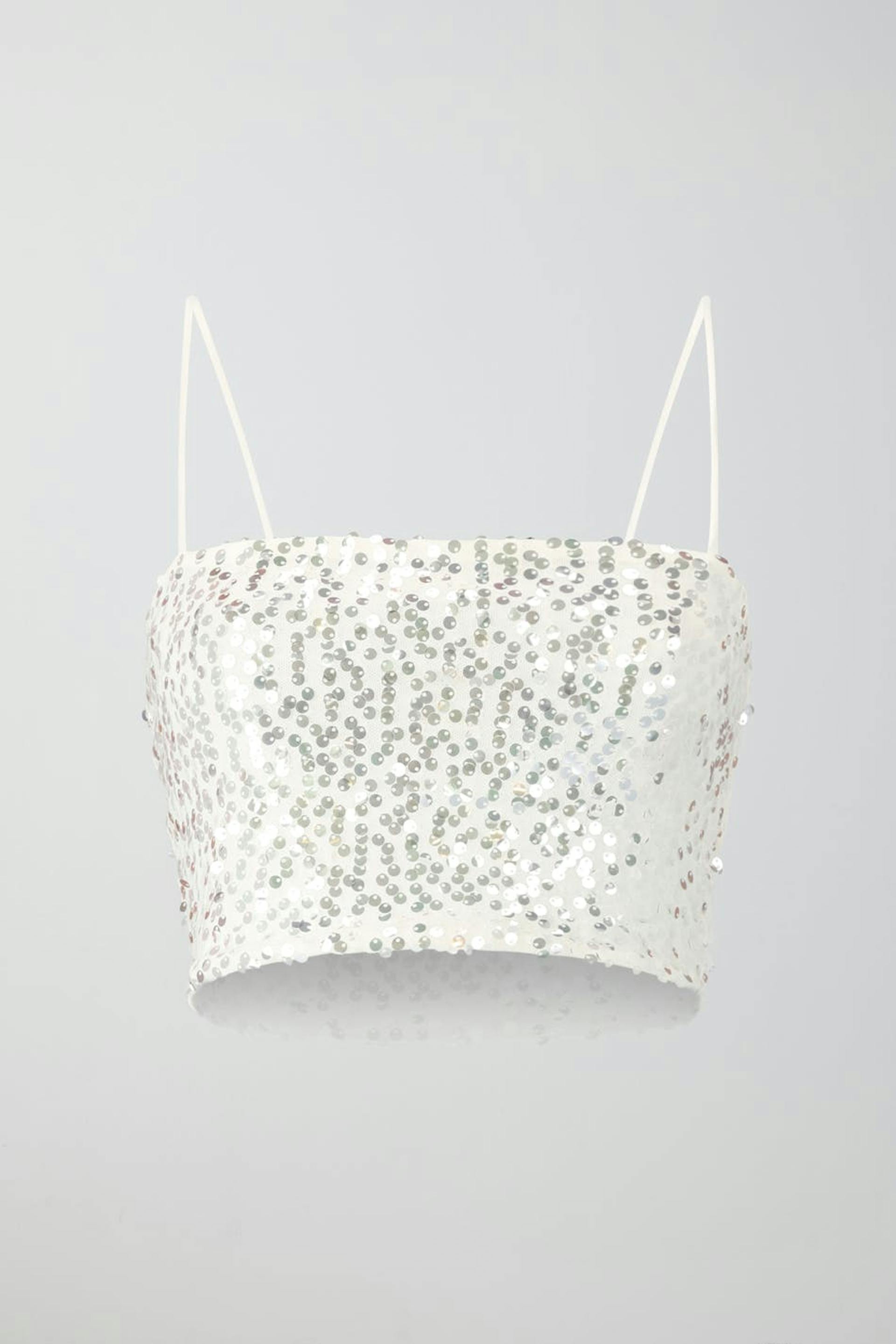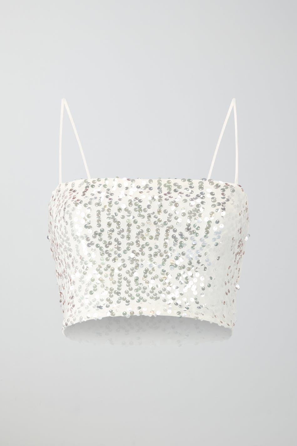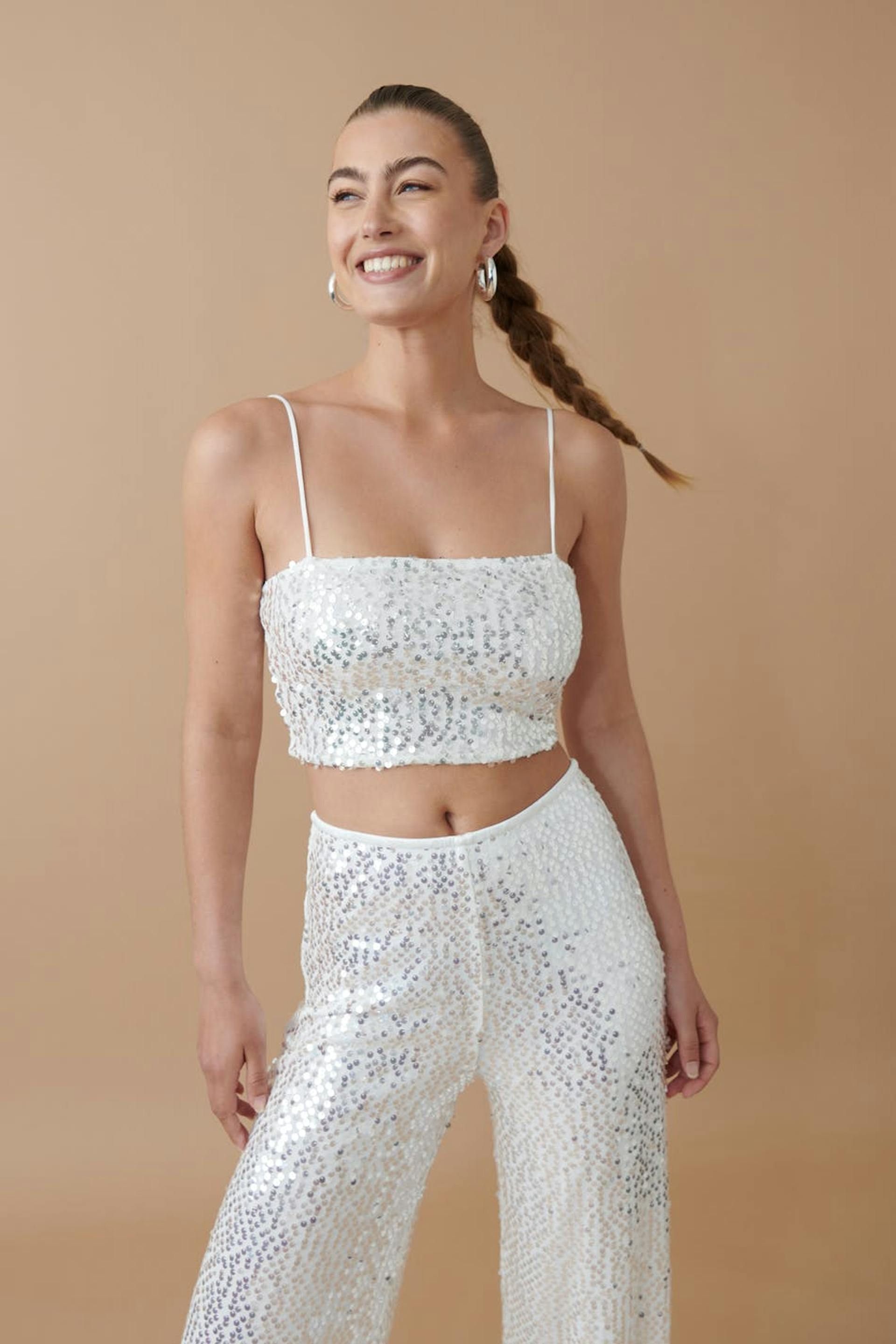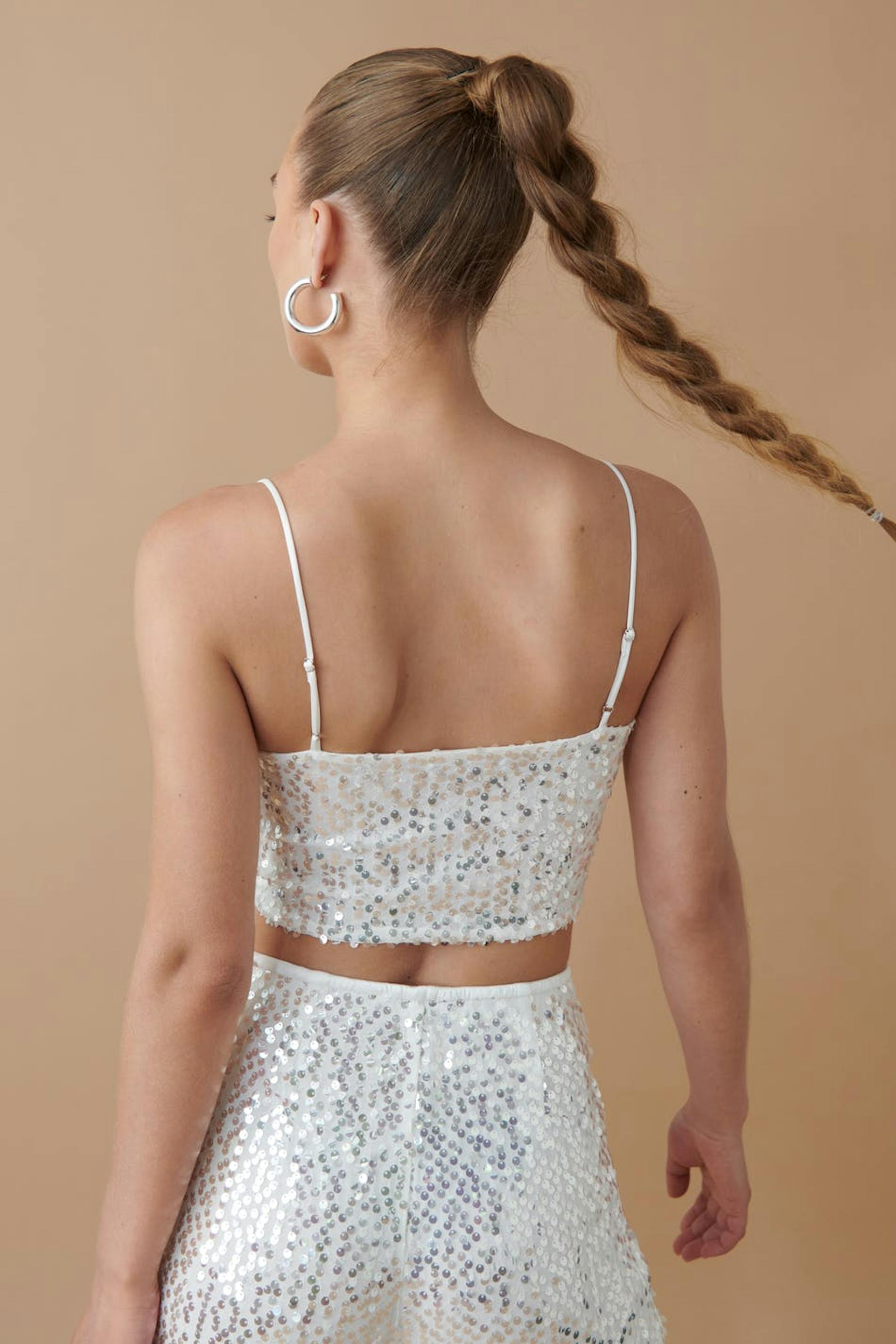 Cropattu paljettitoppi tyköistuvalla istuvuudella. Paljettitoppi on valkoinen ja siinä on ohuet, säädettävät olkaimet.