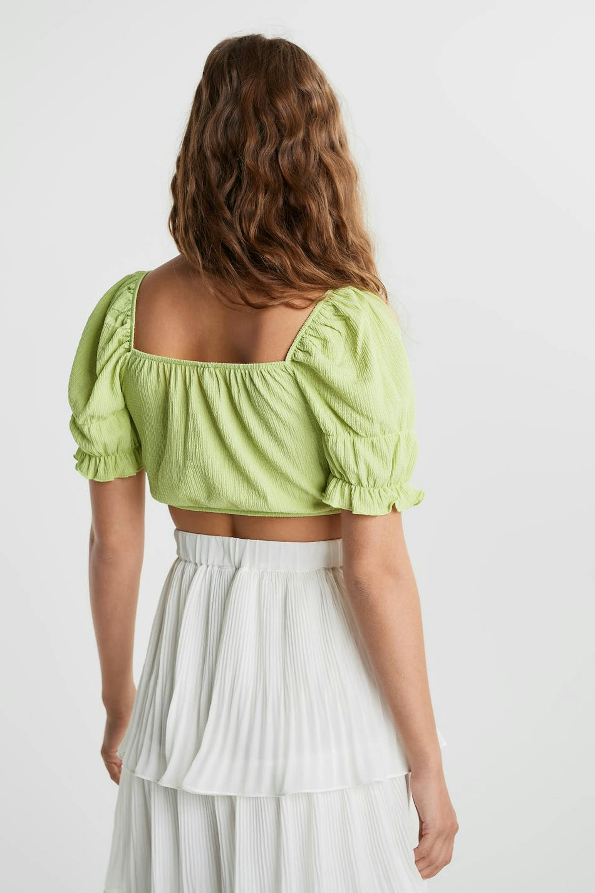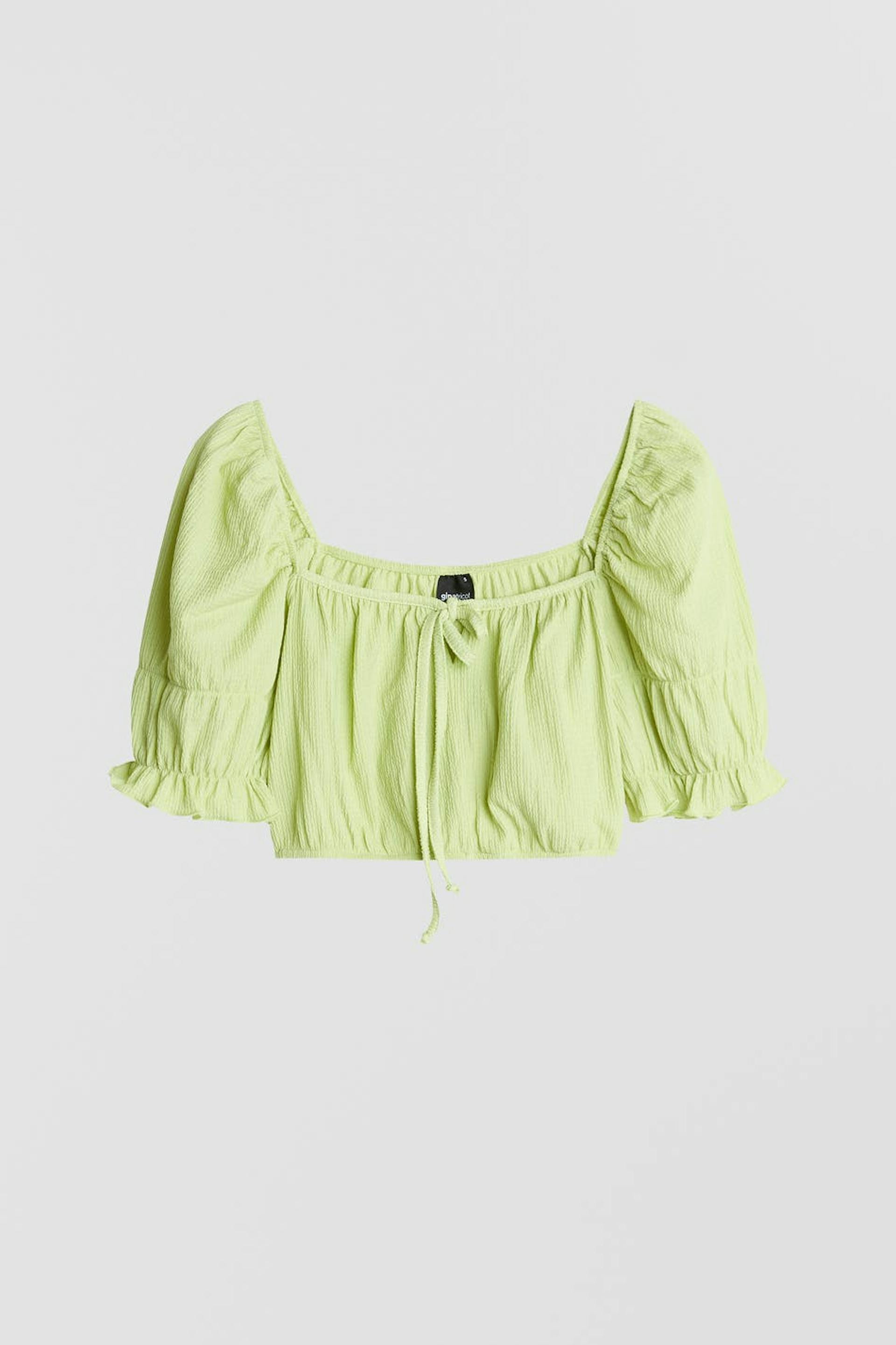 Lyhyt toppi normaalilla leikkauksella. Toppi on vihreä ja siinä on lyhyet puff sleeve-paidat. Siinä on off shoulder -malli ja solmittava vyö edessä.