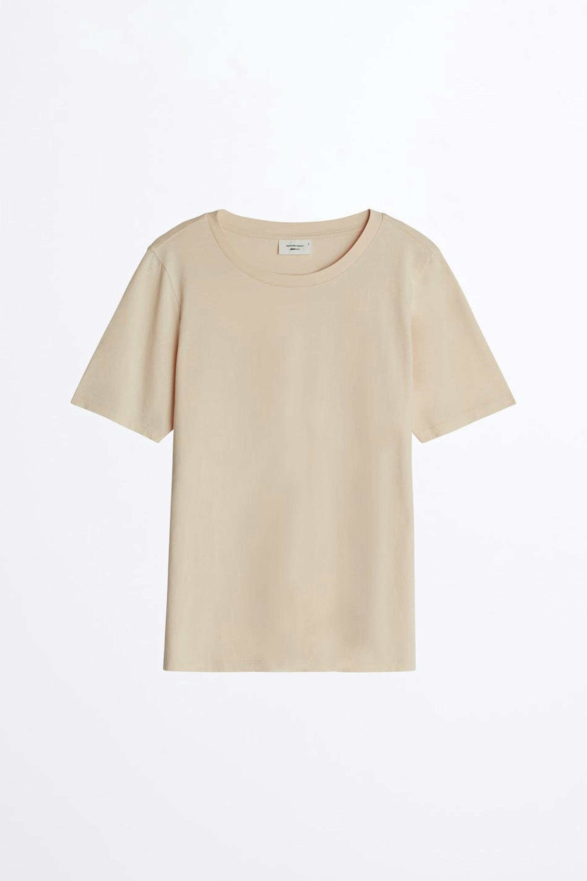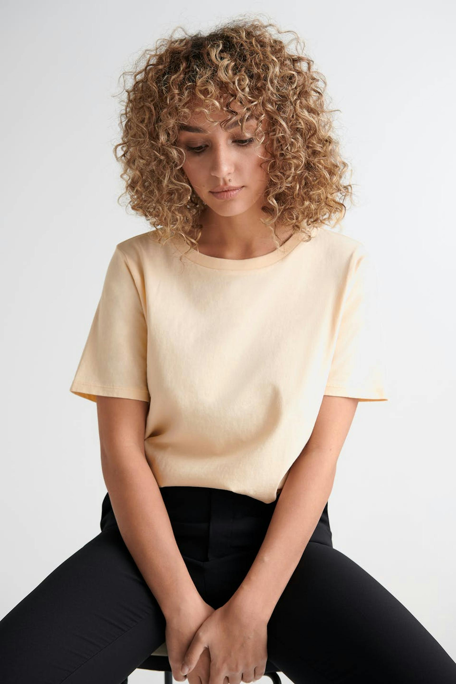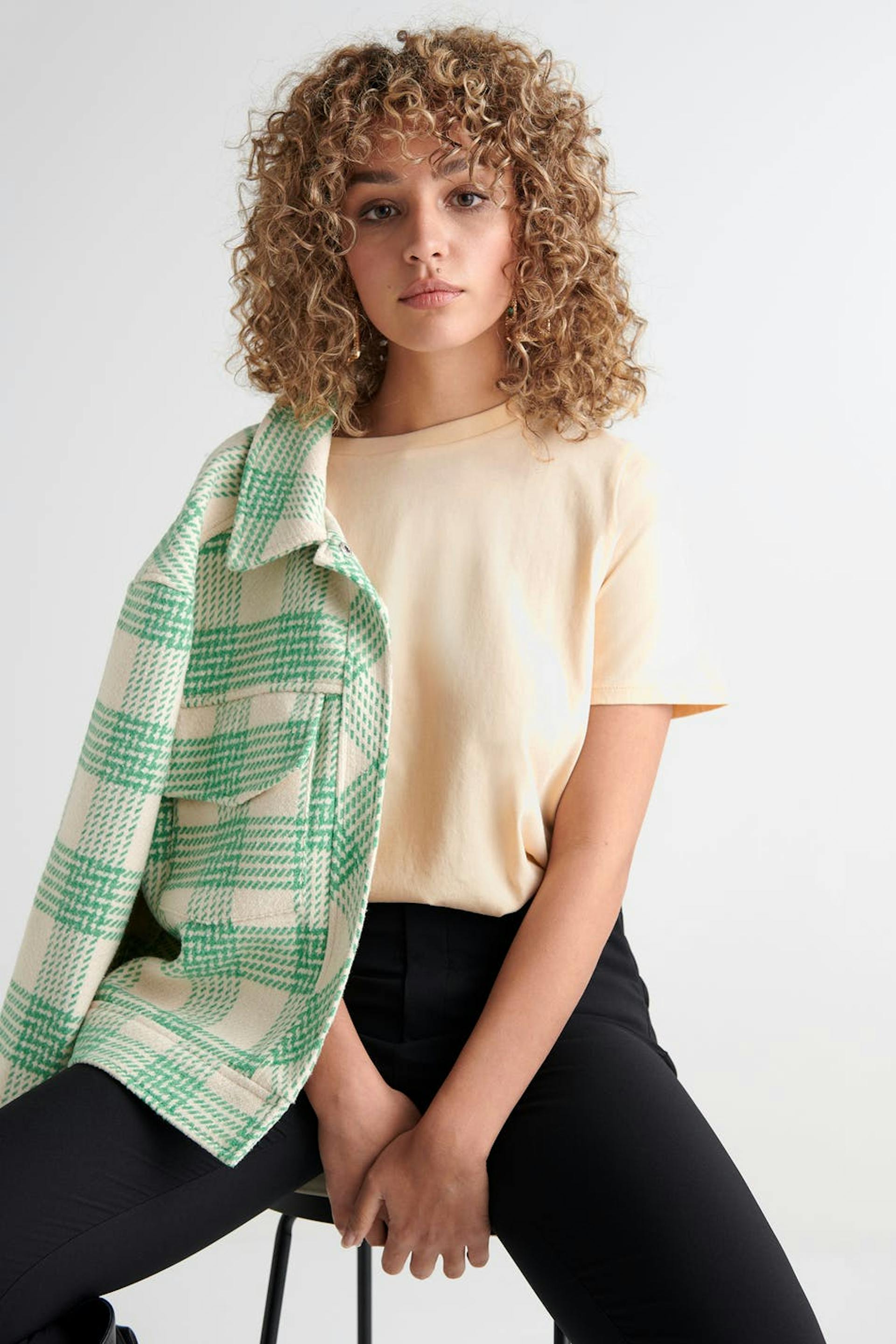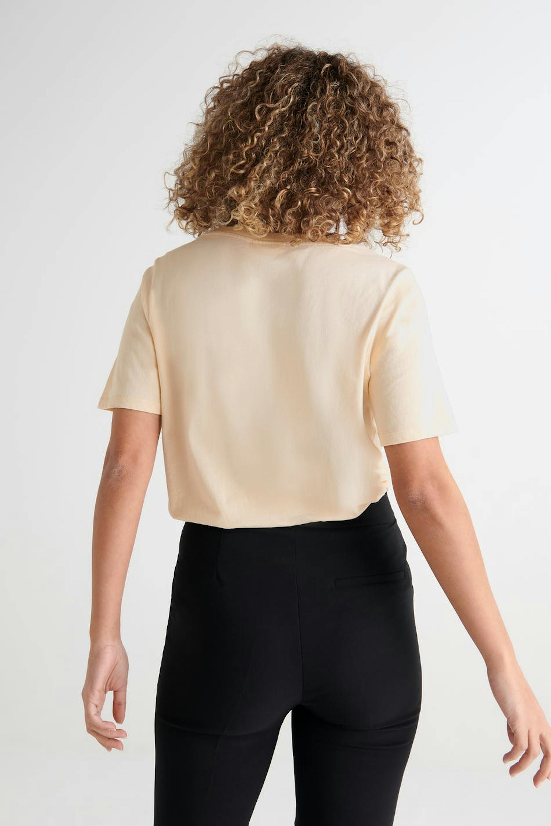 Lyhythihainen toppi väljällä istuvuudella. Toppi on beige.