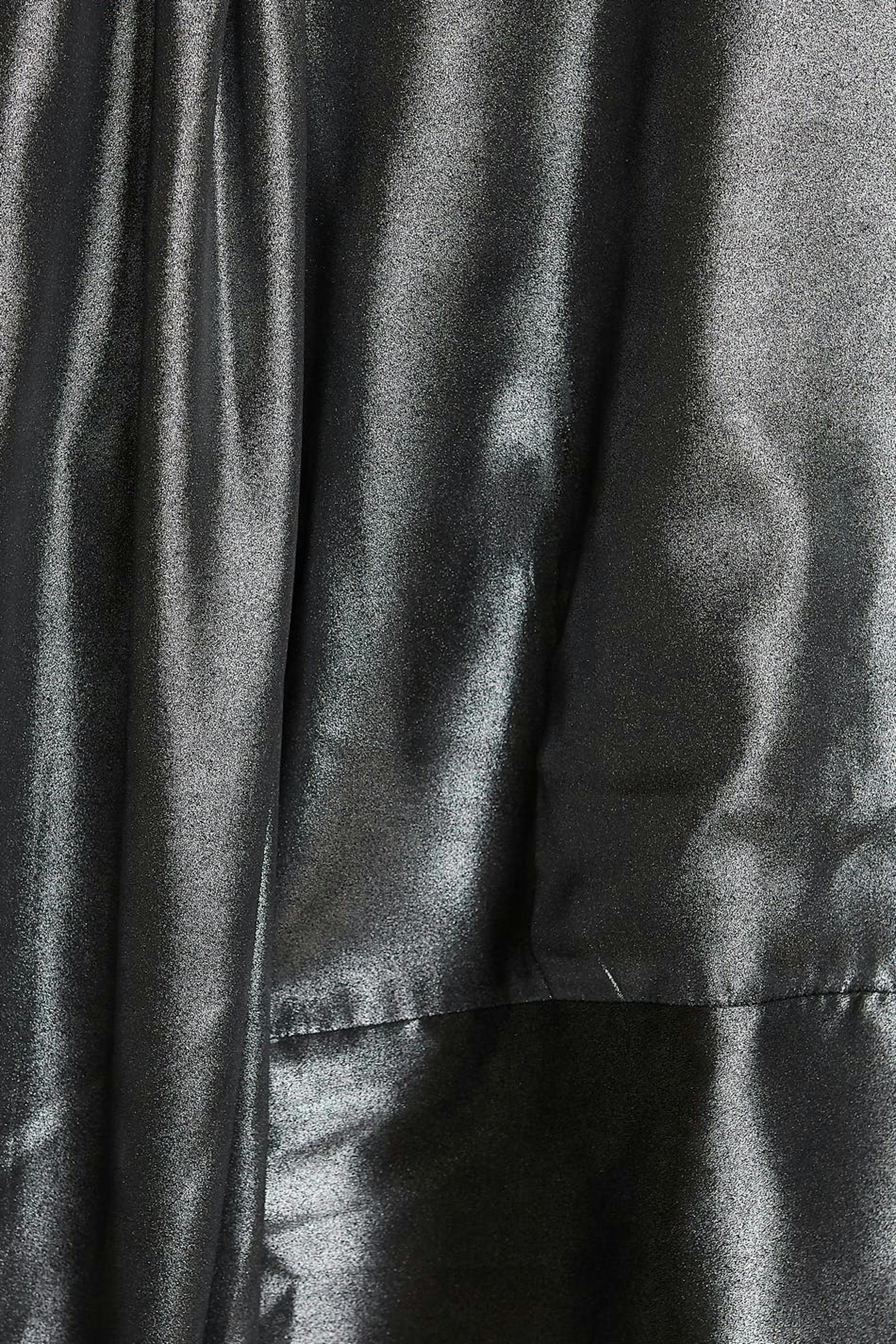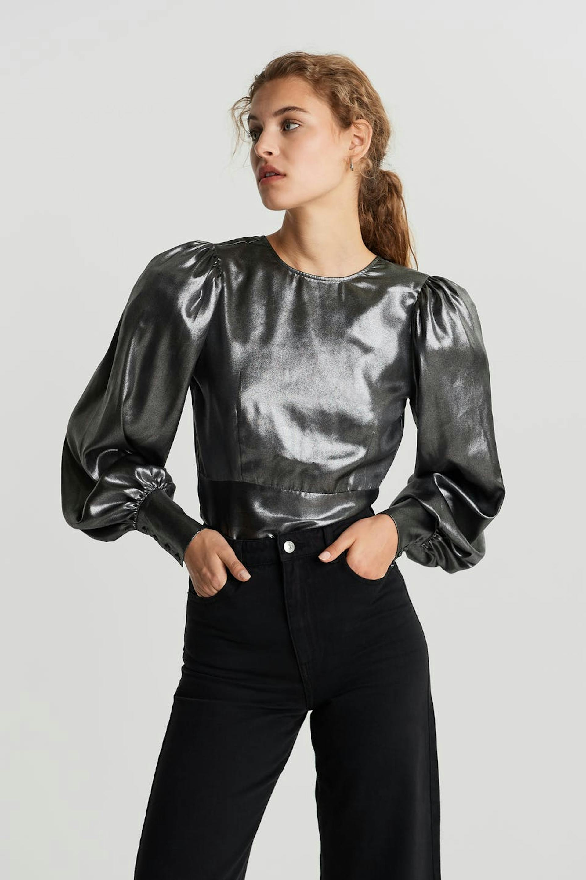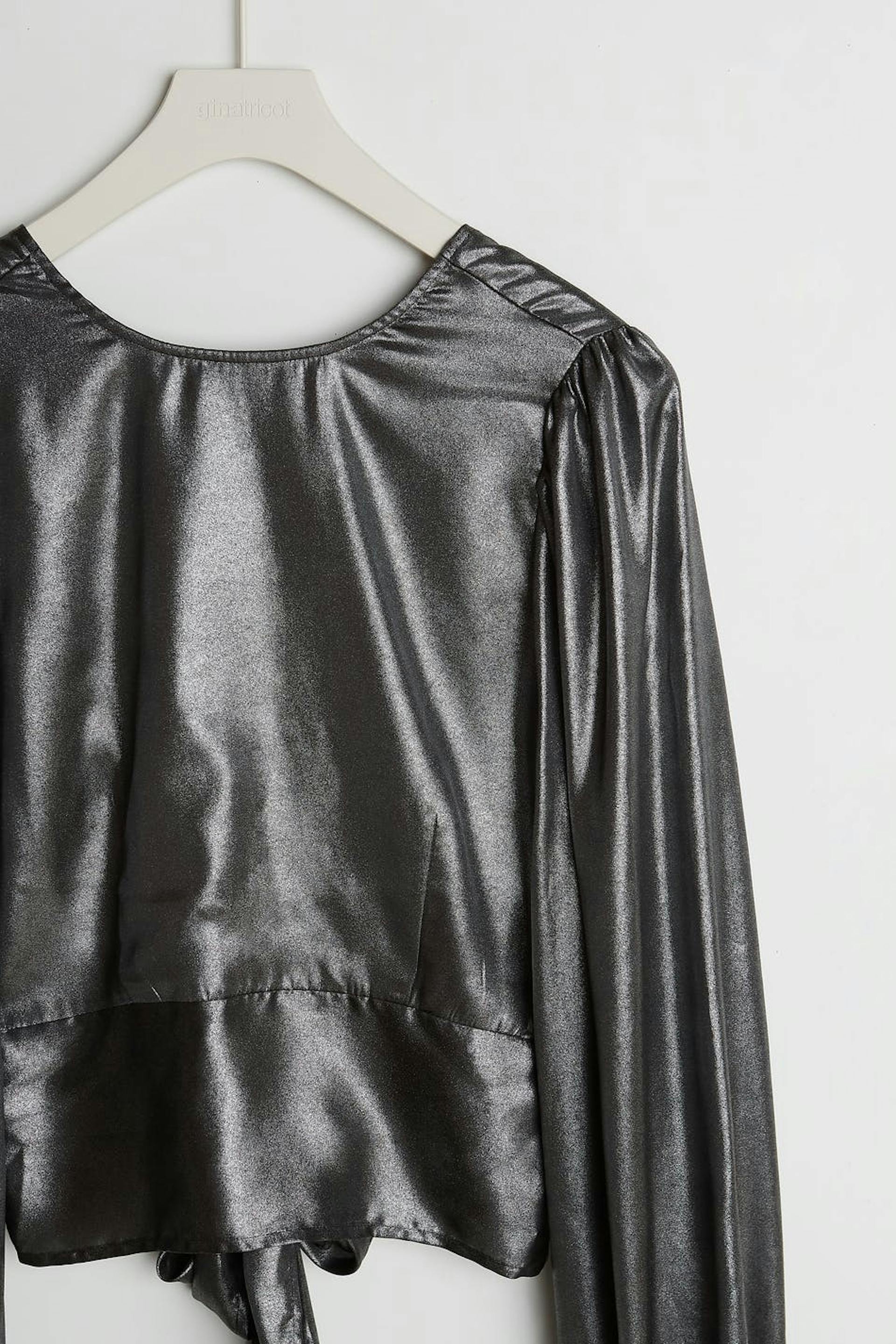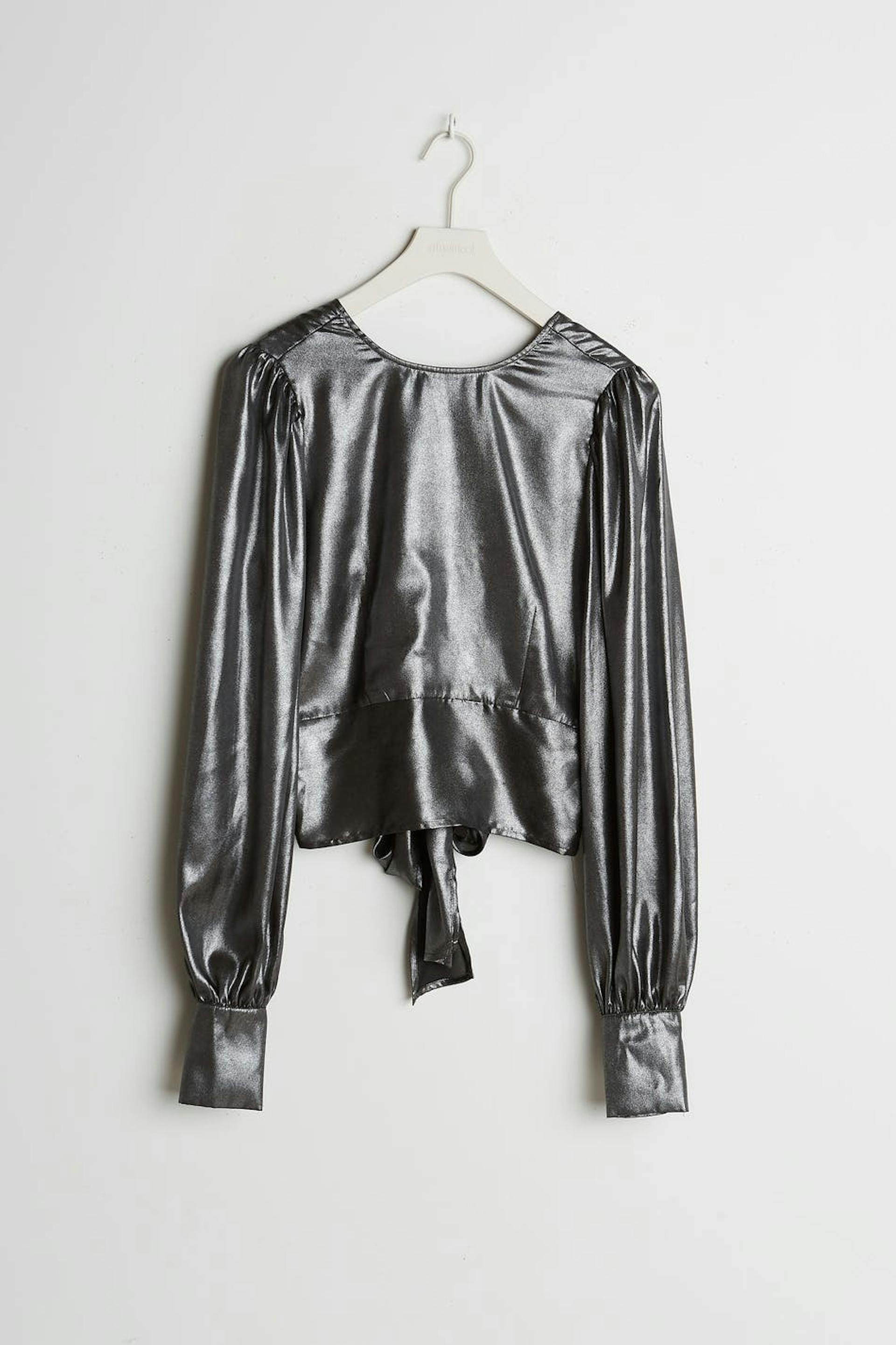 Toppi avonaisella selällä rusetilla selässä. Toppi on hopea ja siinä on pitkät pallohihat napeilla hihansuissa.