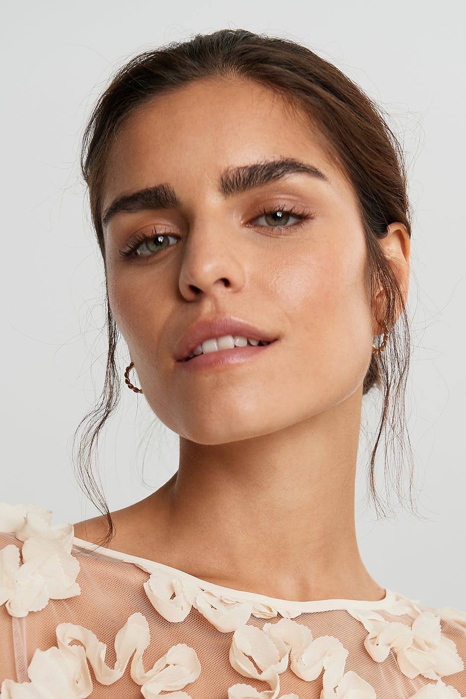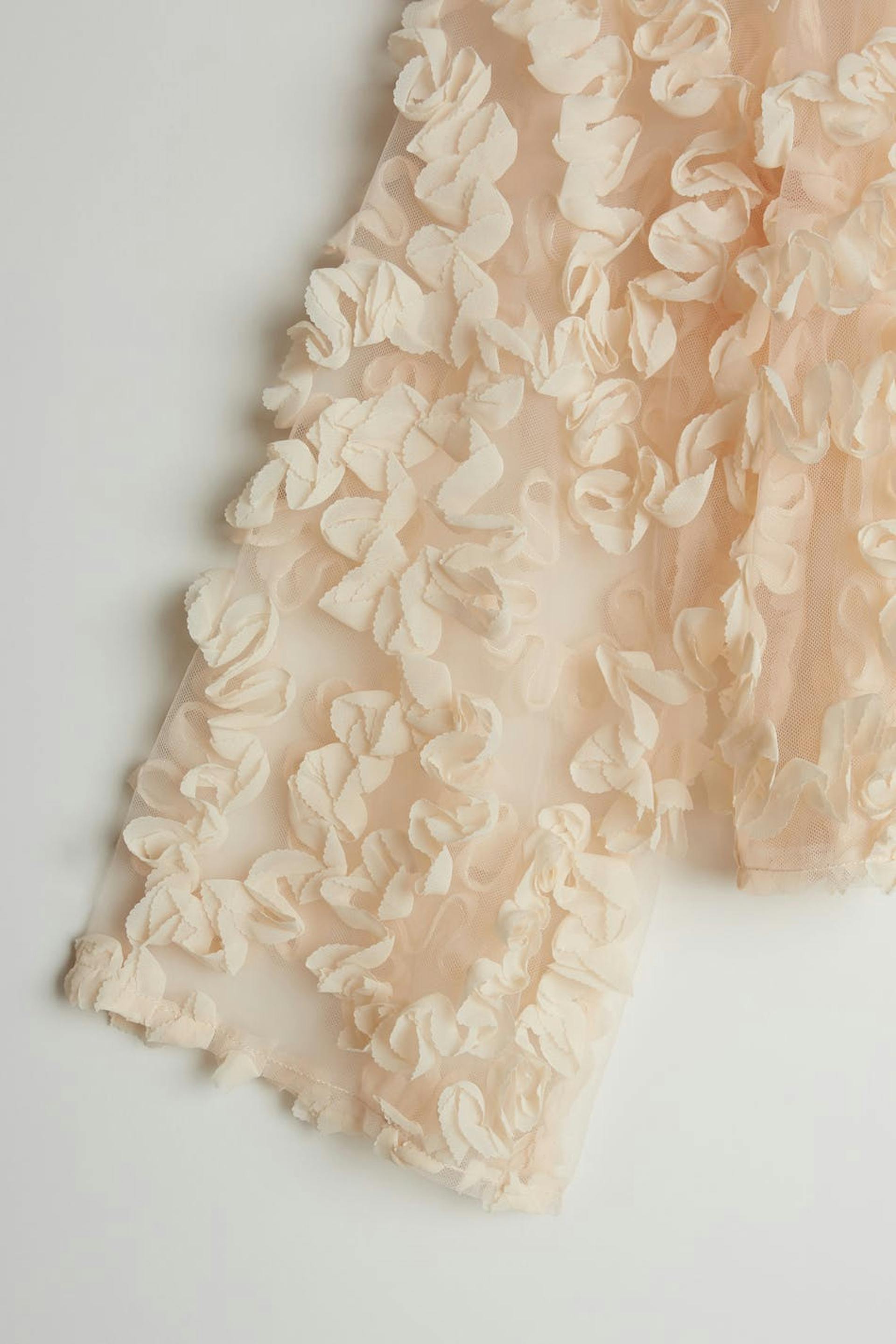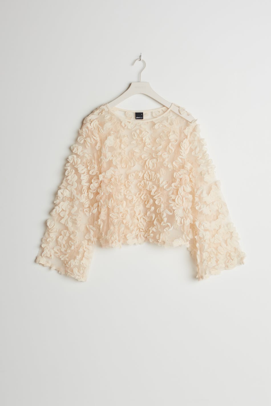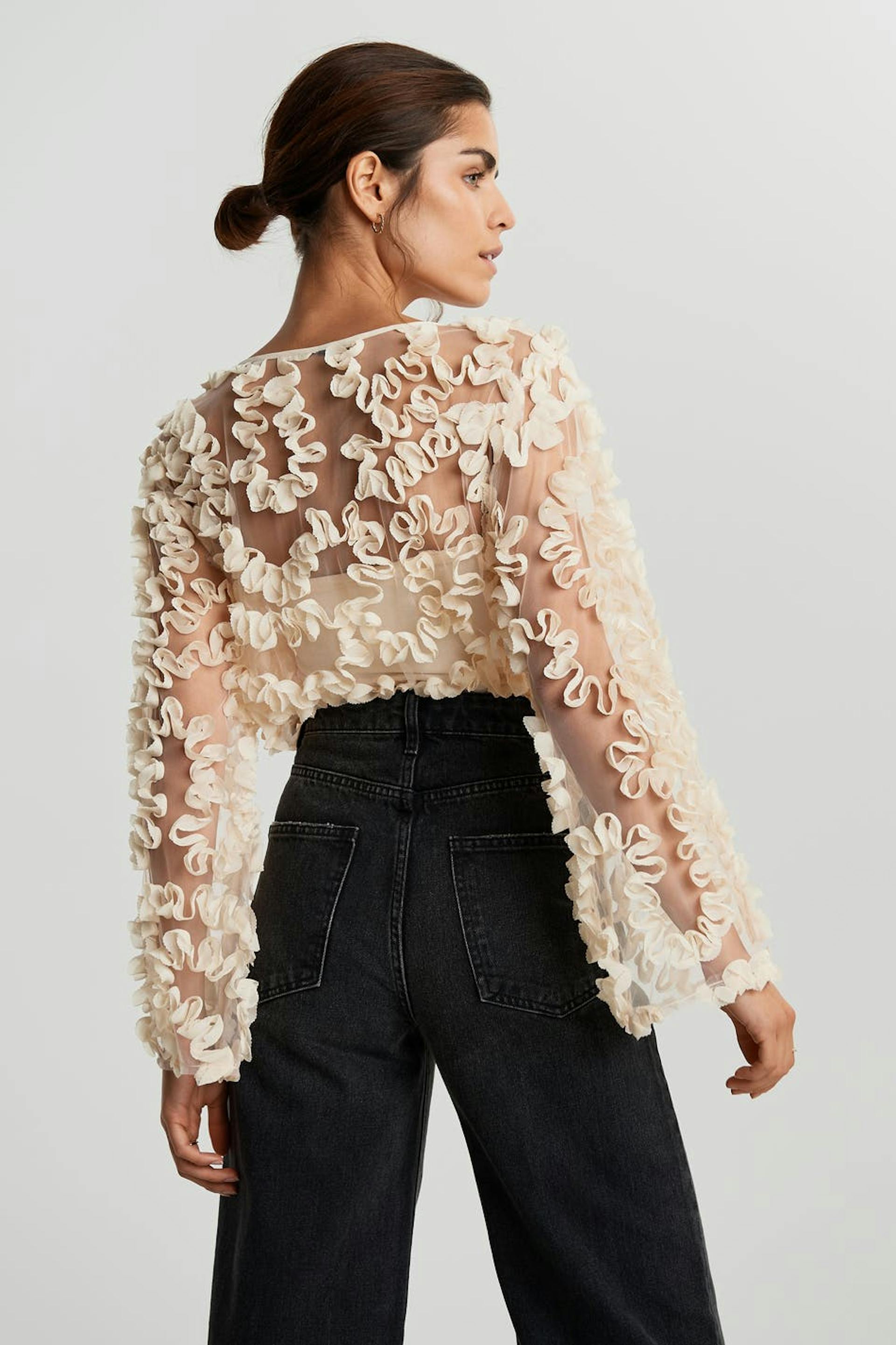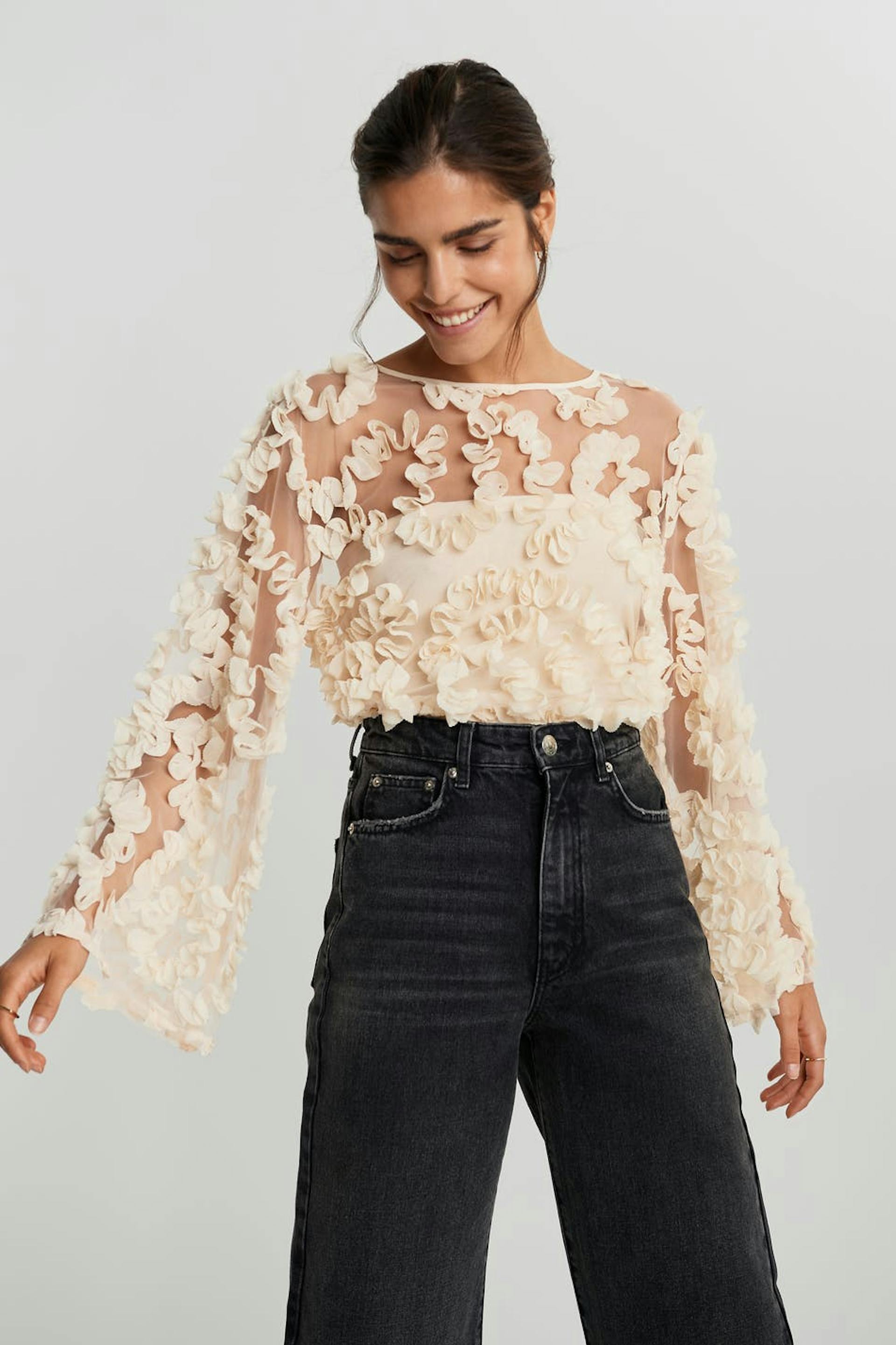 Pitkähihainen toppi mesh-yksityiskohdilla koko pinnassa. Toppi on puolueelle täydellisesti sopiva ja luunvalkoinen ja siinä on tilavat hihat. Se valmistetaan meshistä.