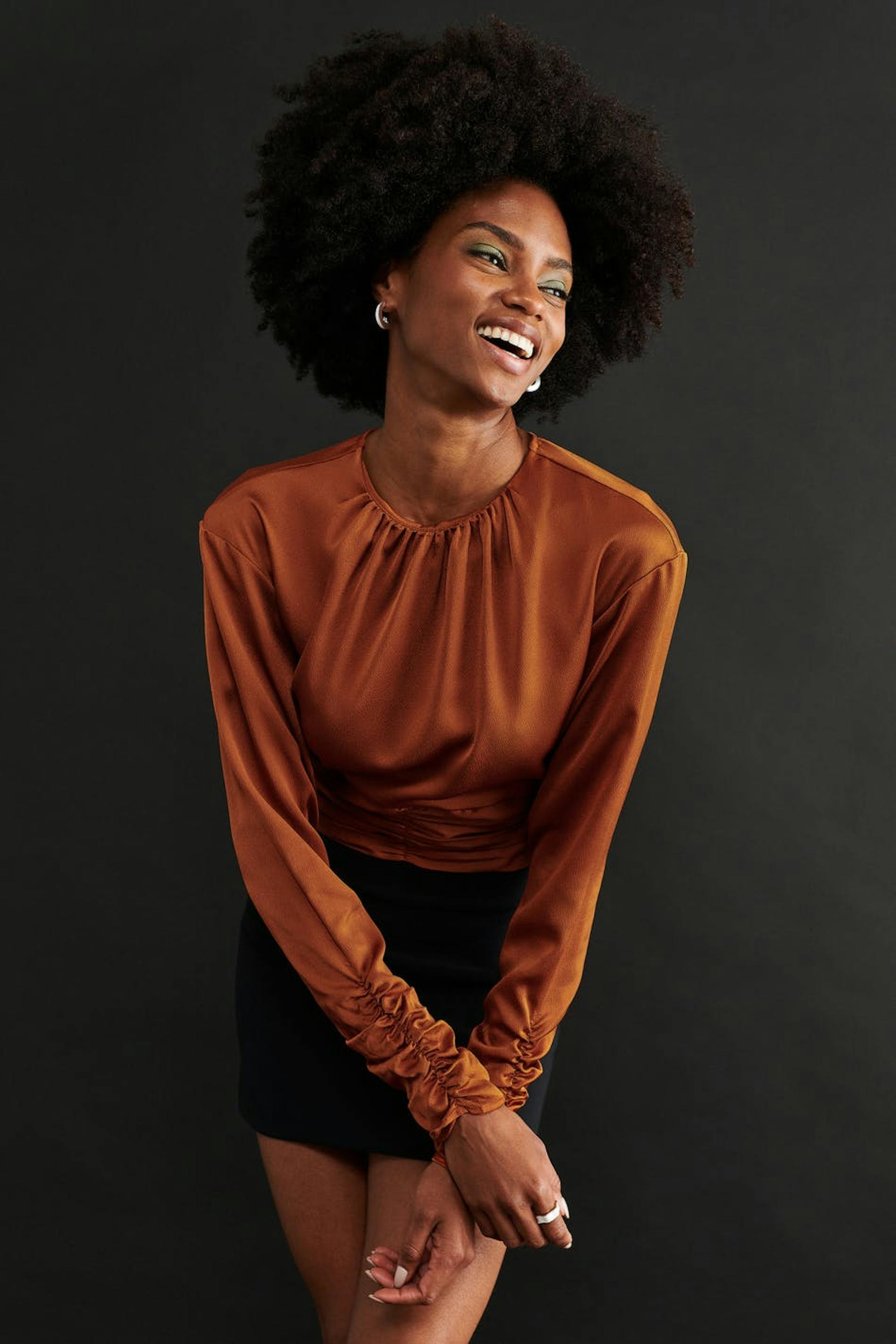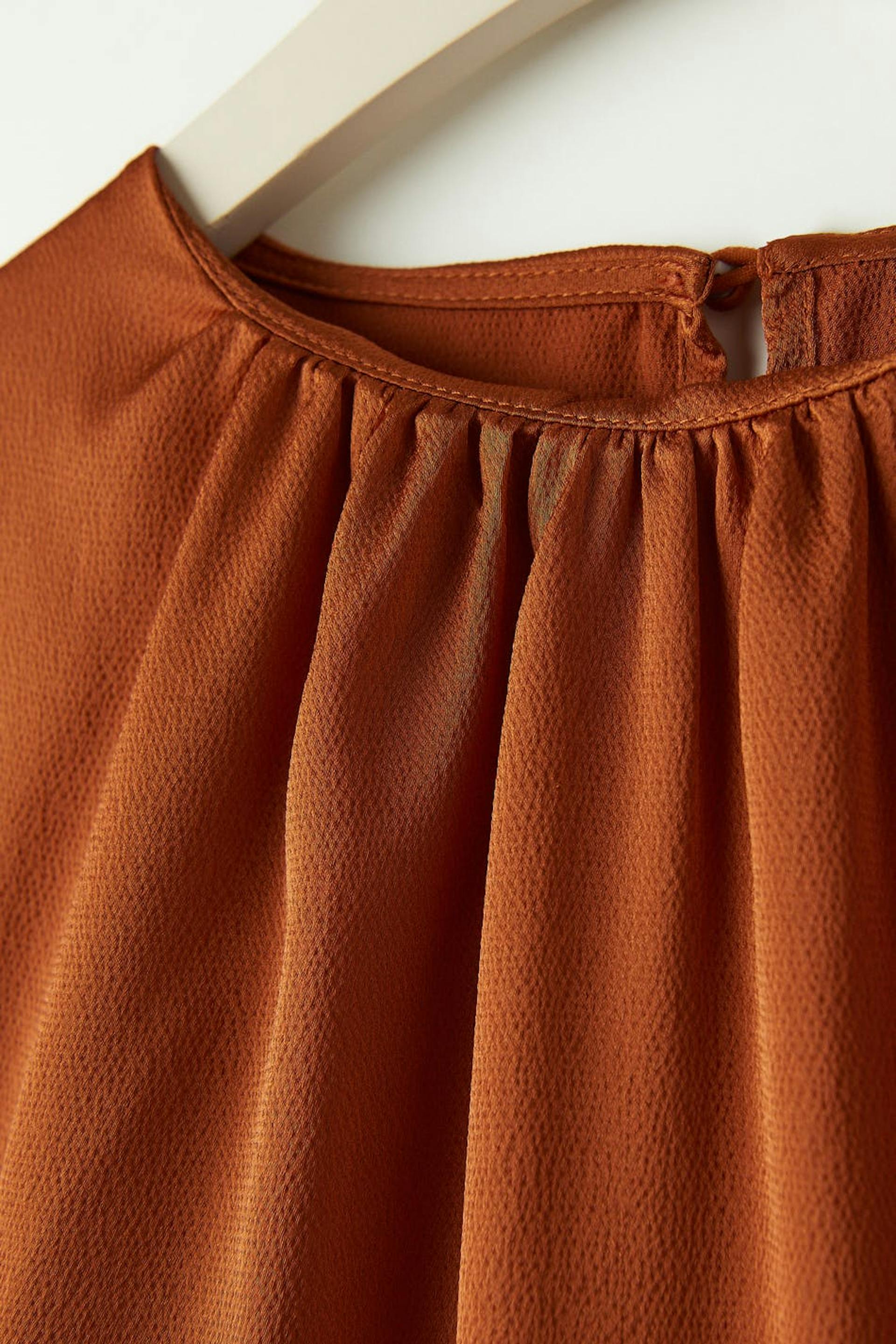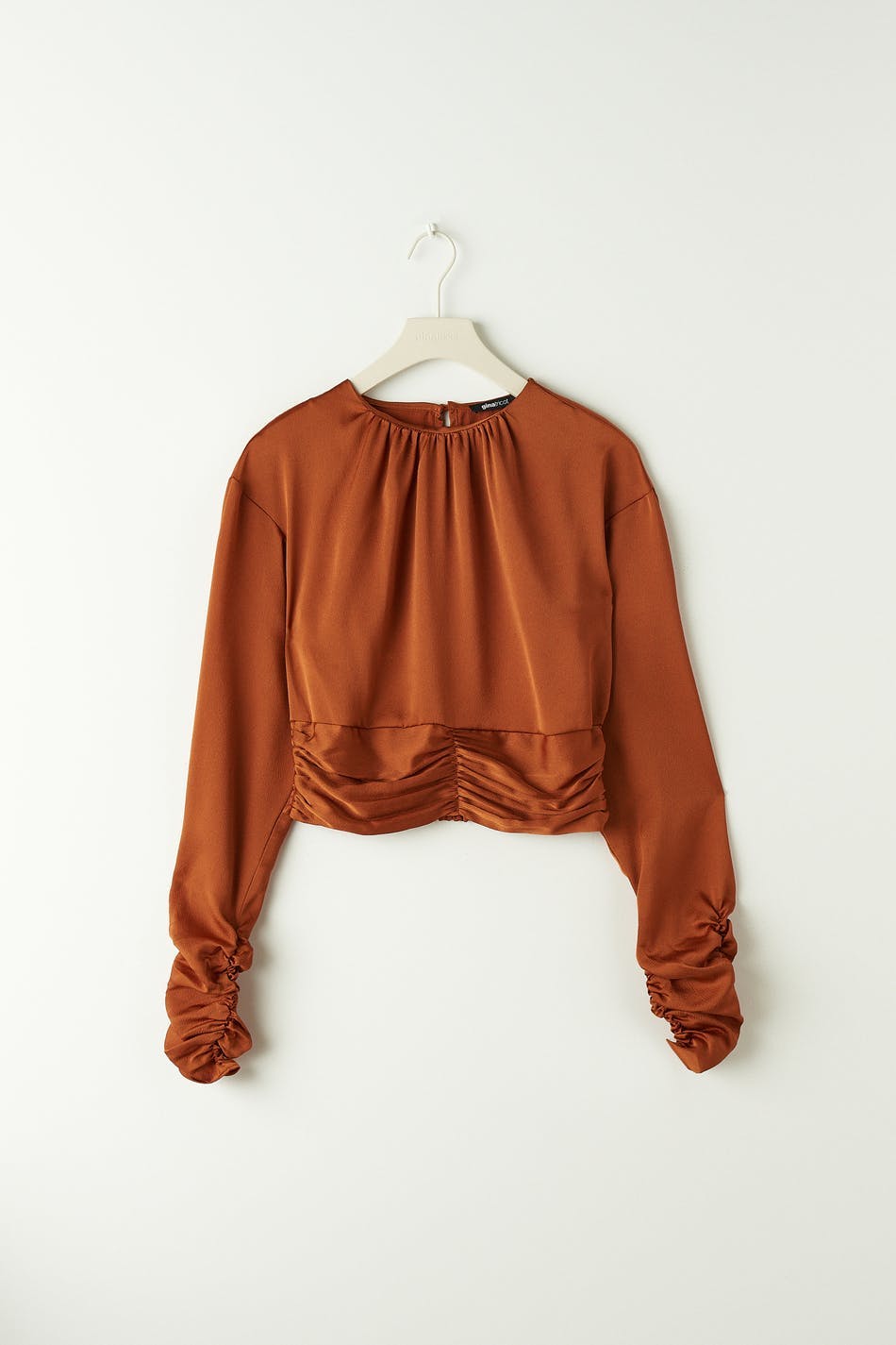 Pitkähihainen pusero rypytystyylillä vyötäröllä. Pusero on ruskea ja siinä on napituslista kaulassa. Siinä on pyöristetty kaula-aukko, rypytys selässä ja poimutetut hihansuut.