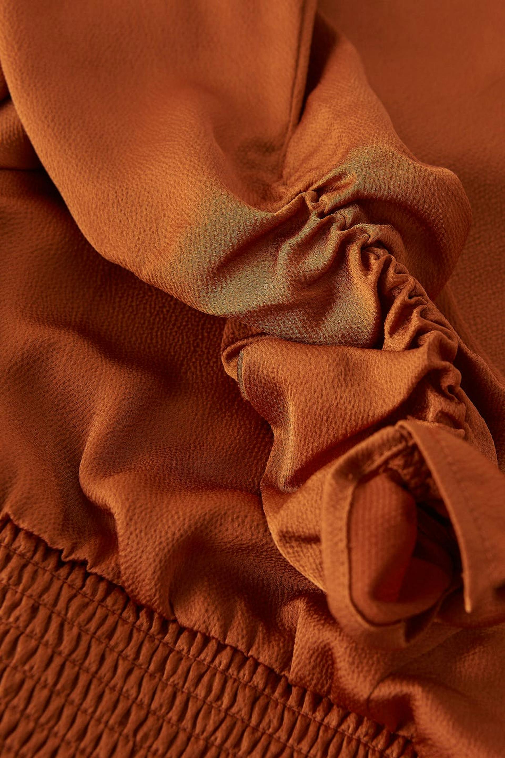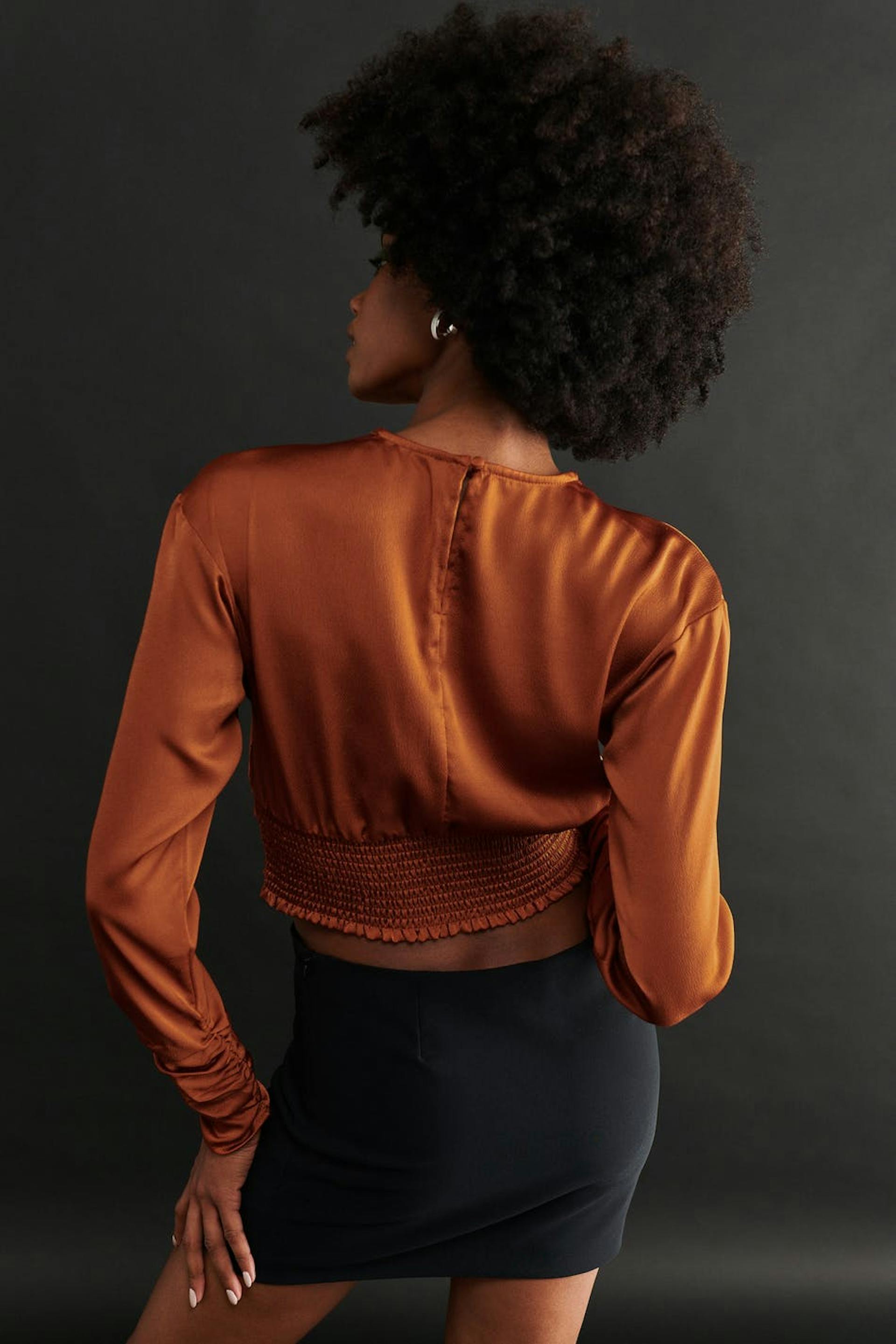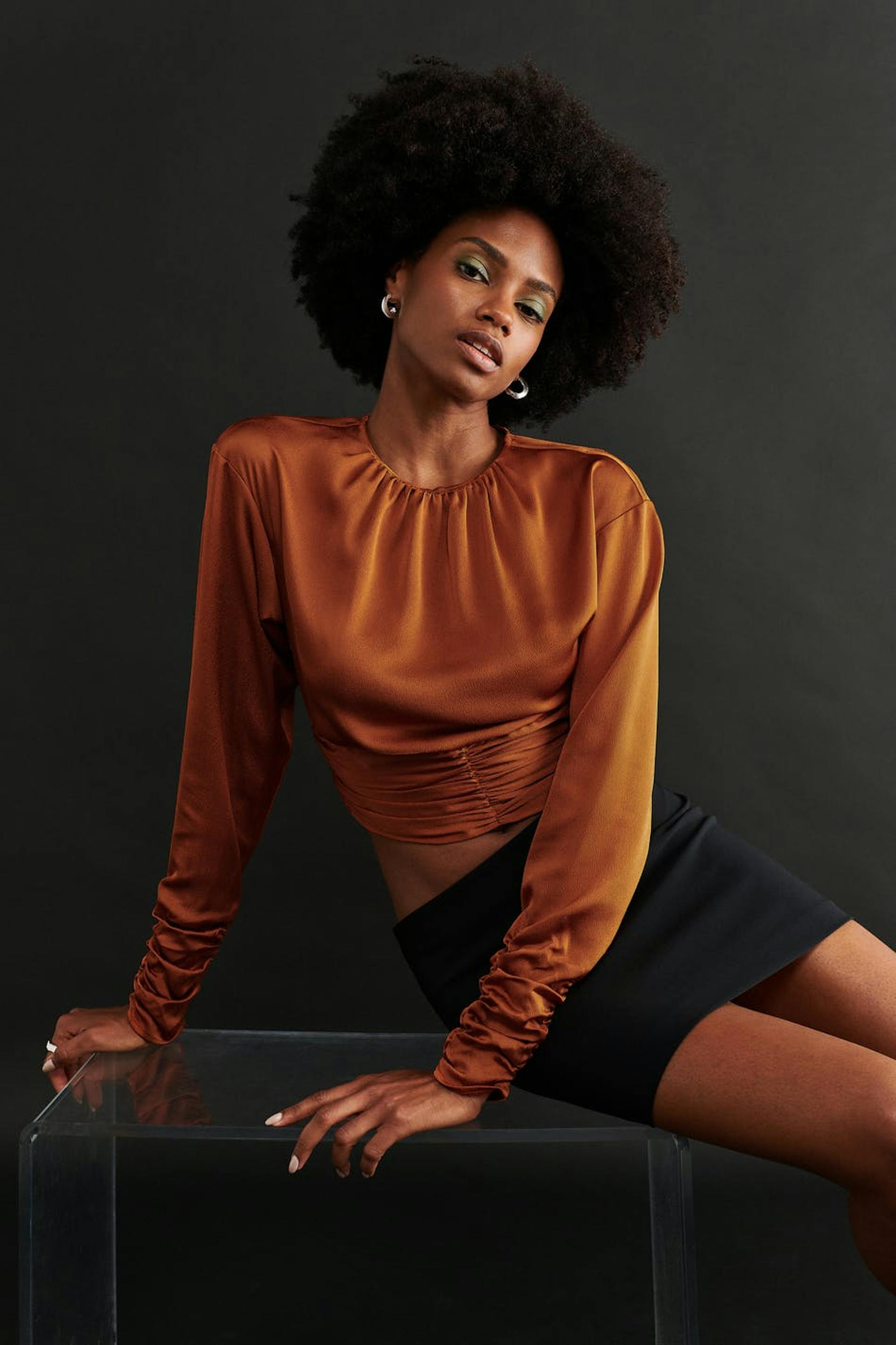 Pitkähihainen pusero rypytystyylillä vyötäröllä. Pusero on ruskea ja siinä on napituslista kaulassa. Siinä on pyöristetty kaula-aukko, rypytys selässä ja poimutetut hihansuut.