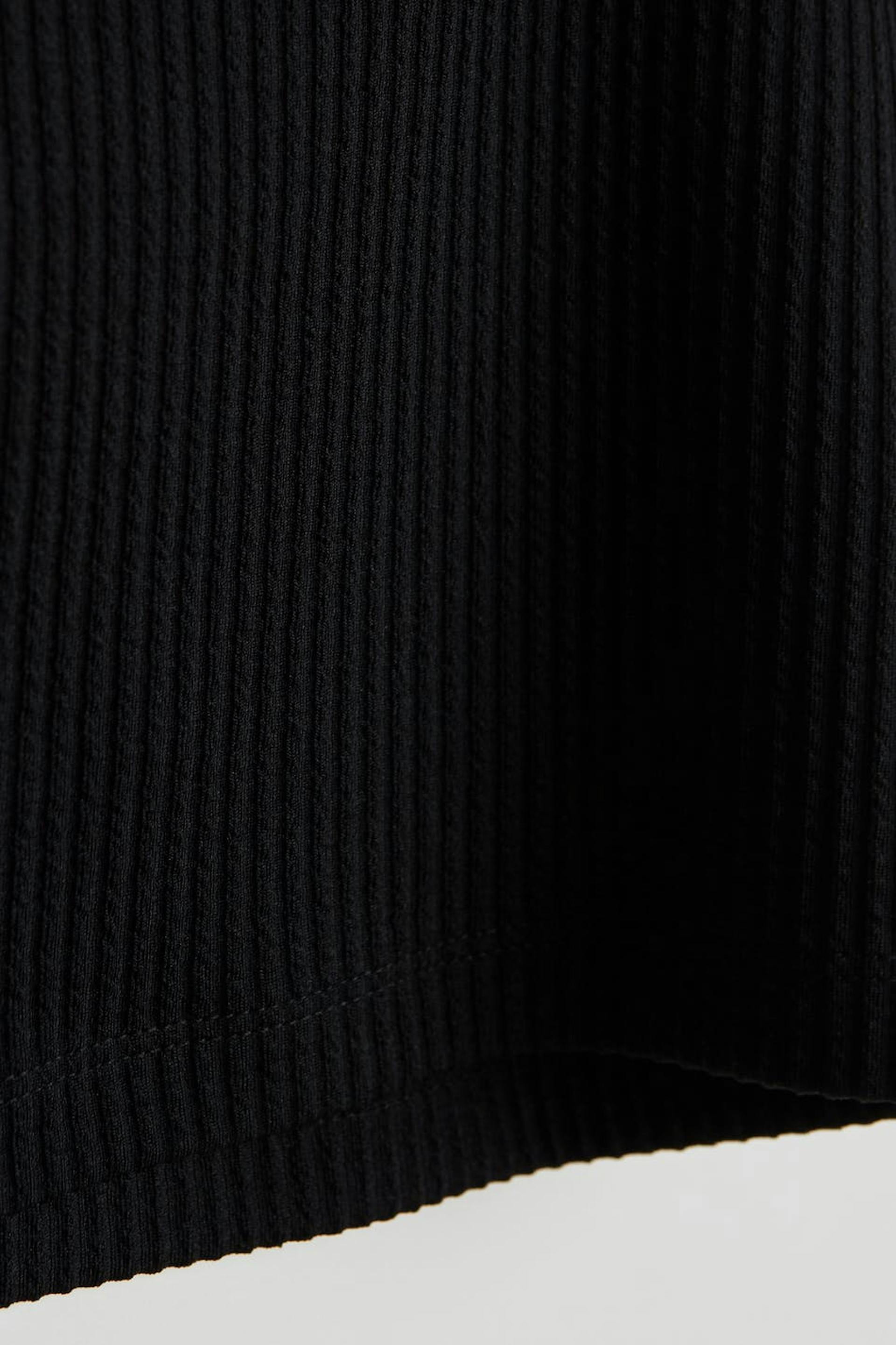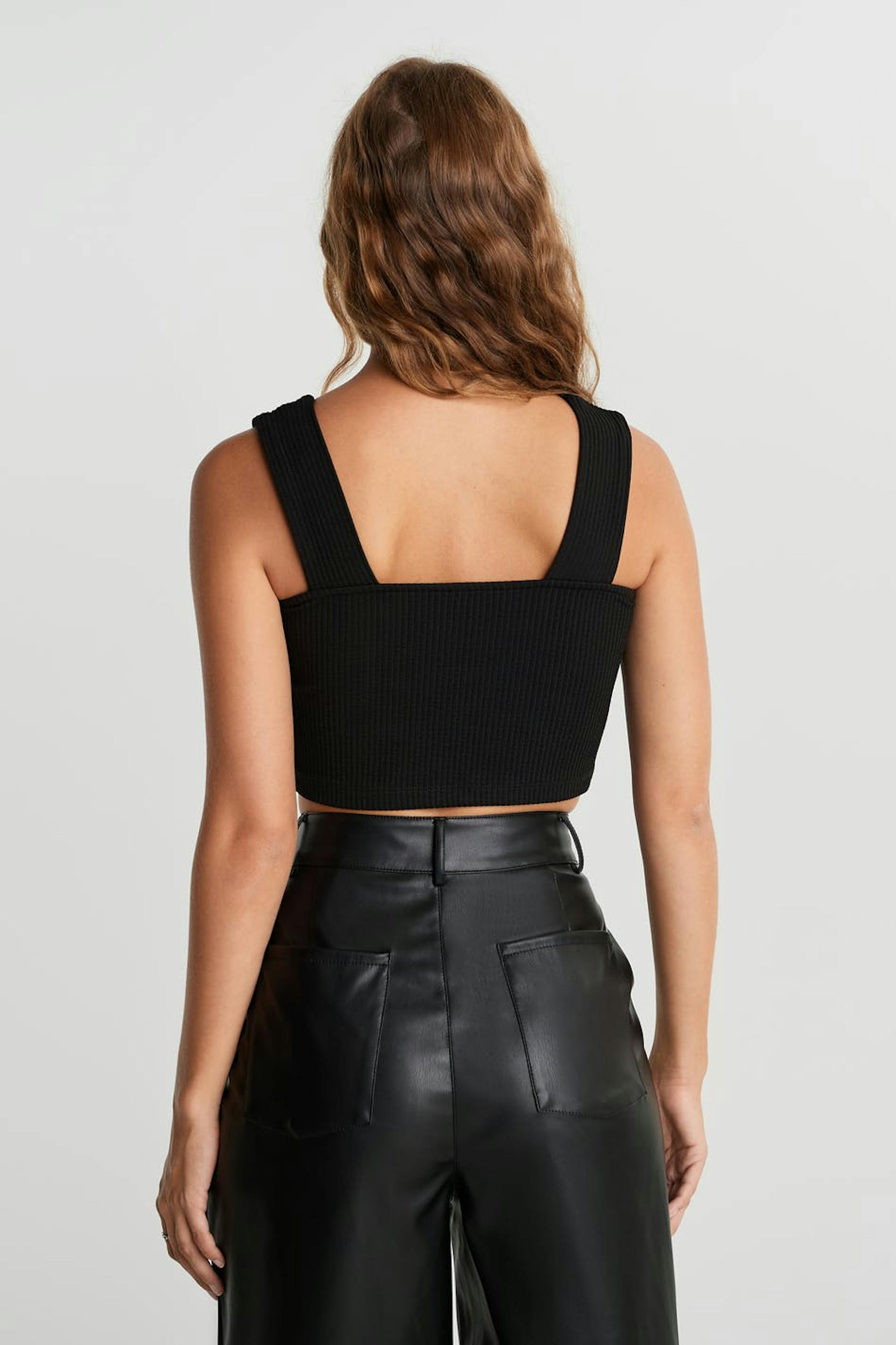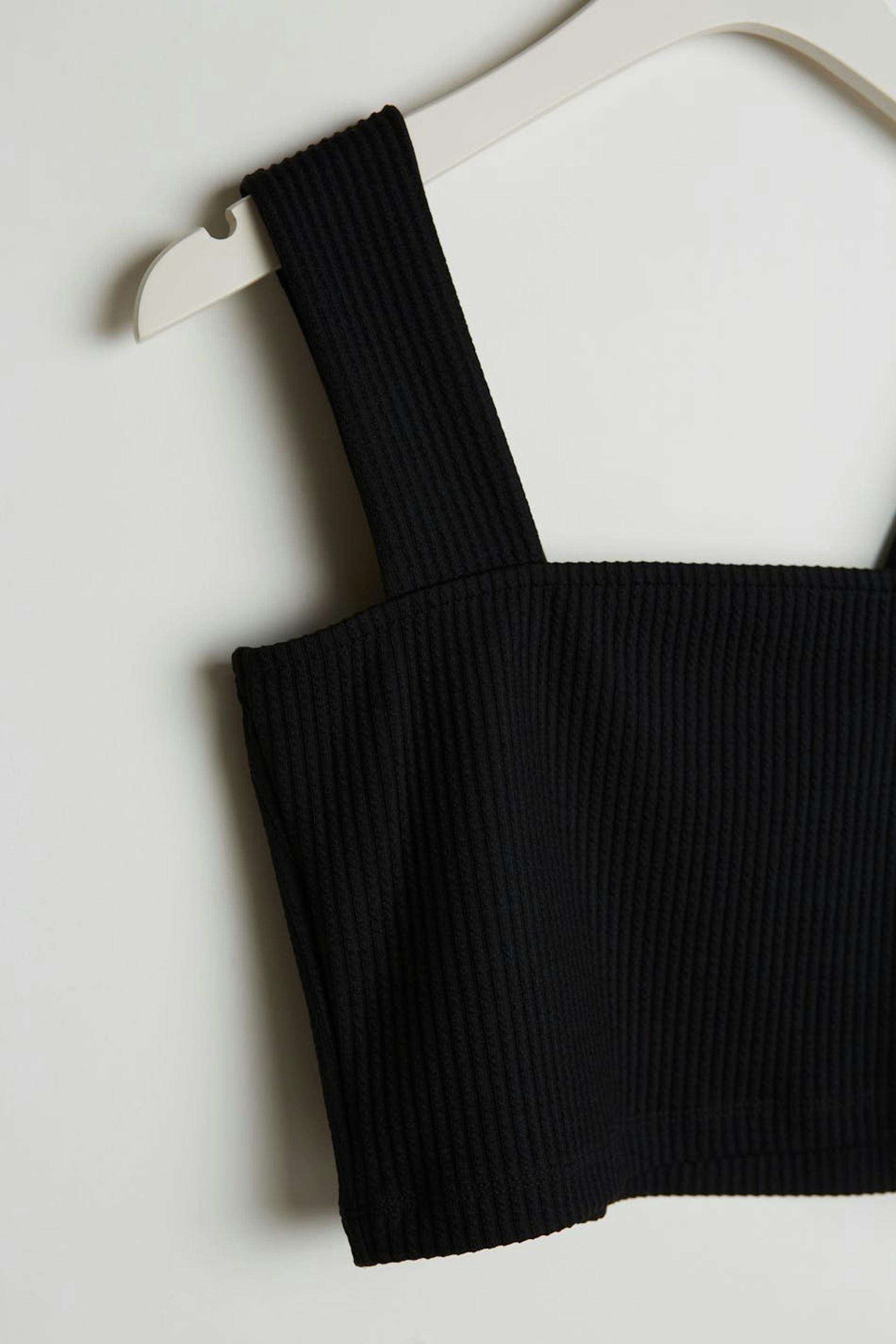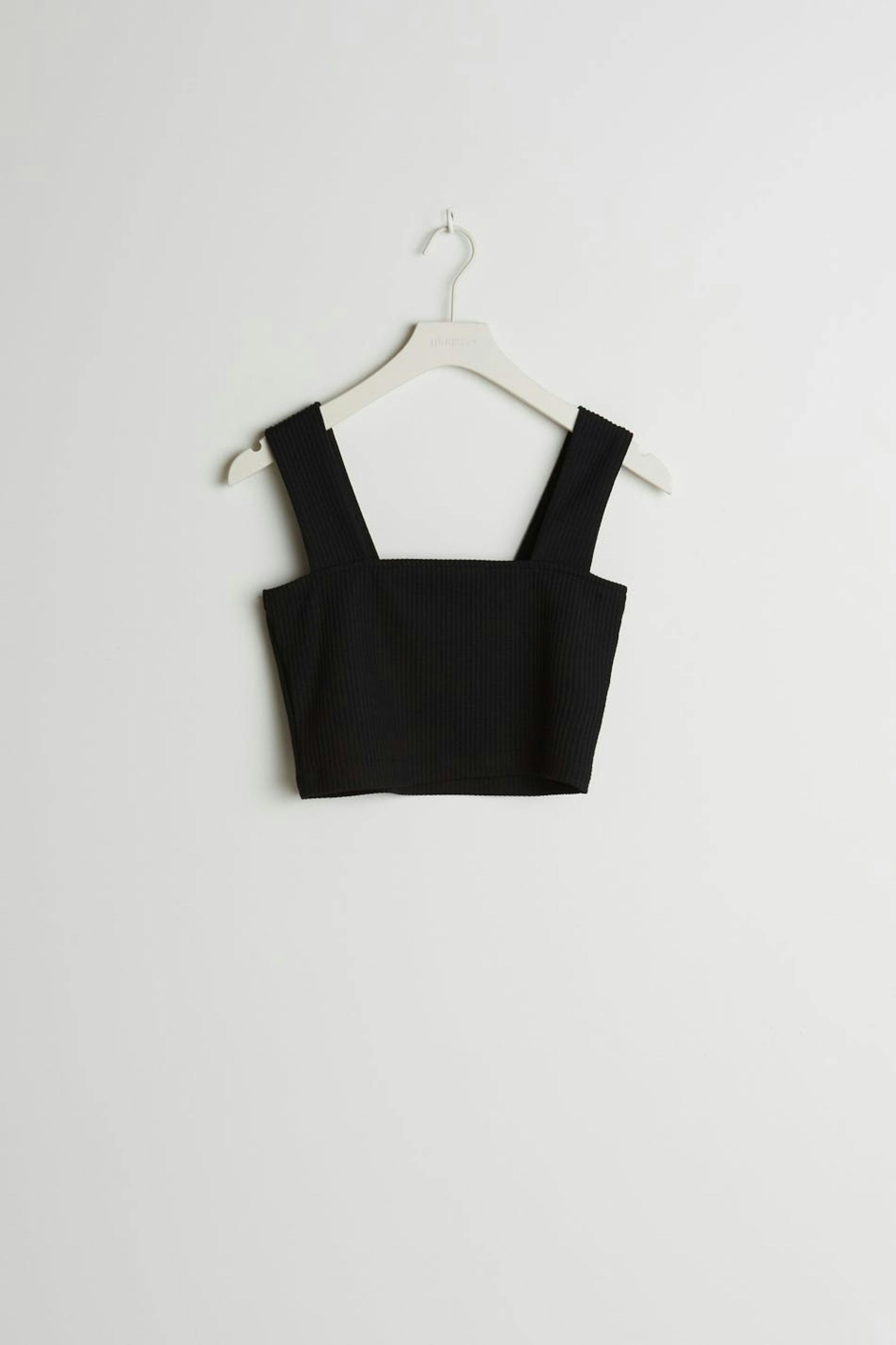 Lyhyt toppi leveillä olkaimilla. Toppi on juhliin täydellisesti sopiva, musta ja resorimainen. Siinä on suora pääntie.