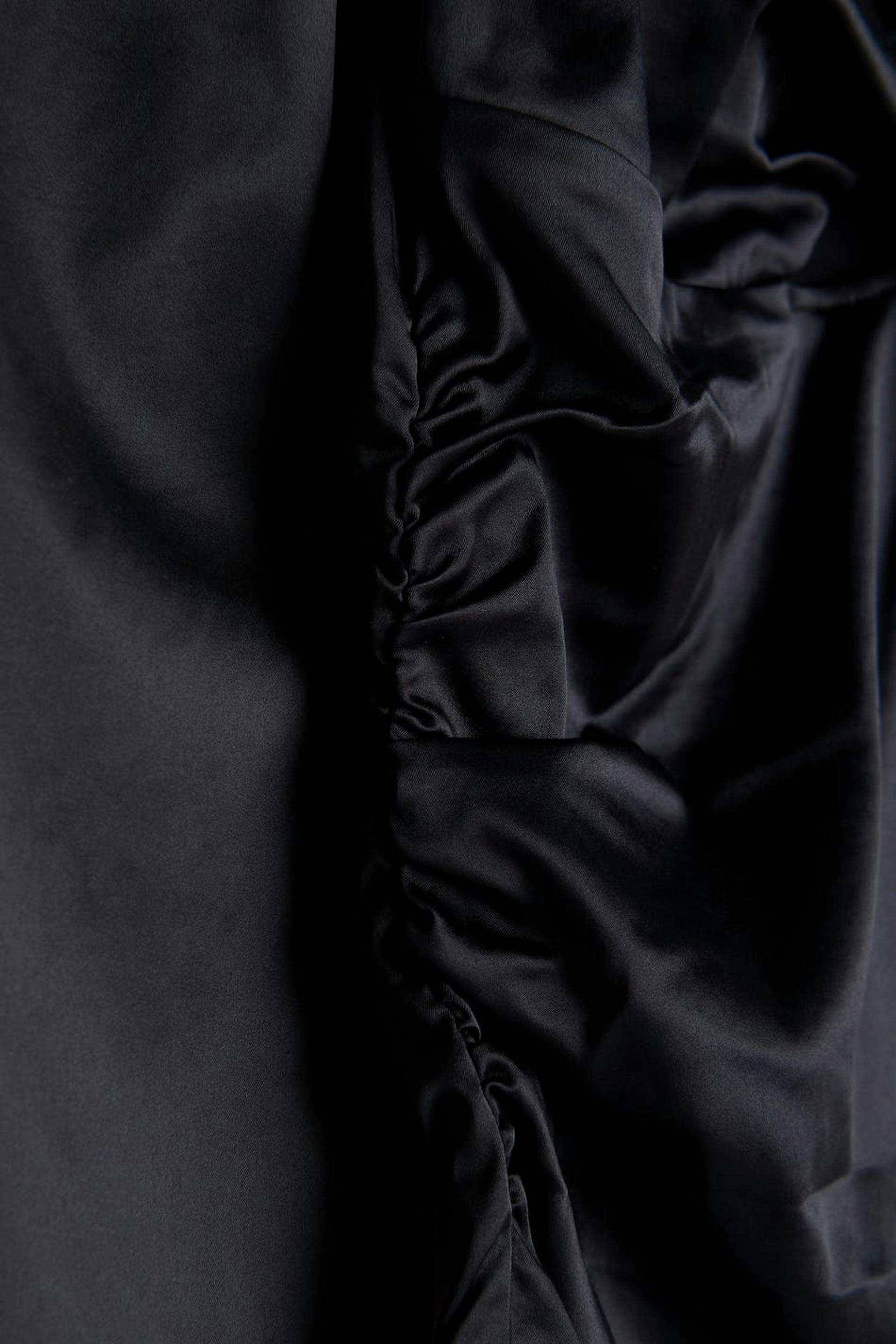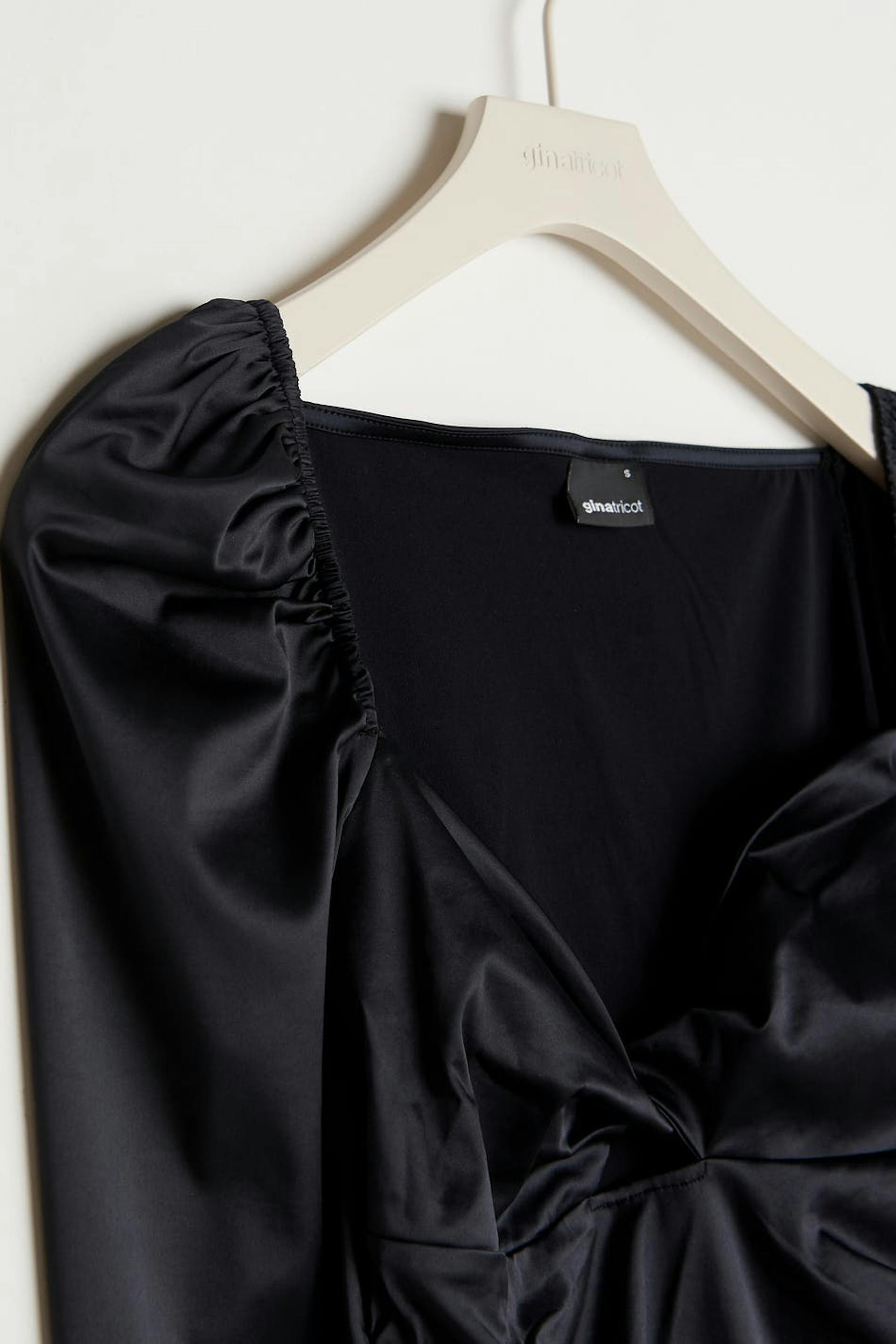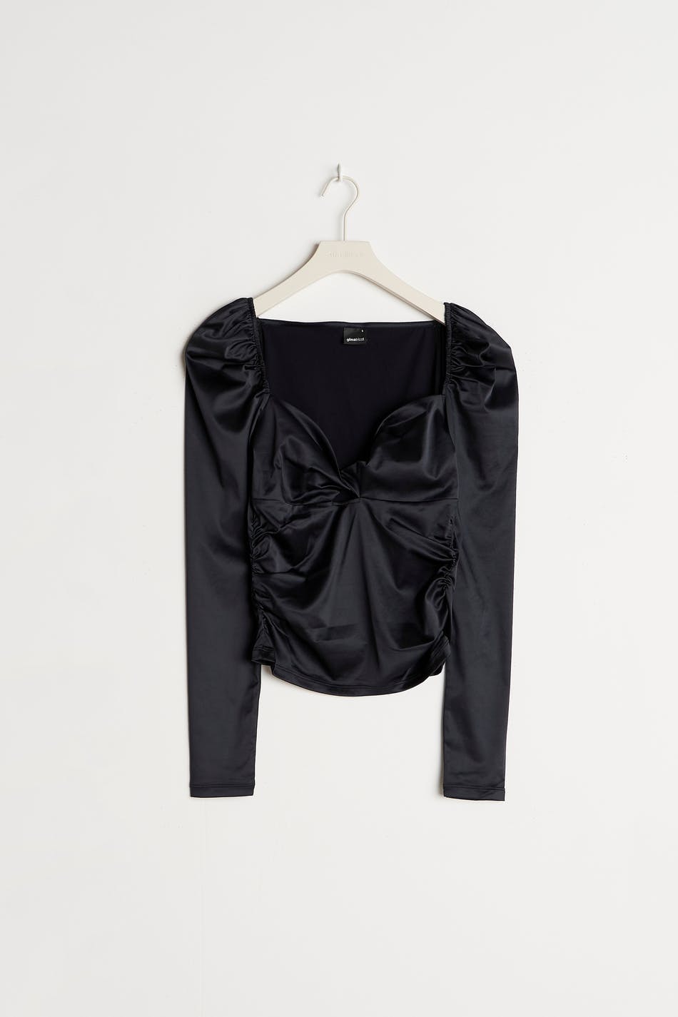 Pitkähihainen toppi vartalonmyötäisellä istuvuudella. Toppi on juhliin täydellisesti sopiva ja musta ja siinä on joustava materiaali satiinista. Siinä on kiemurainen yksityiskohta edessä, puhvihihat ja poimut alhaalla.