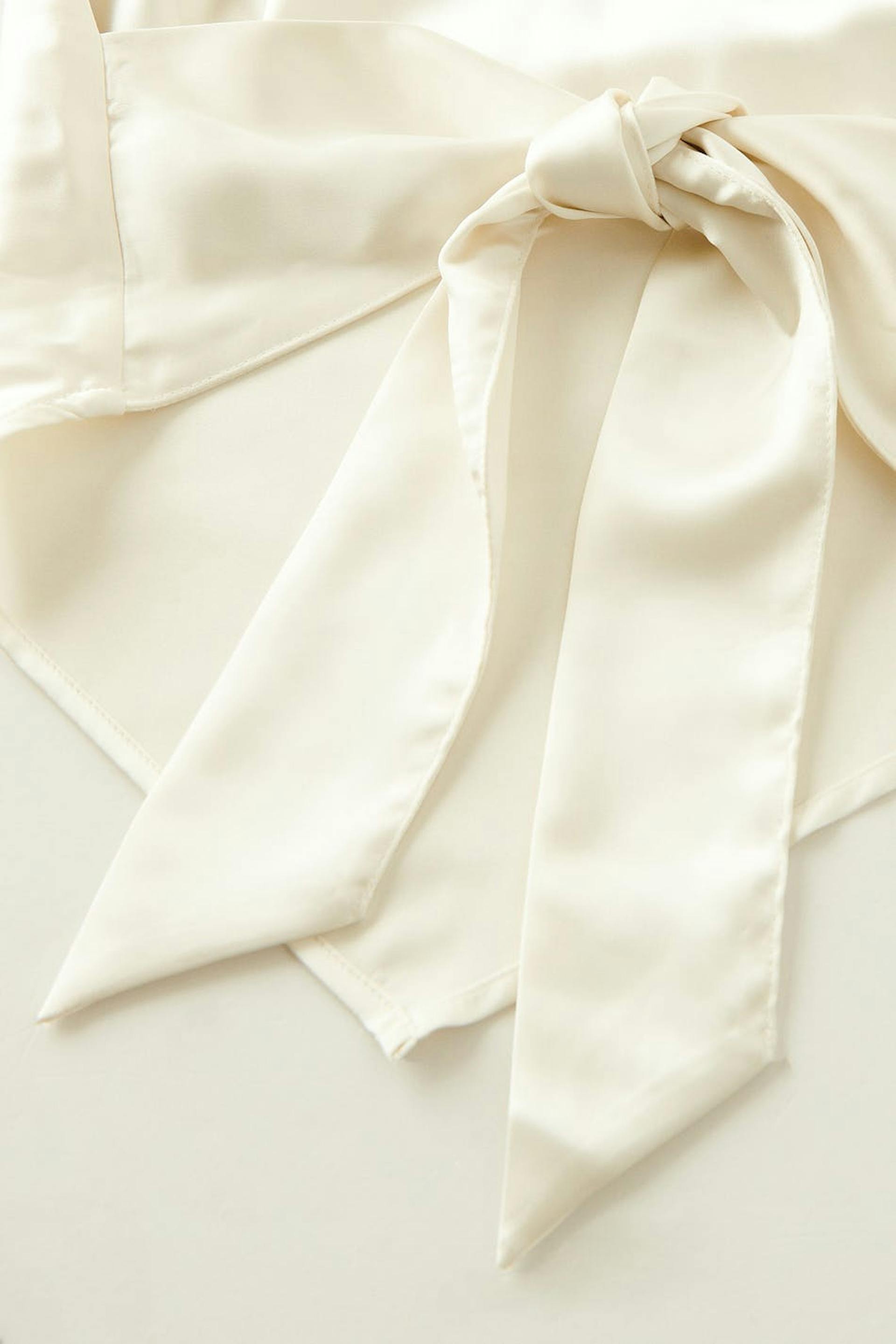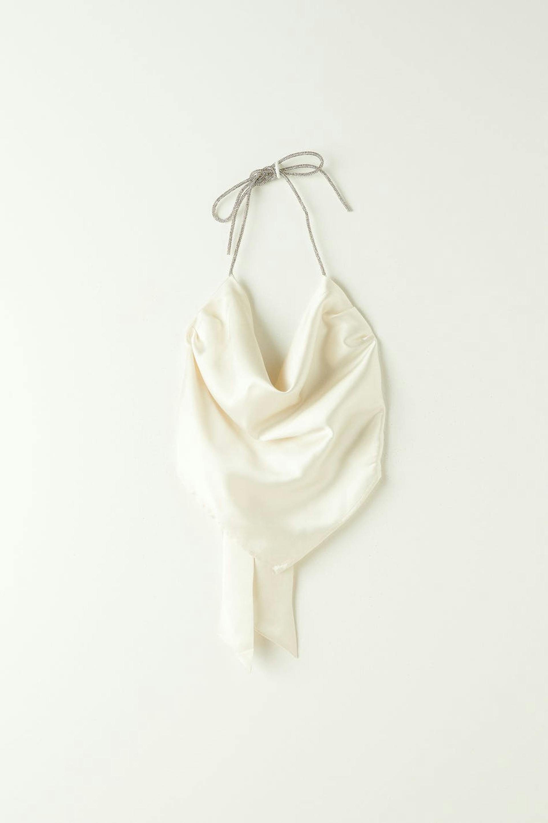 Cropattu toppi satiinista avonaisella selällä. Toppi on valkoinen ja siinä on ohuet, kapeat olkaimet tekojalokivellä. Siinä on solmittava vyö selässä ja poimutettu kaulus.