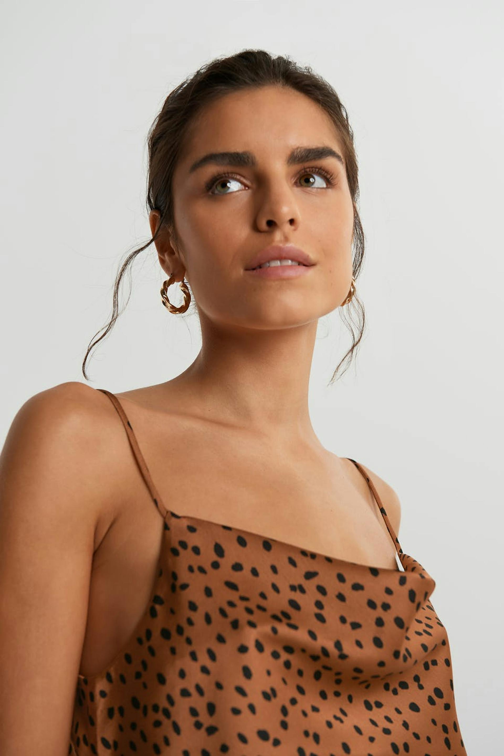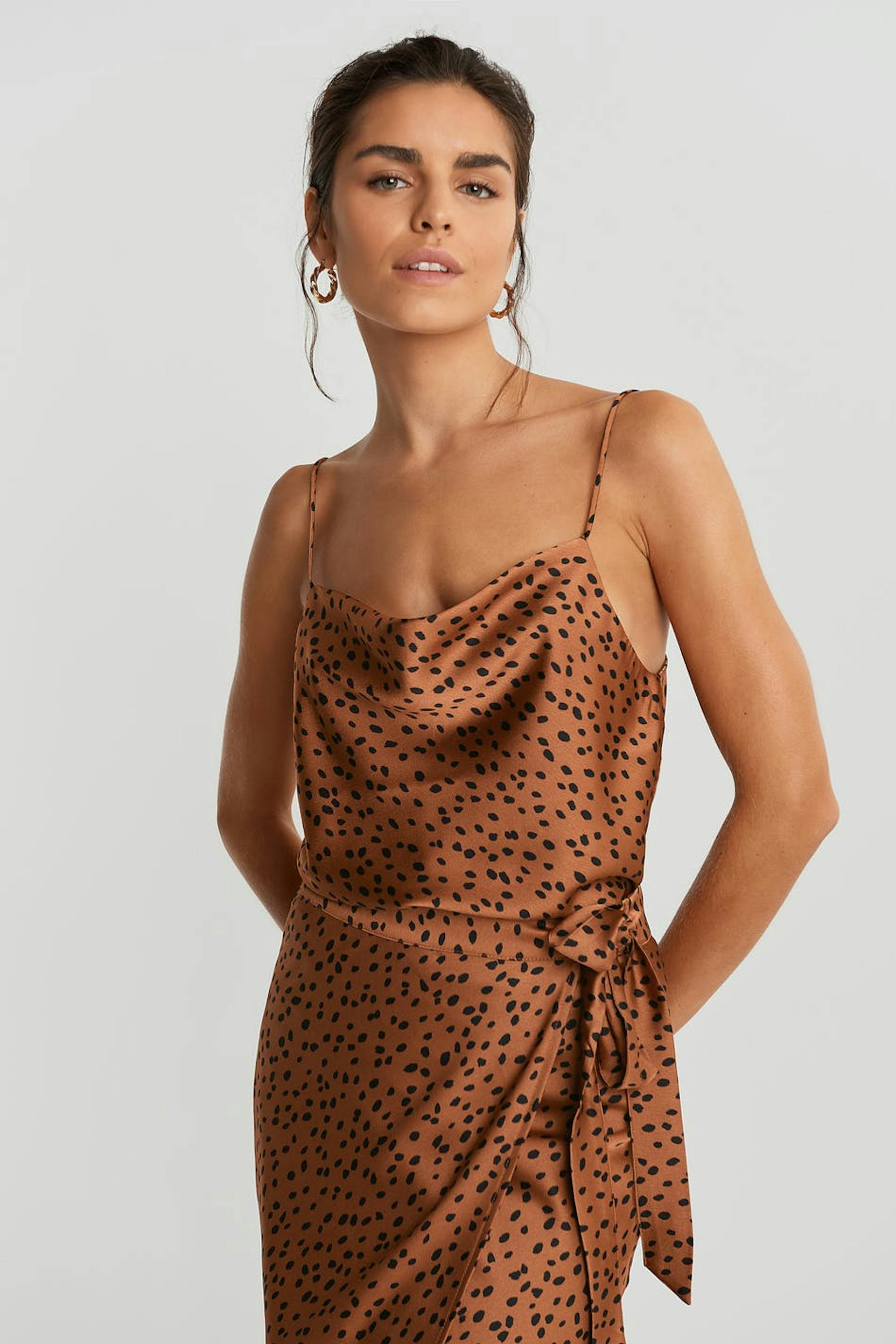 Toppi normaalilla leikkauksella. Toppi on puolueelle täydellisesti sopiva ja ruskea ja siinä on poimutettu kaula-aukko.
