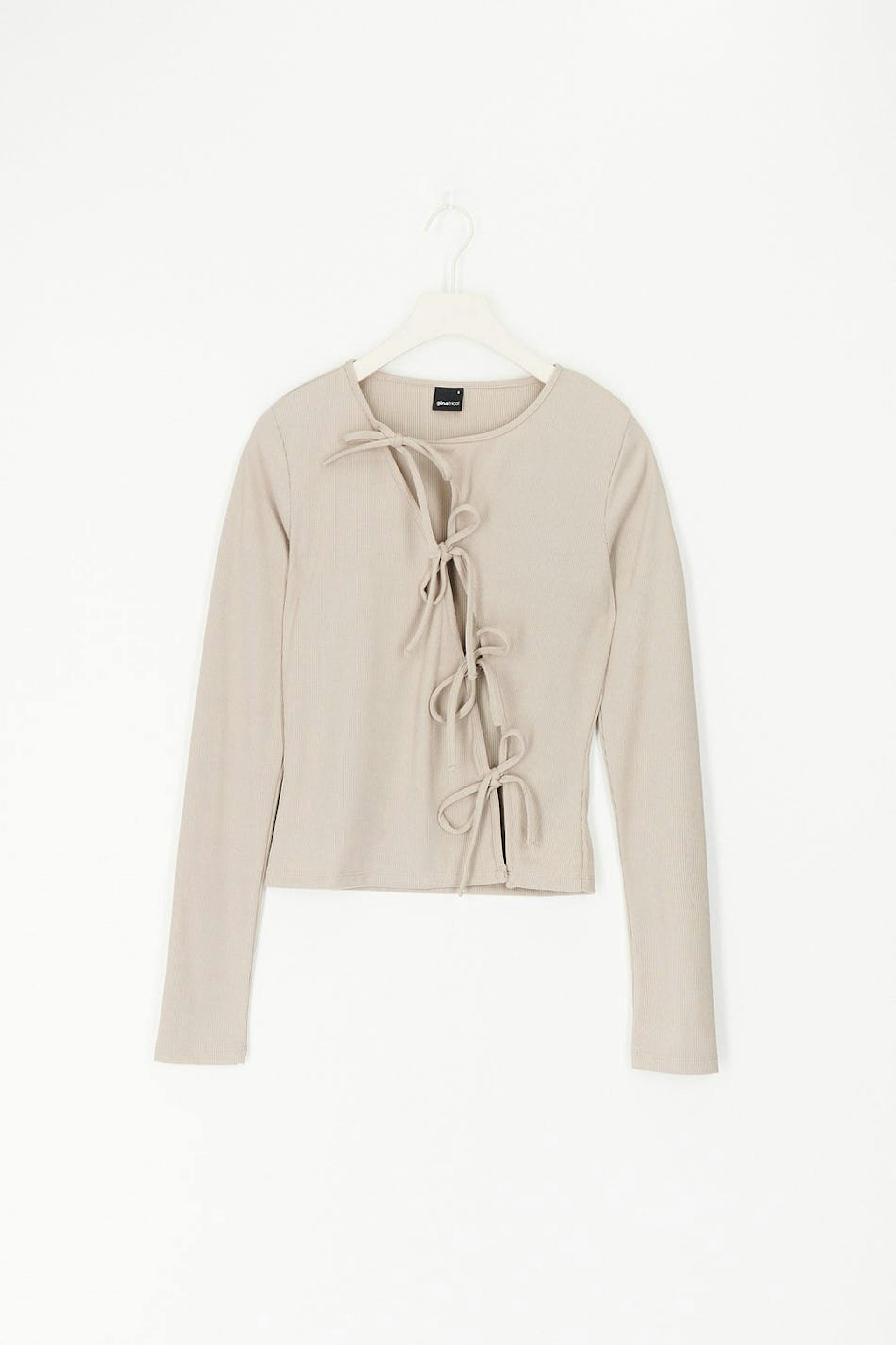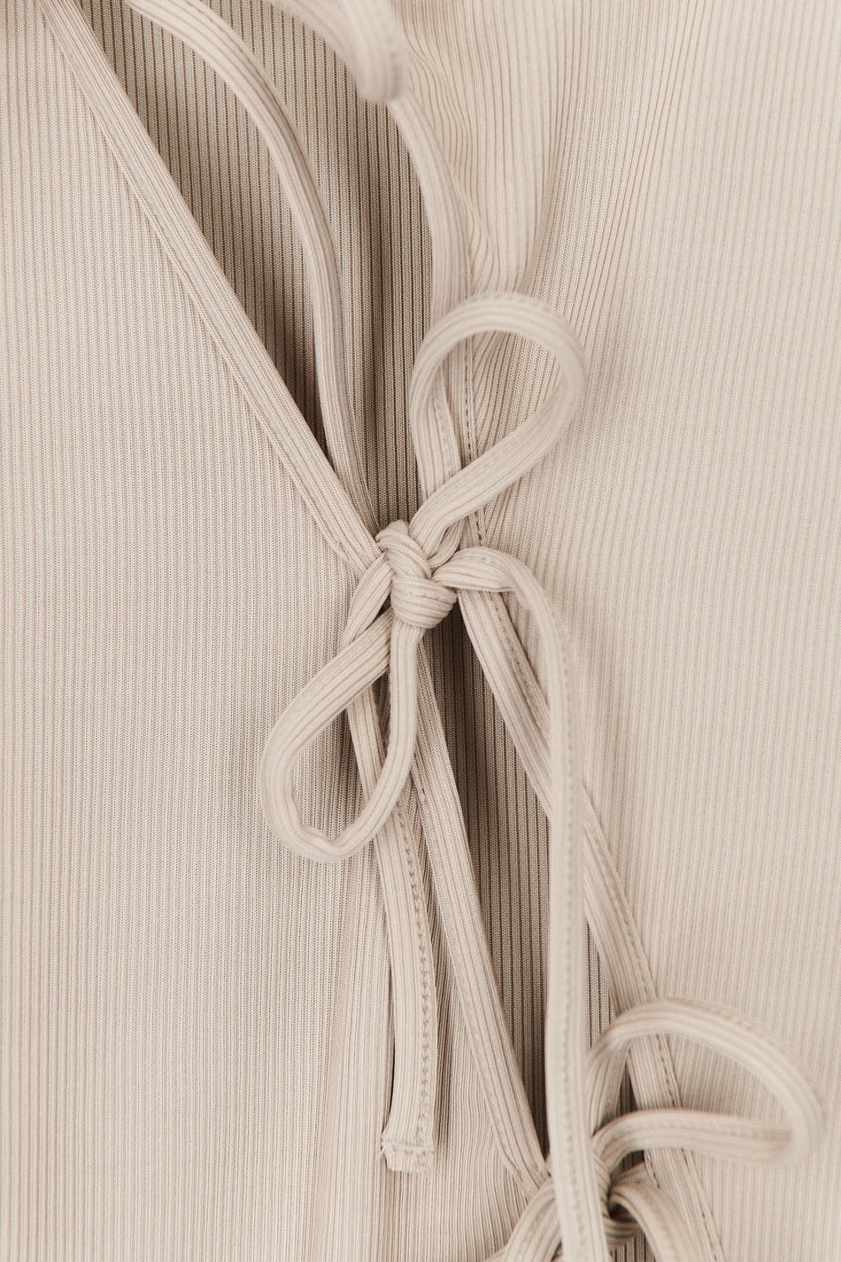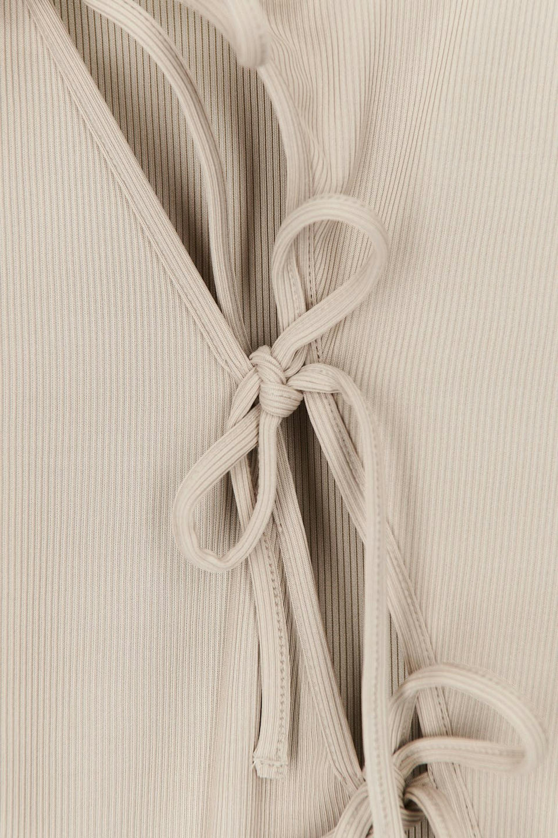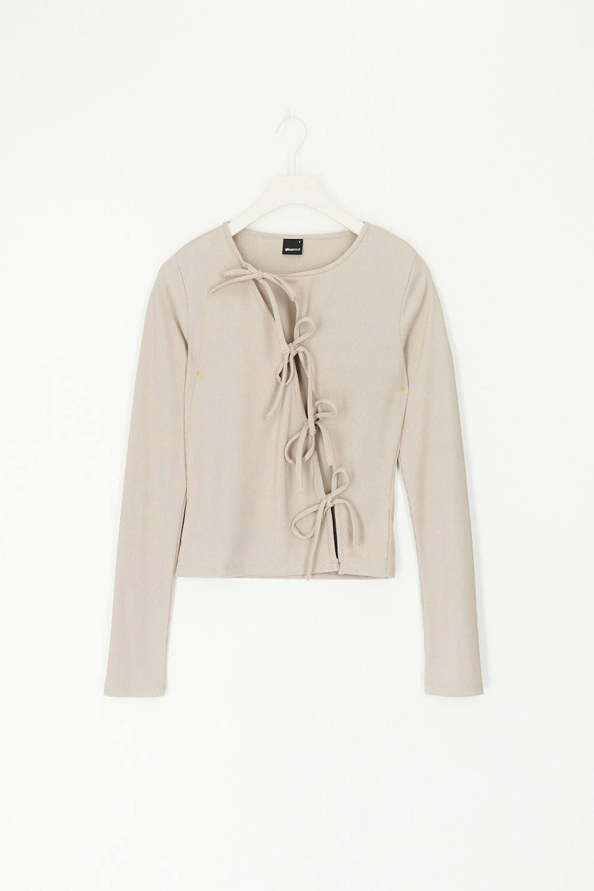 Pitkähihainen toppi vinolla nyörikiinnityksellä edessä. Toppi on beige ja siinä on pyöreä pääntie. Siinä on vartalonmyötäinen istuvuus ja ribattu laatu trikoosta.