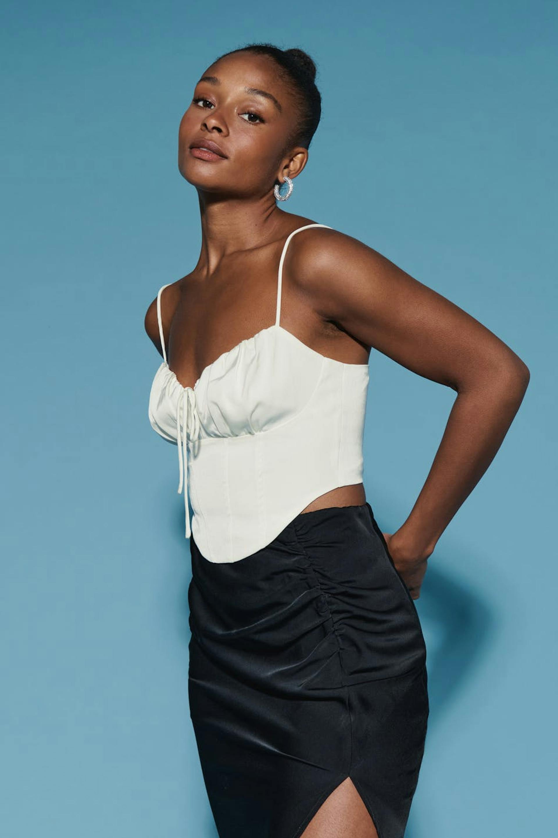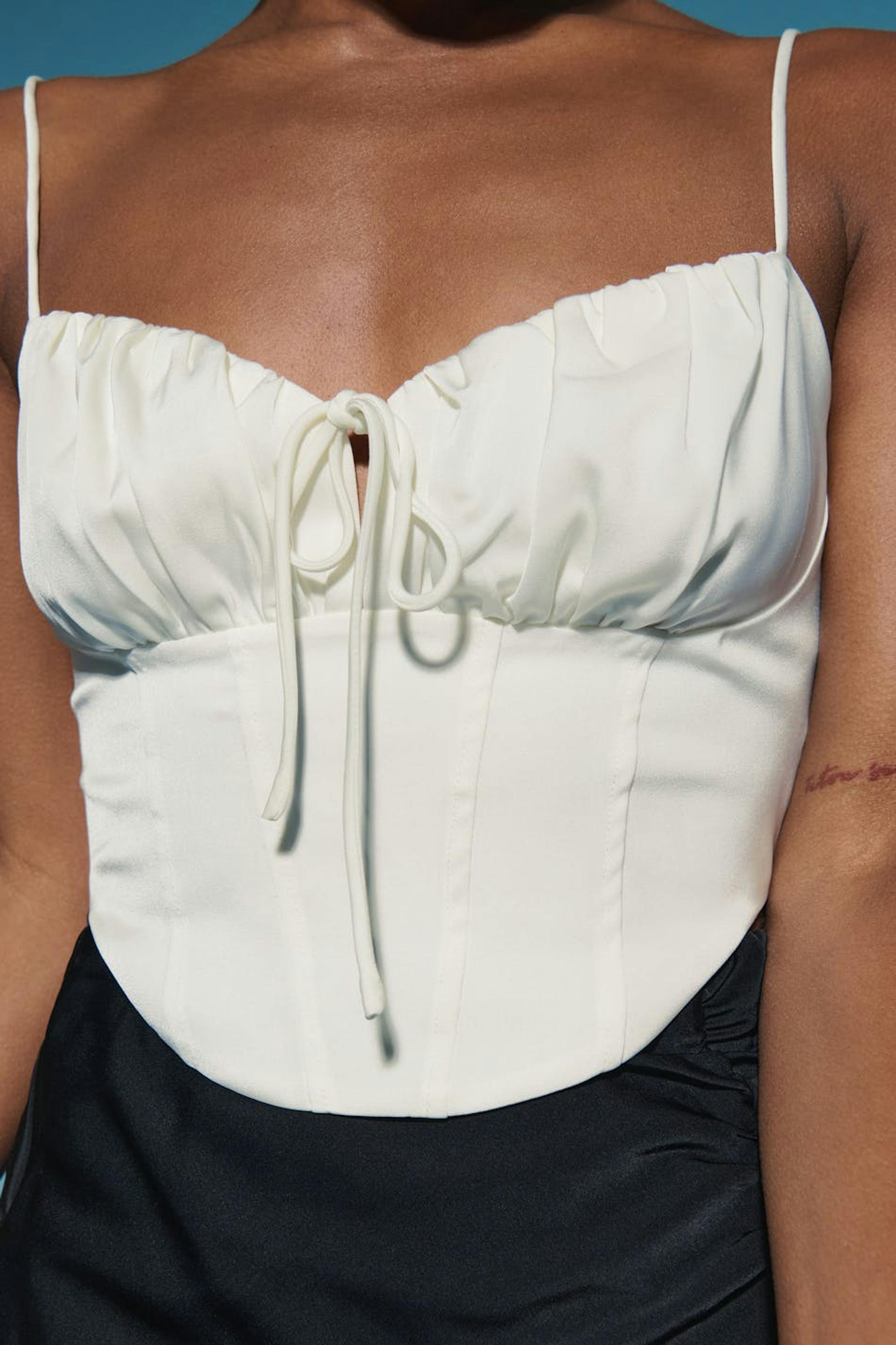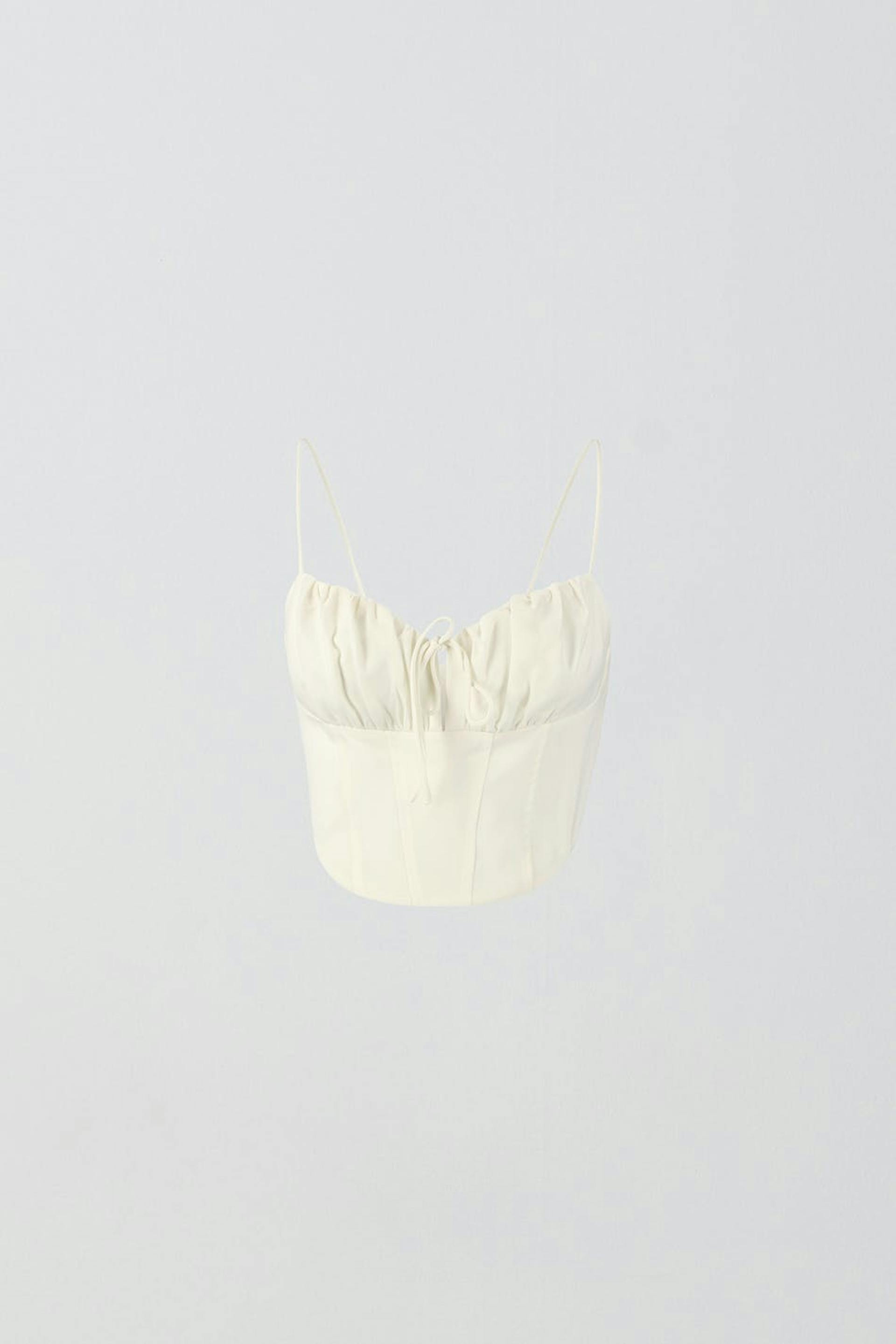 Korsettiyläosa nyörityksellä selässä. Toppi on valkoinen ja siinä on tyköistuva istuvuus. Siinä on rypytetty rinnus ja kapeat, säädettävät olkaimet.
