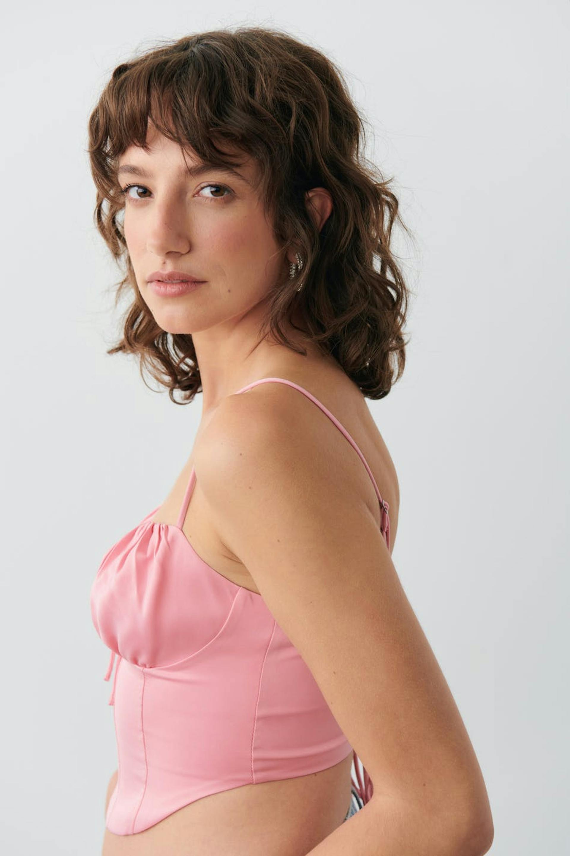 Korsettiyläosa nyörityksellä selässä. Toppi on pinkki ja siinä on tyköistuva istuvuus. Siinä on rypytetty rinnus ja kapeat, säädettävät olkaimet.