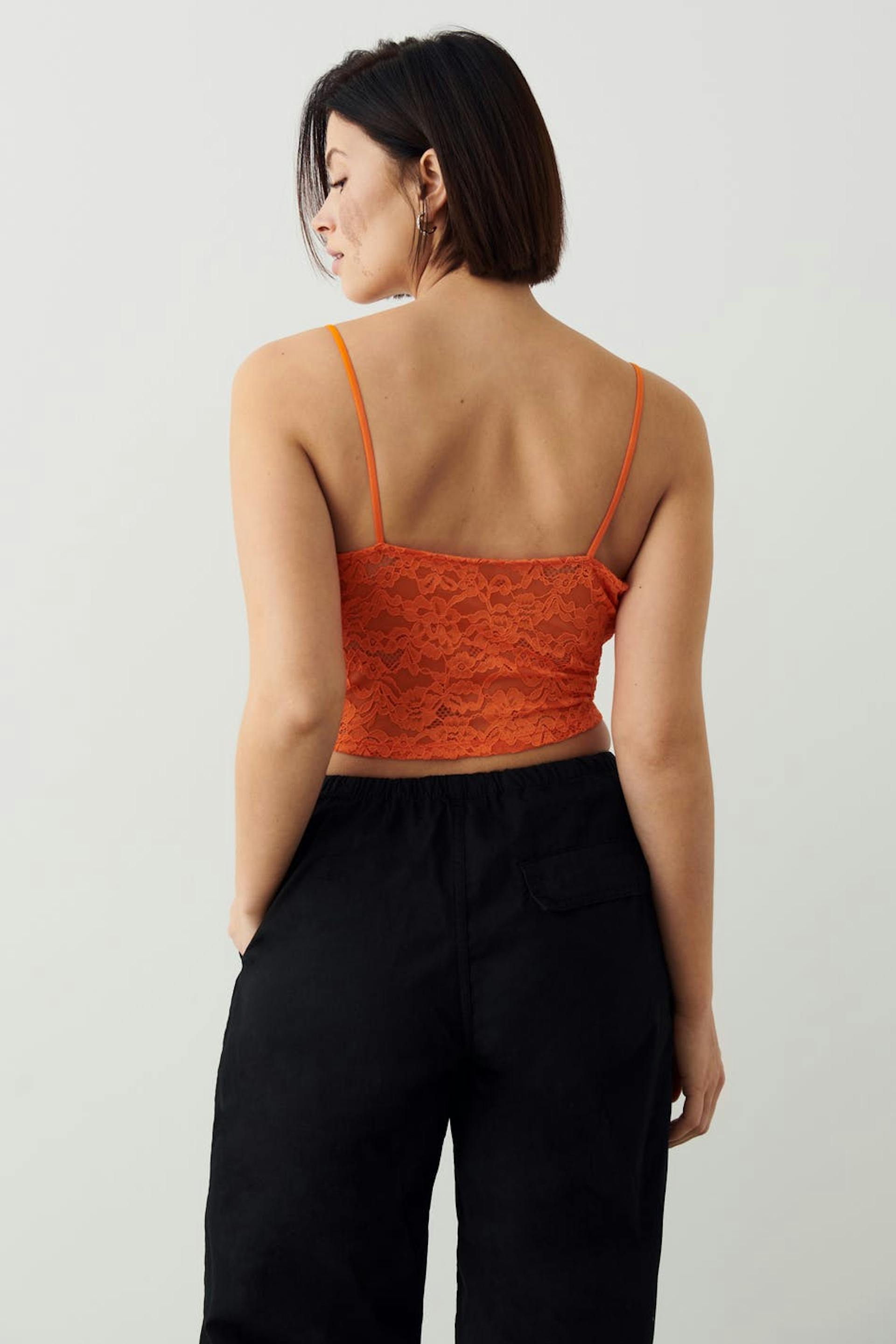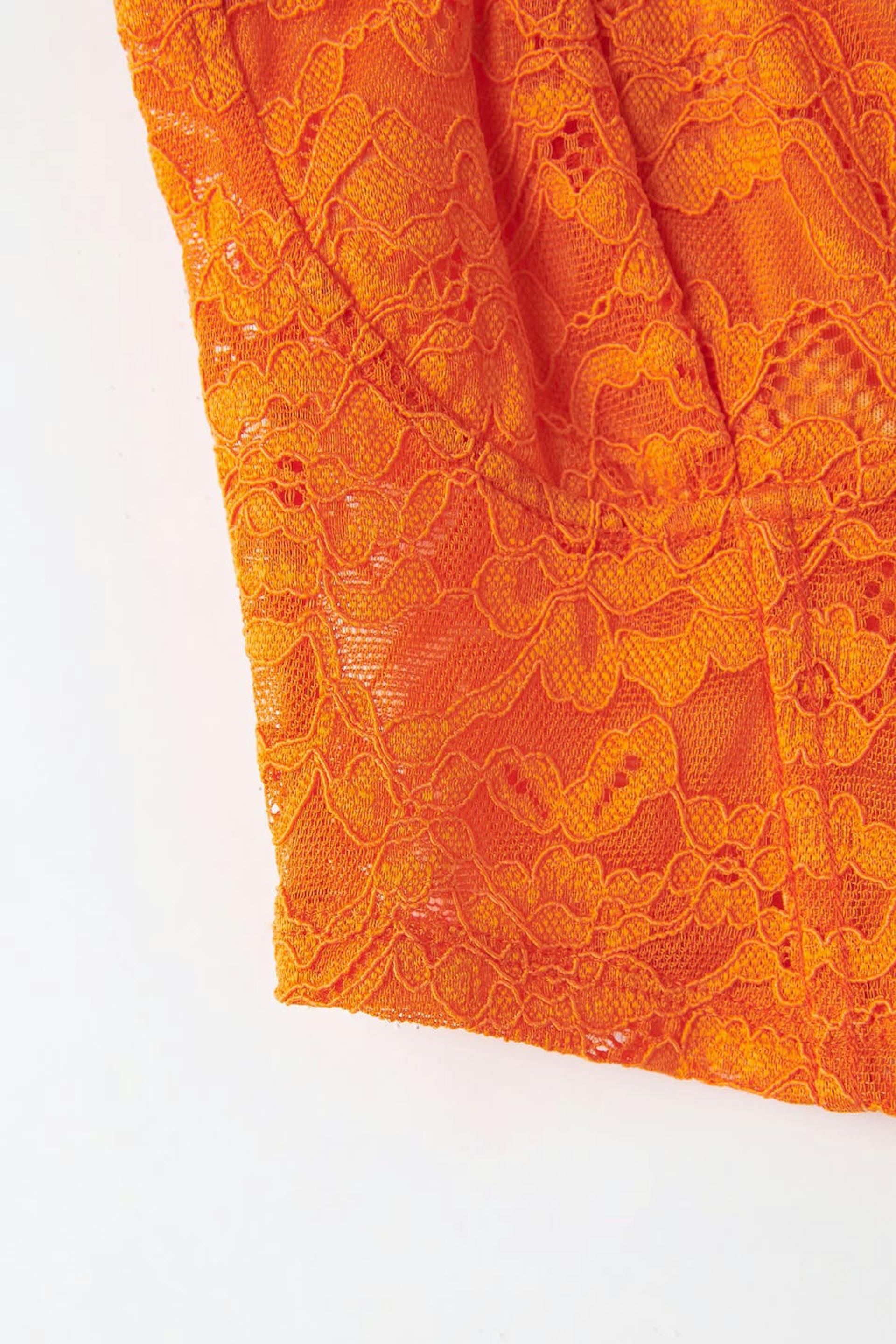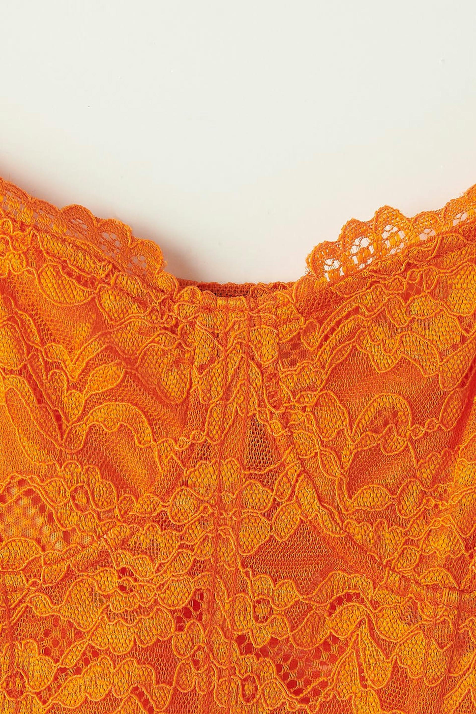 Cropattu bustier-toppi pitsistä vartalonmyötäisellä istuvuudella. Bustier-toppi on oranssi ja siinä on ohuet olkaimet.