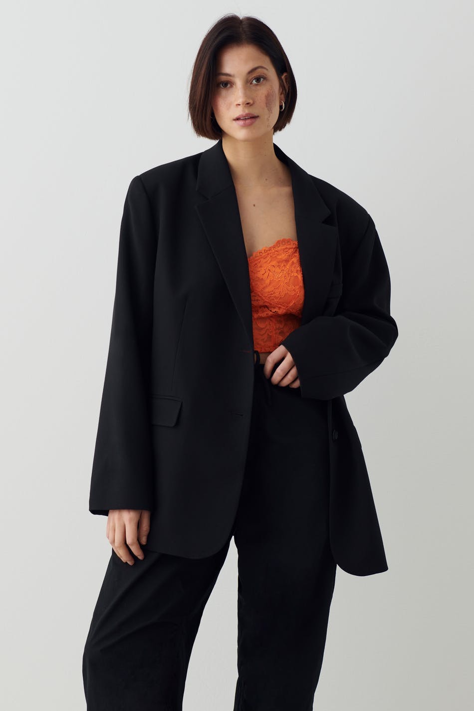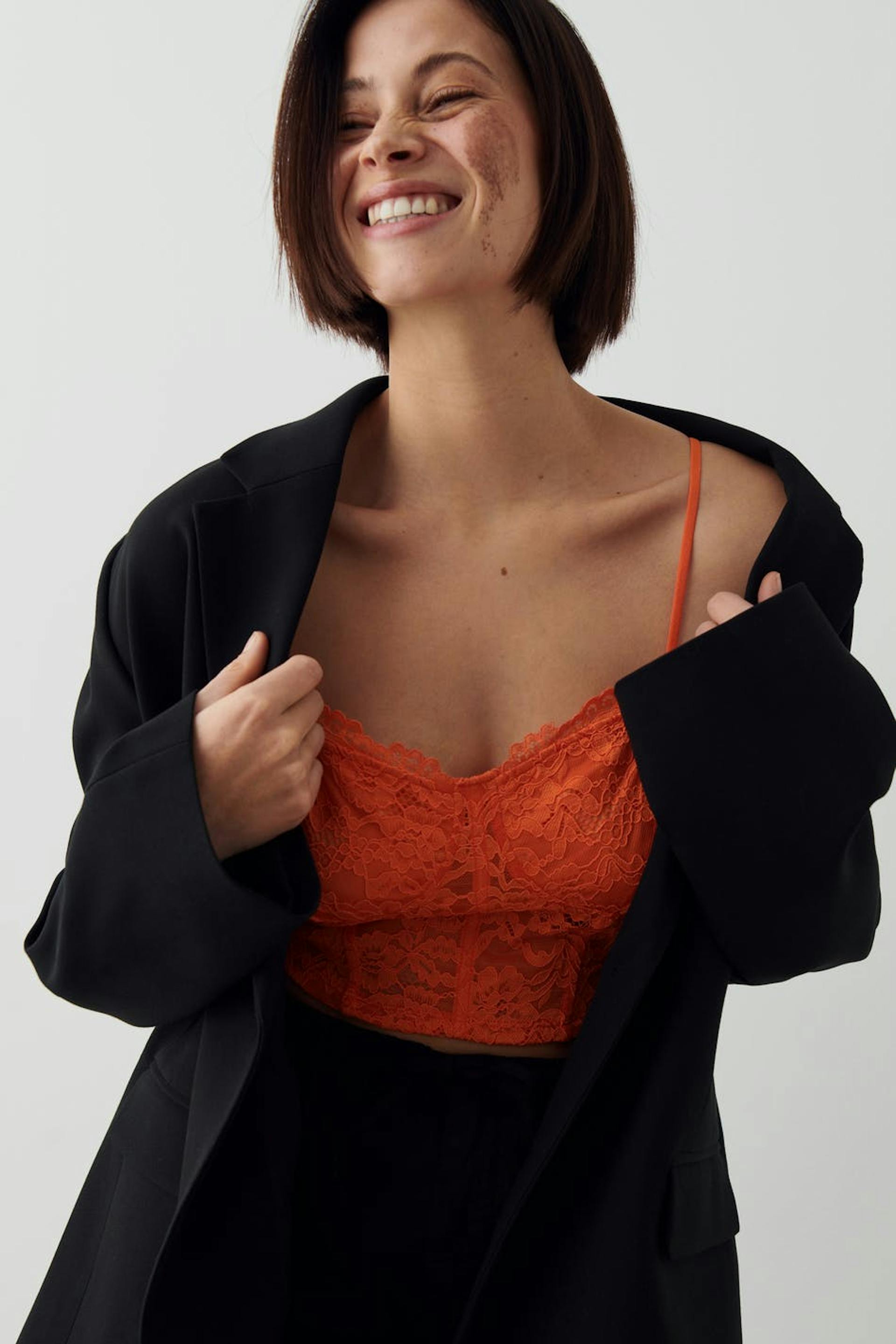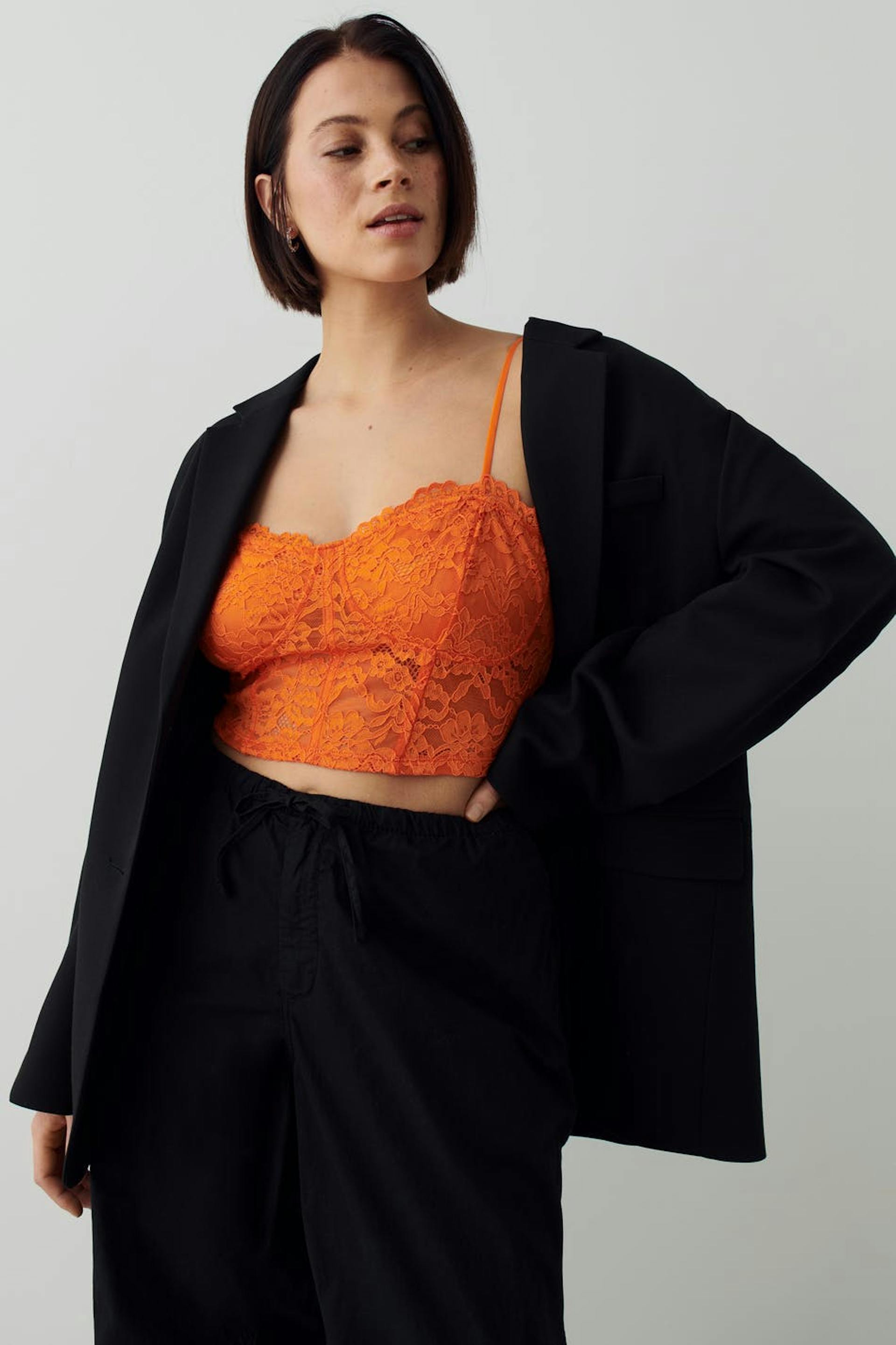 Cropattu bustier-toppi pitsistä vartalonmyötäisellä istuvuudella. Bustier-toppi on oranssi ja siinä on ohuet olkaimet.