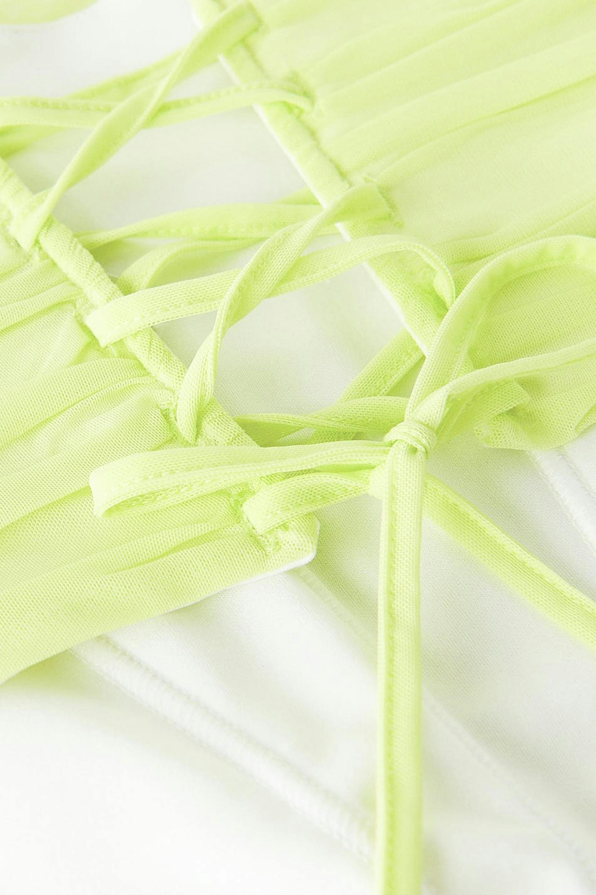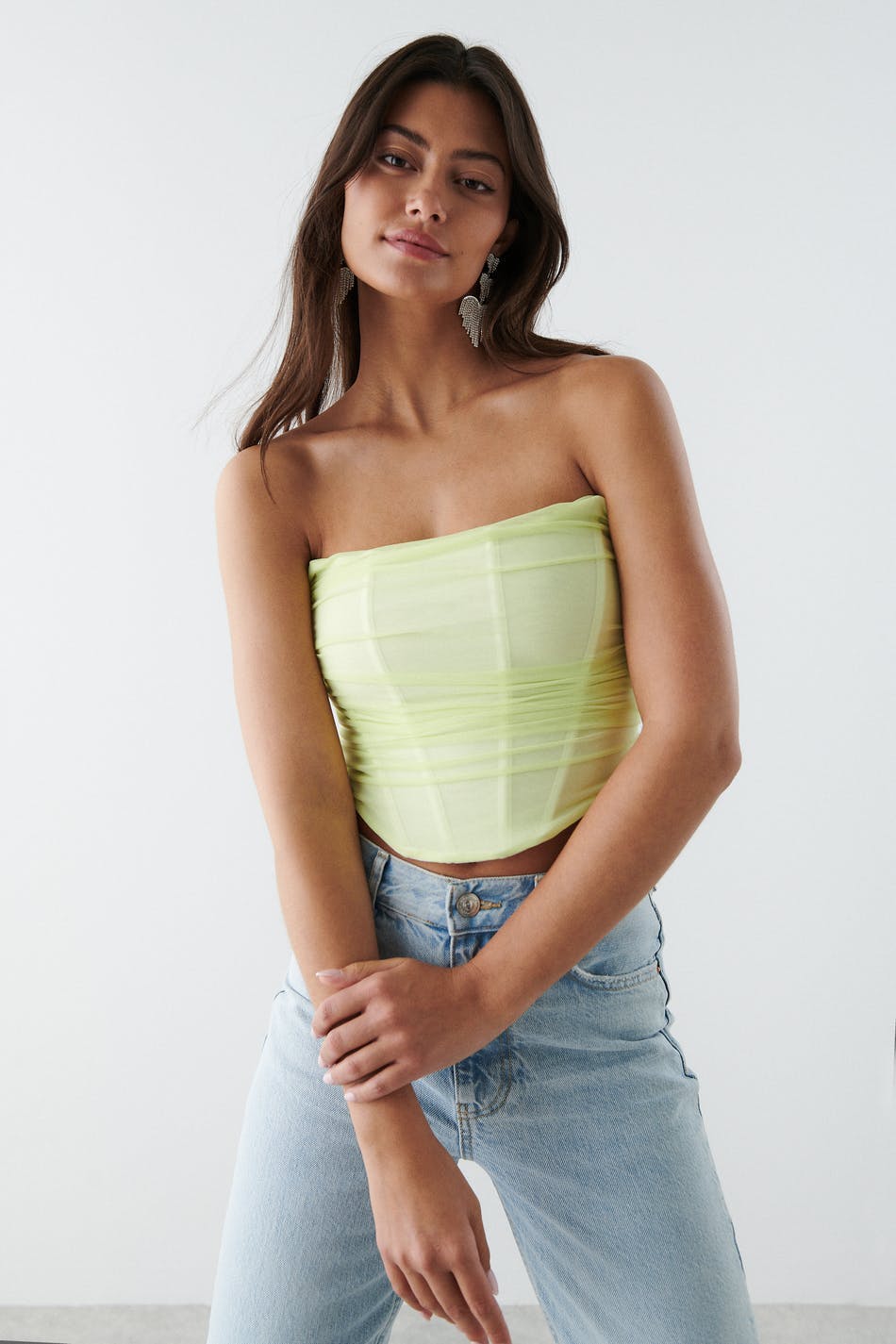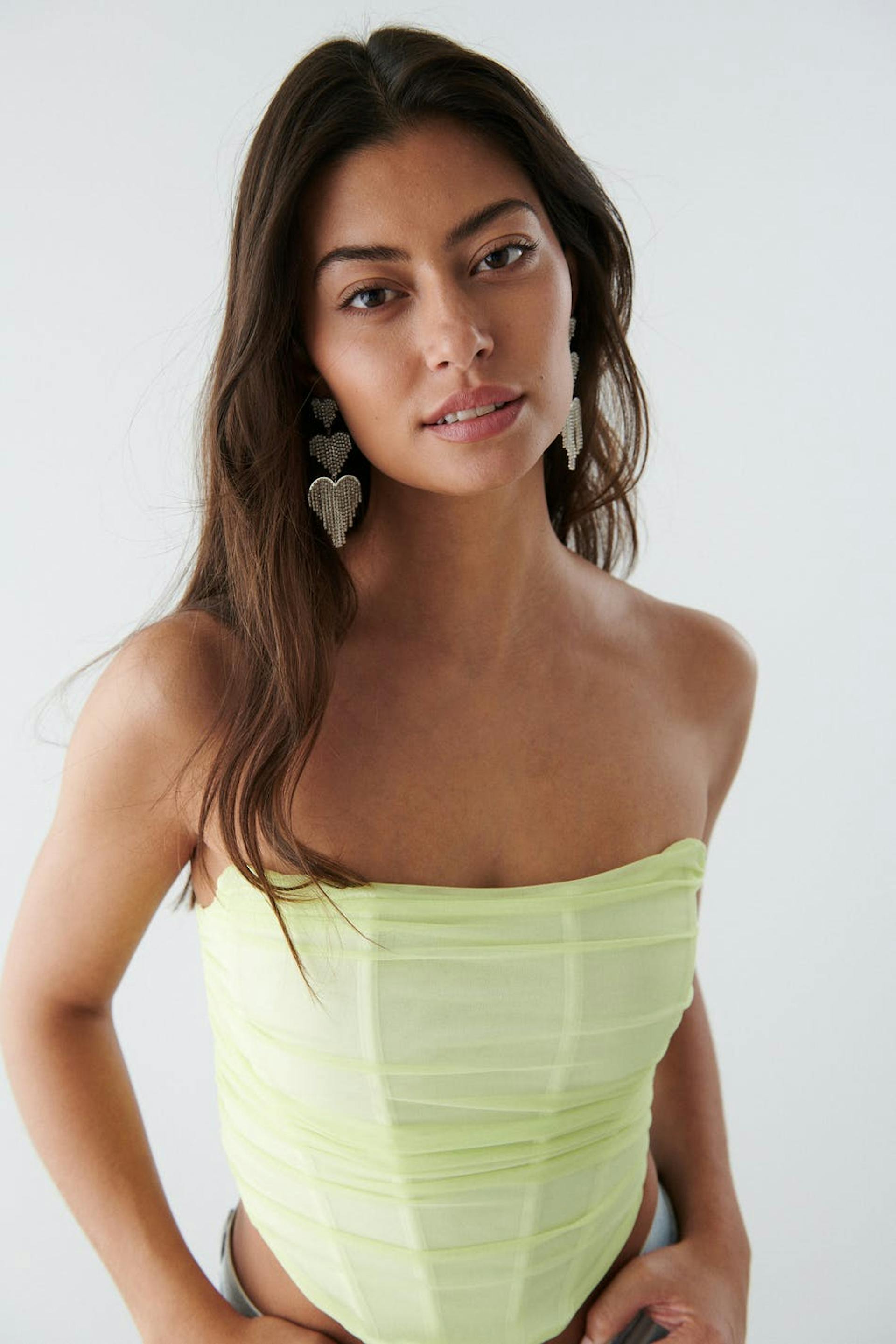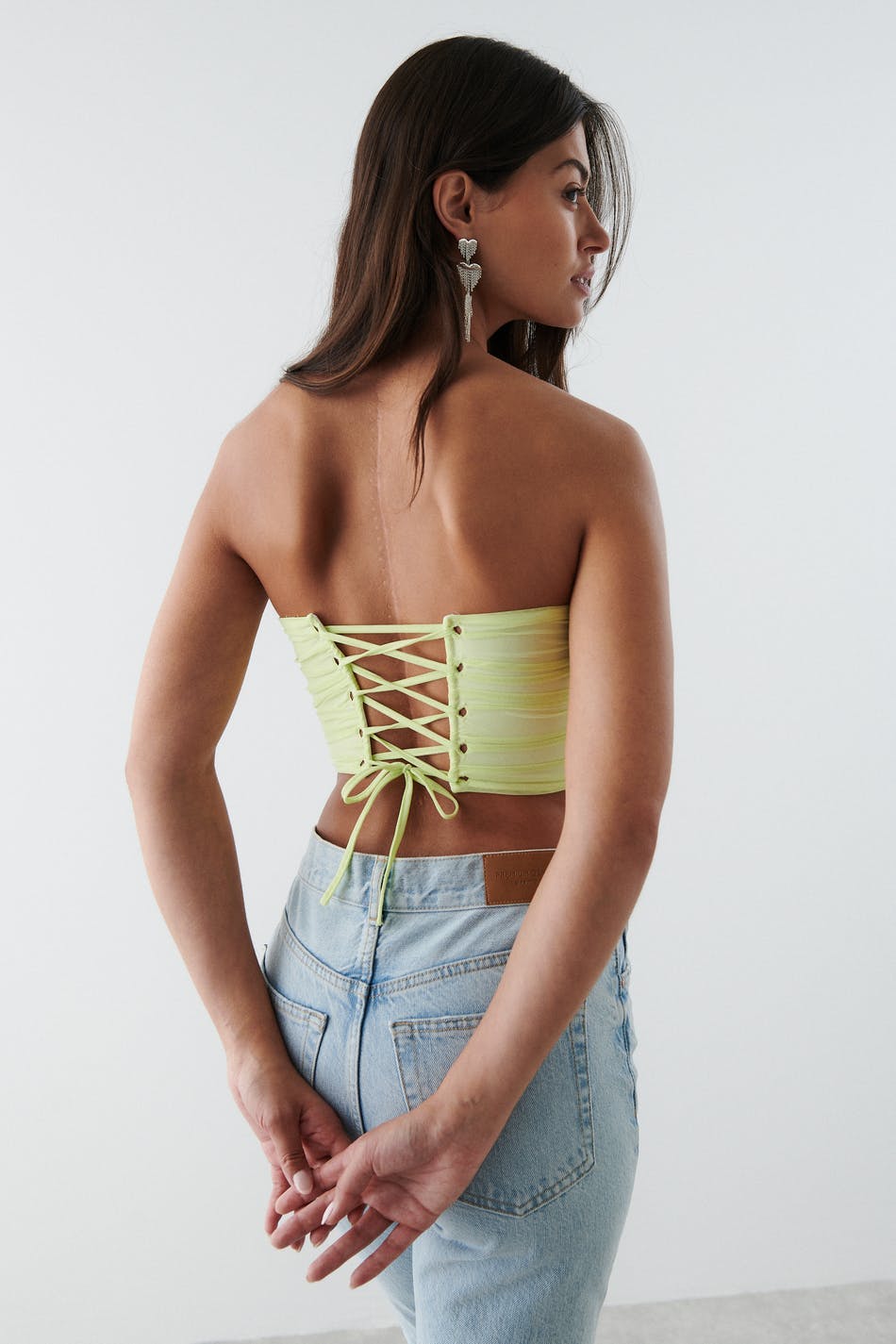 Korsetti nyörityksellä selässä. Korsetti on vihreä ja siinä on poimutettu efekti edessä. Siinä on luurakenteet edessä ja takana antamaan lisätukea.