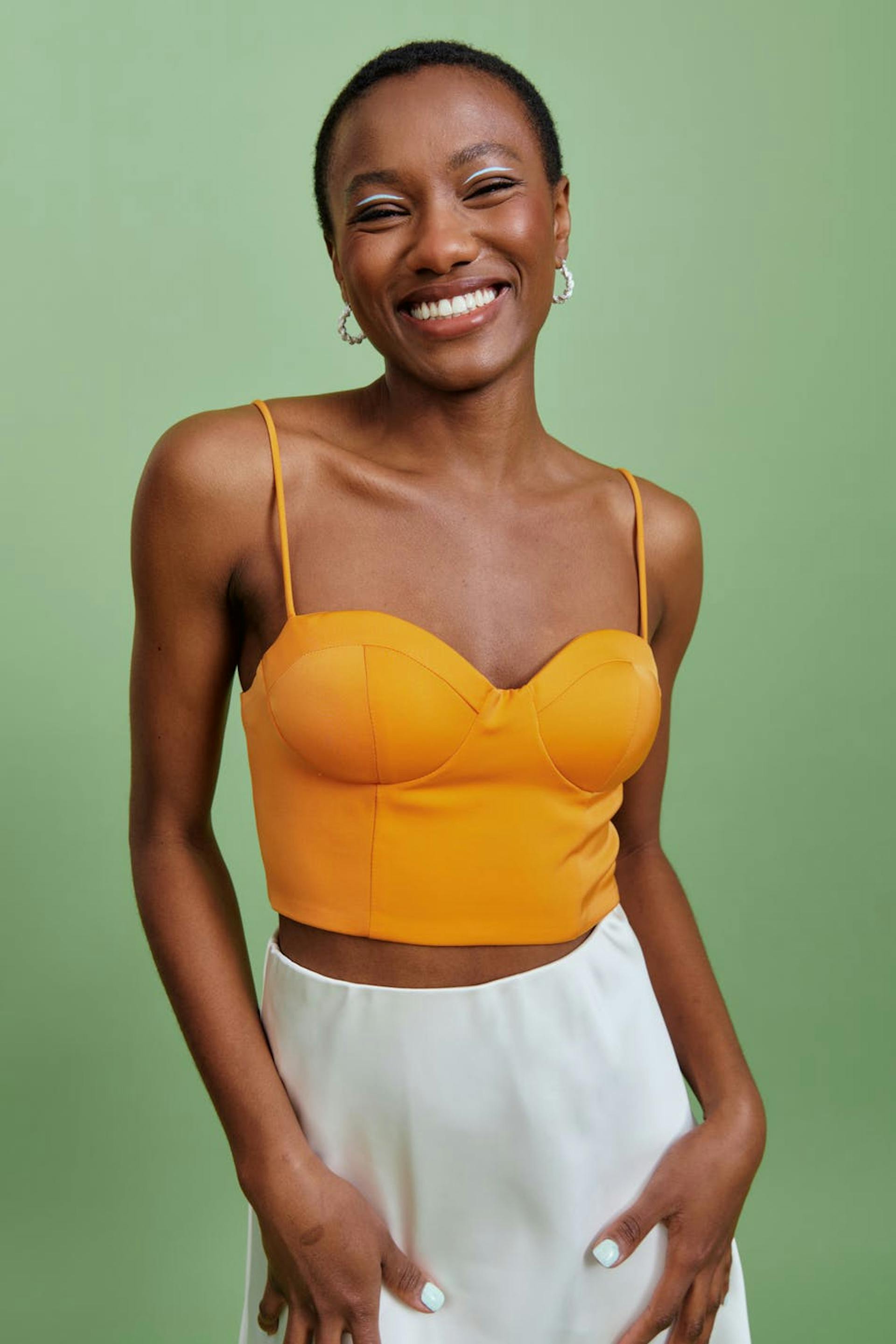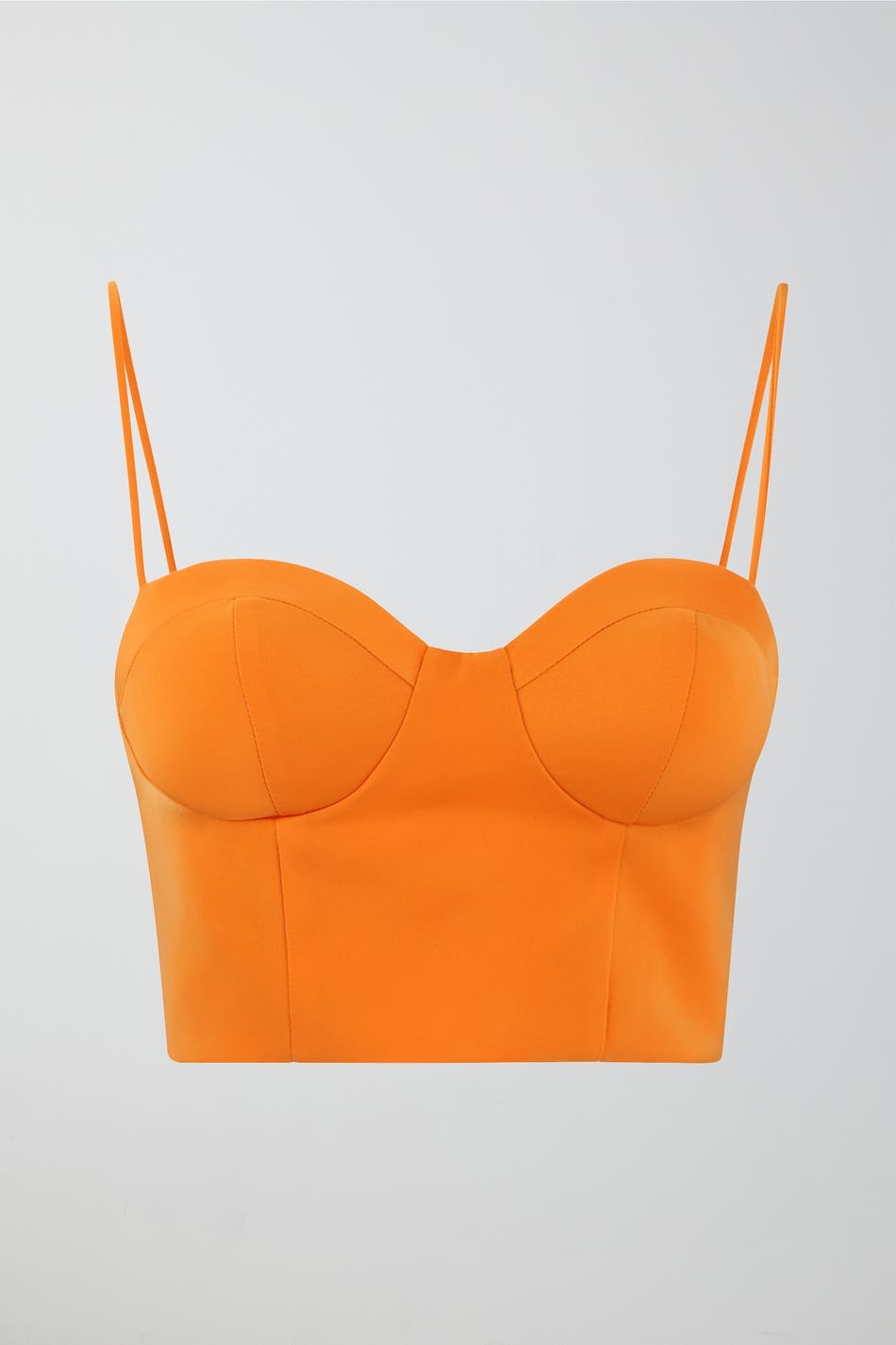 Vartalonmyötäinen bustier-toppi topatuilla kupeilla. Bustier-toppi on oranssi ja siinä on säädettävät nauhat. Siinä on nyöritys selässä.