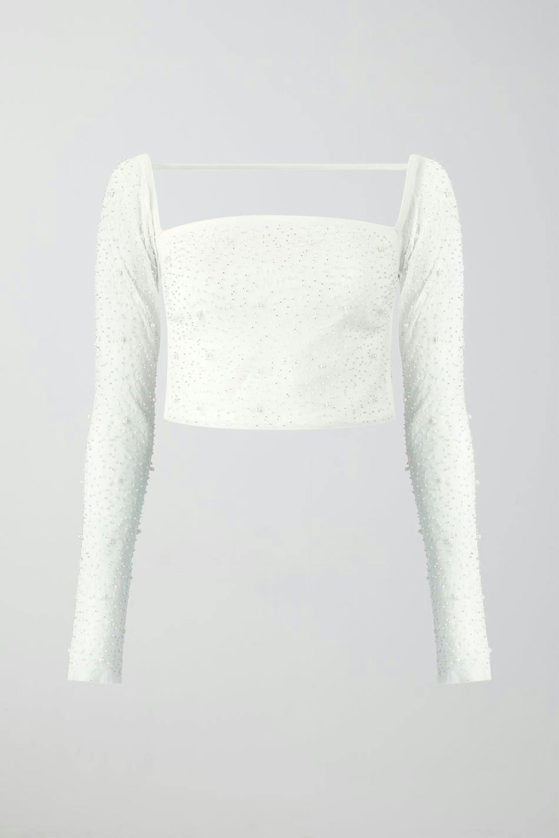 Pitkähihainen toppi helmillä. Toppi on täydellinen juhliin, valkoinen ja cropattu. Siinä on tyköistuva istuvuus, avonainen selkä, neliöpääntie ja läpikuultava hiha halkiolla.