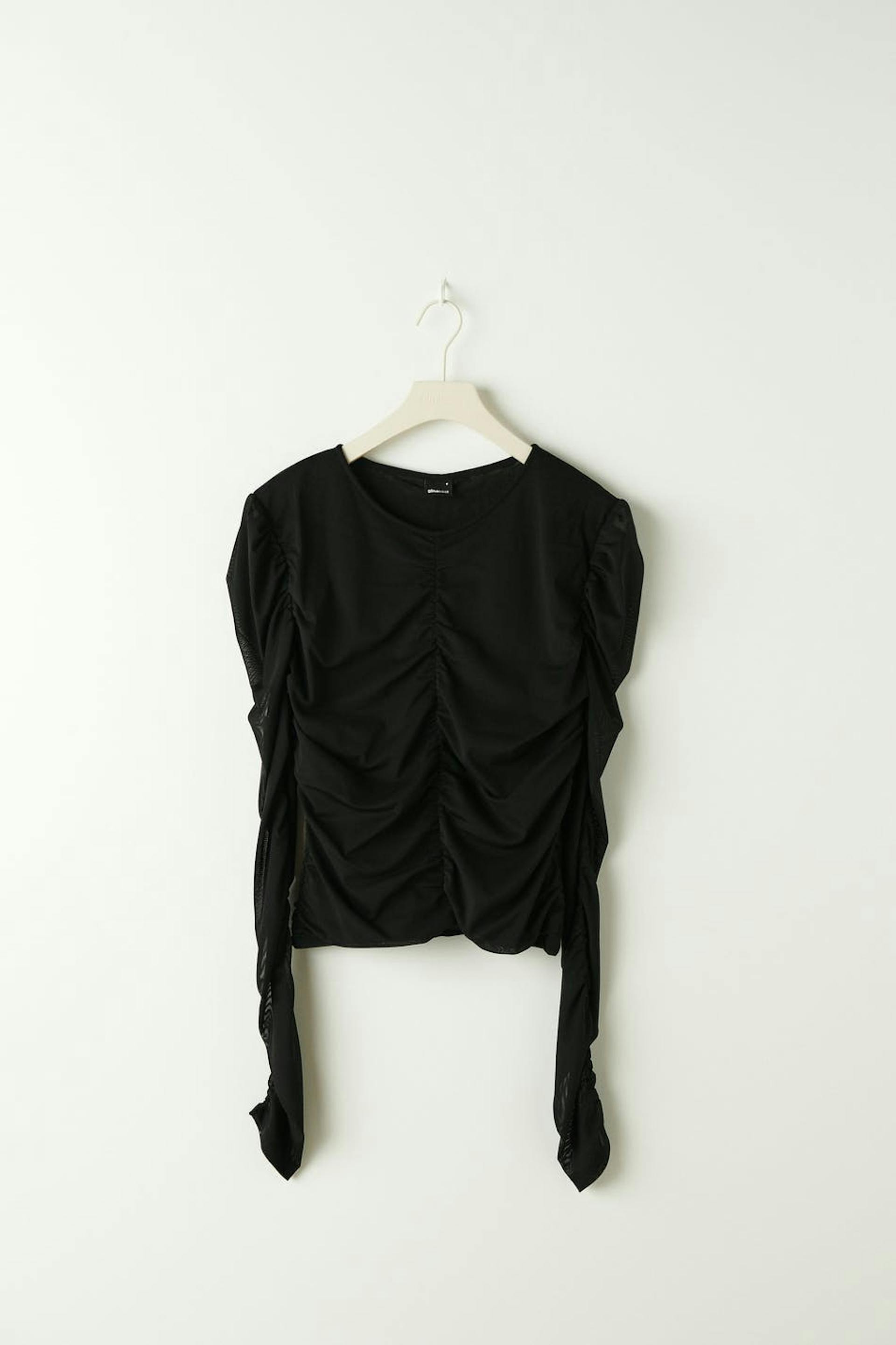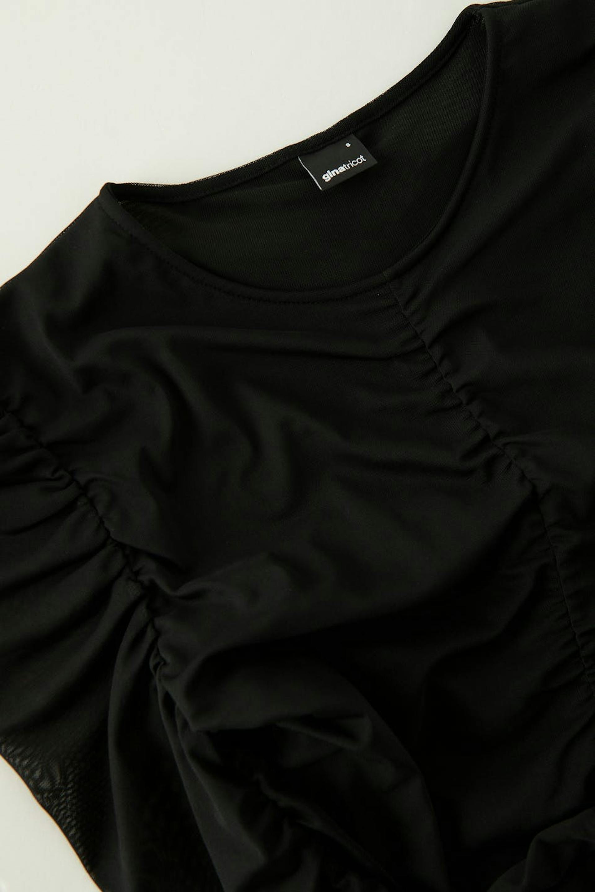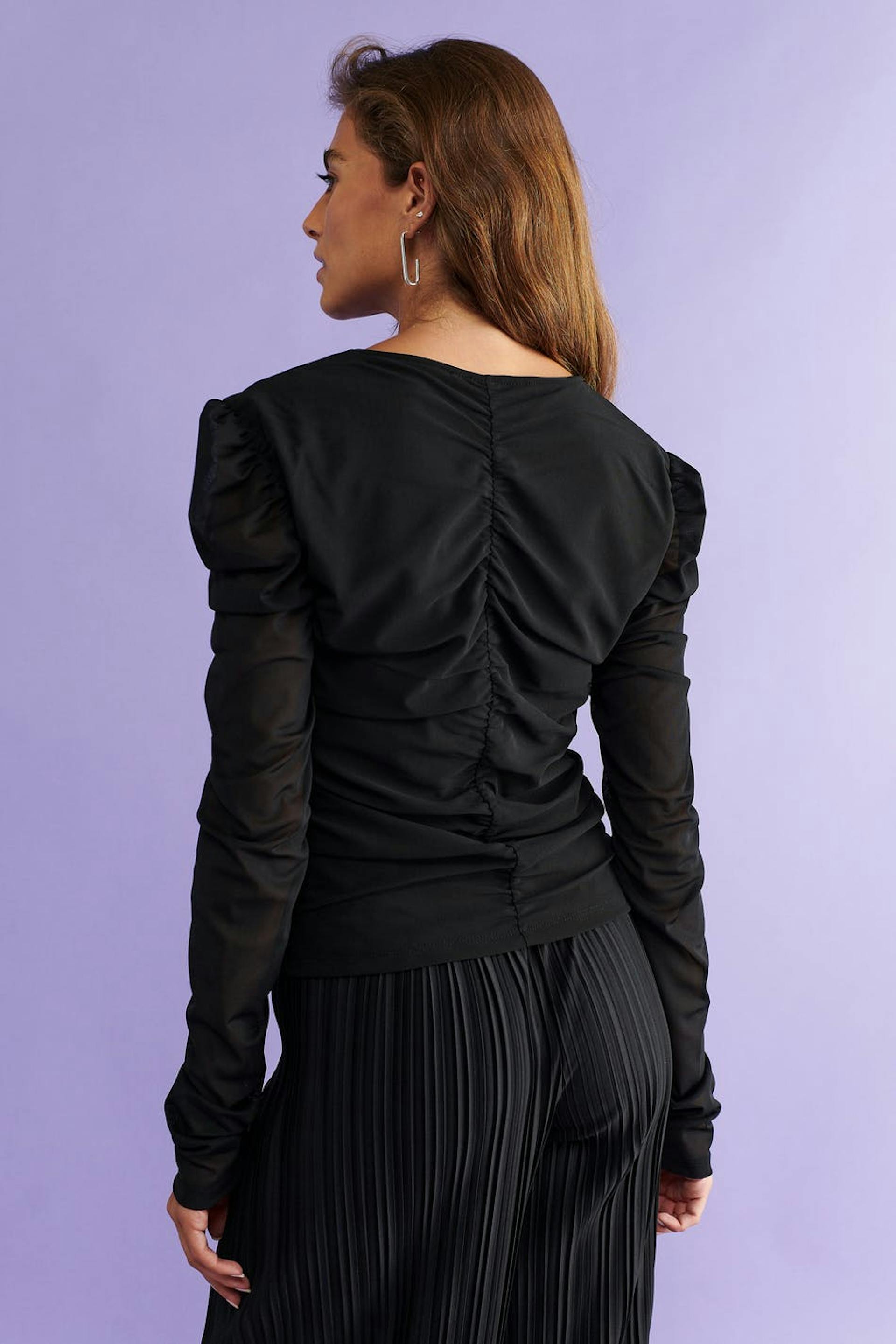 Verkkotoppi rypytystyylillä edessä ja takana. Toppi on musta ja siinä on vartalonmyötäinen istuvuus. Siinä on pitkät puhvihihat ja pyöristetty kaula-aukko.