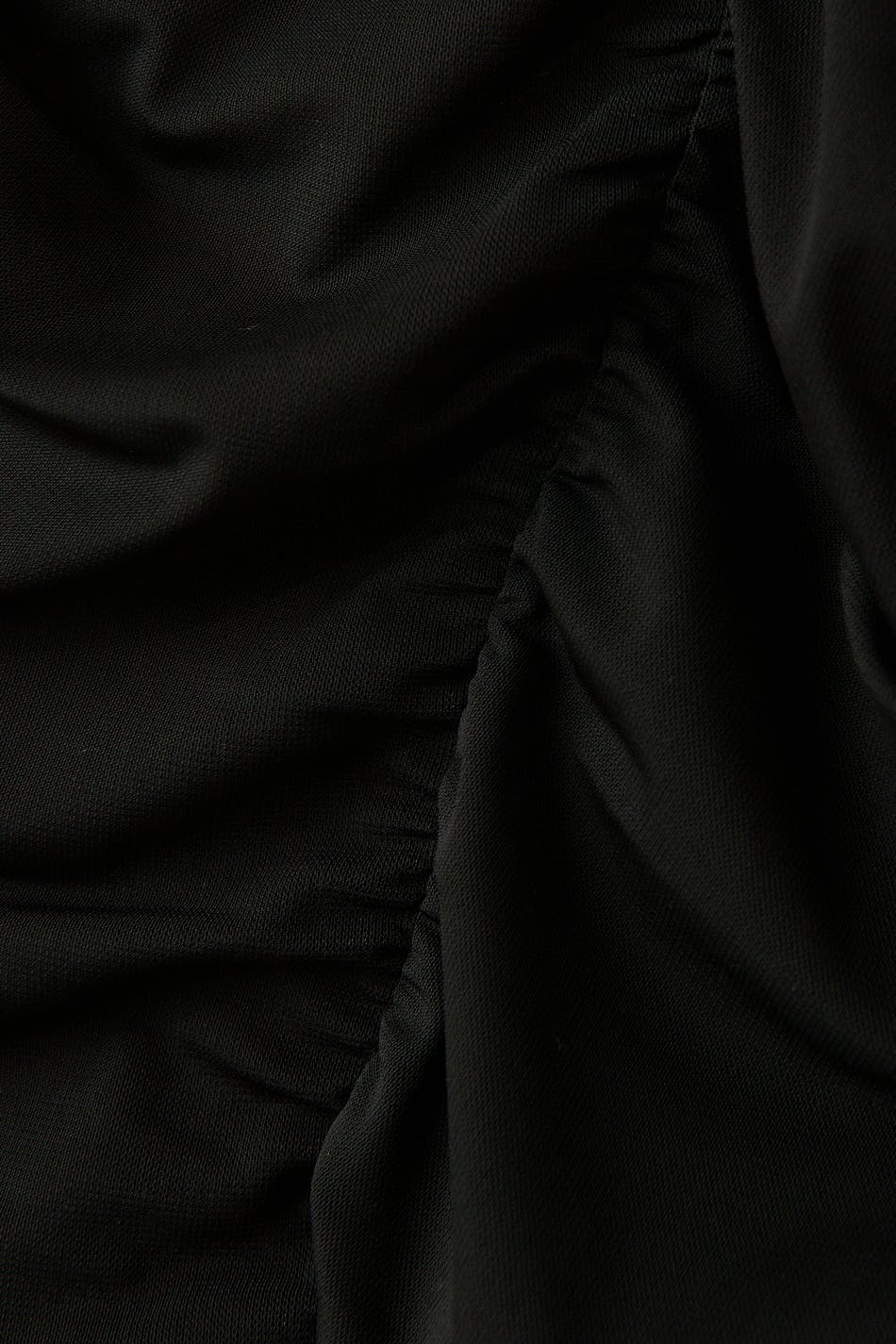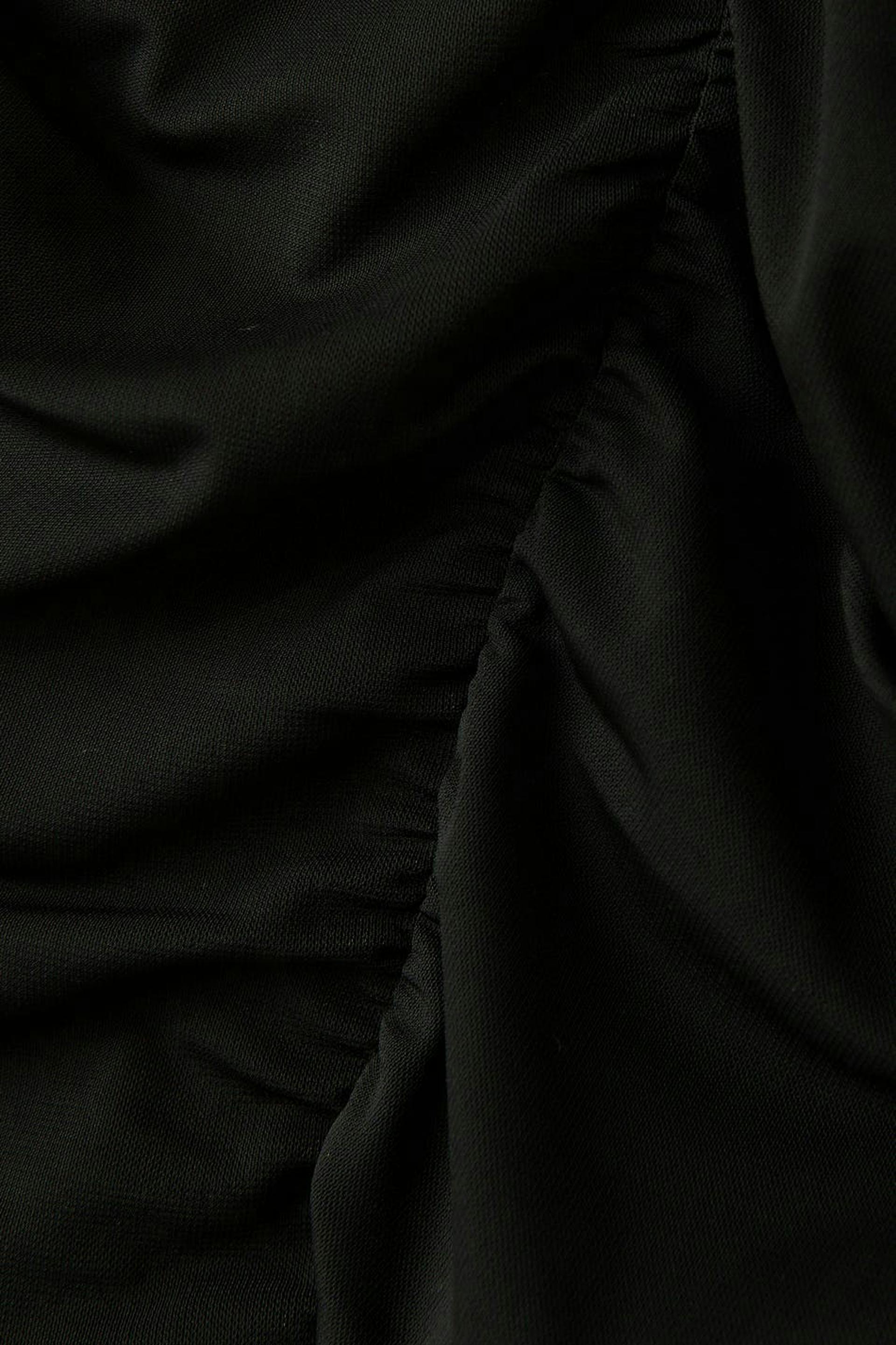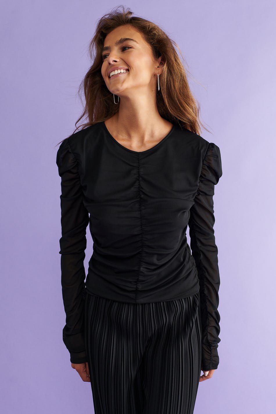 Verkkotoppi rypytystyylillä edessä ja takana. Toppi on musta ja siinä on vartalonmyötäinen istuvuus. Siinä on pitkät puhvihihat ja pyöristetty kaula-aukko.
