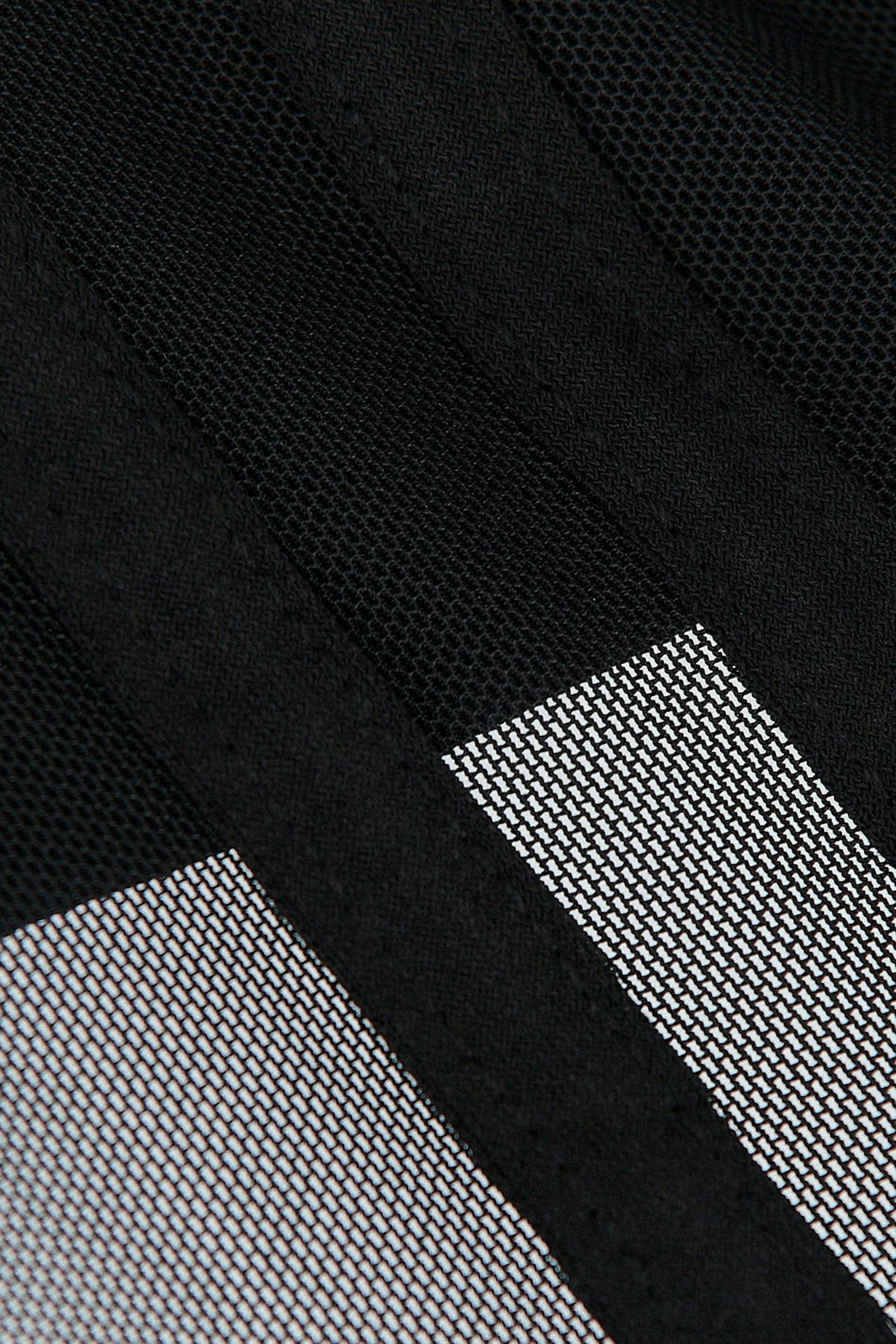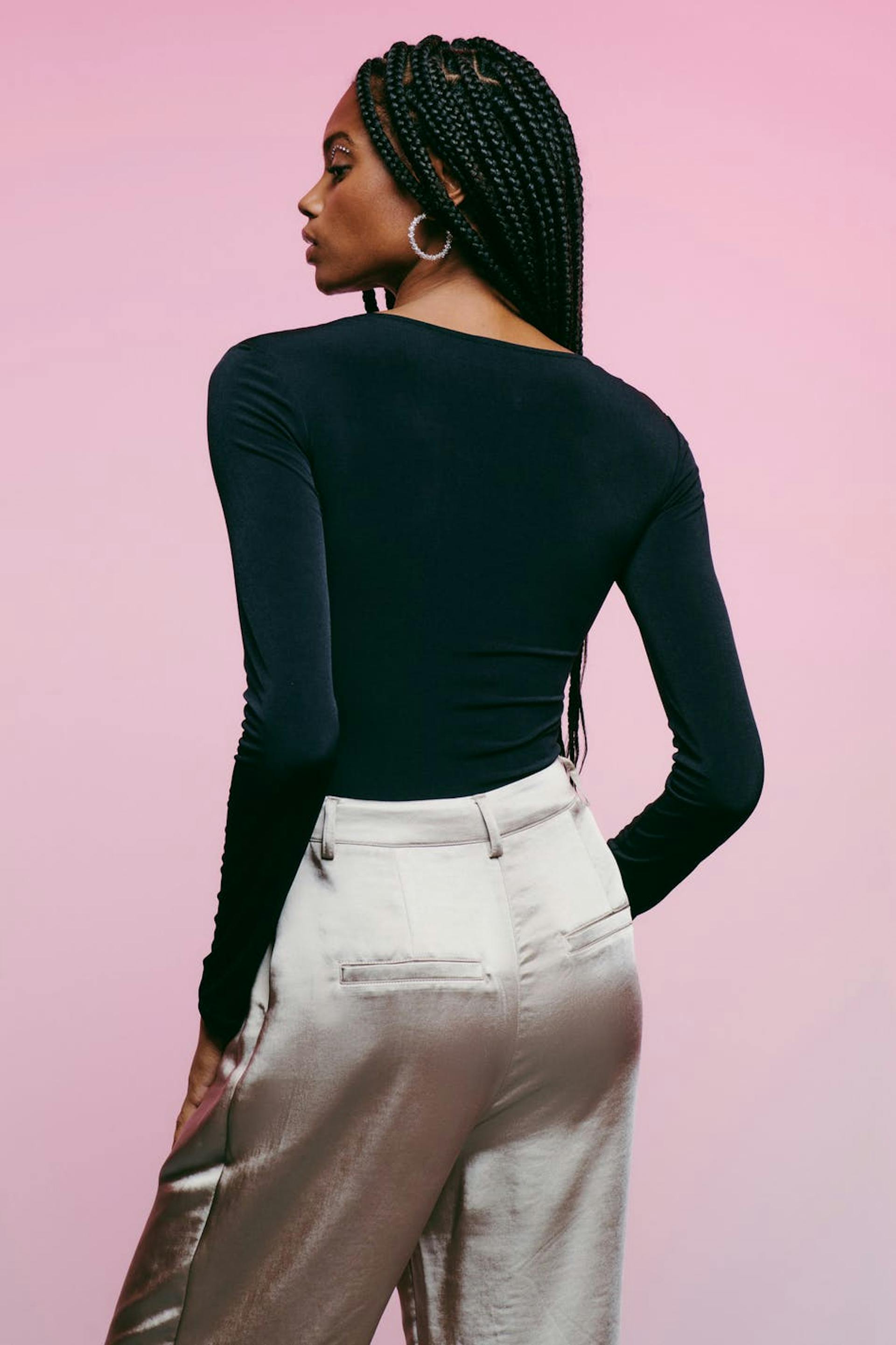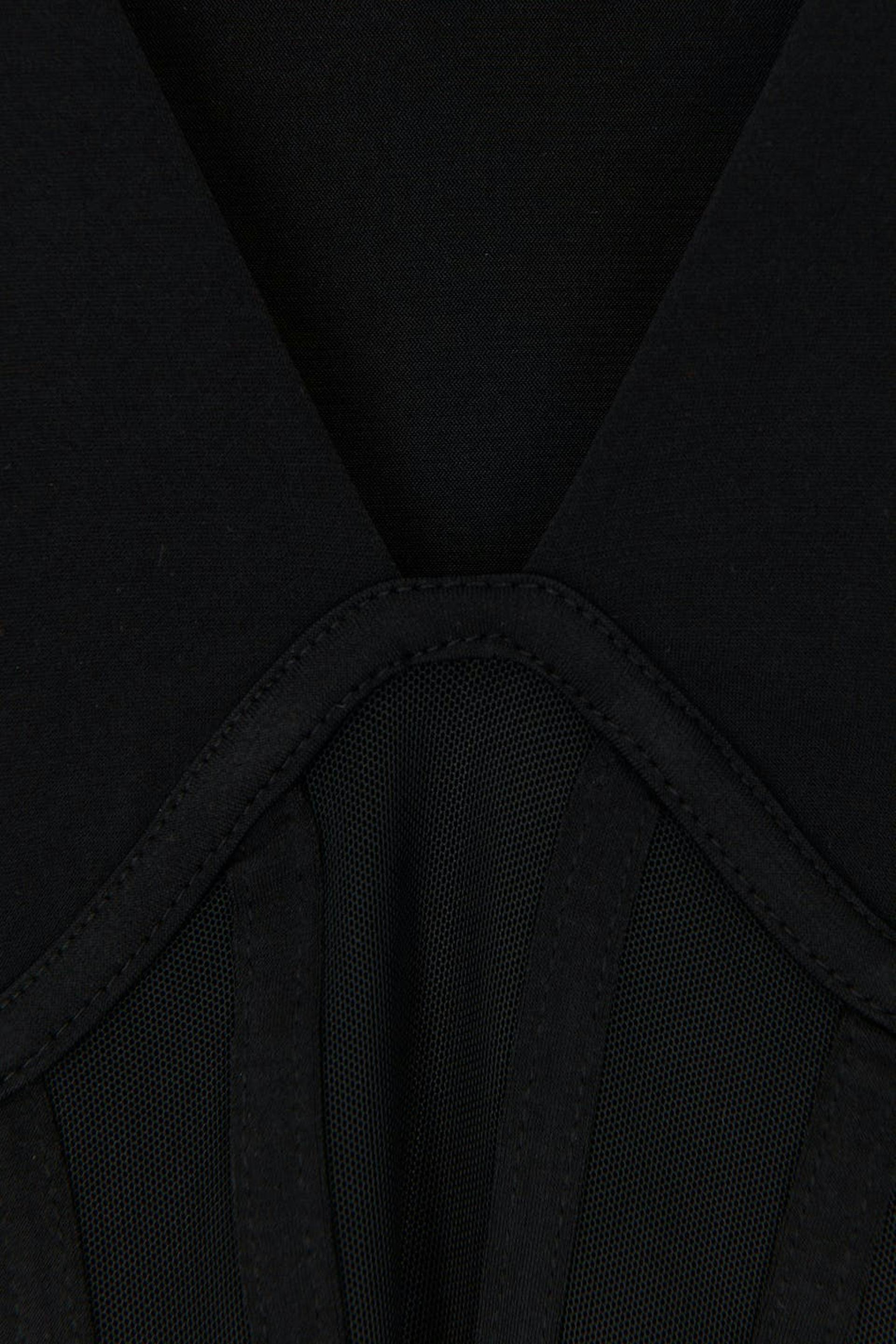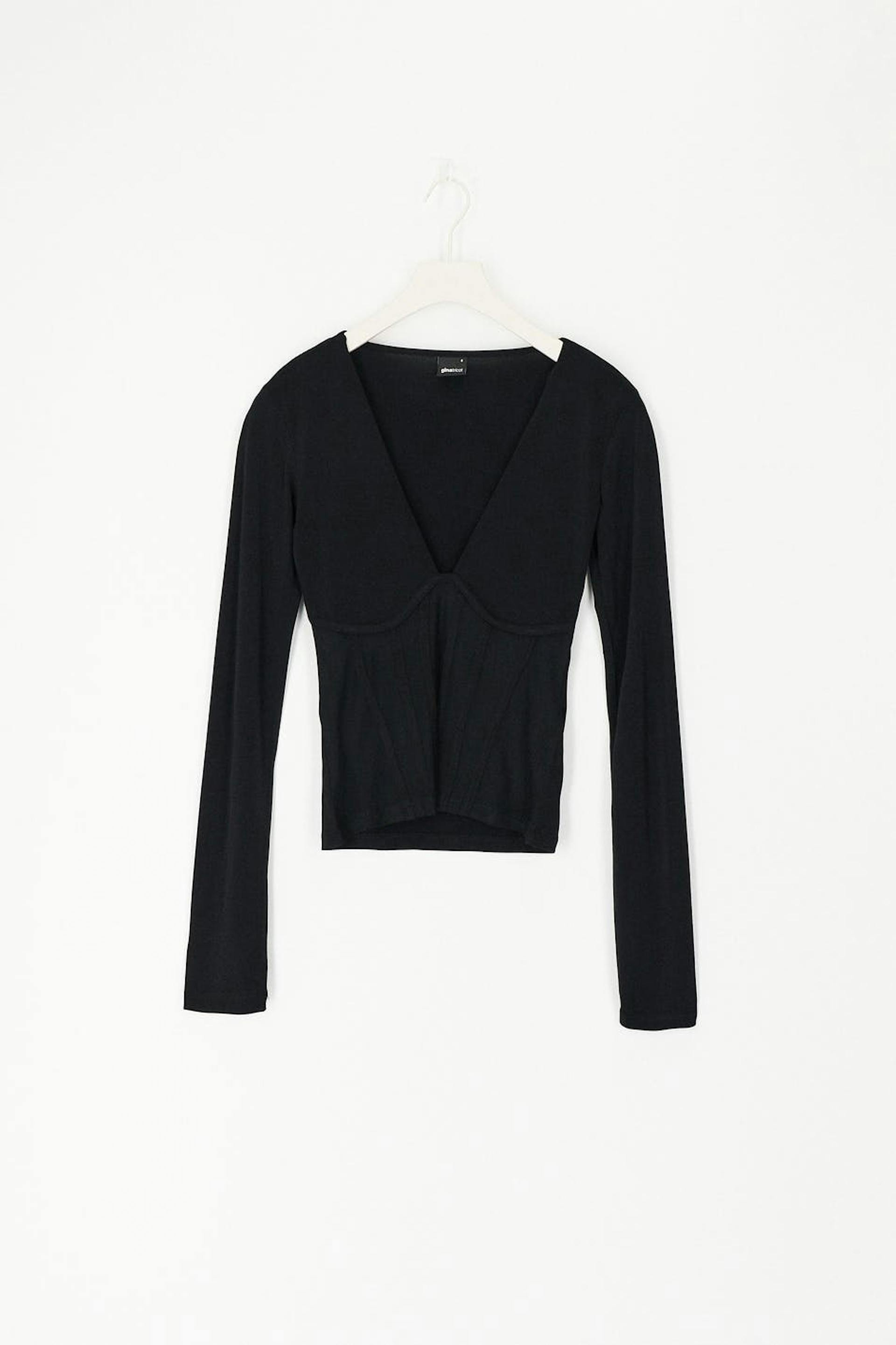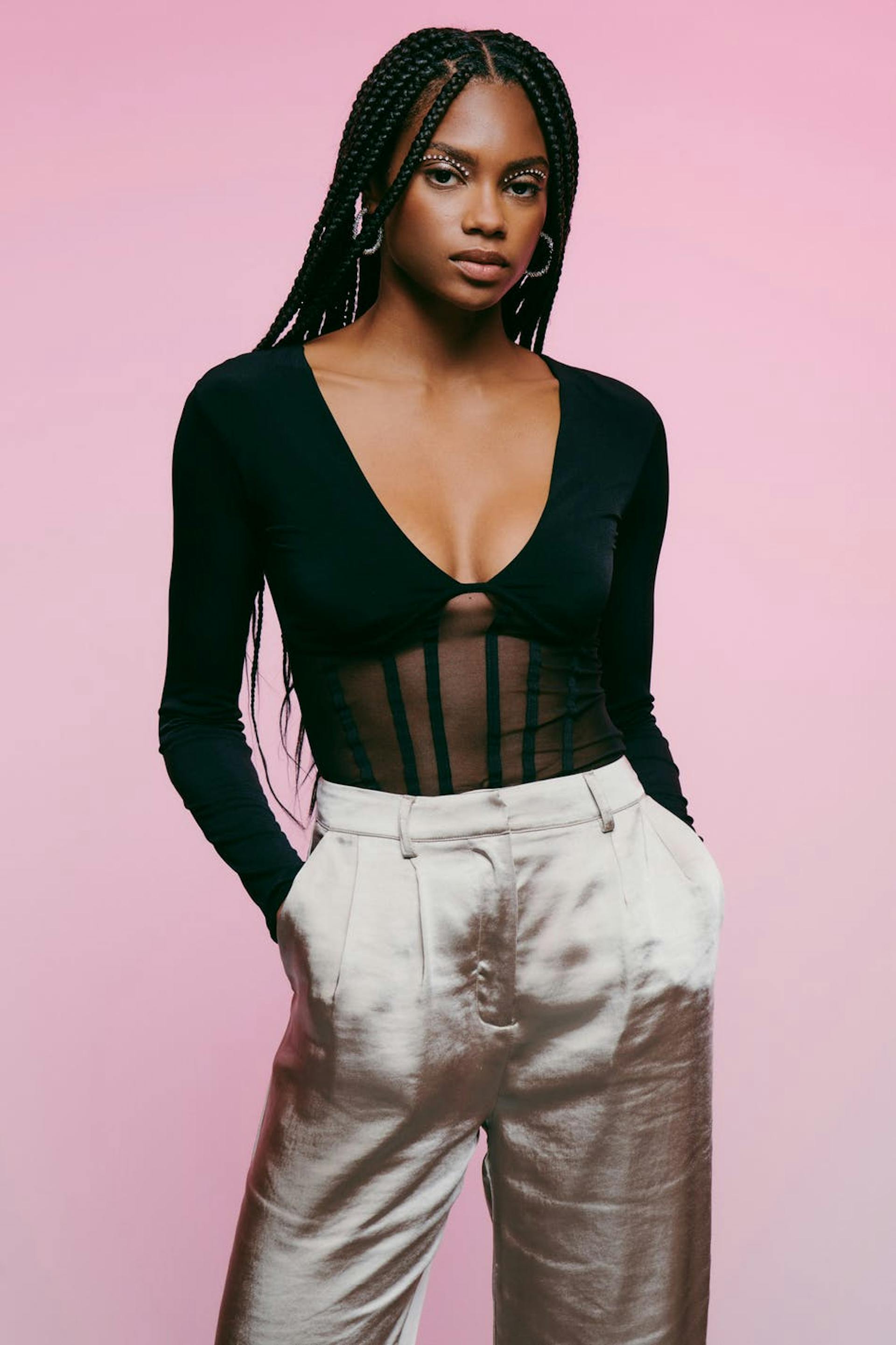 Pitkähihainen toppi mesh-yksityiskohdalla edessä. Toppi on musta ja siinä on vartalonmyötäinen istuvuus. Siinä on v-pääntie ja koristeellinen saumayksityiskohta rintojen alapuolella.