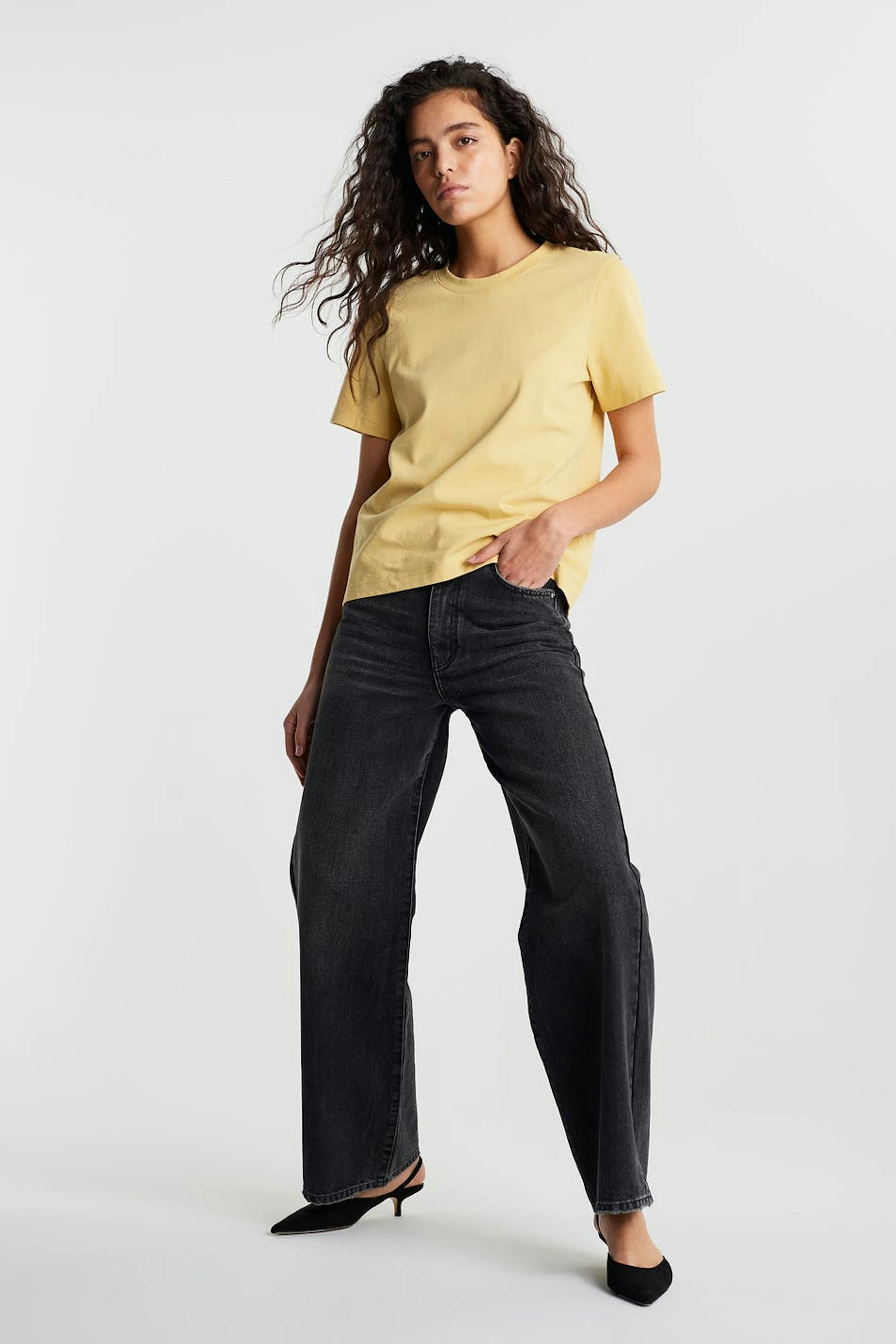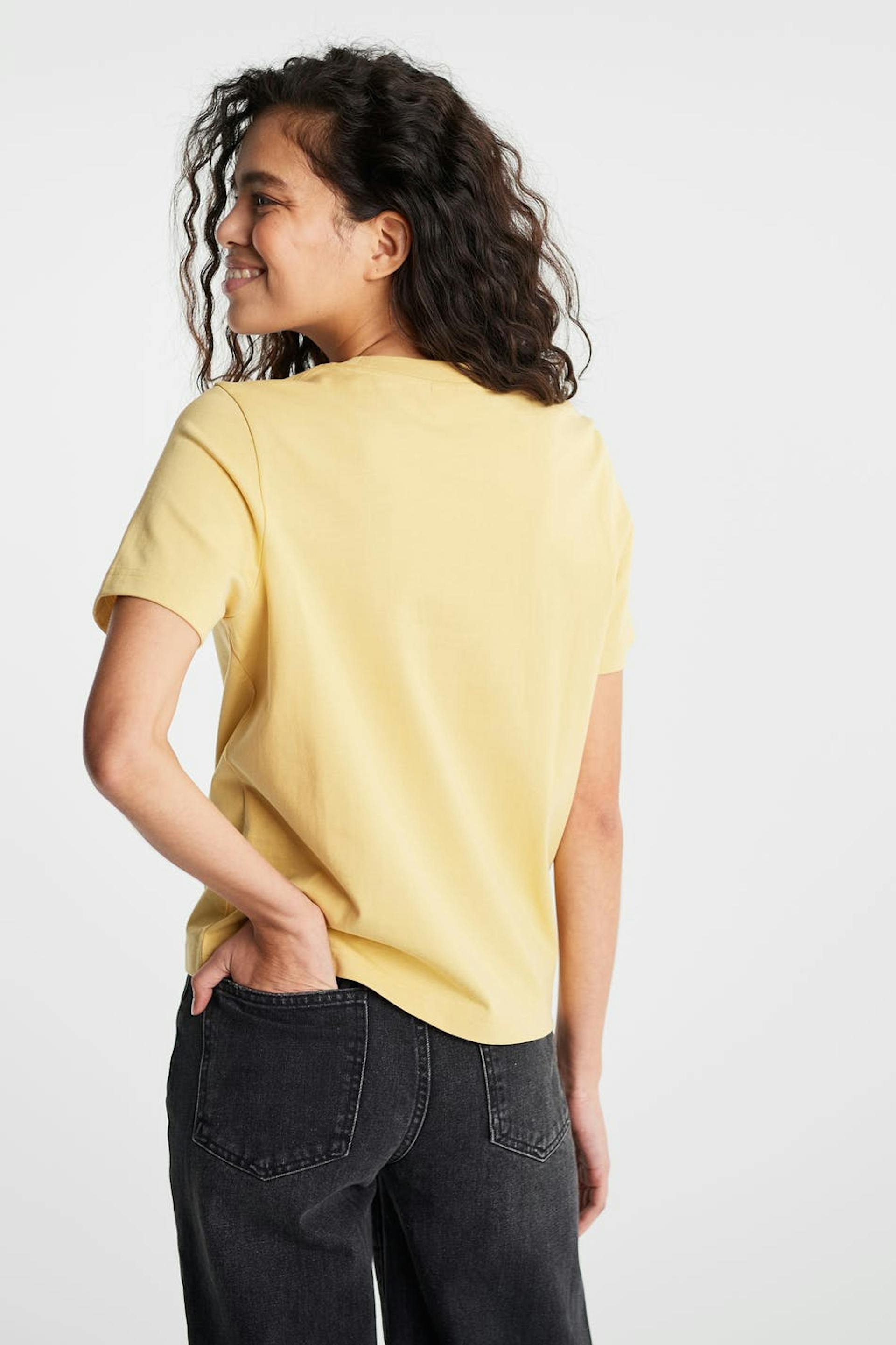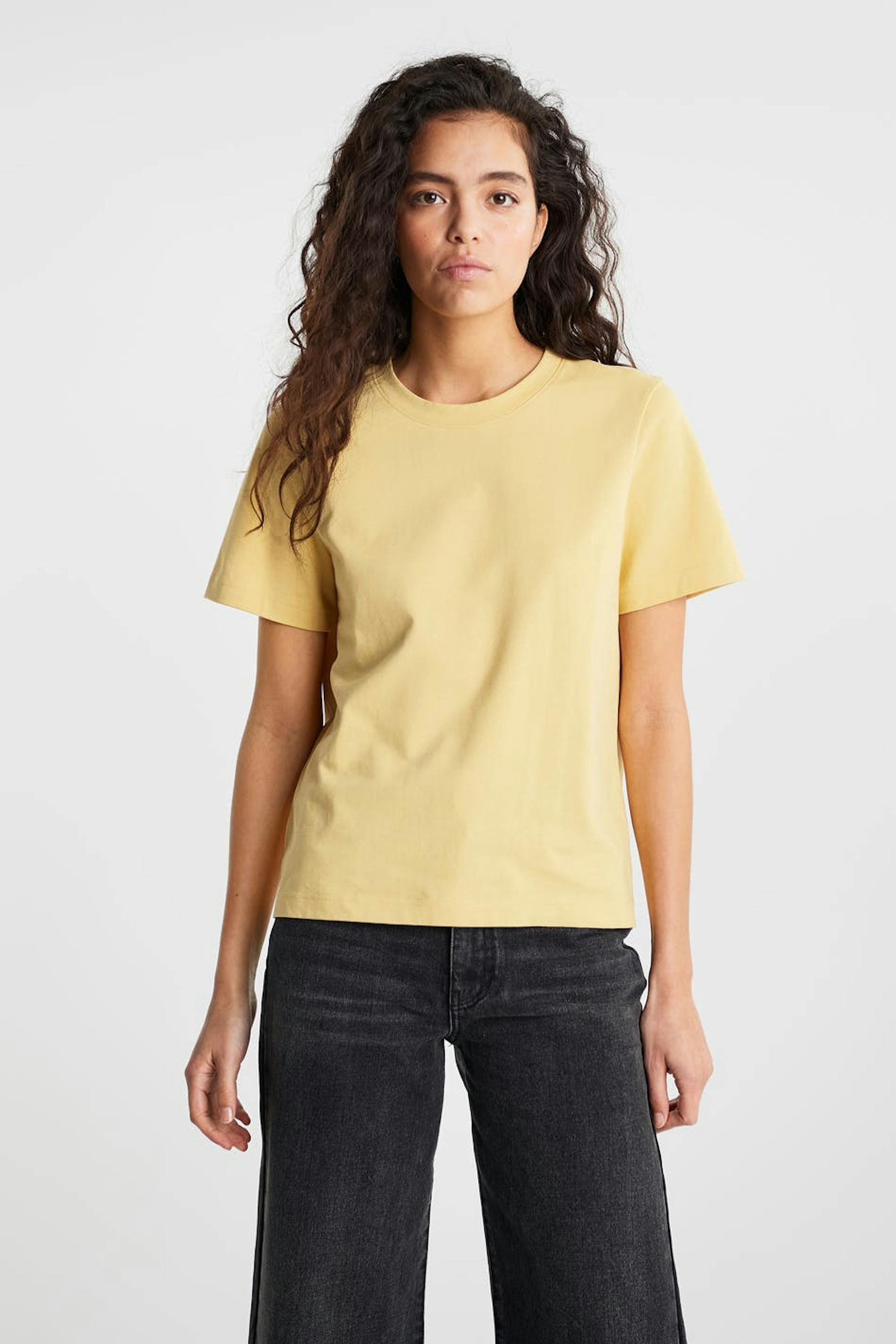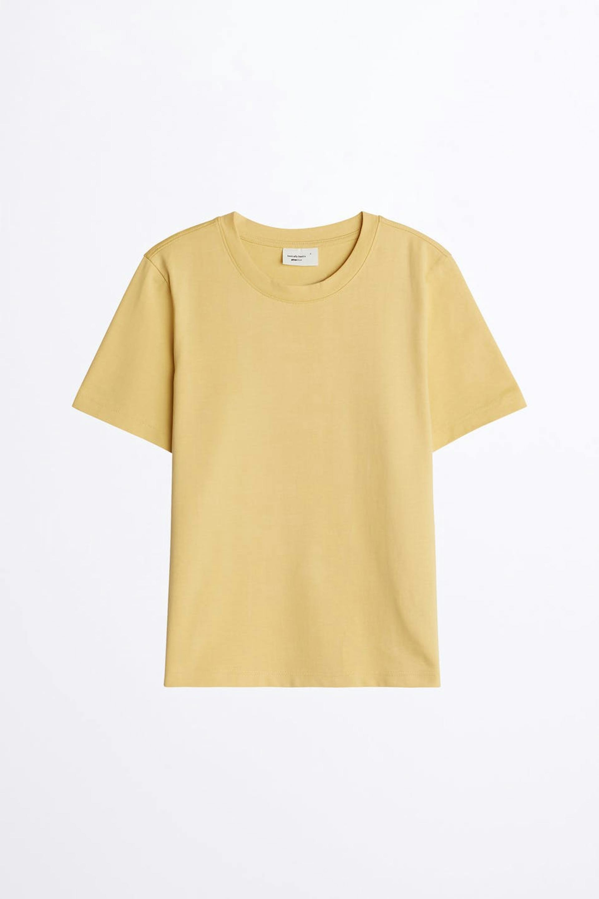 T-paita suoralla mallilla. T-paita on keltainen ja siinä on korkea kaula-aukko. Se valmistetaan trikoosta.