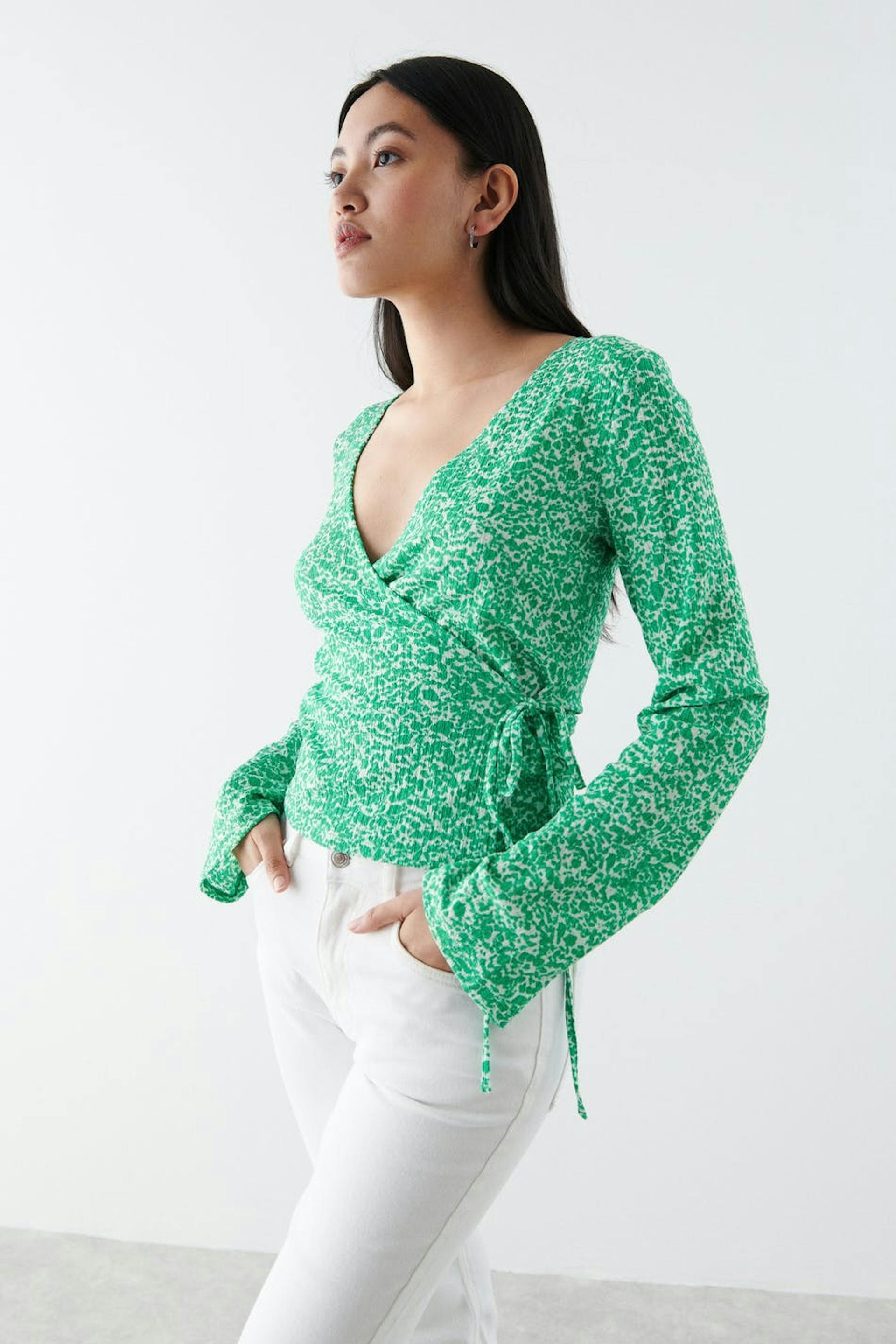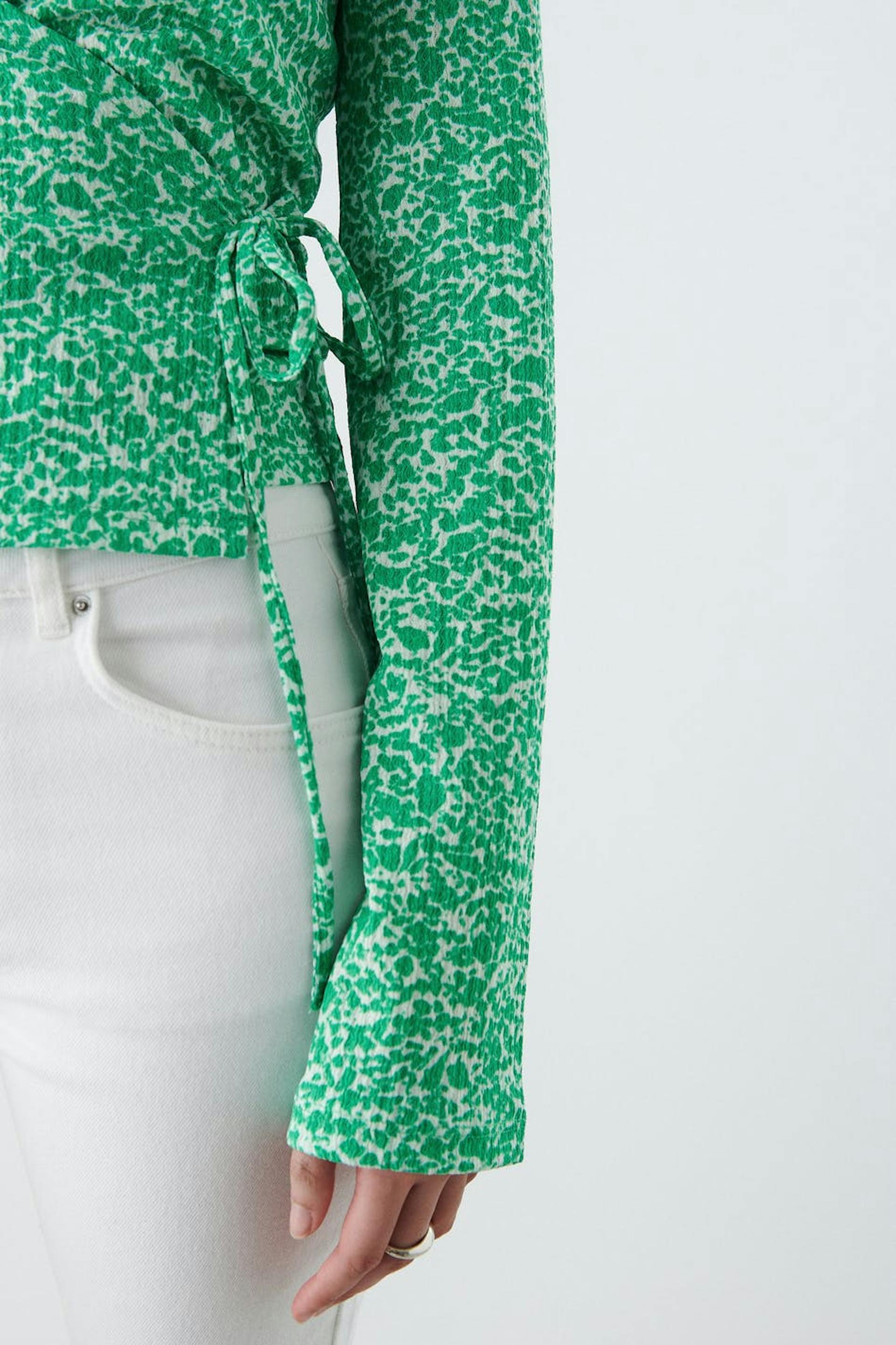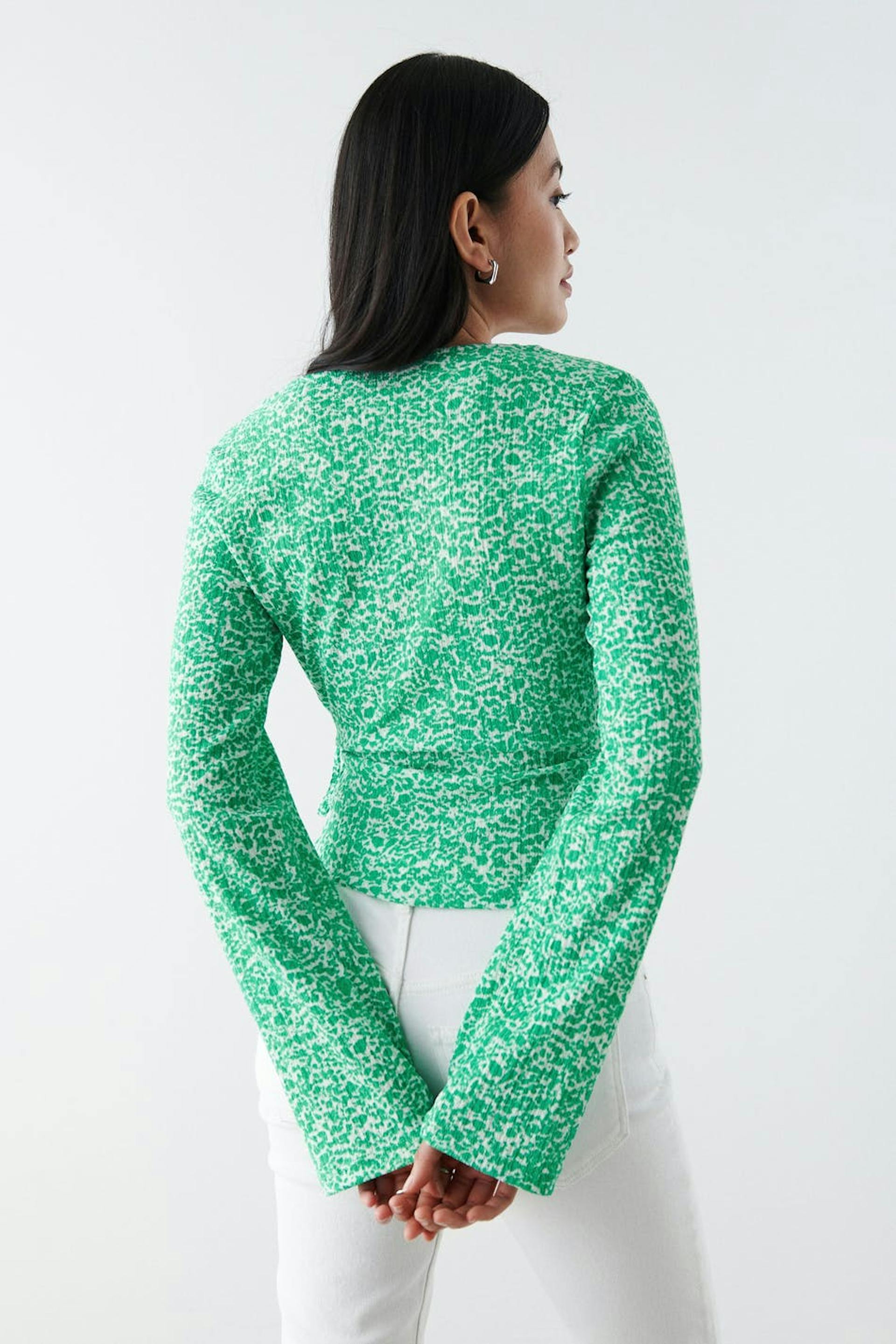 Pitkähihainen kietaisutoppi solmittavalla vyöllä sivulla. Toppi on vihreä ja siinä on v-pääntie. Siinä on rakennemateriaali trikoosta.