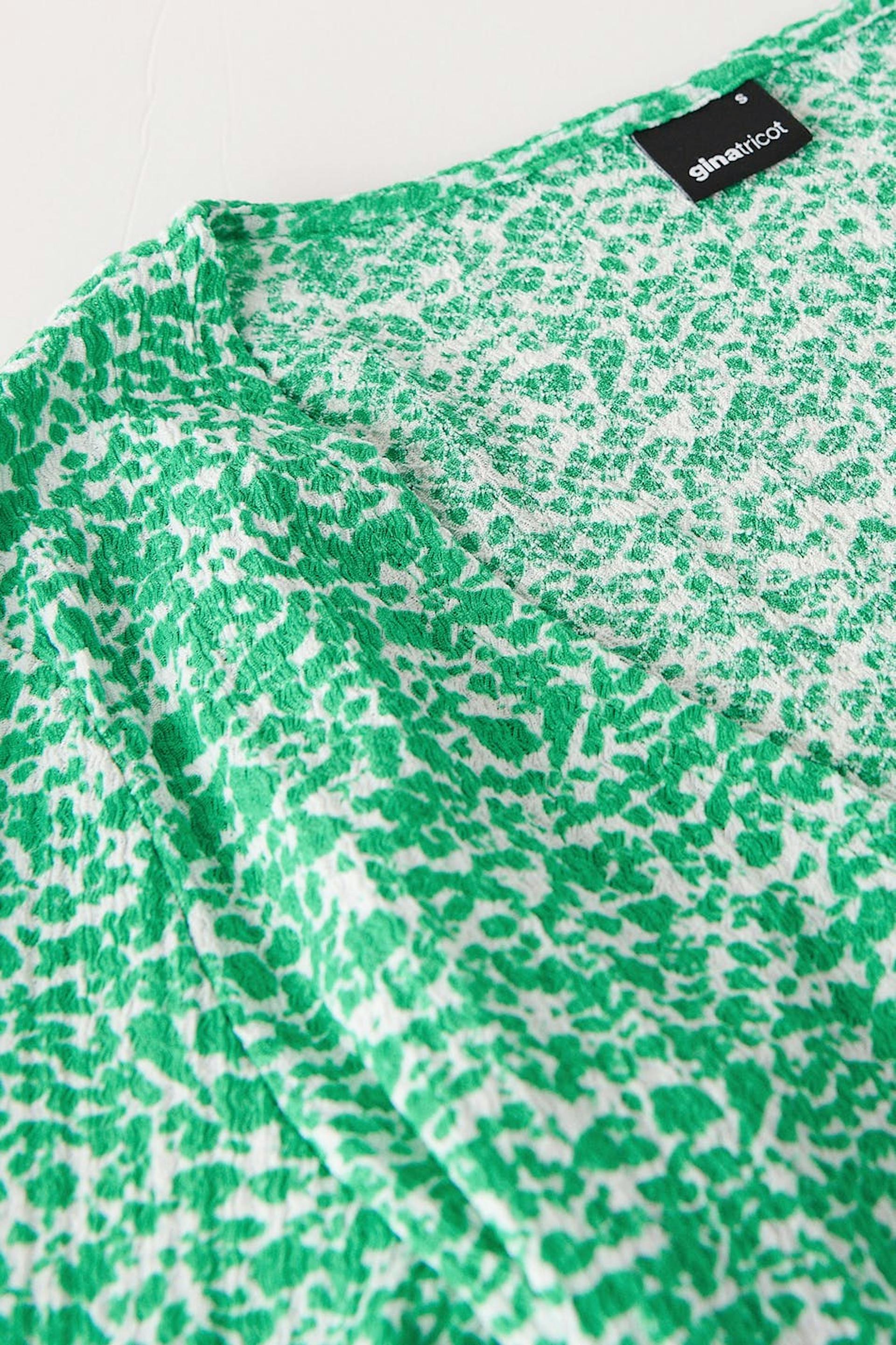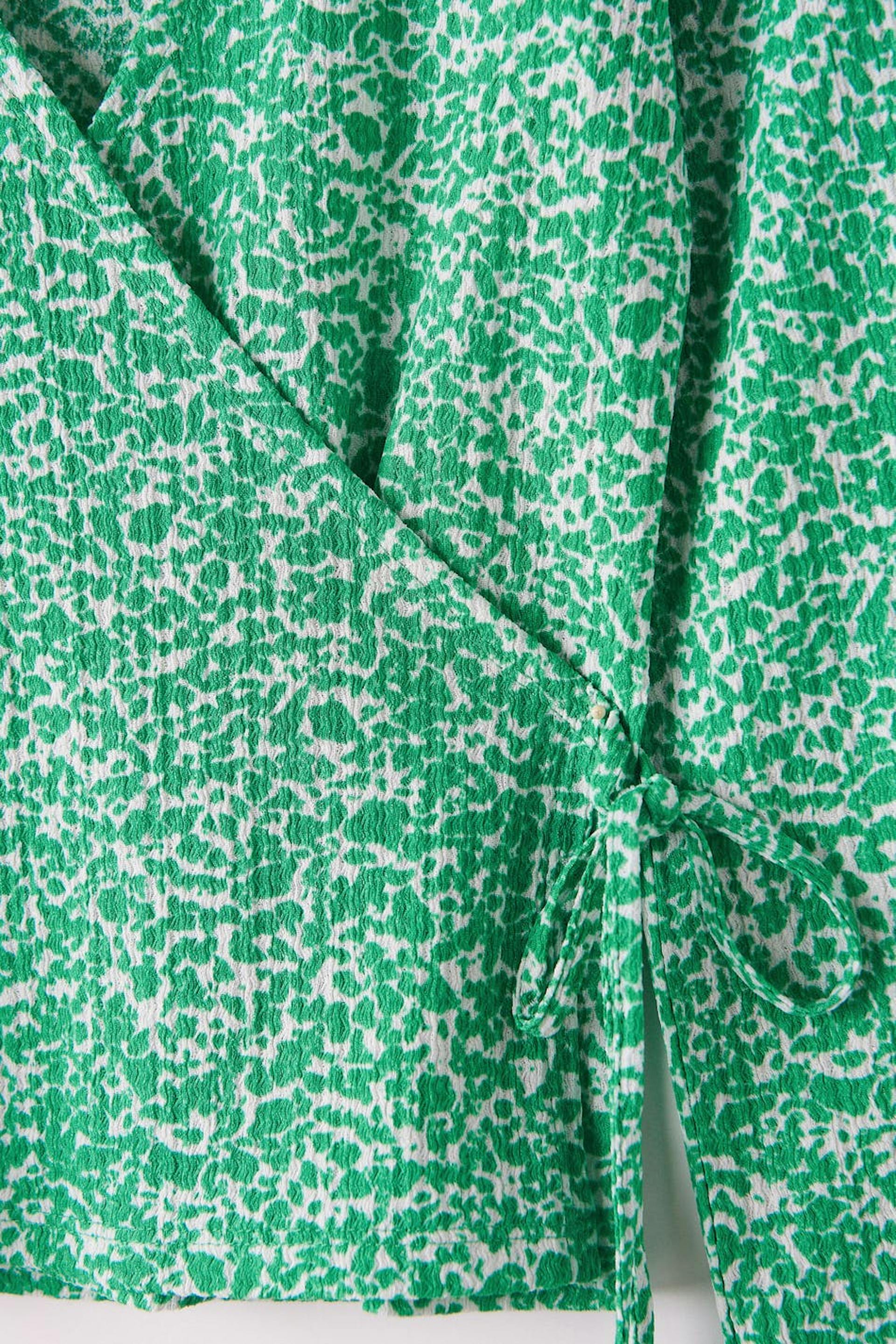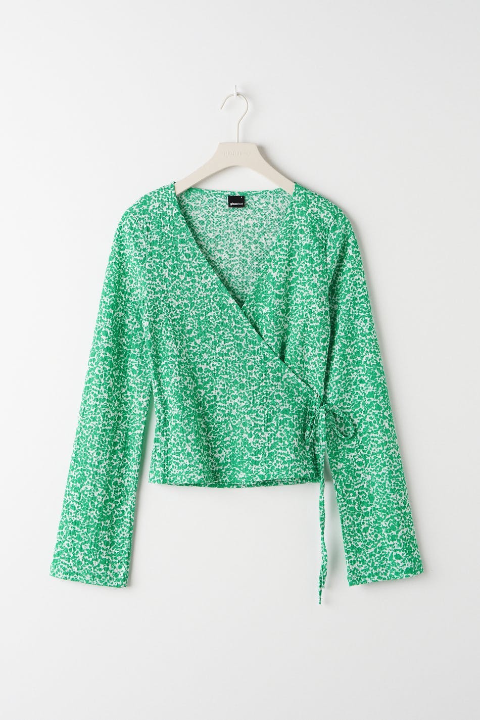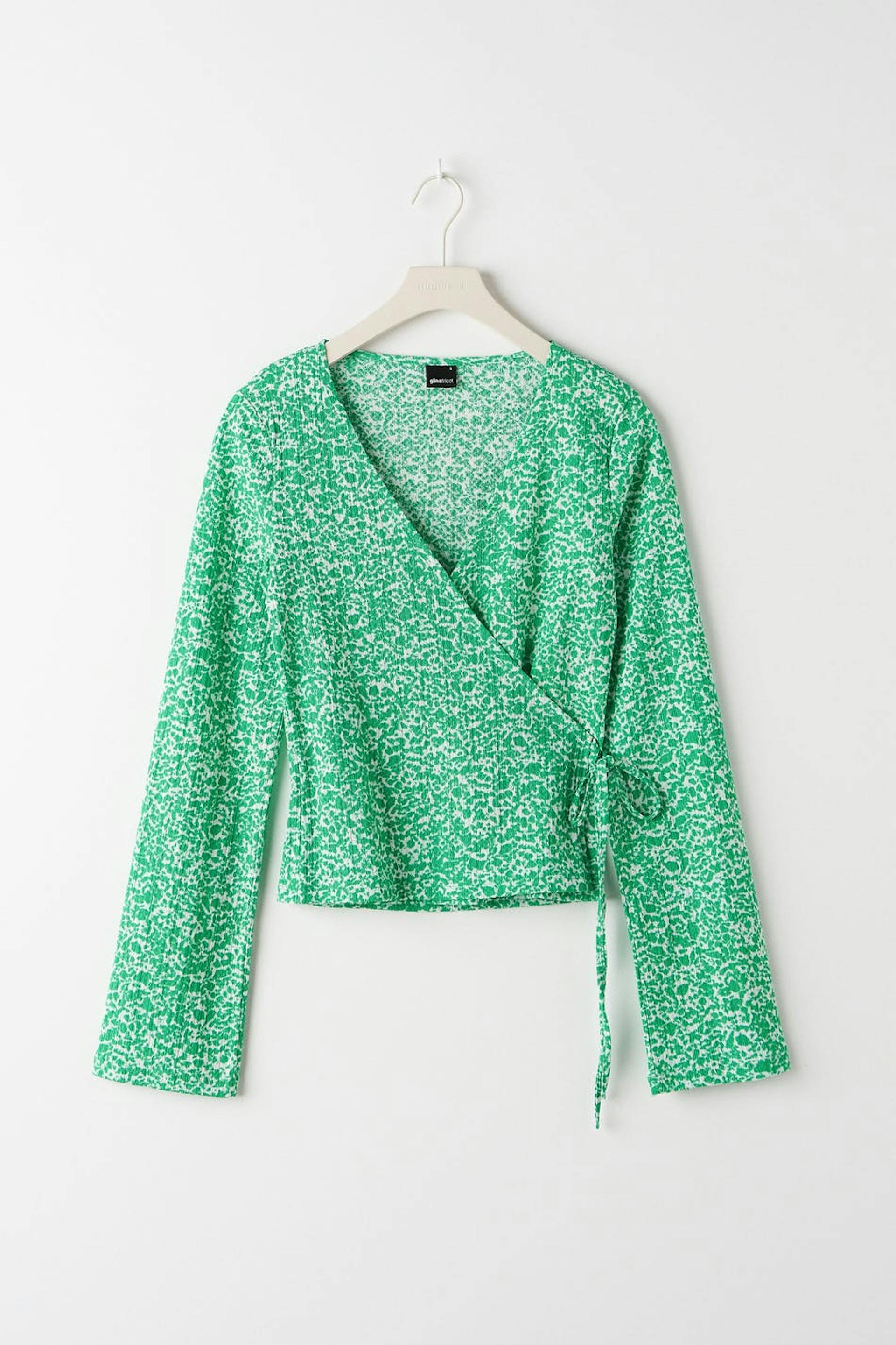 Pitkähihainen kietaisutoppi solmittavalla vyöllä sivulla. Toppi on vihreä ja siinä on v-pääntie. Siinä on rakennemateriaali trikoosta.