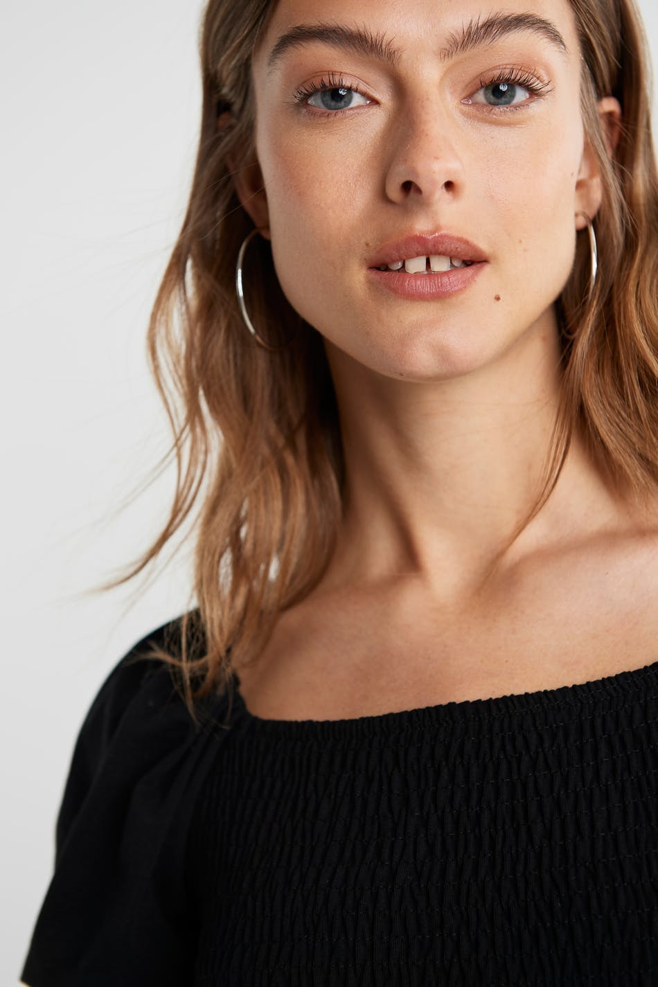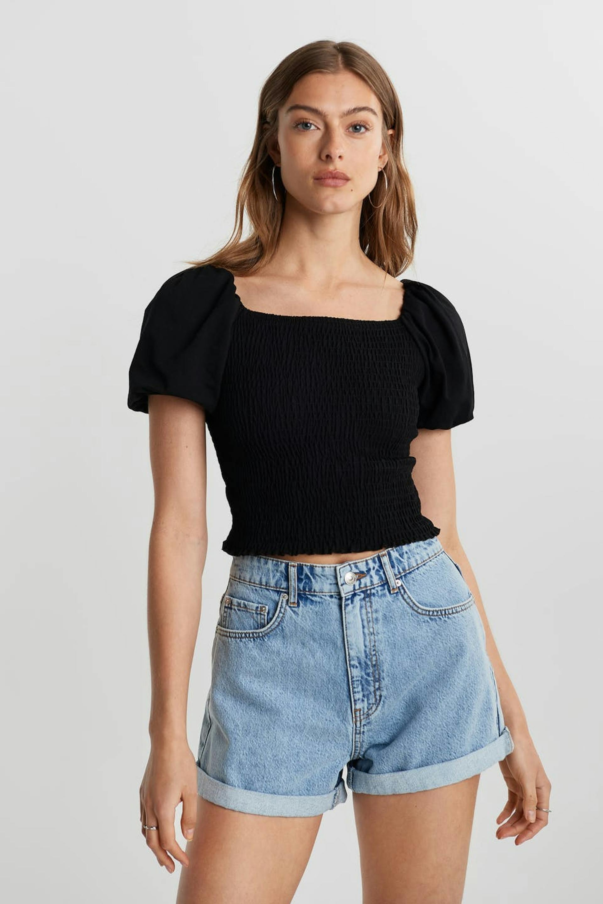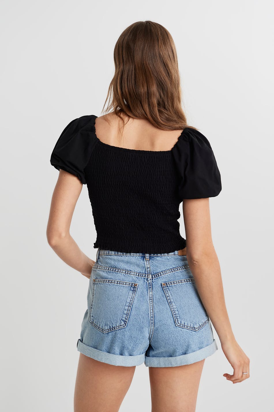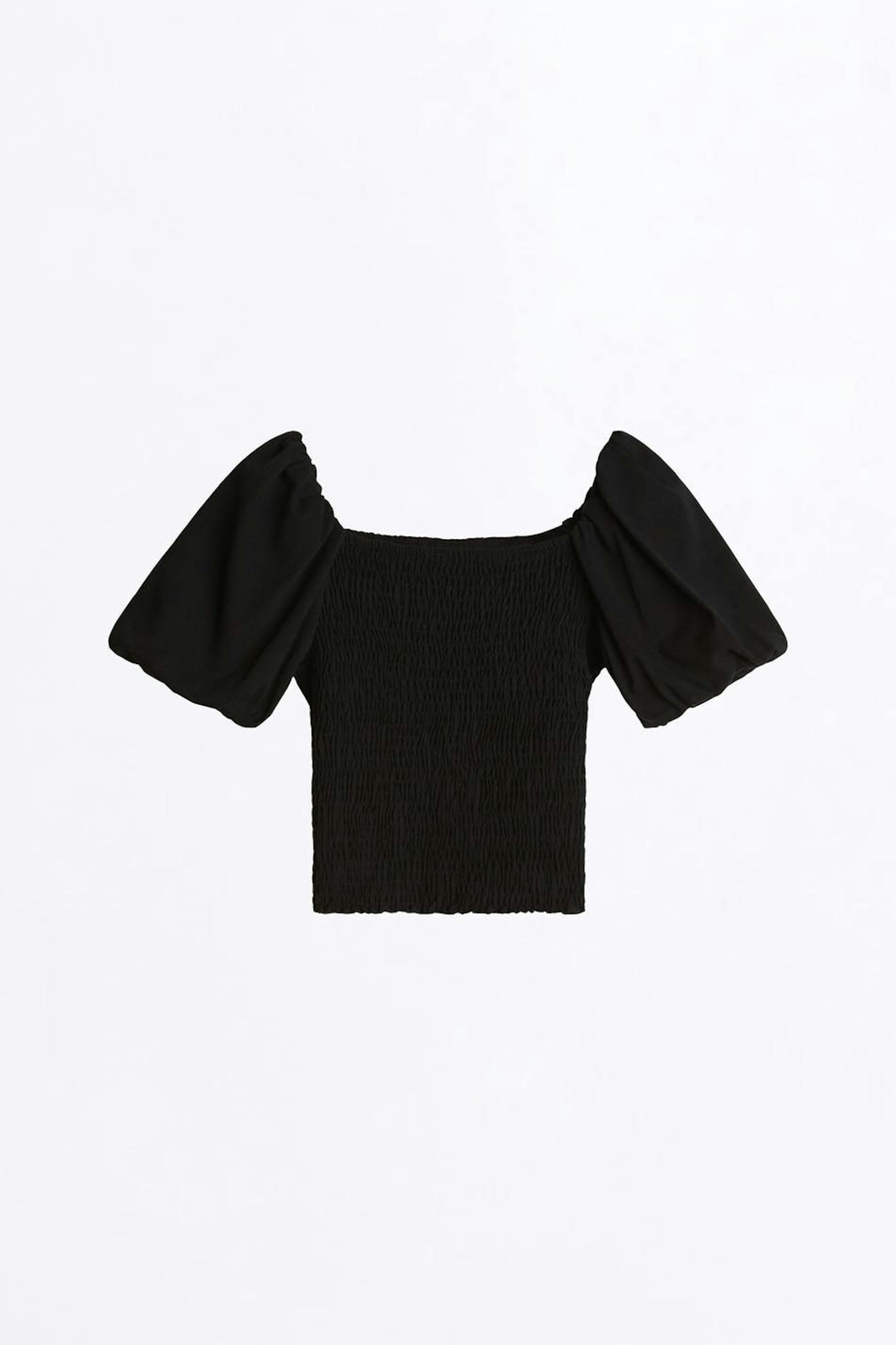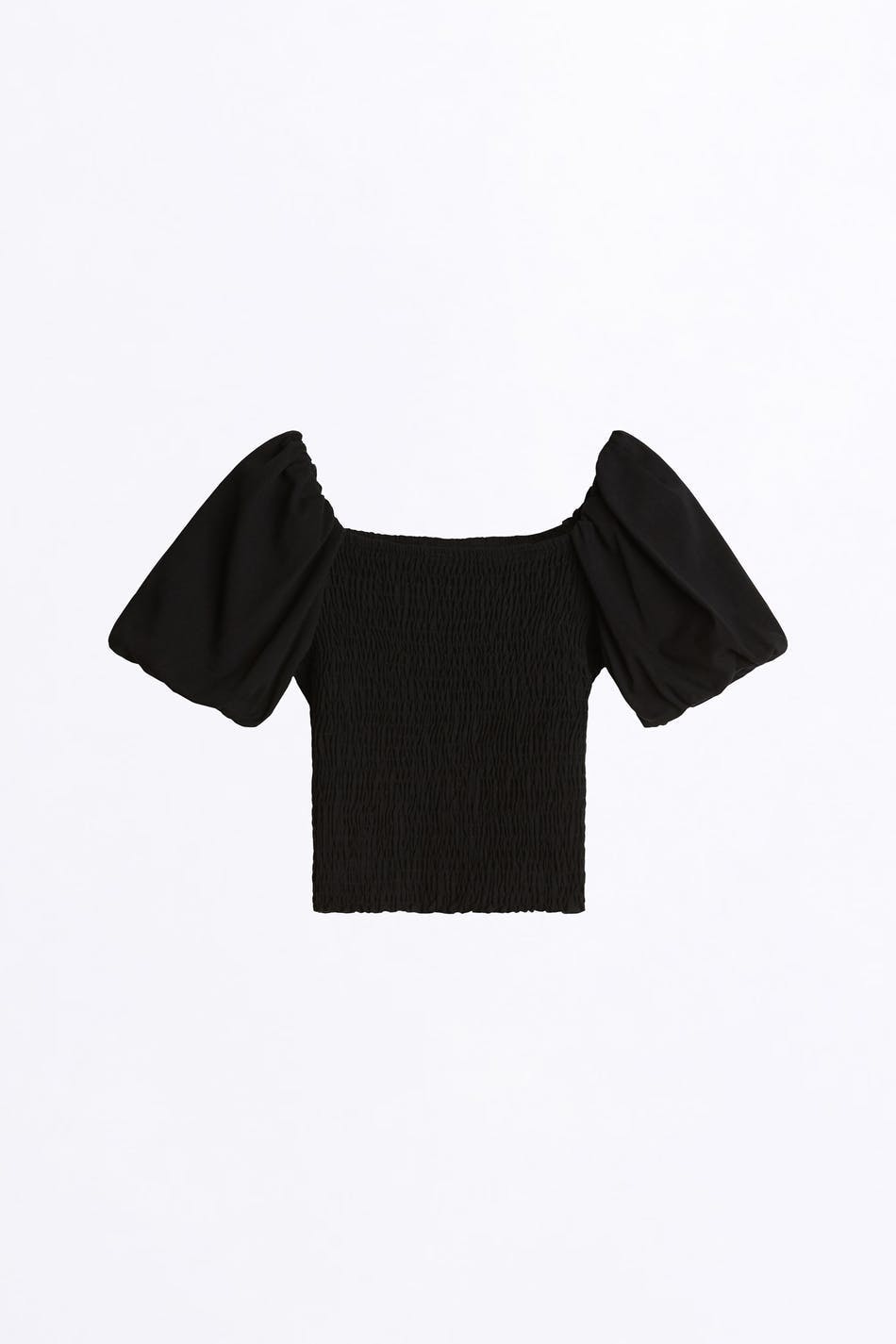 Laskostettu toppi vartalonmyötäisellä istuvuudella. Toppi on musta ja siinä on lyhyt, vuorattu puff sleeve-paita.