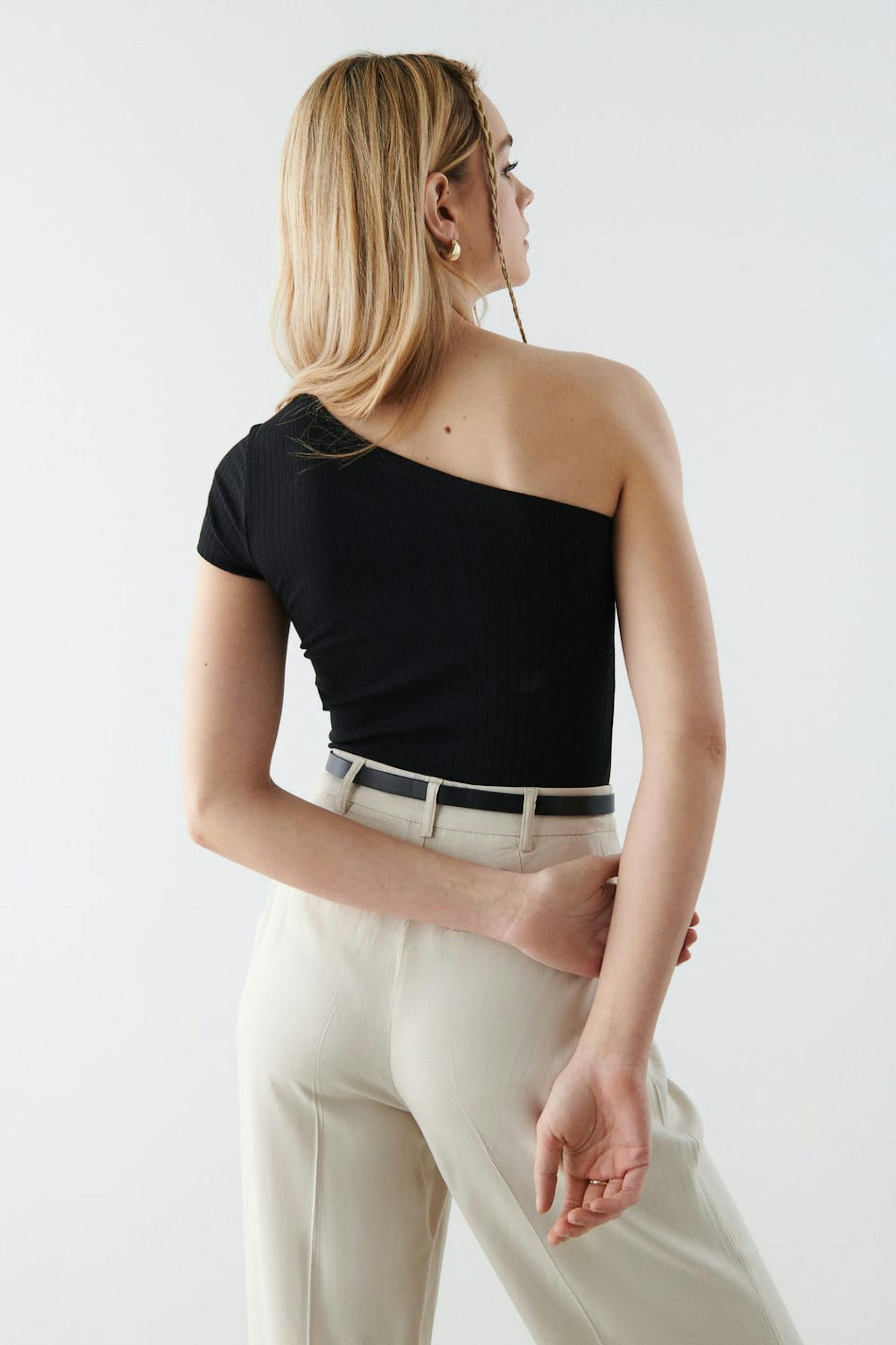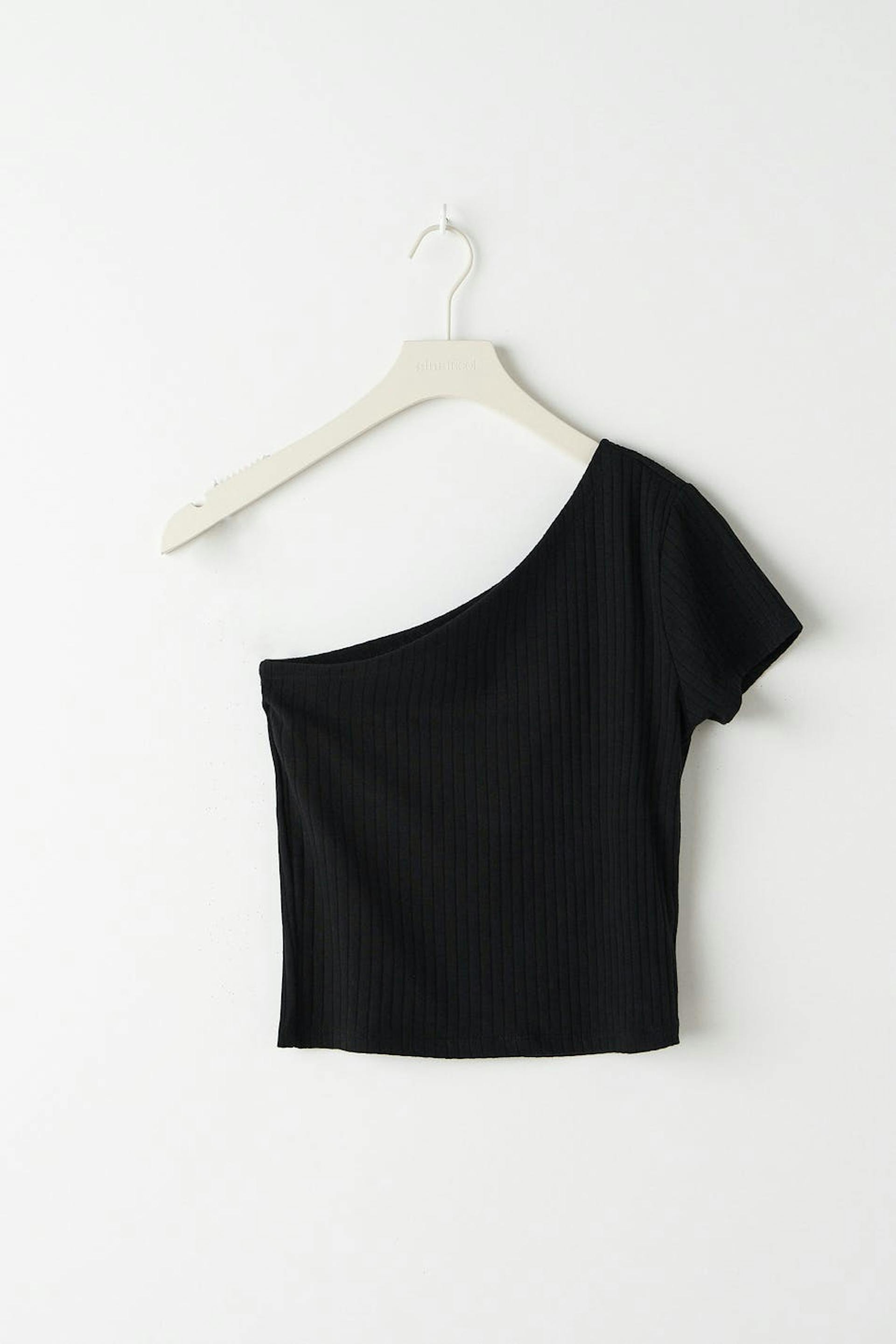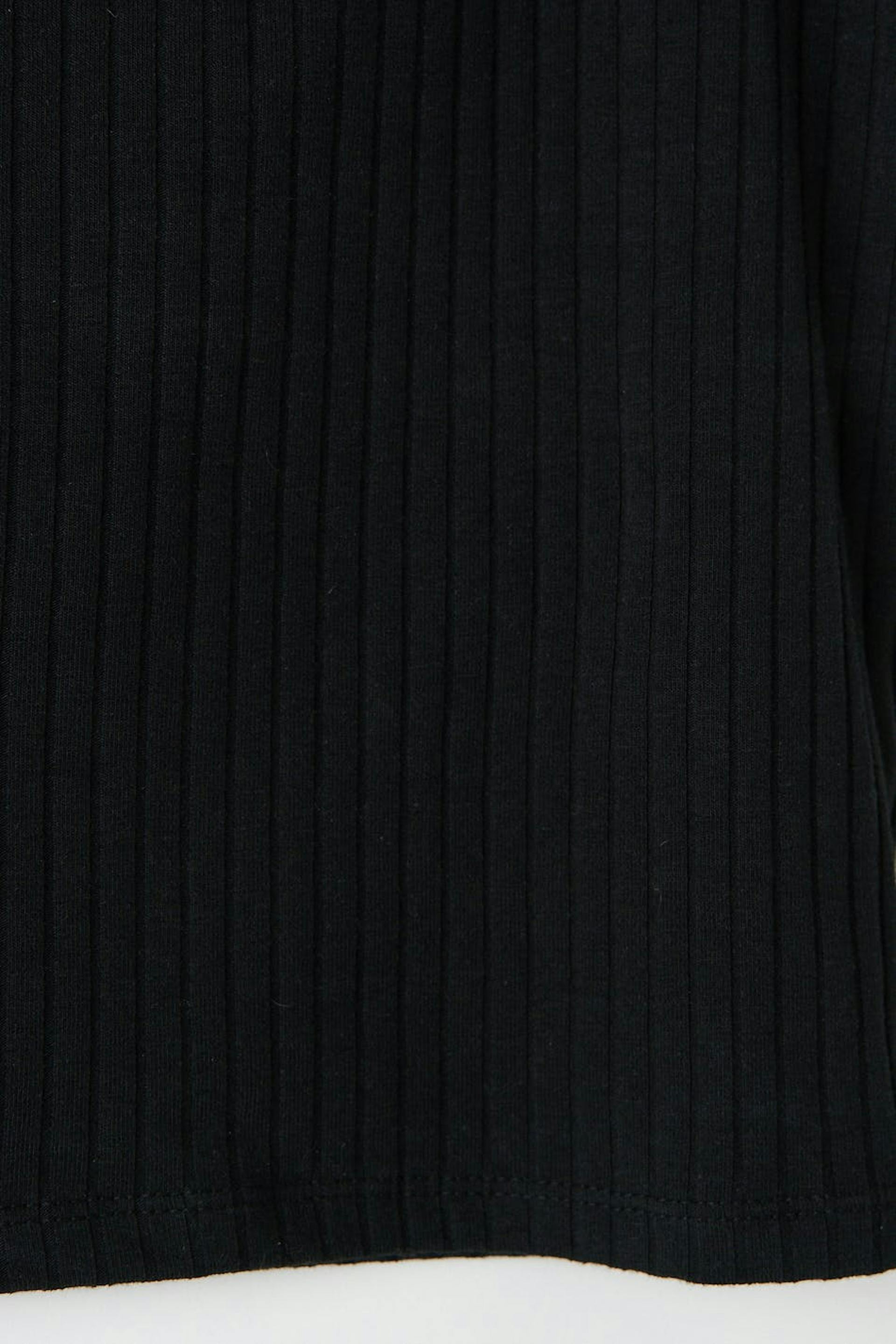 Ribattu off shoulder-toppi trikoosta vartalonmyötäisellä istuvuudella. Off shoulder-toppi on musta ja lyhythihainen.