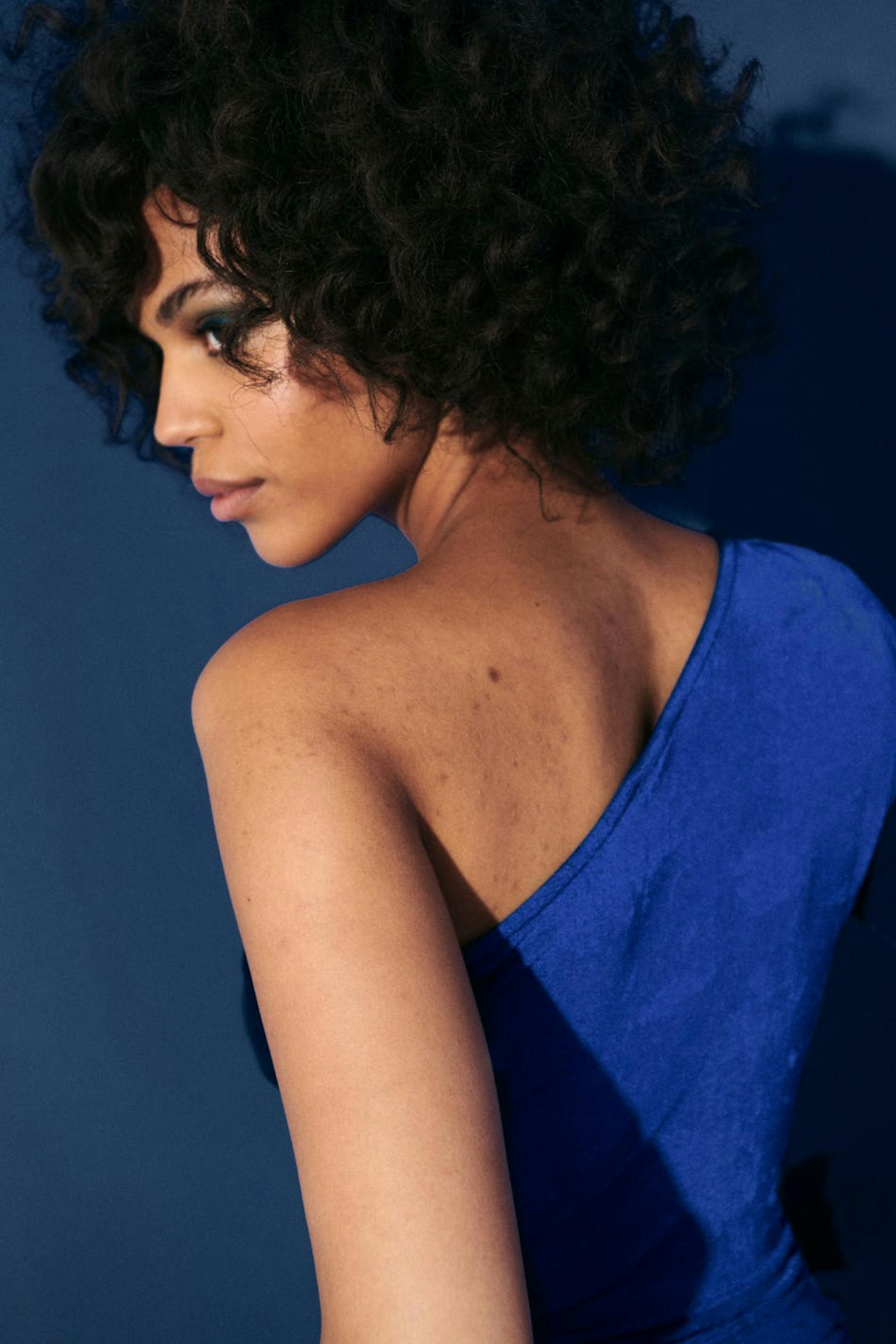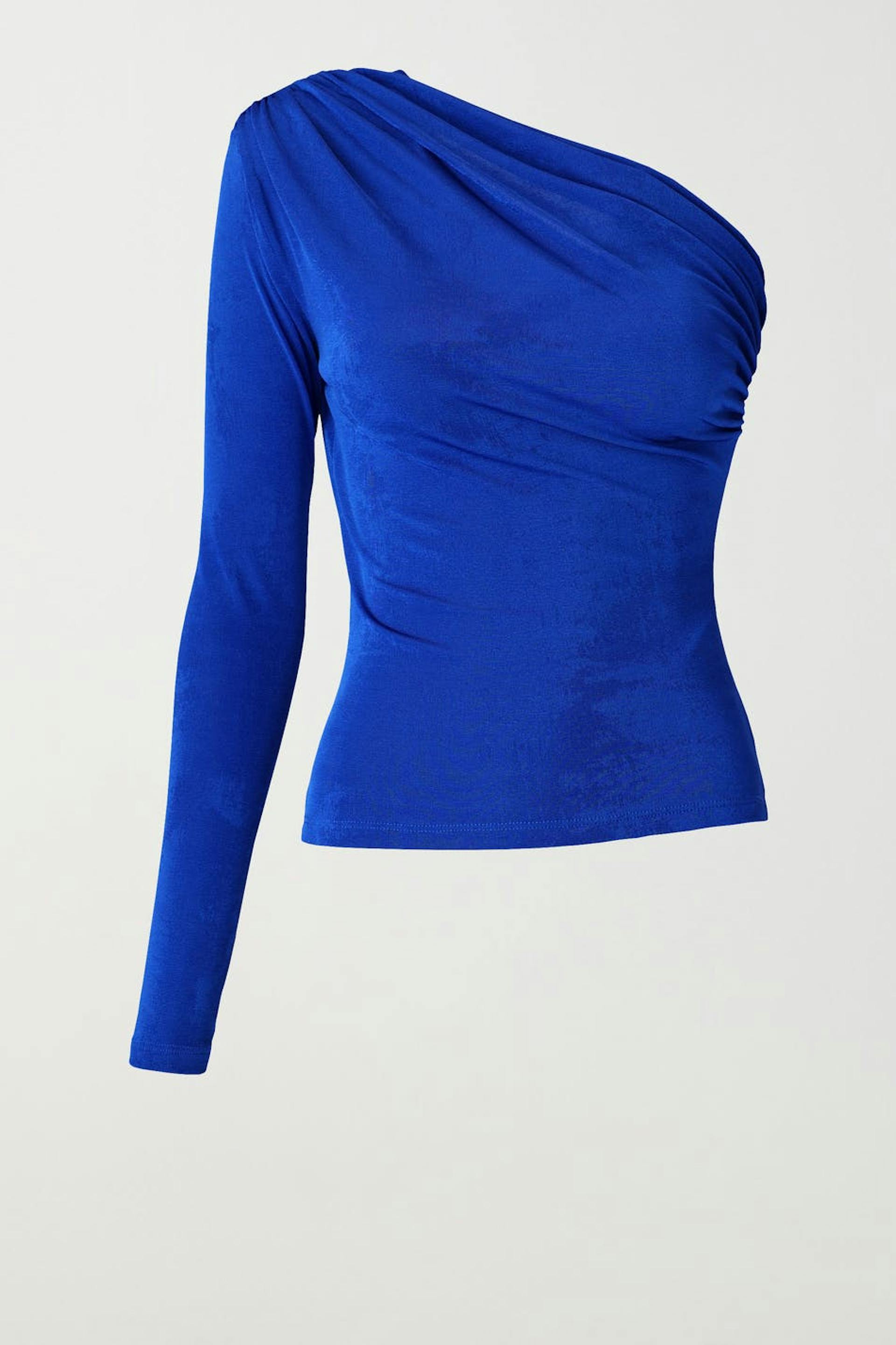 One shoulder-toppi poimuilla sivulla ja olkapäätä pitkin. Toppi on sininen ja siinä on pitkä hiha olkatoppauksella.