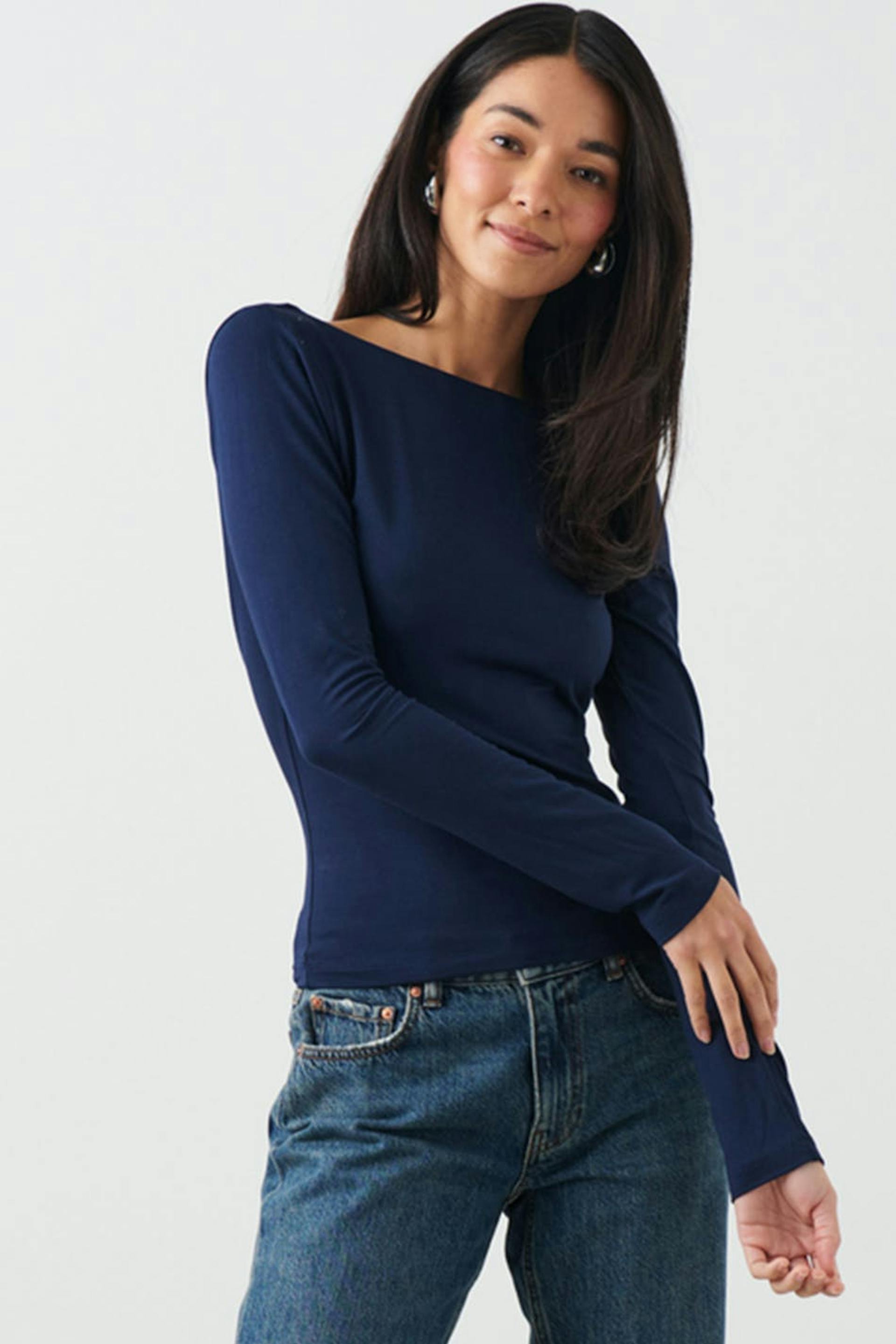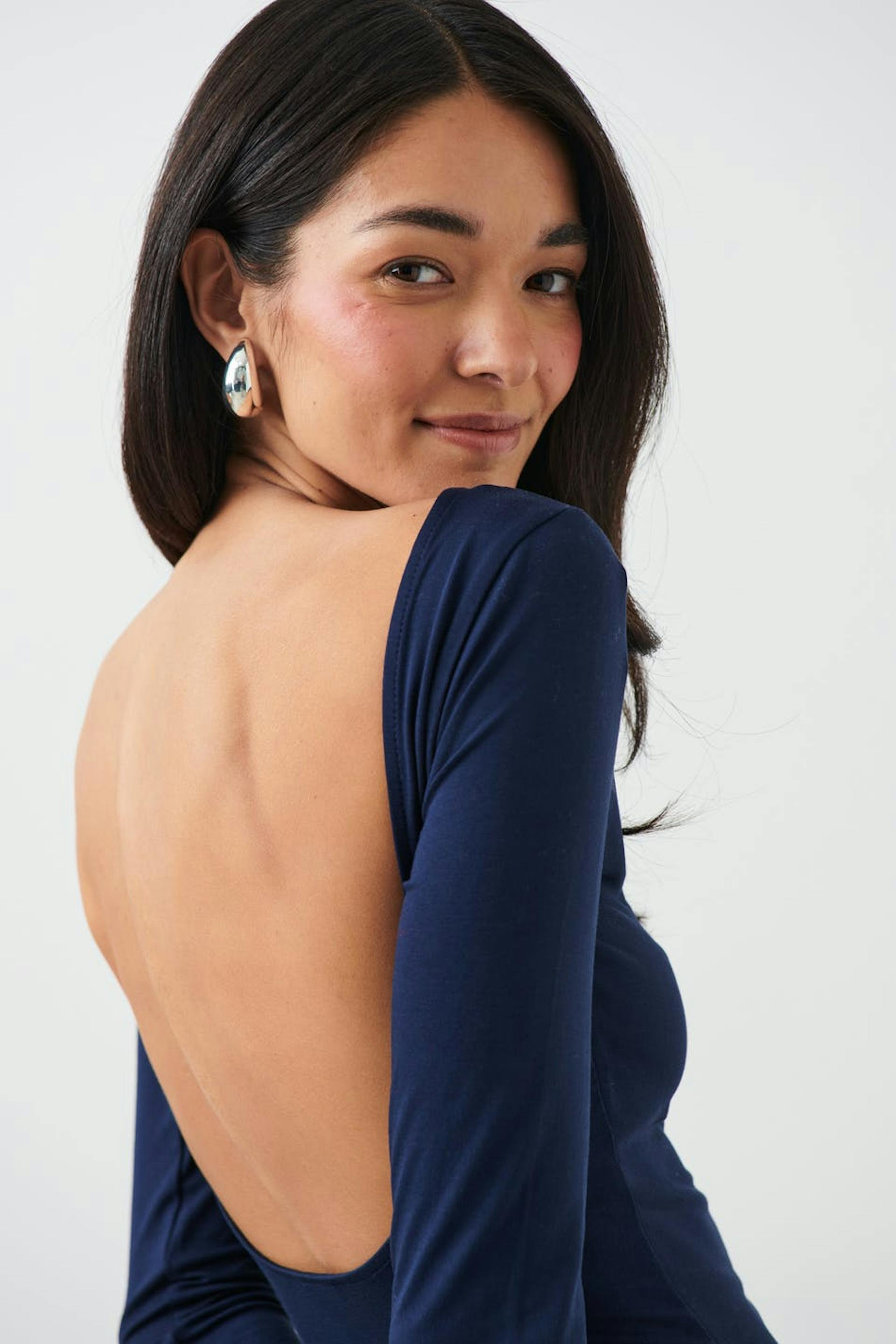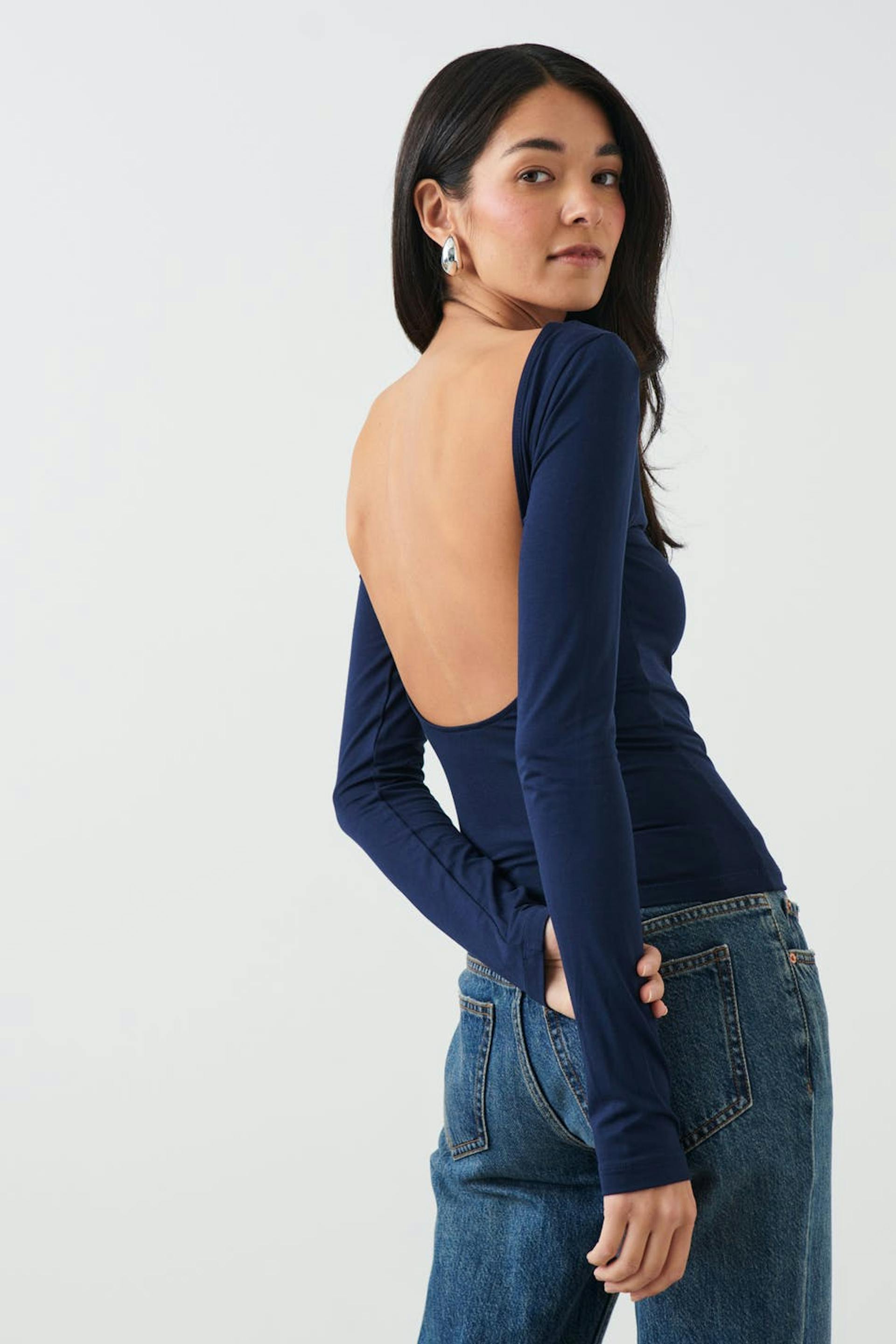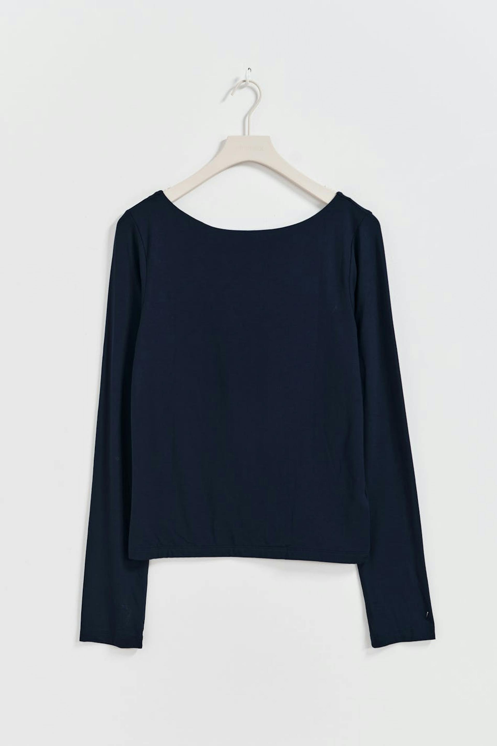 Soft touch – second skin comfort. Pitkähihainen toppi pehmeästä viskoosista avonaisella selällä. Toppi on sininen ja siinä on tyköistuva istuvuus.