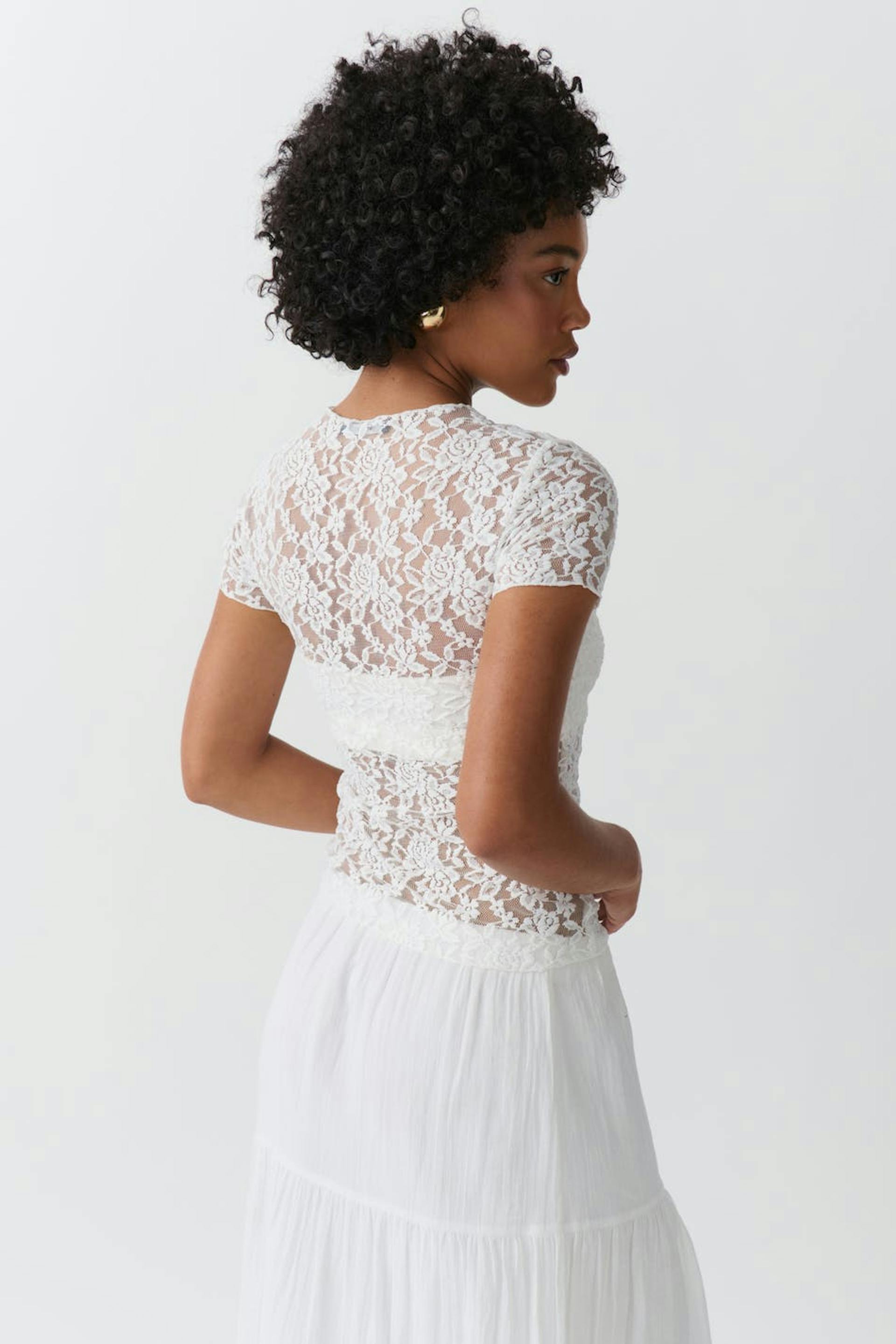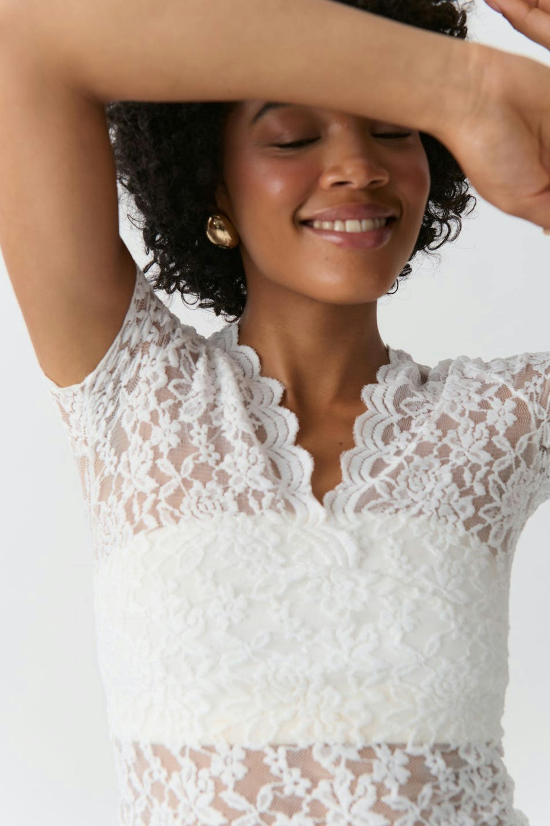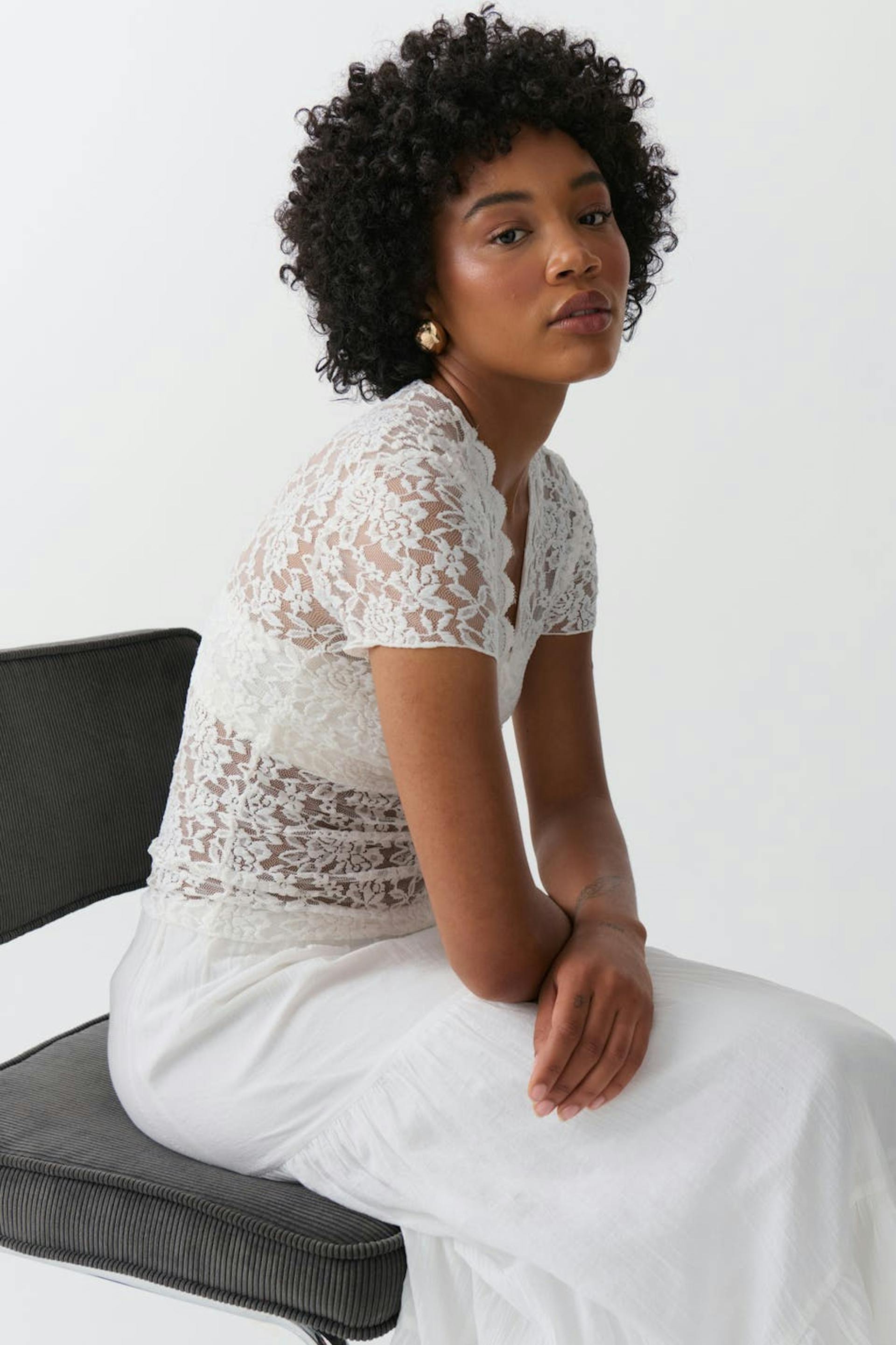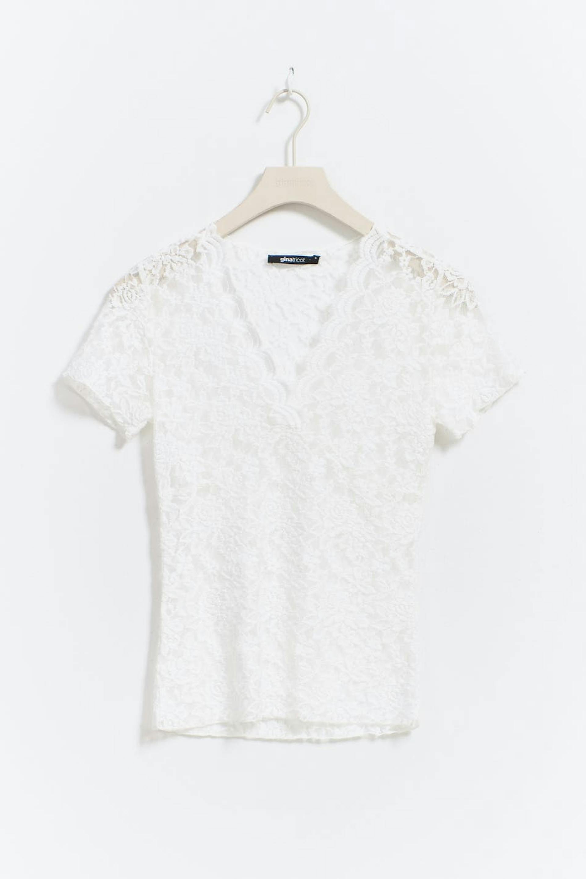 Lyhythihainen toppi v-pääntiellä. Toppi on valkoinen ja siinä on normaali istuvuus.