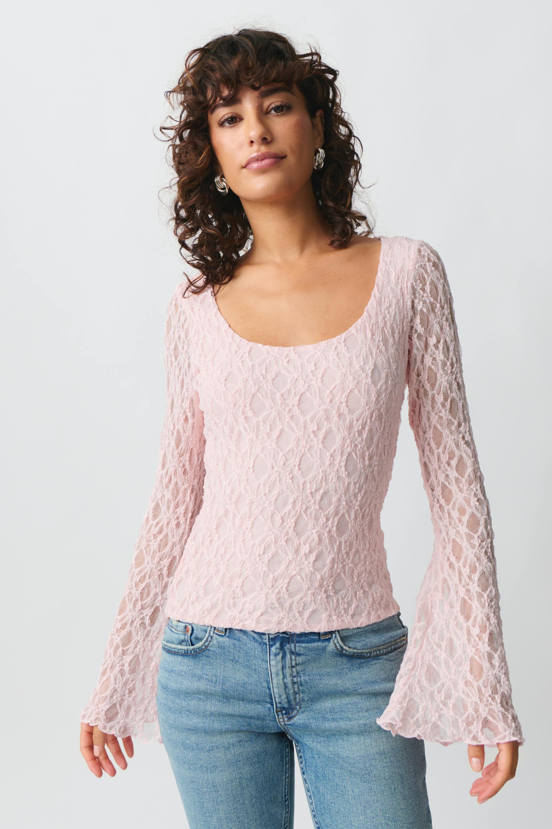 Pitkähihainen pitsitoppi syvällä kaula-aukolla. Toppi on pinkki ja siinä on tyköistuva istuvuus. Vuorattu.