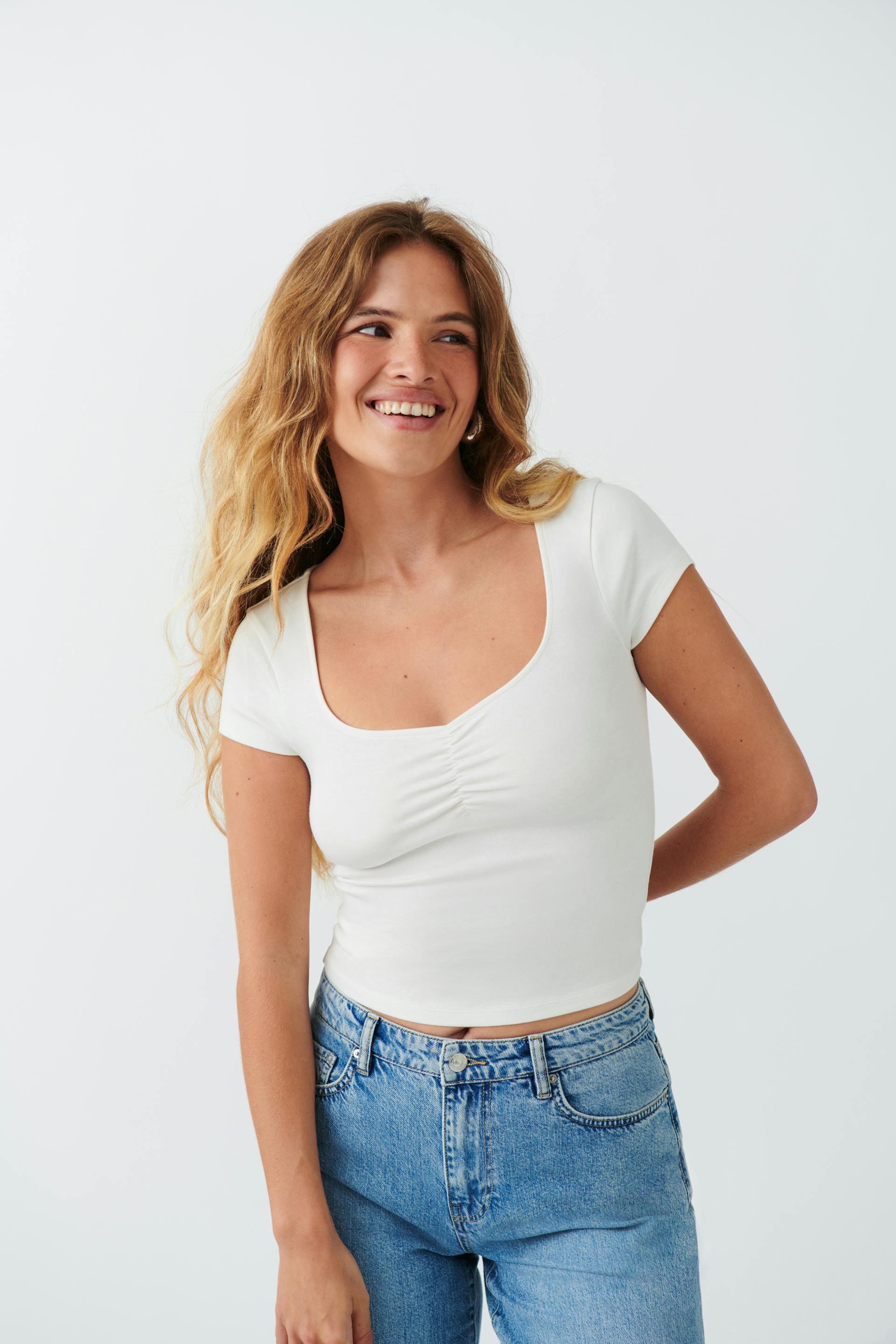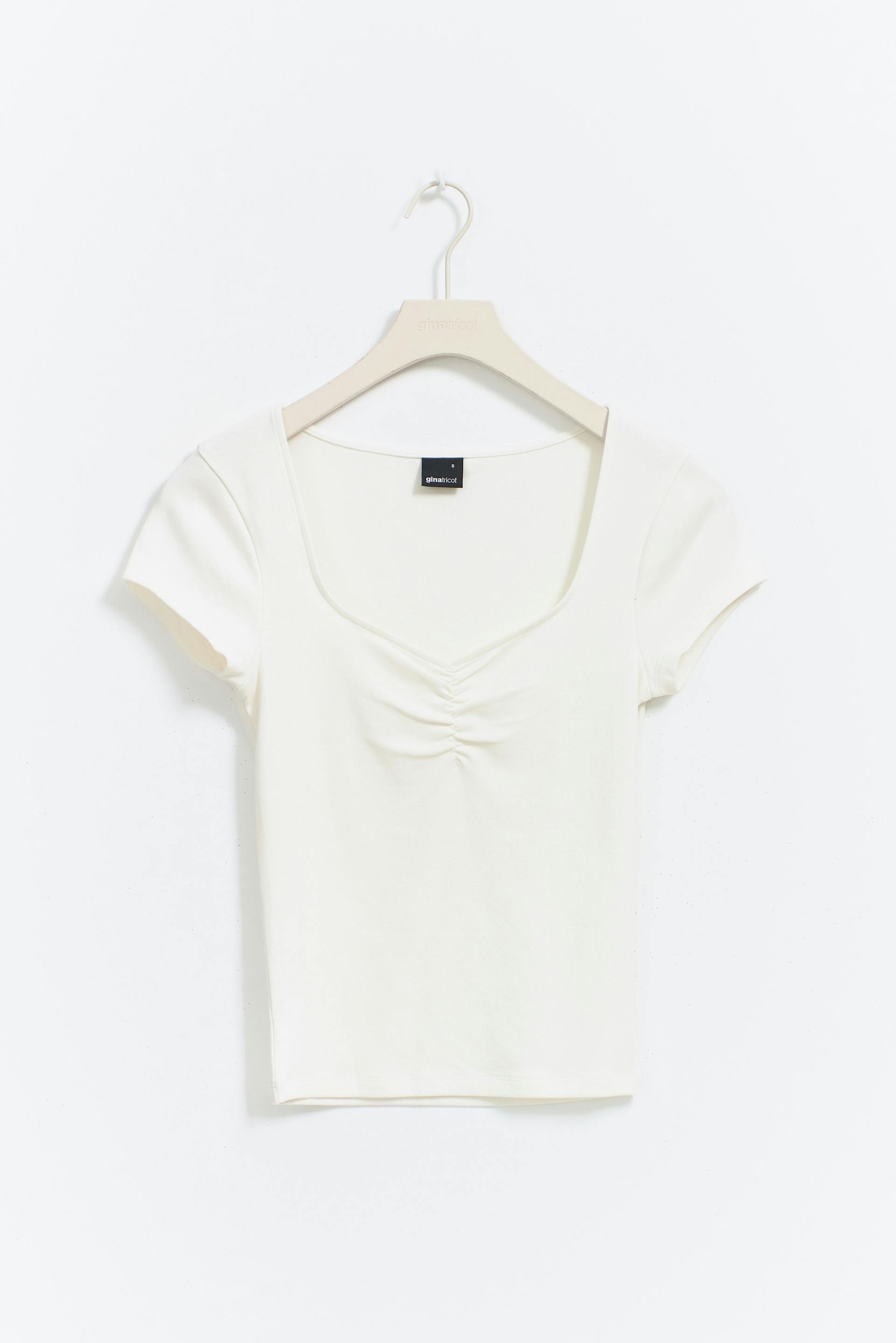 Lyhythihainen toppi rypytetyllä rinnuksella. Toppi on valkoinen ja siinä on tyköistuva istuvuus. Siinä on v-pääntie ja lyhyt pituus.