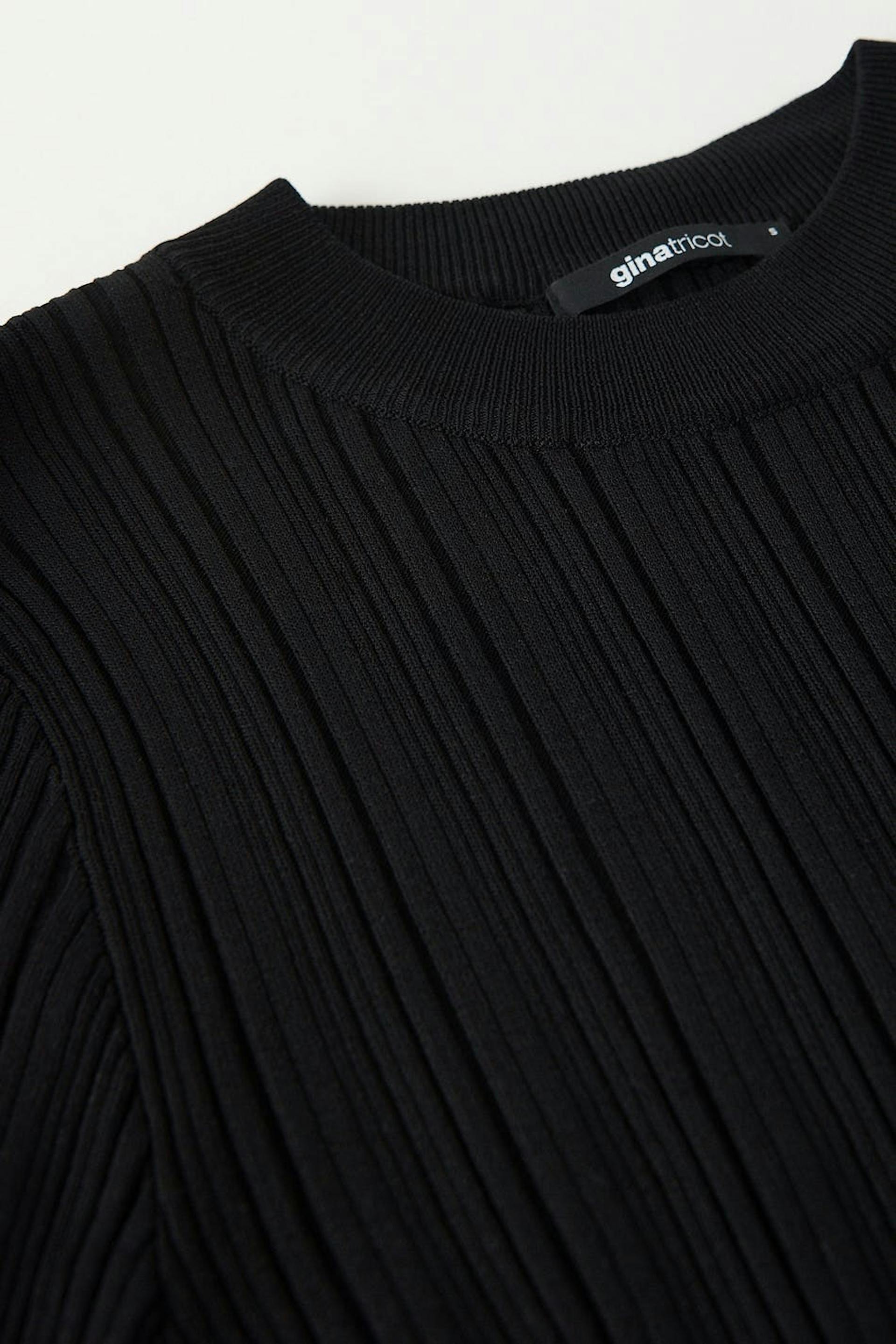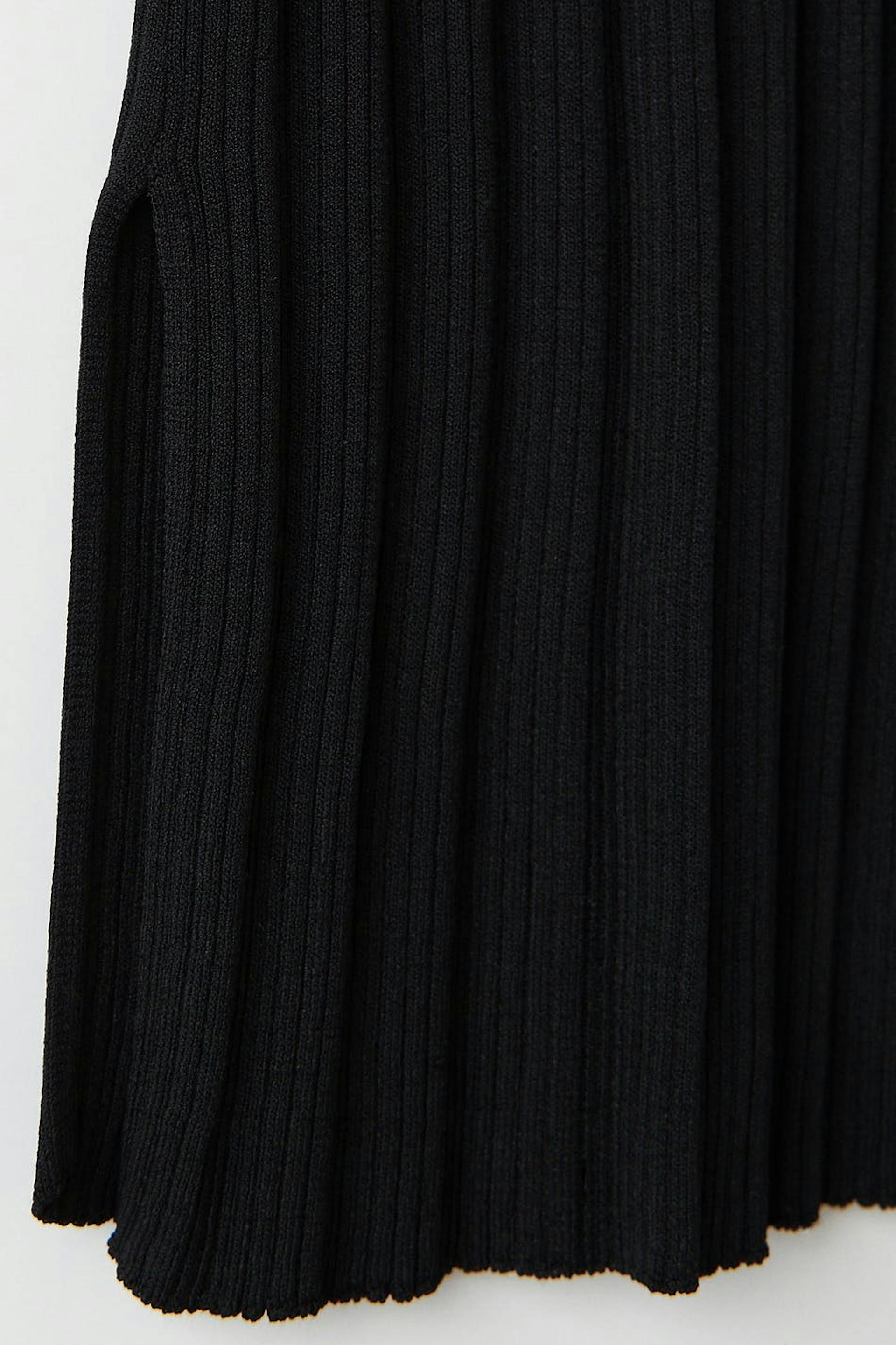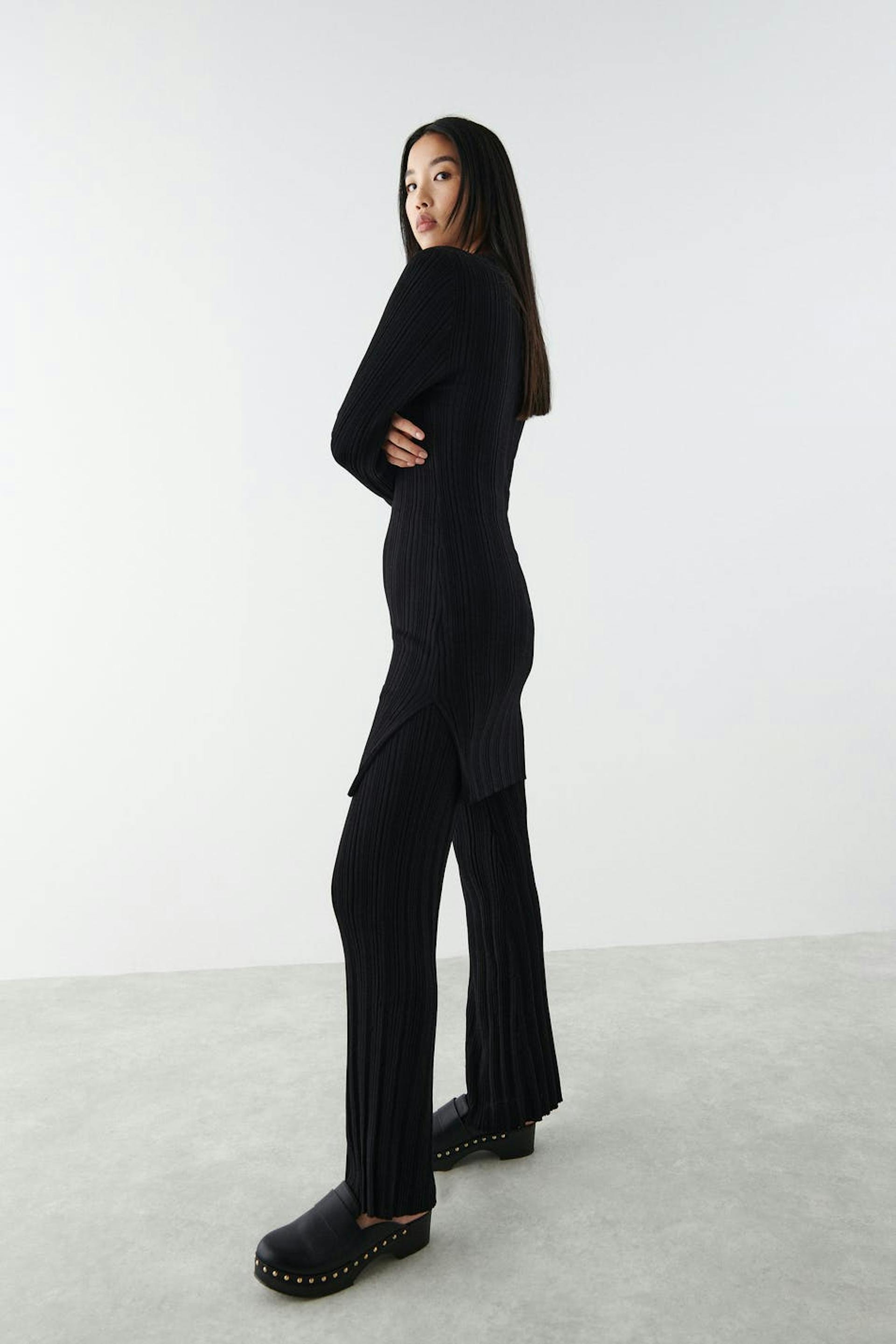 Neulottu toppi halkiolla sivuilla. Toppi on musta, pitkä ja ribattu. Siinä on korkea kaula-aukko ja pitkät hihat.
