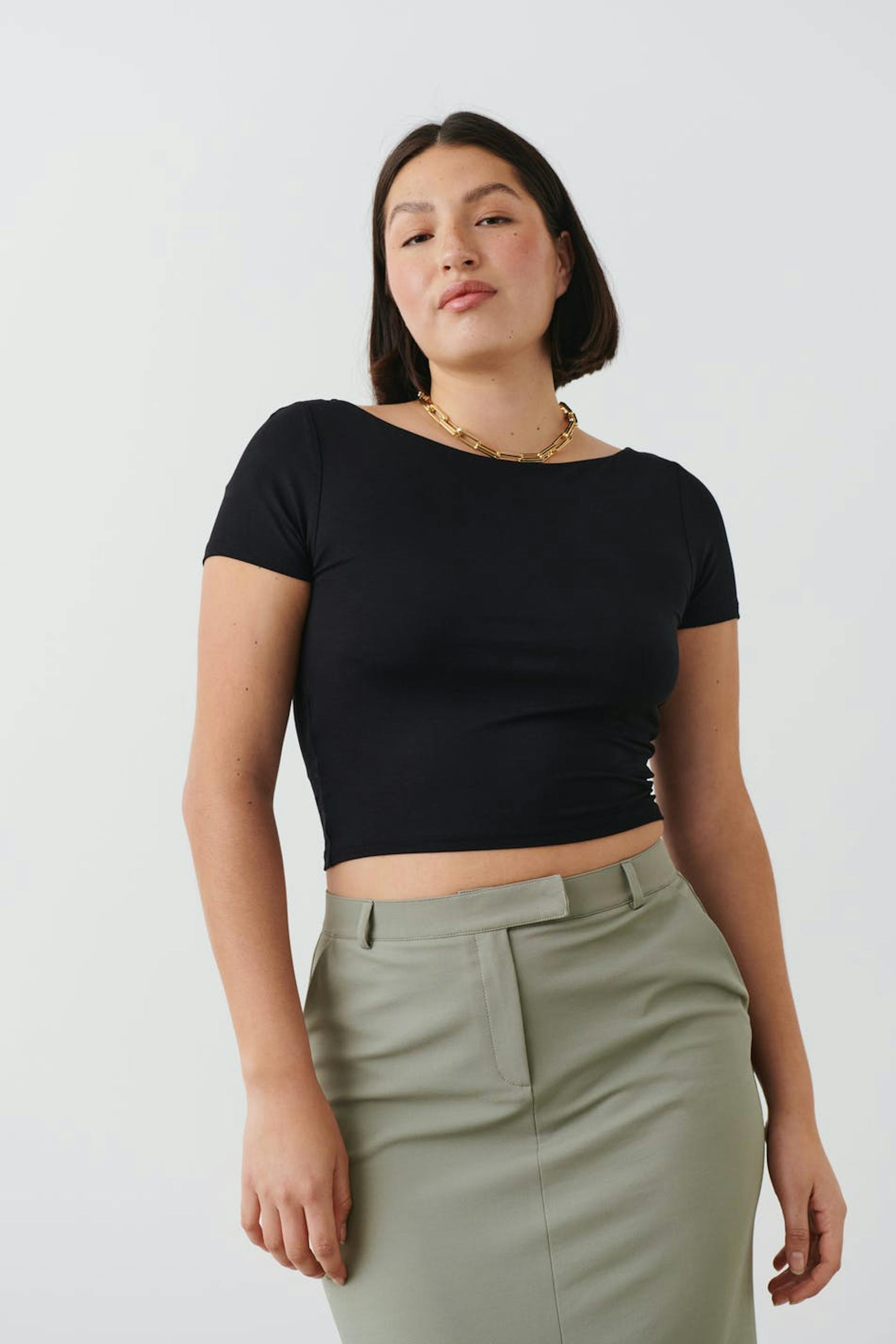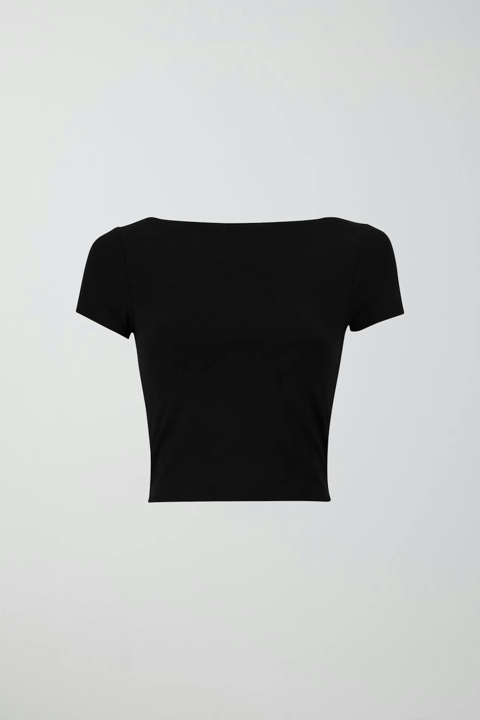 Soft touch – second skin comfort. Lyhythihainen toppi pehmeästä viskoosista venepääntiellä. Toppi on musta ja siinä on cropattu pituus.