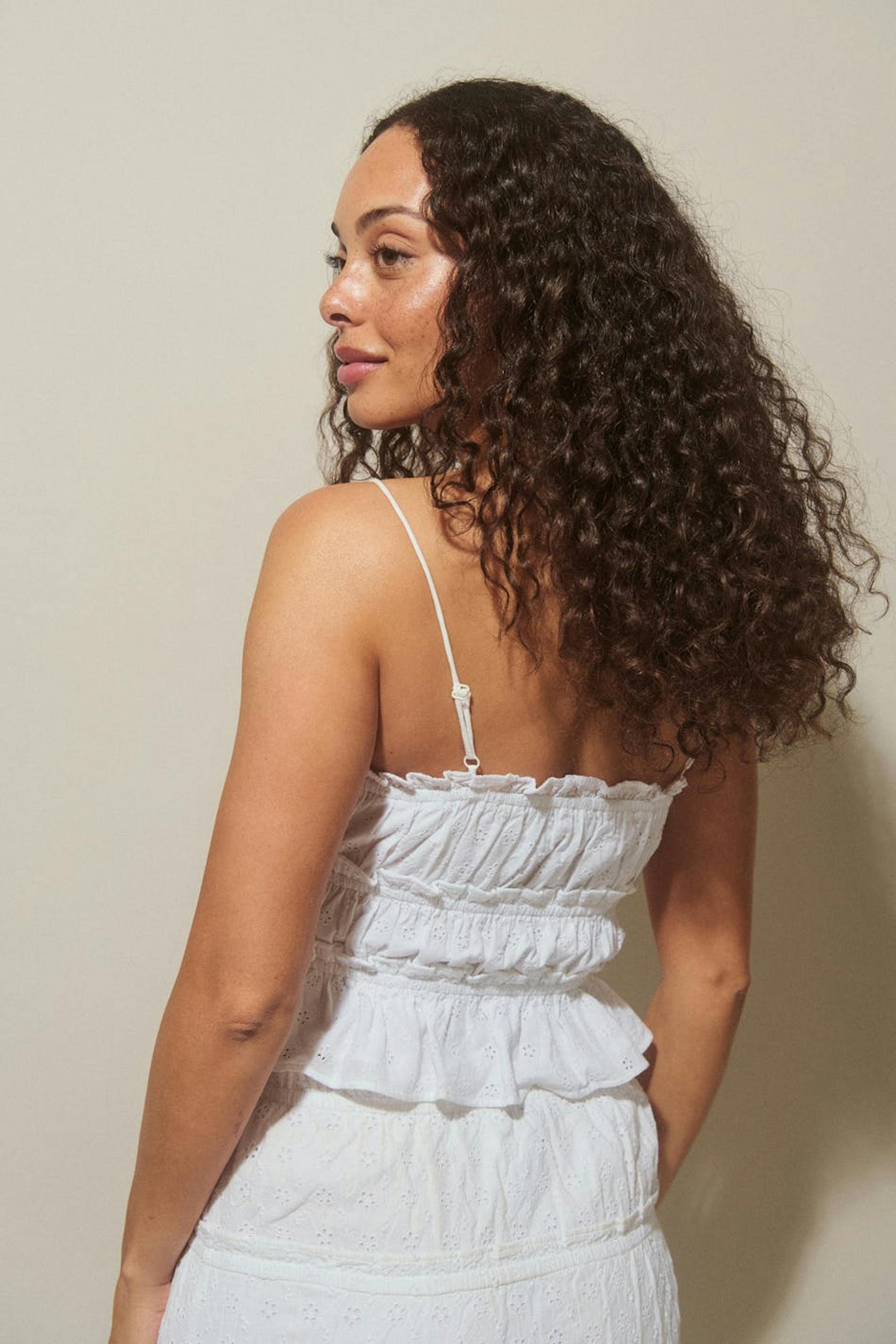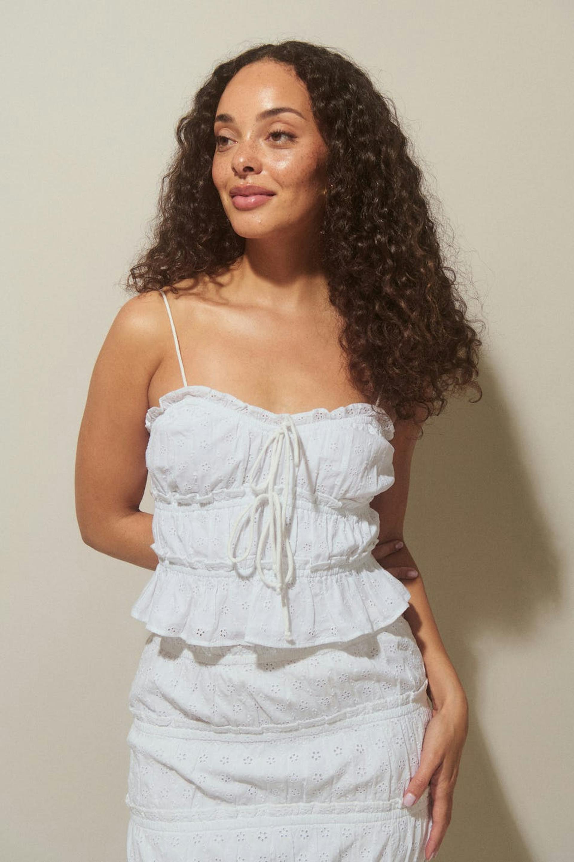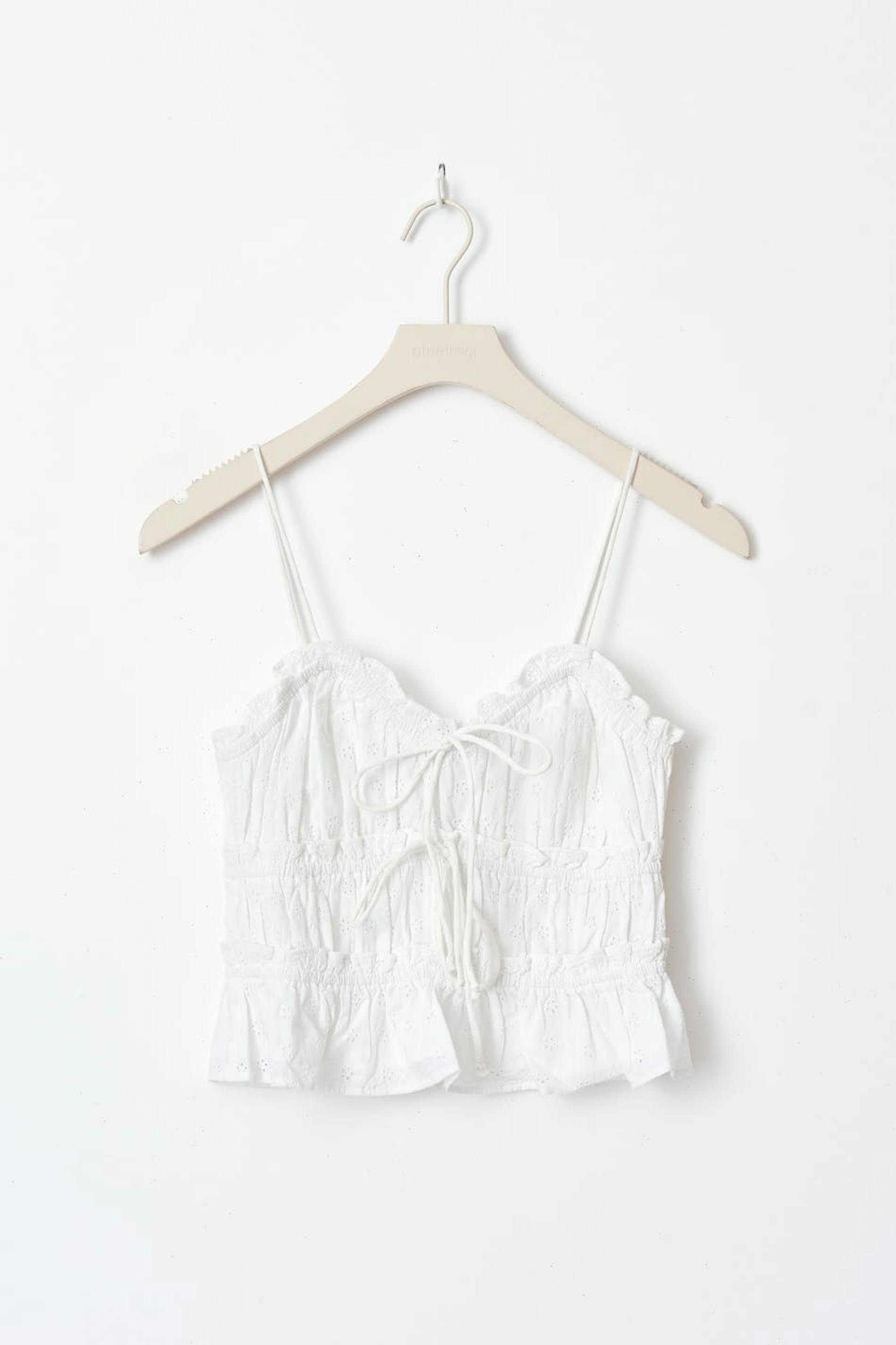 Kirjailtu aluspaita nauhayksityiskohdilla edessä. Aluspaita on valkoinen ja siinä on röyhelöt. Siinä on säädettävät olkaimet ja kuminauha edessä ja takana.