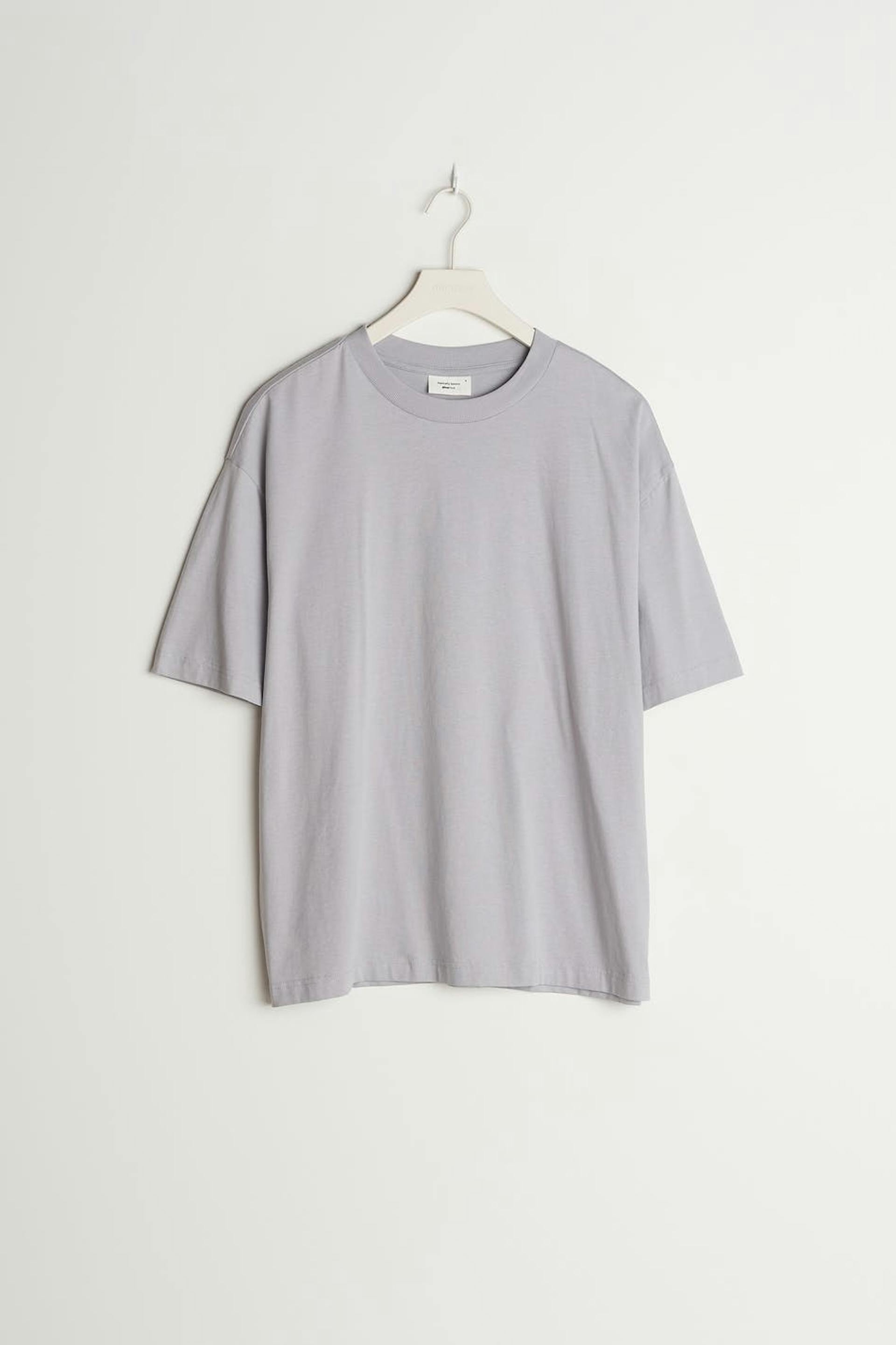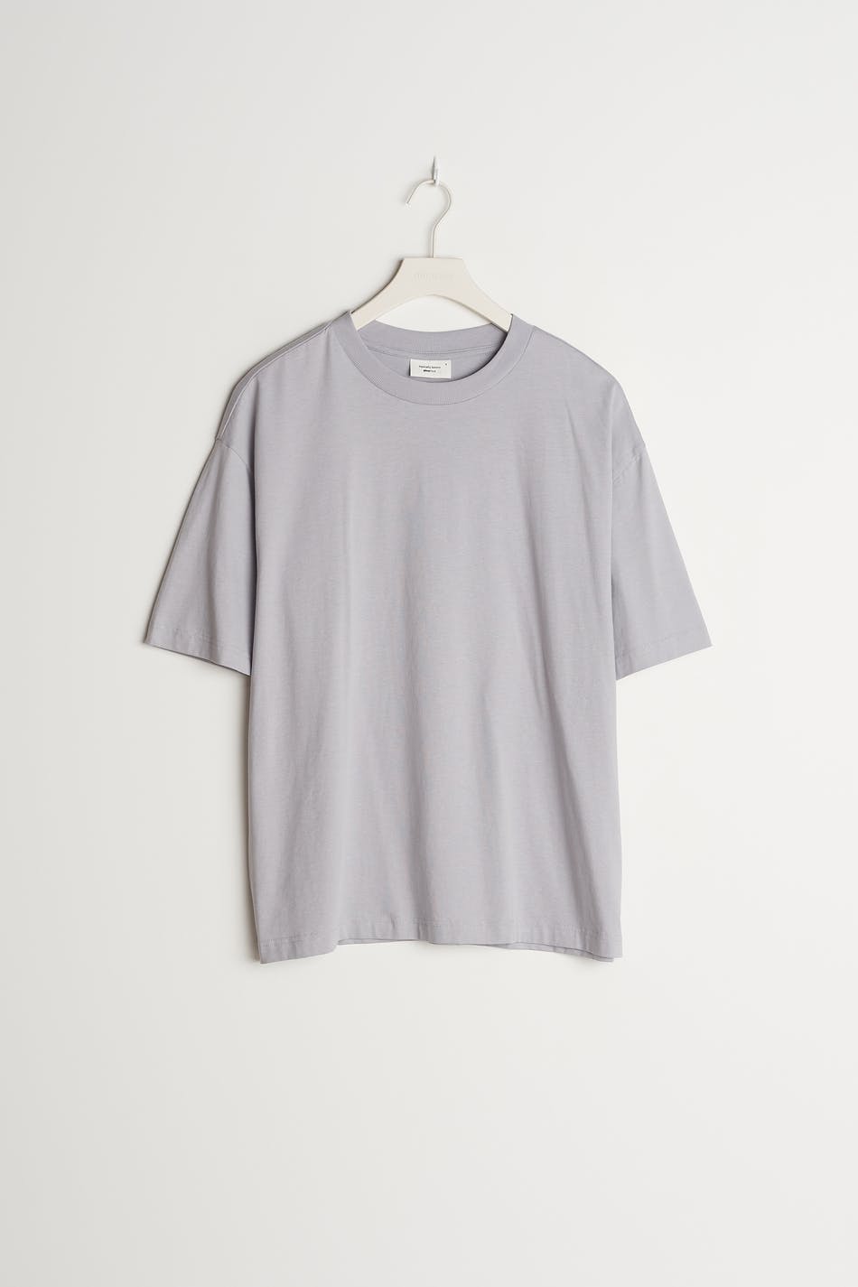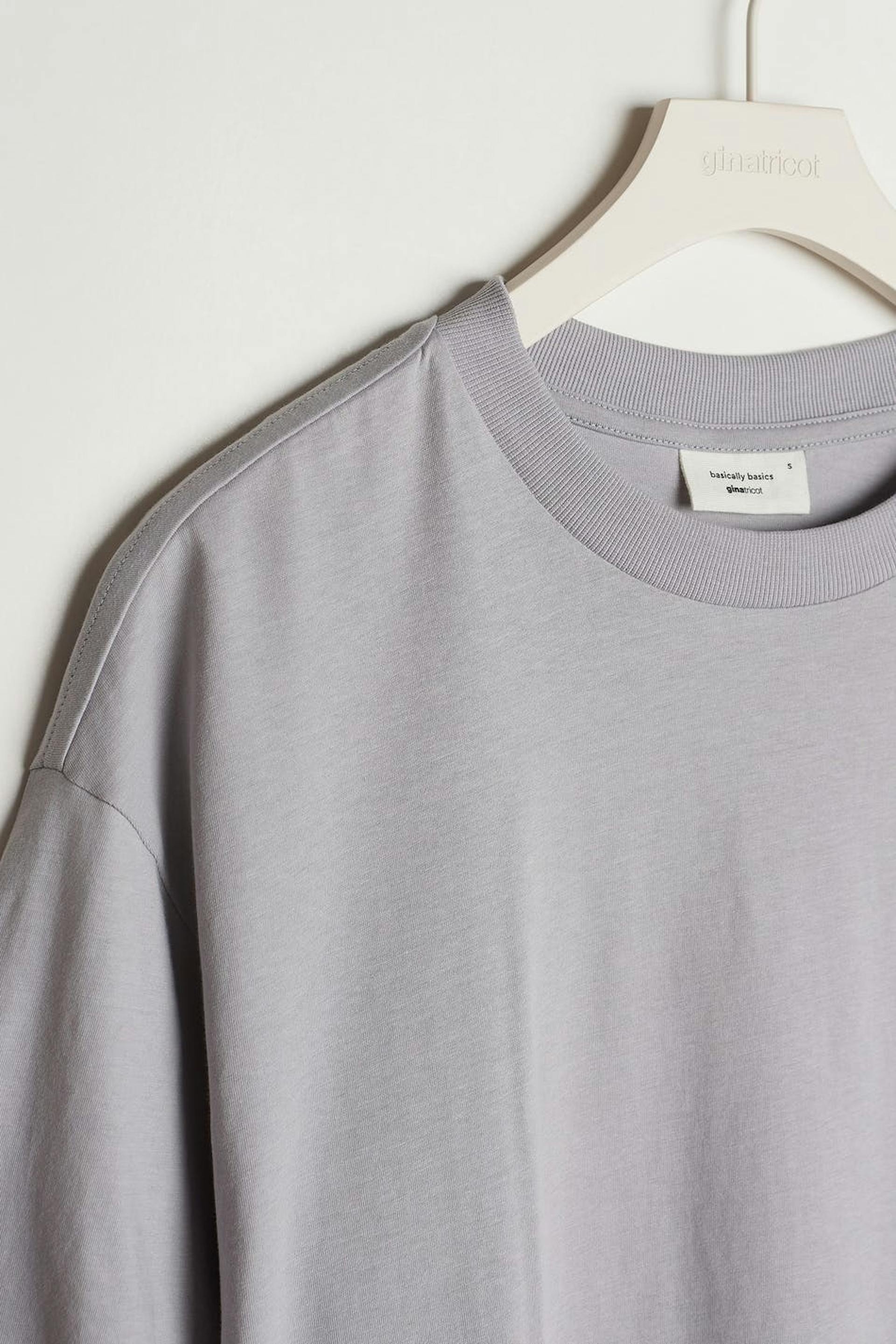 T-paita ylisuuri istuvuudella. T-paita on hopea ja siinä on pehmeä materiaali puuvillasta. Siinä on ribbed mansetti kaula-aukossa.